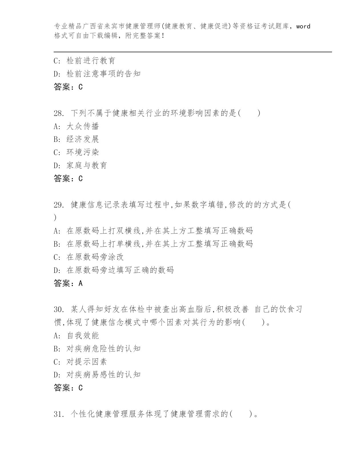 广西省来宾市健康管理师(健康教育、健康促进)等资格证考试通用题库加解析答案