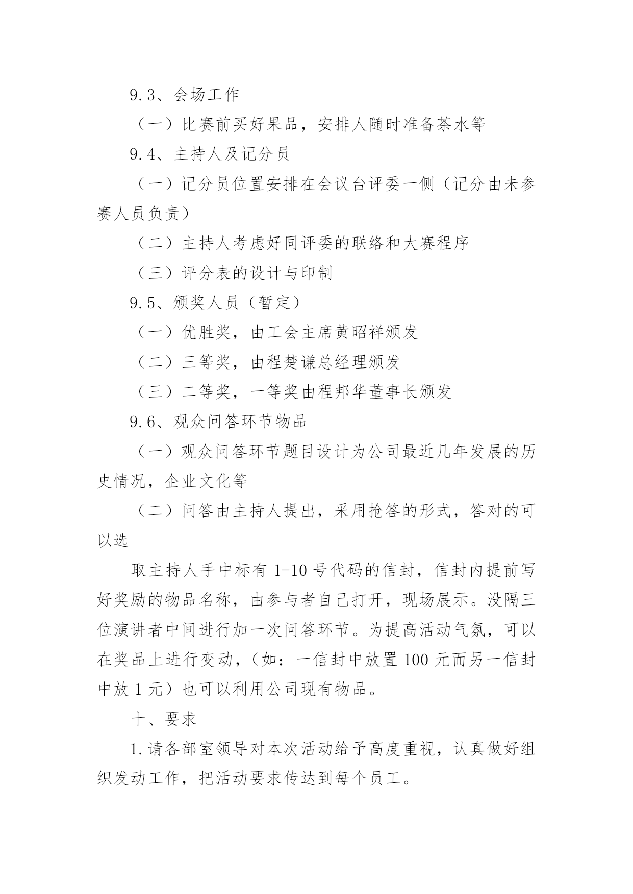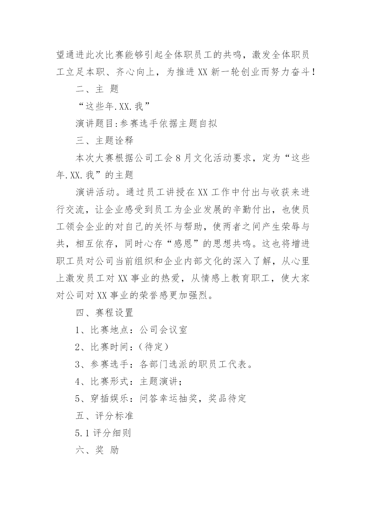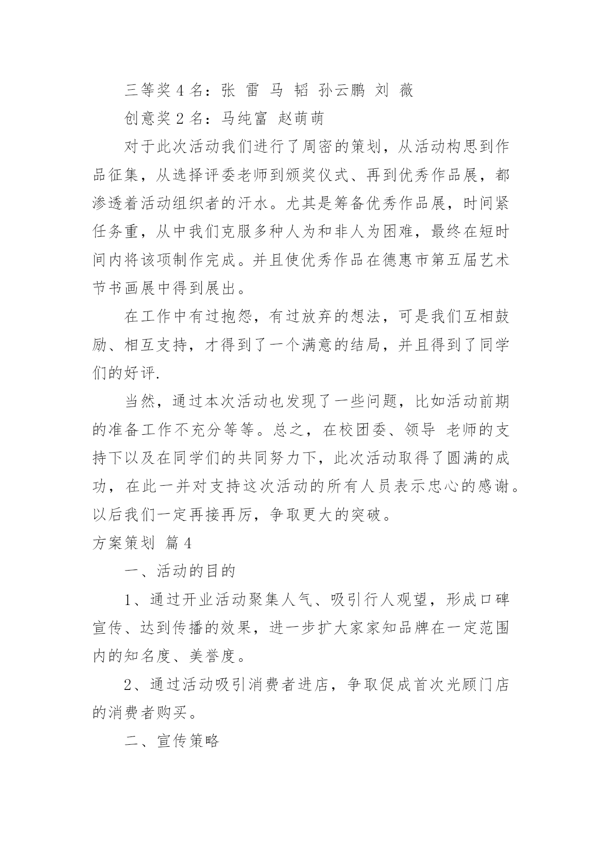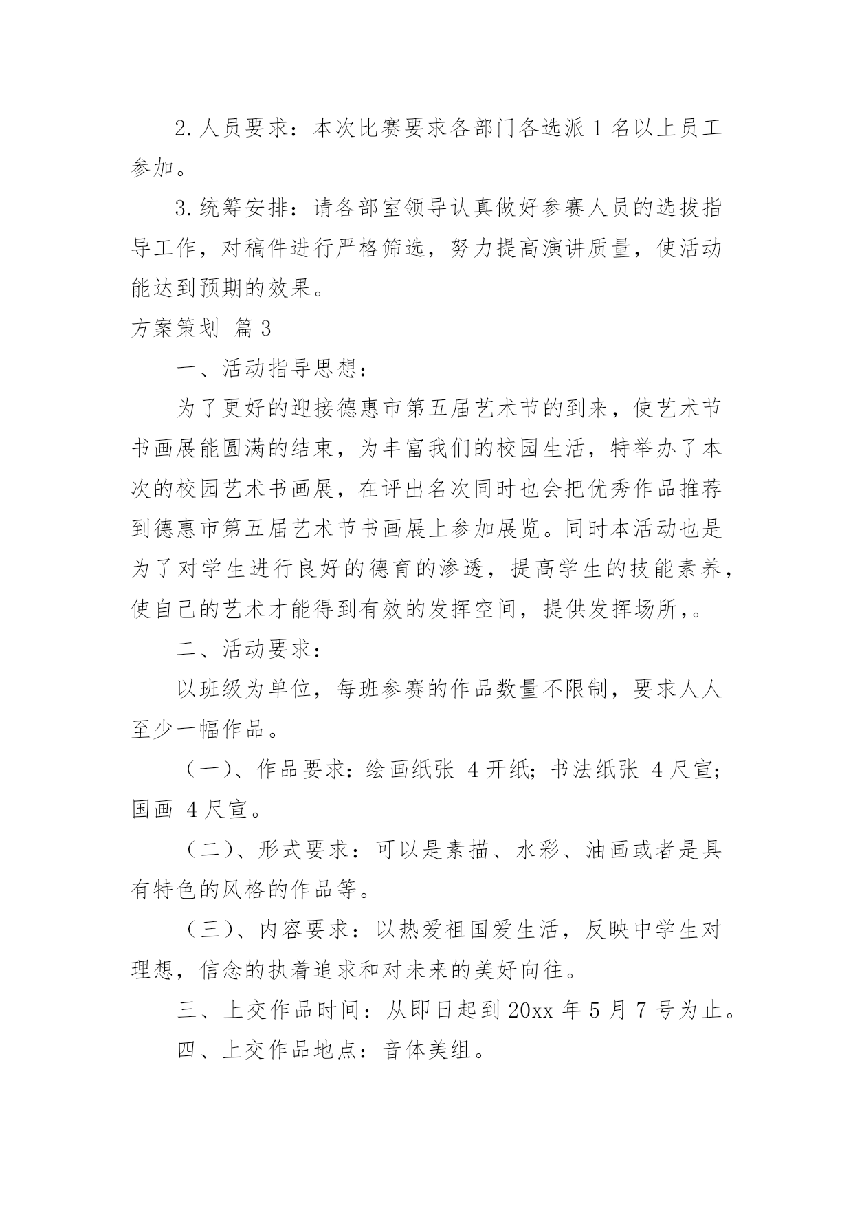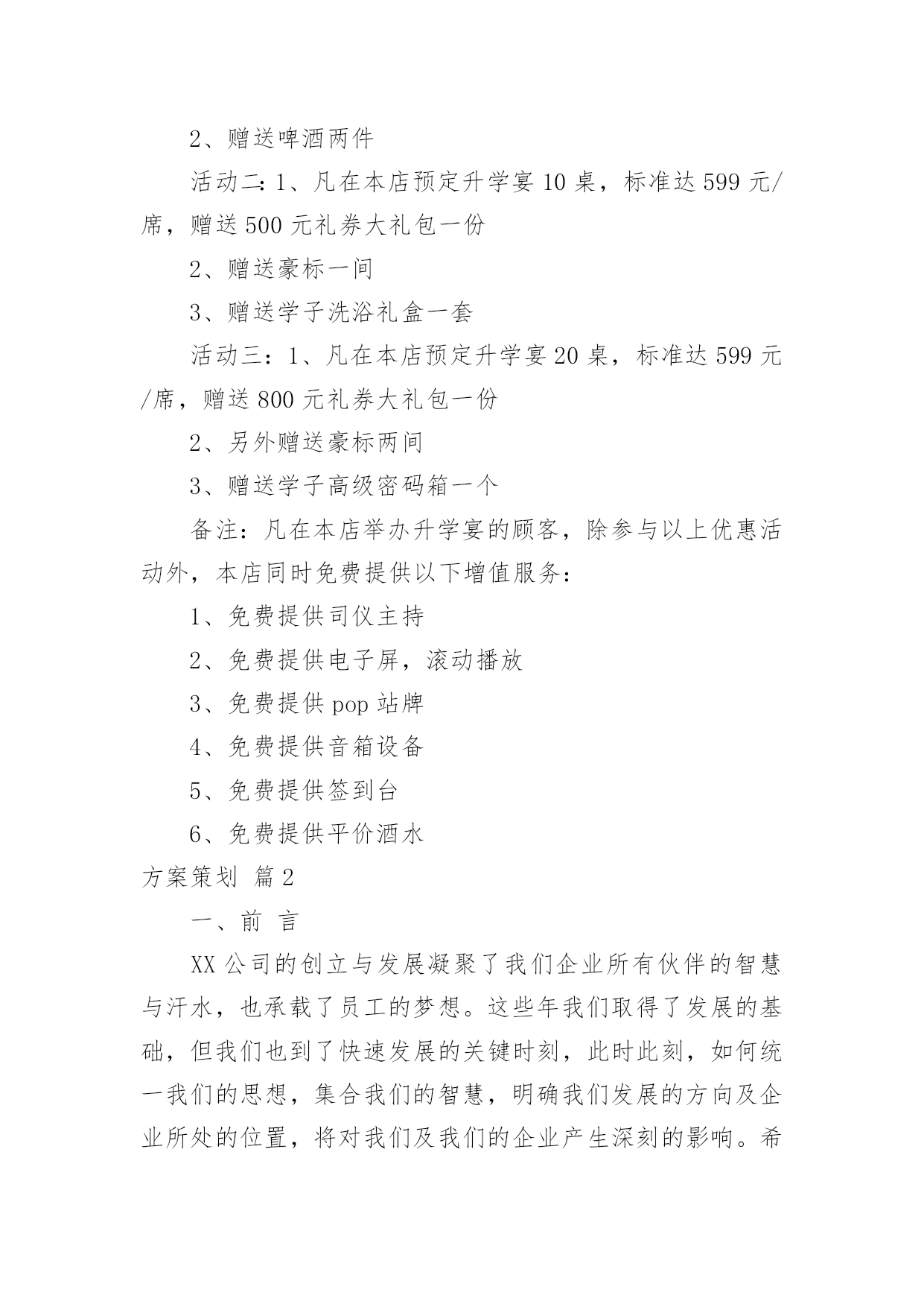 方案策划精选方案策划合集五篇为确保事情或工作高质量高水平开展,就需要我们事先制定方案,方案一般包括指导思想、主要目标、工作重点、实施步骤、政策措施、具体要求等项目。那么什么样的方案才是好的呢?以下是小编收集整理的方案策划5篇,希望对大家有所帮助。方案策划篇1活动时间:即日起至9月30日活动地点:一楼中餐厅活动对象:所有散台顾客(包房与两桌及以上包席除外)活动内容:反正活动期间进店消费的散台顾客,均可享受一下优惠活动1、免费提供开胃小碟2、免费提供水果拼盘3、每天一款特价菜4、散台消费100元赠送20元代金券升学宴活动方案活动主题:海阔凭鱼跃天高任鸟飞活动时间:即日起至9月30日活动内容::活动一:1、凡在本店预定升学宴5桌,标准达599元/席,每桌赠送饮料两瓶2、赠送啤酒两件活动二:1、凡在本店预定升学宴10桌,标准达599元/席,赠送500元礼券大礼包一份2、赠送豪标一间3、赠送学子洗浴礼盒一套活动三:1、凡在本店预定升学宴20桌,标准达599元/席,赠送800元礼券大礼包一份2、另外赠送豪标两间3、赠送学子高级密码箱一个备注:凡在本店举办升学宴的顾客,除参与以上优惠活动外,本店同时免费提供以下增值服务:1、免费提供司仪主持2、免费提供电子屏,滚动播放3、免费提供pop站牌4、免费提供音箱设备5、免费提供签到台6、免费提供平价酒水方案策划篇2一、前言XX公司的创立与发展凝聚了我们企业所有伙伴的智慧与汗水,也承载了员工的梦想。这些年我们取得了发展的基础,但我们也到了快速发展的关键时刻,此时此刻,如何统一我们的思想,集合我们的智慧,明确我们发展的方向及企业所处的位置,将对我们及我们的企业产生深刻的影响。希望通进此次比赛能够引起全体职员工的共鸣,激发全体职员工立足本职、齐心向上,为推进XX新一轮创业而努力奋斗!二、主题“这些年.XX.我”演讲题目:参赛选手依据主题自拟三、主题诠释本次大赛根据公司工会8月文化活动要求,定为“这些年.XX.我”的主题演讲活动。通过员工讲授在XX工作中付出与收获来进行交流,让企业感受到员工为企业发展的辛勤付出,也使员工领会企业的对自己的关怀与帮助,使两者之间产生荣辱与共,相互依存,同时心存“感恩”的思想共鸣。这也将增进职工员对公司当前组织和企业内部文化的深入了解,从心里上激发员工对XX事业的热爱,从情感上教育职工,使大家对公司对XX事业的荣誉感更加强烈。四、赛程设置1、比赛地点:公司会议室2、比赛时间:(待定)3、参赛选手:各部门选派的职员工代表。4、比赛形式:主题演讲;5、穿插娱乐:问答幸运抽奖,奖品待定五、评分标准5.1评分细则六、奖励一等奖1名荣誉证书+800元奖金二等奖2名荣誉证书+400元奖金三等奖3名荣誉证书+200元奖金优胜奖4名荣誉证书+100元奖金问答奖9个奖品若干七、比赛流程(一)宣布比赛开始(三)介绍评委及本次大赛情况(四)比赛开始(主题演讲8分钟/人,)(五)比赛进行中穿插3次公司历史有奖知识问答,每次3个问题(六)董事长讲话(同时统分)(七)颁奖仪式(评委为获奖选手颁奖)(八)宣布比赛结束,其他职员工按序退场八、大赛评委(暂定)(一)董事长xxx,总经理xxx,(二)副总经理xxx九、演讲期间各项工作的具体准备工作:9.1、宣传工作要求(一)通知文件(提前一个星期通知各部门,要求派人员参加)(二)横幅“这些年.XX.我’演讲大赛”字样9.2、音响、场地准备、拍照等(一)音响设备:开赛前一天和比赛前调试一下(二)赛场布置:提前一天完成进行观众席摆设(三)拍照要求:记录下公司参赛人员风采及现场氛围9.3、会场工作(一)比赛前买好果品,安排人随时准备茶水等9.4、主持人及记分员(一)记分员位置安排在会议台评委一侧(记分由未参赛人员负责)(二)主持人考虑好同评委的联络和大赛程序(三)评分表的设计与印制9.5、颁奖人员(暂定)(一)优胜奖,由工会主席黄昭祥颁发(二)三等奖,由程楚谦总经理颁发(三)二等奖,一等奖由程邦华董事长颁发9.6、观众问答环节物品(一)观众问答环节题目设计为公司最近几年发展的历史情况,企业文化等(二)问答由主持人提出,采用抢答的形式,答对的可以选取主持人手中标有1-10号代码的信封,信封内提前写好奖励的物品名称,由参与者自己打开,现场展示。没隔三位演讲者中间进行加一次问答环节。为提高活动气氛,可以在奖品上进行变动,(如:一信封中放置100元而另一信封中放1元)也可以利用公司现有物品。十、要求1.请各部室领导对本次活动给予高度重视,认真做好组织发动工作,把活动要求传达到每个员工。2.人员要求:本次比赛要求各部门各选派1名以上员工参加。3.统筹安排:请各部室领导认真做好参赛人员的选拔指导工作,对稿件进行严格筛选,努力提高演讲质量,使活动能达到预期的效果。方案策划篇3