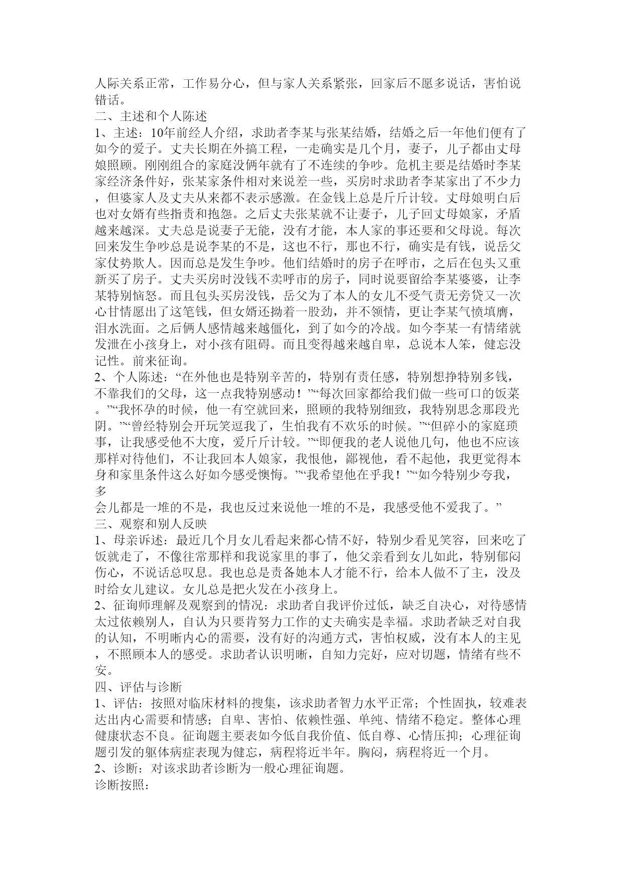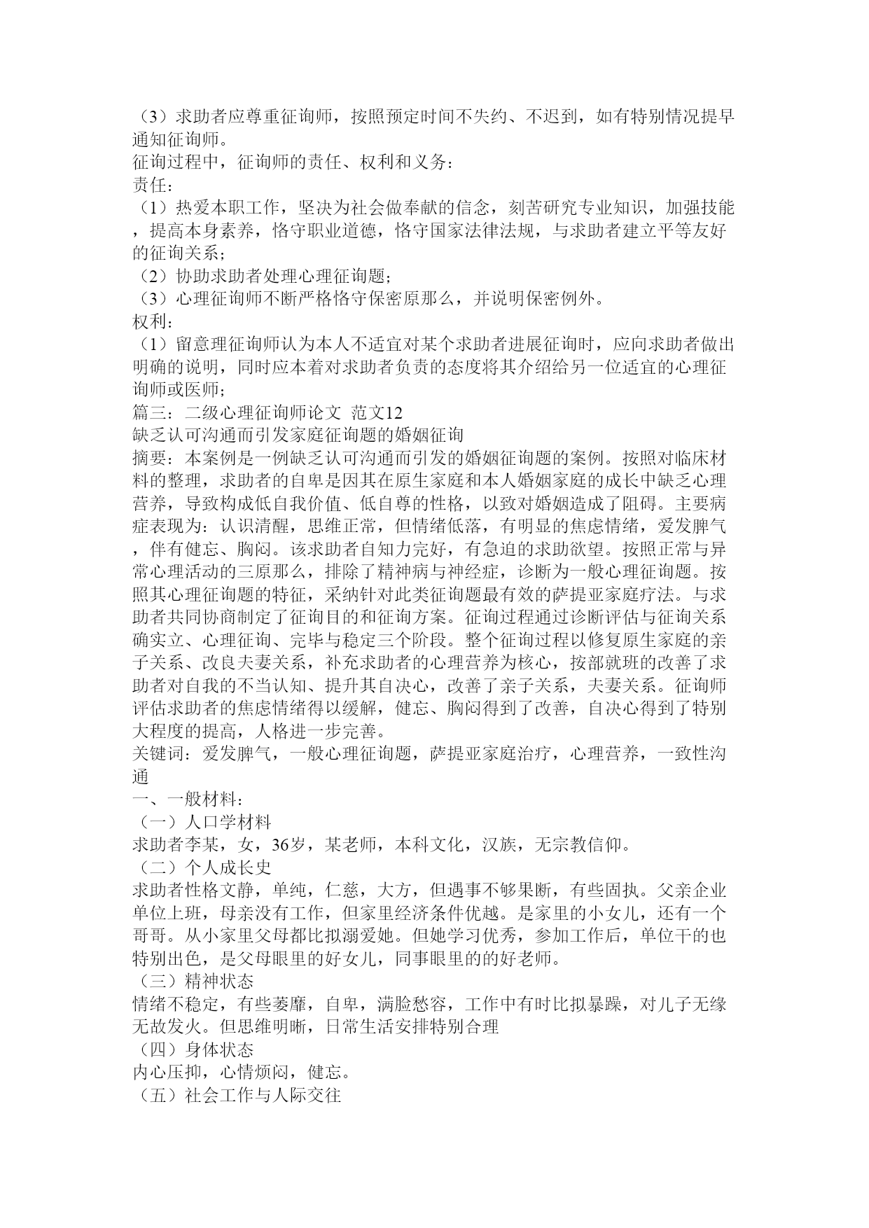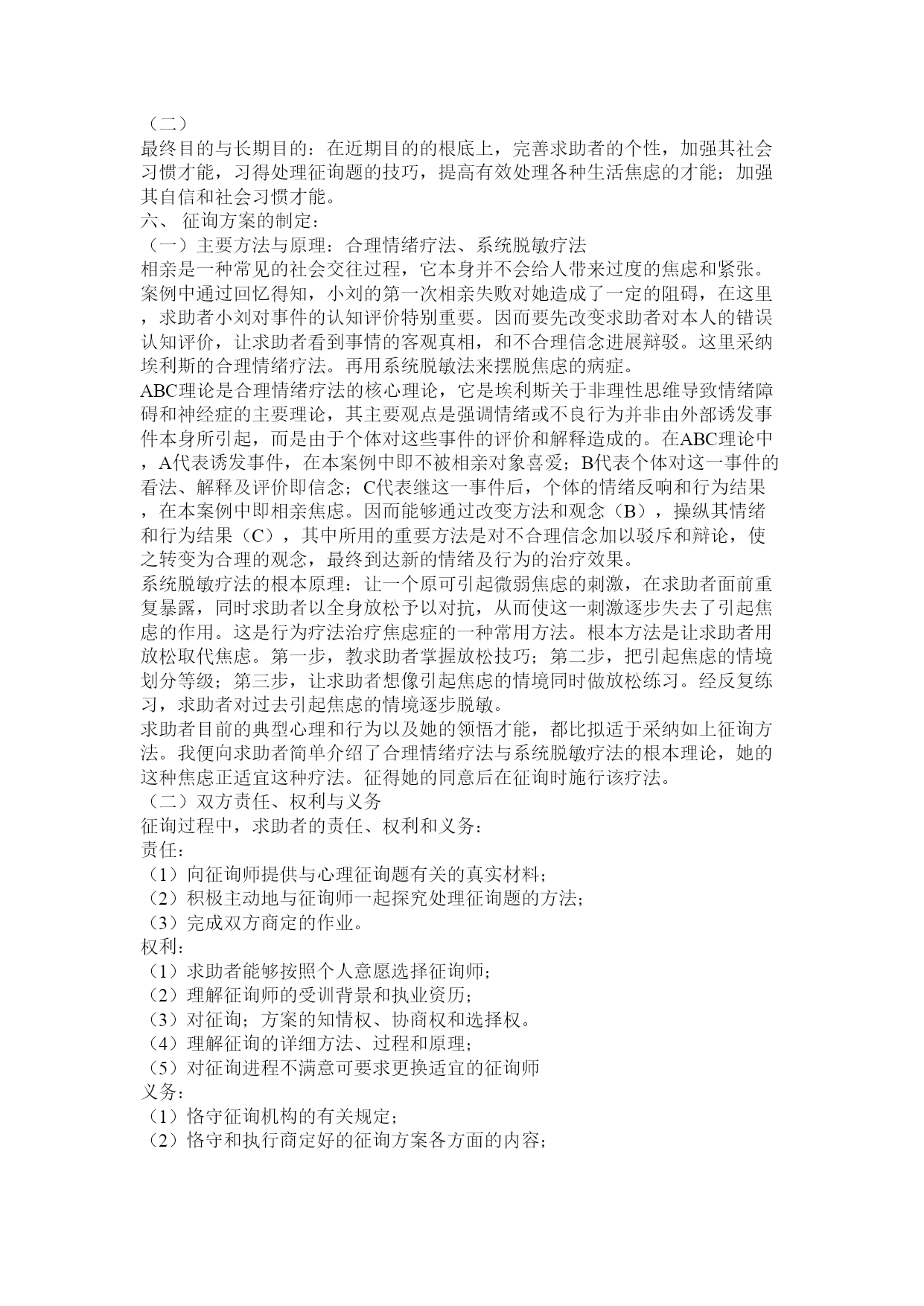 二级心理征询师论文篇一:国家二级心理征询师论文辩论稿国家二级心理征询师论文辩论稿国家二级心理征询师的成绩已经出来了,顺利过关。不过理论考试和技能考试预备起来较容易,略微费点神的是论文辩论.但是,过完之后觉察也没有那么困难。但是,前提必须是,对本人的论文,尤其是案例报告内容熟悉,且不要有硬伤。根本的量表以及征询技能和方法得熟悉,如此的话根本就没有什么征询题了。现将我的论文辩论稿存在这里。国家二级心理征询师论文辩论稿尊敬的评审老师,你们好!我叫###,今年35岁,是一名高中老师。能有时机参加这次的论文辩论,倾听各位专家的指导,我感到特别荣幸。按照要求,我撰写了两篇论文。一篇是《一例严峻心理征询题案例报告》,一篇是《我的成长》。接下来,我就这两篇文章作简短的陈述。下面我来陈述一下我的个人成长报告。最初关于爱与关心的体验首先来自我的父母,他们的养育不仅开展了我的自主感、主动感,同时也构成了我对人最根本的信任感,让我相信这个世界是美妙的,是充满希望的。在与家人的和乐相处中,那么让我深深的体会了包容、责任、尊重和互助的深化内涵。生活尽管平淡却处处充满了温馨与幸福感。也许是太过一帆风顺,小小的挫折对我来说也是重重的打击,这让我变得消沉变得不自信。好在这种情况没有持续特别长时间,是我的老师和父母引导我走出这种窘境。我希望能够在这条路上不断走下去,协助更多需要协助的人,让他们能够欢乐、充实的度过生命中的每一天。心理征询的开展是时代开展的趋势,将会得到越来越多人的认可,特别有开展前景。成为一名优秀的心理征询师是我的理想,我也将努力朝着这个目的迈进。关于案例报告,我选择的是高三女生严峻心理征询题的案例,在征询过程中,从求助者的个人陈述、父母的反映和我的观察,掌握了求助者的根本情况,该求助者的主要征询题是面对立即到来的高考,出现了考试焦虑。主要表如今三、四个月以来,上课留意力不集中,经常失眠,并伴有肠胃不适、恶心呕吐等躯体病症,成绩下滑。想到高考临近,别人状态越来越好,本人内心就十分紧张、苦恼。再结合心理测验的结果,最后诊断为严峻心理征询题。造成求助者心理征询题主要缘故主要有社会缘故和心理缘故。社会缘故:来自家庭教育的缘故以及四周的人对她的期望高。心理缘故:求助者性格内向,个性追求完满,自我要求较高,主要是存在错误认知。按照求助者的心理征询题外在表现为紧张、害怕考试,留意力不集中,失眠等;内在缘故却是由于自我要求过高,对考试的错误认知等要素造成的。针对该求助者的情况,我决定采纳认知行为疗法进展征询,改变求助者的不合理的信念,最终改变其认知,并指导求助者运用放松技巧和积极的自我暗示来消除不良的情绪和行为。征询过程分为三个阶段,1.诊断评估与征询关系建立阶段2.心理协助阶段3.完毕与稳定阶段。每周一次,每次50分钟,共四次。第一次,主要是搜集求助者的详细材料,与求助者建立良好的征询关系。第二次征询,与求助者从生物、社会、心理等方面讨论产生考试焦虑的缘故,认识本人不良的认知方式。第三次征询,学习放松技巧和进展积极的自我暗示。第四次主要是稳定和完毕阶段。通过四次的征询,求助者的病症有了明显的改善。求助者上课能集中留意力听讲,不失眠了。想到考试也不再感到紧张害怕了。这是我提早写好的辩论稿,本人已经烂熟于心,但是,确实辩论的时候仍然有些紧张。辩论老师间隔本人没有想象的远一些,感受也就有一米多的模样。三位老师,只有中间的一个还看看我,两边的老师只是在翻看我的论文材料。不过,辩论主席指示让我简单陈述个人成长报告,重点说案例。还好,我确实是如此预备的。针对我的论文,提了这么几个征询题:1、这个案例你诊断为严峻心理征询题是吧?2、诊断的按照是什么?3、既然是严峻心理征询题,你只征询了四次就搞定了?4、SCL—90一共有多少个因子啊?你为什么只写了这几个数据?5、卡氏16PF有多少因子?为什么你只提到了三个?6、你还熟悉那些心理流派?7、你所明白的行为疗法有哪些?8、你为什么想考心理征询师?最后,辩论主席拉家常一样说:你是中学老师?在哪里参加培训的啊?都是那儿的老师给你们上课啊?我一一答复完毕之后,他说,好了,你能够回去了。我礼貌的辞别,然后离开。篇二:国家二级心理征询师案例论文2016年最新(已通过评审)一那么关于相亲焦虑的案例报告摘要:本文是对一例成年人相亲焦虑进展征询的案例报告,主要采纳了合理情绪疗法、放松训练、系统脱敏疗法等治疗技术,使其消除关于相亲的焦虑。并对征询效果进展了回访、跟踪与评估,属成功征询案例。一、一般材料:求助者小刘,女,汉族,26周岁,单身,个性内向,追求完满。银行职员,独生女,未婚。从小到大生长发育正常,体态正常,无严峻躯体疾病历史和严峻的心理障碍,目前身体健康。父母常年在外做生意