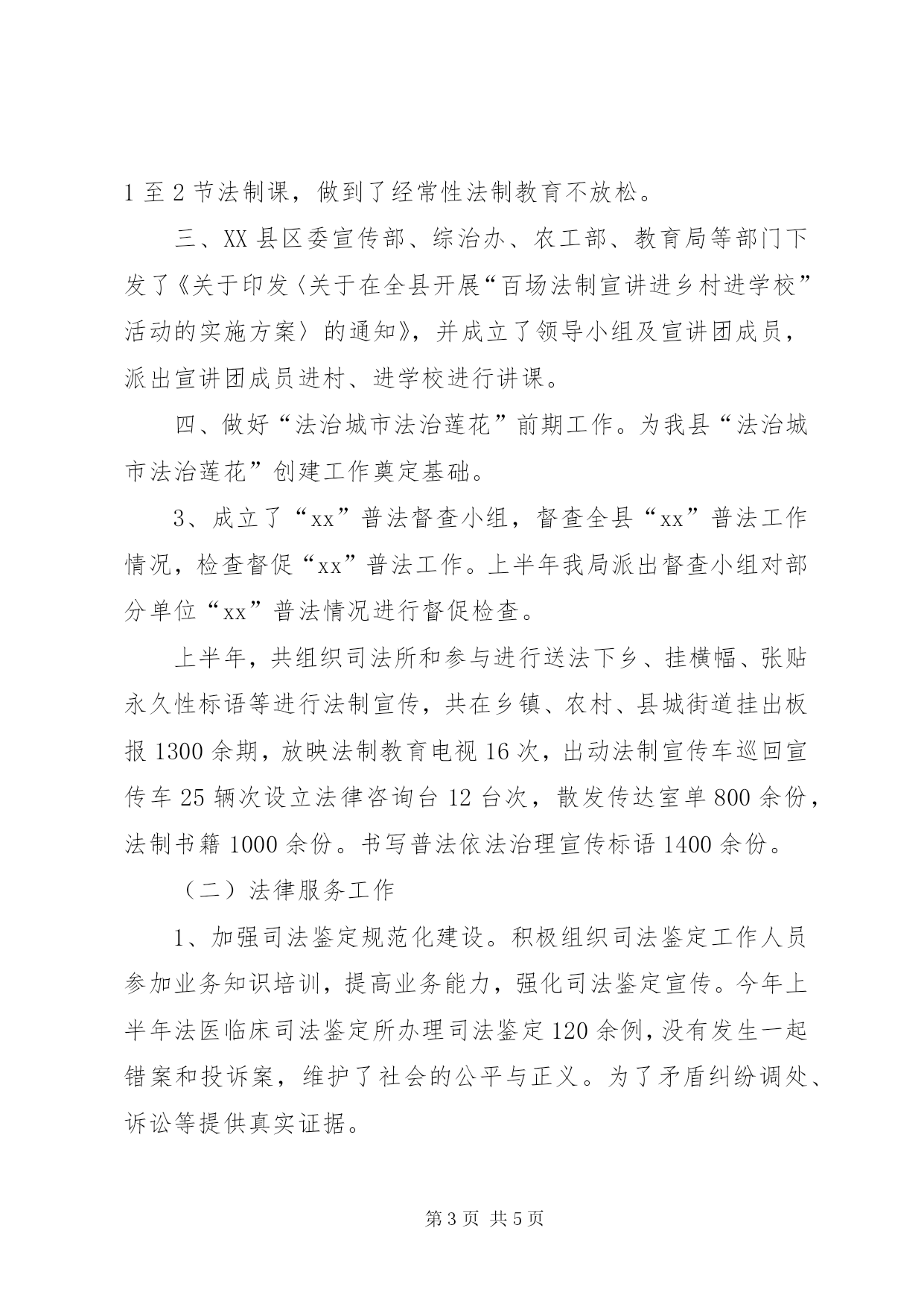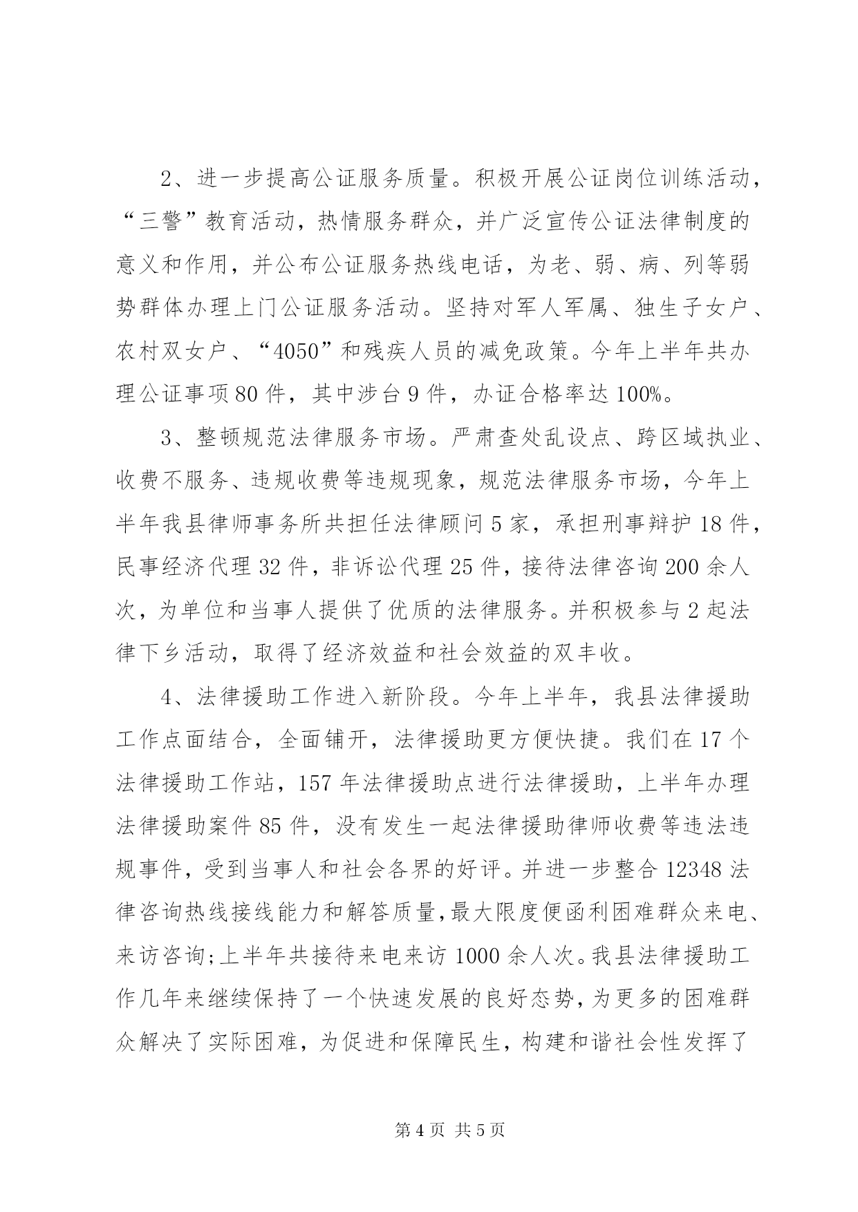 第PAGE\*Arabic\*MERGEFORMAT5页共NUMPAGES\*MERGEFORMAT5页XX年司法局干部述职述廉报告范文xx年,我做为县司法局综合治理领导副组长,是我局的综合治理工作的直接责任人,现将一年来的工作情况述职如下:一、抓综治工作的指导思想县司法局是政法的一个精神文明建设的“窗口”单位,综治工作好坏直接影响到政法“窗口”形象的建设。因此,对于综治工作从我自己的思想上时刻也没有放松工作要求,半年来在政法委、综治办的领导下,以“三个代表”重要思想为指导,以维护内部安全稳定为重点,按照全面建设“和谐平安莲花”的要求,坚持“打防并举、预防为主”的工作方针,积极推进“平安单位”建设,强化社会治安综合治理目标管理责任制和领导责任制,维护内部政治稳定、治安安定,加强治安消防管理和综治宣传,积极开展矛盾纠纷调解工作,巩固完善基层基础工作和考核制度等,努力为政法机关发展创造稳定和谐的内部环境和公正高效的法制环境做出了贡献。二、我局的基本情况xx年,在县综治办的领导下,在律师事务所、公证处、司法所的支持下,全局干部职工积极工作,认真负责,没有发生过一起安全责任事故,没有发生过一起治安安全事件、没有发生一起违法犯罪事件。全局设有办公室、基层股、法宣股、公律股等五个部门。三、严格执行综合治理领导责任制年初,根据县综治办的综合治理要点,我局出台了《xx年县司法局社会治安综合治理要点》对今年的社会综合治理工作重点进行了安排,局长与律师事务所、公证处签定了《司法局xx年社会治安综合治理目标管理责任书》,我局的综治工作做到了与经济工作同布置、同考核、同奖惩。通过层层签定责任书,我局的综合治理工作得到了逐级落实,责任到人。四、具体工作(一)法制宣传工作1、强化今年重点普法学法用法。一是下发了《xx年全县普法依法治理工作要点》,明确全年工作目标任务,突出重点,有步聚、分层次地推进学法用法的普及工作;二选准教育内容,突出关联性,针对普法对象因人施教,先后开展了今年普法重点“四法一理念”即社会主义法治理念和侵权责任法、统计法、食品安全法、可再生能源法等法律宣传:三是为认真做好普法工作,县法制宣传教育领导小组下发了普法书籍征订工作文件。2、认真做好全县普法依法治理工作,提高社会人员法律意识。一是在全县继续推广实施法律进祠堂“五个一”工程,使全县农村议事活动的祠堂变成农民学法讲法的课堂,有力促进全县农村社会治安状况的根本好转。二是加强青少年法制教育和机关干部学法用法宣传。全县中小学法制副校长,每学期为学生上了1至2节法制课,做到了经常性法制教育不放松。三、XX县区委宣传部、综治办、农工部、教育局等部门下发了《关于印发〈关于在全县开展“百场法制宣讲进乡村进学校”活动的实施方案〉的通知》,并成立了领导小组及宣讲团成员,派出宣讲团成员进村、进学校进行讲课。四、做好“法治城市法治莲花”前期工作。为我县“法治城市法治莲花”创建工作奠定基础。3、成立了“xx”普法督查小组,督查全县“xx”普法工作情况,检查督促“xx”普法工作。上半年我局派出督查小组对部分单位“xx”普法情况进行督促检查。上半年,共组织司法所和参与进行送法下乡、挂横幅、张贴永久性标语等进行法制宣传,共在乡镇、农村、县城街道挂出板报1300余期,放映法制教育电视16次,出动法制宣传车巡回宣传车25辆次设立法律咨询台12台次,散发传达室单800余份,法制书籍1000余份。书写普法依法治理宣传标语1400余份。(二)法律服务工作1、加强司法鉴定规范化建设。积极组织司法鉴定工作人员参加业务知识培训,提高业务能力,强化司法鉴定宣传。今年上半年法医临床司法鉴定所办理司法鉴定120余例,没有发生一起错案和投诉案,维护了社会的公平与正义。为了矛盾纠纷调处、诉讼等提供真实证据。2、进一步提高公证服务质量。积极开展公证岗位训练活动,“三警”教育活动,热情服务群众,并广泛宣传公证法律制度的意义和作用,并公布公证服务热线电话,为老、弱、病、列等弱势群体办理上门公证服务活动。坚持对军人军属、独生子女户、农村双女户、“4050”和残疾人员的减免政策。今年上半年共办理公证事项80件,其中涉台9件,办证合格率达100%。3、整顿规范法律服务市场。严肃查处乱设点、跨区域执业、收费不服务、违规收费等违规现象,规范法律服务市场,今年上半年我县律师事务所共担任法律顾问5家,承担刑事辩护18件,民事经济代理32件,非诉讼代理25件,接待法律咨询200余人次,为单位和当事人提供了优质的法律服务。并积极参与2起法律下乡活动,取得了经济效益和社会效益的双丰收。4、法律援助工作进入新阶段。今年上半年,我县法律援助工作点面结合,全面铺开,法律援助更方便快捷。我们在17个法律援助工作站,157年法律援助点进行法律援助