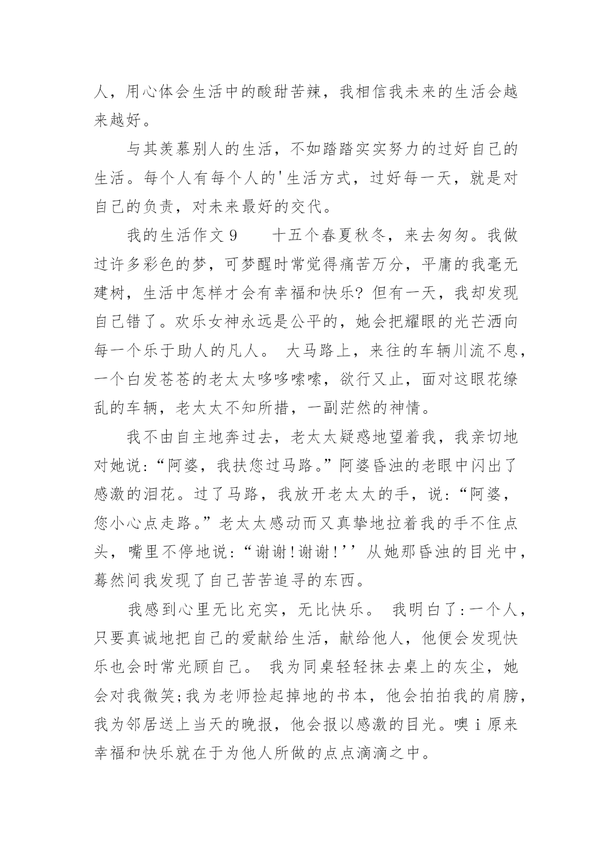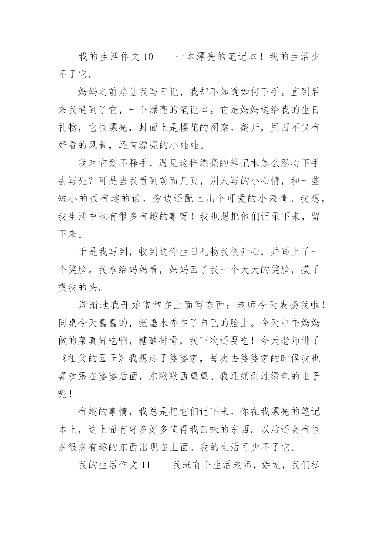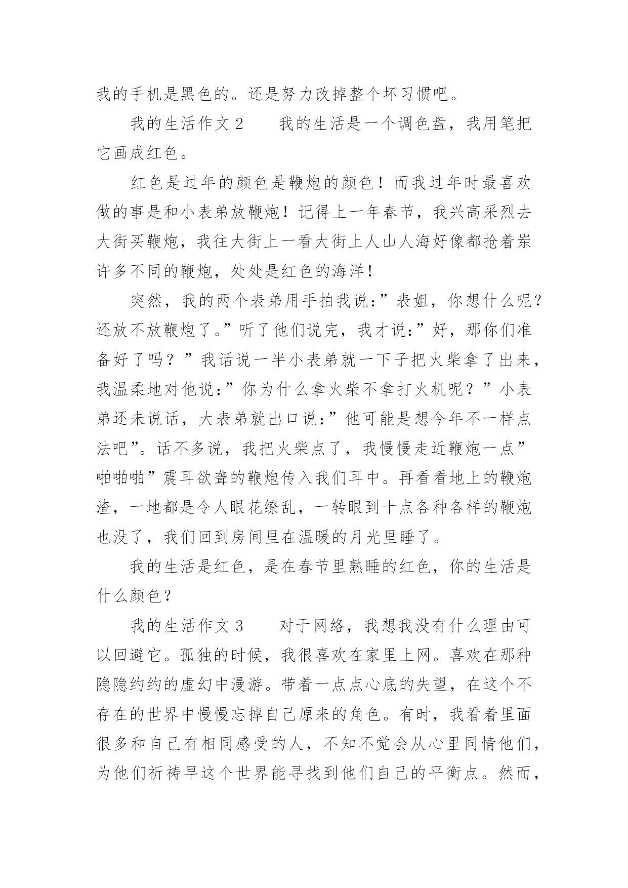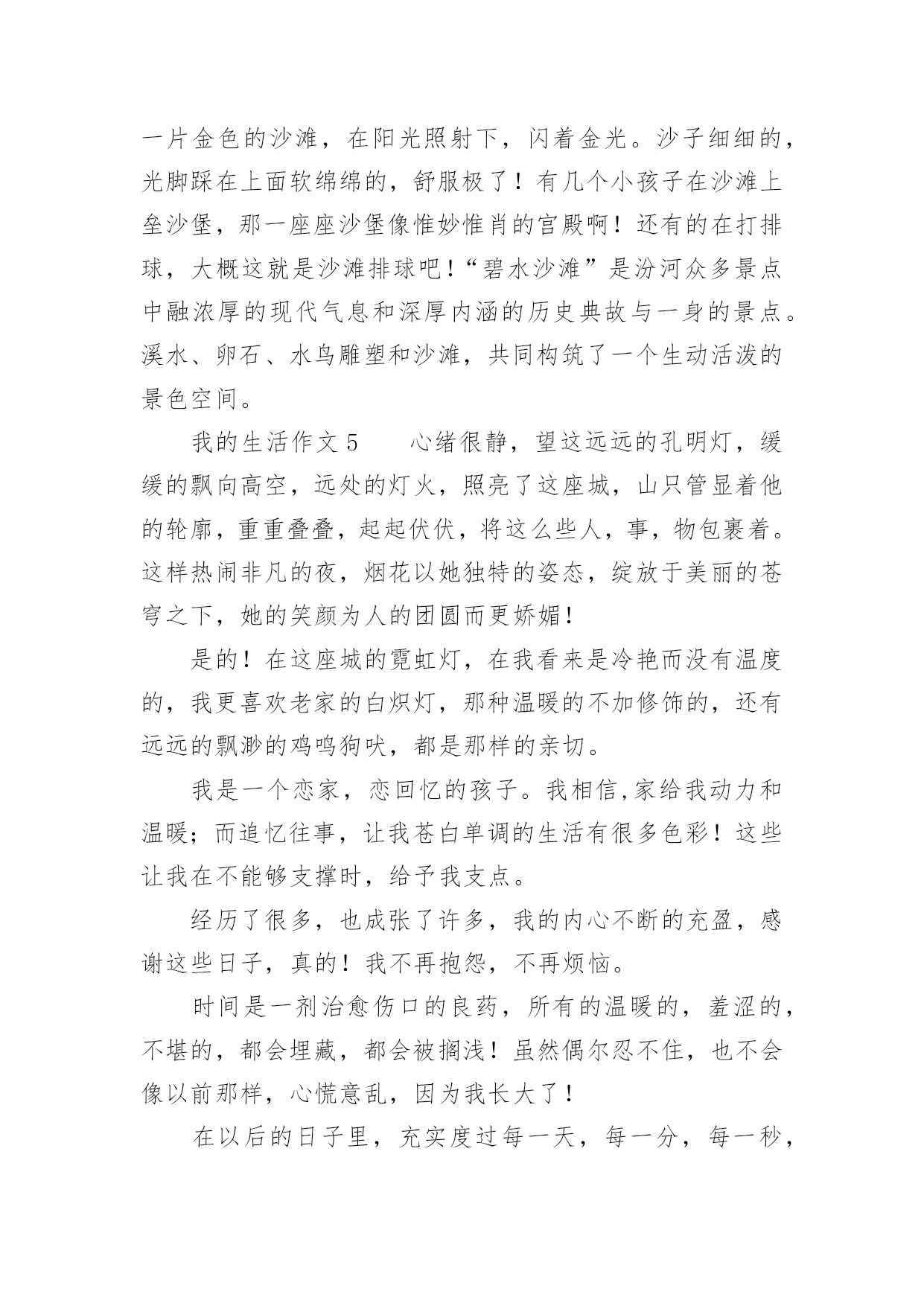 我的生活作文我的生活作文在日常生活或是工作学习中,大家都有写作文的经历,对作文很是熟悉吧,作文根据写作时限的不同可以分为限时作文和非限时作文。你知道作文怎样才能写的好吗?以下是小编为大家整理的我的生活作文,希望对大家有所帮助。我的生活作文1睡觉:所有人都会睡觉,睡觉的样子也都不一样,有的人睡觉姿势是弯的,有的人睡觉姿势是直的。有的人只要一失眠,身体就长得很不好,小朋友们应该按时睡觉。中性笔:我就有一只中性笔,b的顶端有一个可爱的牛油果,写起字来很有弹性。牛油果旁边还有一片细小的叶子,我的笔的颜色是牛油果绿的,第二层是白色,而最后一层是黑色的。球鞋:它的颜色是蓝色,里面还有一点黄色,它的牌子是361的,穿着很舒服。我每天都穿着它,有时我还穿着它打篮球。情绪:每个人都有自己不一样的情绪,有开心、愤怒、骄傲、悲伤比如,我打篮球胜利时是开心的,失败时是愤怒的。我很少骄傲,因为我的学习还不够好,我要加油,在加油了。手机:老师说小孩都不能看手机,有时候我有一点忍不住,因为手机里面有《和平精英》、《元气骑士》日记大全,我的手机是黑色的。还是努力改掉整个坏习惯吧。我的生活作文2我的生活是一个调色盘,我用笔把它画成红色。红色是过年的颜色是鞭炮的颜色!而我过年时最喜欢做的事是和小表弟放鞭炮!记得上一年春节,我兴高采烈去大街买鞭炮,我往大街上一看大街上人山人海好像都抢着岽许多不同的鞭炮,处处是红色的海洋!突然,我的两个表弟用手拍我说:”表姐,你想什么呢?还放不放鞭炮了。”听了他们说完,我才说:”好,那你们准备好了吗?”我话说一半小表弟就一下子把火柴拿了出来,我温柔地对他说:”你为什么拿火柴不拿打火机呢?”小表弟还未说话,大表弟就出口说:”他可能是想今年不一样点法吧”。话不多说,我把火柴点了,我慢慢走近鞭炮一点”啪啪啪”震耳欲聋的鞭炮传入我们耳中。再看看地上的鞭炮渣,一地都是令人眼花缭乱,一转眼到十点各种各样的鞭炮也没了,我们回到房间里在温暖的月光里睡了。我的生活是红色,是在春节里熟睡的红色,你的生活是什么颜色?我的生活作文3对于网络,我想我没有什么理由可以回避它。孤独的时候,我很喜欢在家里上网。喜欢在那种隐隐约约的虚幻中漫游。带着一点点心底的失望,在这个不存在的世界中慢慢忘掉自己原来的角色。有时,我看着里面很多和自己有相同感受的人,不知不觉会从心里同情他们,为他们祈祷早这个世界能寻找到他们自己的平衡点。然而,更多的时候,我是在为自己默默祈祷。我知道只有这样做,我才会获得一点点的安全感。不知道什么时候,发现自己渐渐开始沉默起来,好像一夜之间完全厌倦了这个世界。原先所有的记忆和印象都变得有些麻木了。周围的一切象是冰砌成的,每一寸的目光都被冰凉着,一点点散发冰冷的寒气。我想我是累了。等我醒来的时候,我才发现自己的生活慢慢地开始苍老。最后其实,回忆有时候也是美的,就象是夏夜天空的繁星一样。我希望自己的生活能象是那挂满了星星的夜空,永远不会孤独。这样我就可以满足了。我的生活作文4星期天,我们小记者社团相聚在美丽的汾河公园“碧水沙滩”。我们组的是诗朗诵《妈妈的爱》。每一个小记者满怀热情的朗诵表演赢得了在场的其他社团小组热烈的掌声。活动结束,自活动时间开始啦!我和妈妈漫步在美丽得分和岸边,只见那清澈见底的河水如一面平静,水草游动的鱼儿看得清清楚楚。鱼儿在水中快活的游动,不时地摆动着尾巴,溅起晶莹的水珠,美丽极了!放眼远眺,柳树姑娘的长发随风飞舞,仿佛一位美丽的少女梳理她美丽的秀发。游人们脸上笑开了花,陶醉在这美丽的景色之中。汾河公园的“碧水沙滩”这个景区有一个大大的人工湖,湖水是绿色的还有些水草所以取名“碧水”。人工湖旁边有一片金色的沙滩,在阳光照射下,闪着金光。沙子细细的,光脚踩在上面软绵绵的,舒服极了!有几个小孩子在沙滩上垒沙堡,那一座座沙堡像惟妙惟肖的宫殿啊!还有的在打排球,大概这就是沙滩排球吧!“碧水沙滩”是汾河众多景点中融浓厚的现代气息和深厚内涵的历史典故与一身的景点。溪水、卵石、水鸟雕塑和沙滩,共同构筑了一个生动活泼的景色空间。我的生活作文5心绪很静,望这远远的孔明灯,缓缓的飘向高空,远处的灯火,照亮了这座城,山只管显着他的轮廓,重重叠叠,起起伏伏,将这么些人,事,物包裹着。这样热闹非凡的夜,烟花以她独特的姿态,绽放于美丽的苍穹之下,她的笑颜为人的团圆而更娇媚!是的!在这座城的霓虹灯,在我看来是冷艳而没有温度的,我更喜欢老家的白炽灯,那种温暖的不加修饰的,还有远远的飘渺的鸡鸣狗吠,都是那样的亲切。我是一个恋家,恋回忆的孩子。我相信,家给我动力和温暖;而追忆往事,让我苍白单调的生活有很多色彩!这些让我在不能够支撑时,给予我支点。经历了很多,也成张了许多,我的内心不断的充盈,感谢这些日子,真的!我不再抱怨,不再烦恼。时间是一剂治愈伤口的良药,所有的温