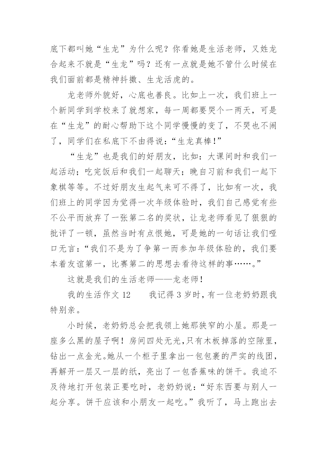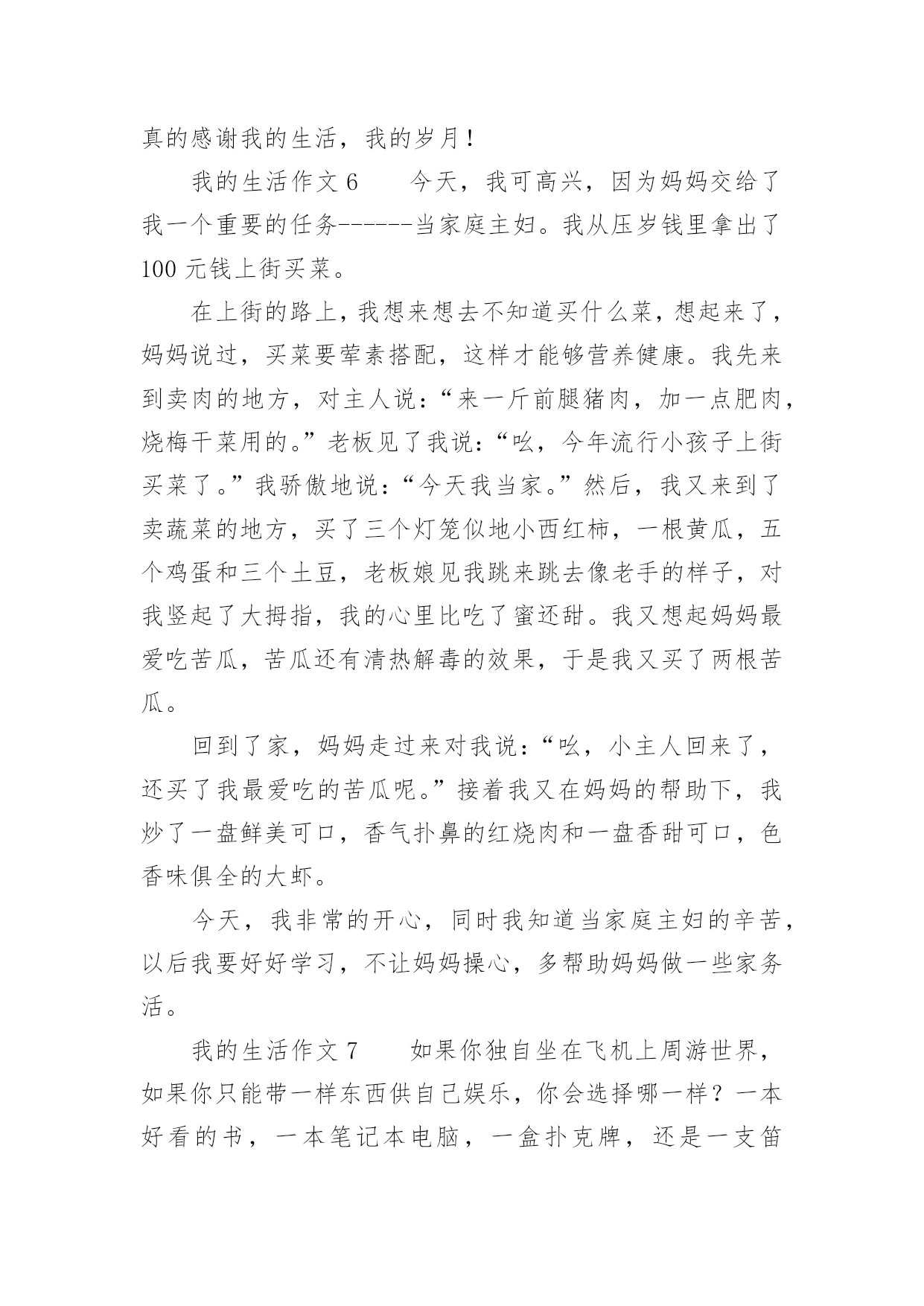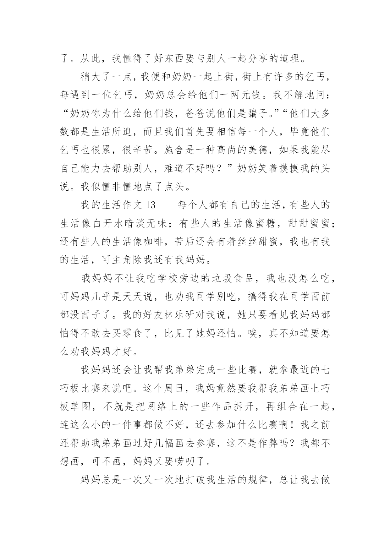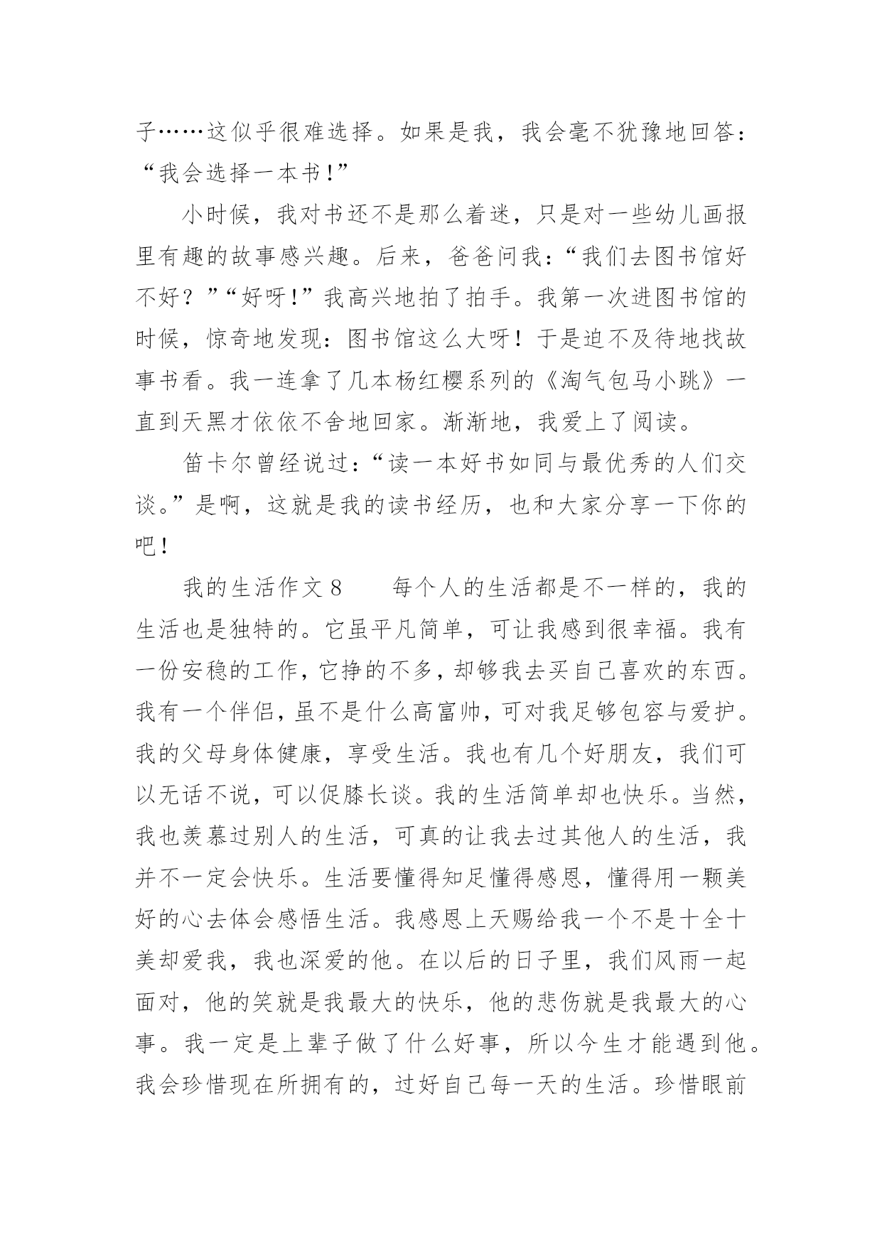 我的生活作文我的生活作文在日常生活或是工作学习中,大家都有写作文的经历,对作文很是熟悉吧,作文根据写作时限的不同可以分为限时作文和非限时作文。你知道作文怎样才能写的好吗?以下是小编为大家整理的我的生活作文,希望对大家有所帮助。我的生活作文1睡觉:所有人都会睡觉,睡觉的样子也都不一样,有的人睡觉姿势是弯的,有的人睡觉姿势是直的。有的人只要一失眠,身体就长得很不好,小朋友们应该按时睡觉。中性笔:我就有一只中性笔,b的顶端有一个可爱的牛油果,写起字来很有弹性。牛油果旁边还有一片细小的叶子,我的笔的颜色是牛油果绿的,第二层是白色,而最后一层是黑色的。球鞋:它的颜色是蓝色,里面还有一点黄色,它的牌子是361的,穿着很舒服。我每天都穿着它,有时我还穿着它打篮球。情绪:每个人都有自己不一样的情绪,有开心、愤怒、骄傲、悲伤比如,我打篮球胜利时是开心的,失败时是愤怒的。我很少骄傲,因为我的学习还不够好,我要加油,在加油了。手机:老师说小孩都不能看手机,有时候我有一点忍不住,因为手机里面有《和平精英》、《元气骑士》日记大全,我的手机是黑色的。还是努力改掉整个坏习惯吧。我的生活作文2我的生活是一个调色盘,我用笔把它画成红色。红色是过年的颜色是鞭炮的颜色!而我过年时最喜欢做的事是和小表弟放鞭炮!记得上一年春节,我兴高采烈去大街买鞭炮,我往大街上一看大街上人山人海好像都抢着岽许多不同的鞭炮,处处是红色的海洋!突然,我的两个表弟用手拍我说:”表姐,你想什么呢?还放不放鞭炮了。”听了他们说完,我才说:”好,那你们准备好了吗?”我话说一半小表弟就一下子把火柴拿了出来,我温柔地对他说:”你为什么拿火柴不拿打火机呢?”小表弟还未说话,大表弟就出口说:”他可能是想今年不一样点法吧”。话不多说,我把火柴点了,我慢慢走近鞭炮一点”啪啪啪”震耳欲聋的鞭炮传入我们耳中。再看看地上的鞭炮渣,一地都是令人眼花缭乱,一转眼到十点各种各样的鞭炮也没了,我们回到房间里在温暖的月光里睡了。我的生活是红色,是在春节里熟睡的红色,你的生活是什么颜色?我的生活作文3对于网络,我想我没有什么理由可以回避它。孤独的时候,我很喜欢在家里上网。喜欢在那种隐隐约约的虚幻中漫游。带着一点点心底的失望,在这个不存在的世界中慢慢忘掉自己原来的角色。有时,我看着里面很多和自己有相同感受的人,不知不觉会从心里同情他们,为他们祈祷早这个世界能寻找到他们自己的平衡点。然而,更多的时候,我是在为自己默默祈祷。我知道只有这样做,我才会获得一点点的安全感。不知道什么时候,发现自己渐渐开始沉默起来,好像一夜之间完全厌倦了这个世界。原先所有的记忆和印象都变得有些麻木了。周围的一切象是冰砌成的,每一寸的目光都被冰凉着,一点点散发冰冷的寒气。我想我是累了。等我醒来的时候,我才发现自己的生活慢慢地开始苍老。最后其实,回忆有时候也是美的,就象是夏夜天空的繁星一样。我希望自己的生活能象是那挂满了星星的夜空,永远不会孤独。这样我就可以满足了。我的生活作文4星期天,我们小记者社团相聚在美丽的汾河公园“碧水沙滩”。我们组的是诗朗诵《妈妈的爱》。每一个小记者满怀热情的朗诵表演赢得了在场的其他社团小组热烈的掌声。活动结束,自活动时间开始啦!我和妈妈漫步在美丽得分和岸边,只见那清澈见底的河水如一面平静,水草游动的鱼儿看得清清楚楚。鱼儿在水中快活的游动,不时地摆动着尾巴,溅起晶莹的水珠,美丽极了!放眼远眺,柳树姑娘的长发随风飞舞,仿佛一位美丽的少女梳理她美丽的秀发。游人们脸上笑开了花,陶醉在这美丽的景色之中。汾河公园的“碧水沙滩”这个景区有一个大大的人工湖,湖水是绿色的还有些水草所以取名“碧水”。人工湖旁边有一片金色的沙滩,在阳光照射下,闪着金光。沙子细细的,光脚踩在上面软绵绵的,舒服极了!有几个小孩子在沙滩上垒沙堡,那一座座沙堡像惟妙惟肖的宫殿啊!还有的在打排球,大概这就是沙滩排球吧!“碧水沙滩”是汾河众多景点中融浓厚的现代气息和深厚内涵的历史典故与一身的景点。溪水、卵石、水鸟雕塑和沙滩,共同构筑了一个生动活泼的景色空间。我的生活作文5心绪很静,望这远远的孔明灯,缓缓的飘向高空,远处的灯火,照亮了这座城,山只管显着他的轮廓,重重叠叠,起起伏伏,将这么些人,事,物包裹着。这样热闹非凡的夜,烟花以她独特的姿态,绽放于美丽的苍穹之下,她的笑颜为人的团圆而更娇媚!是的!在这座城的霓虹灯,在我看来是冷艳而没有温度的,我更喜欢老家的白炽灯,那种温暖的不加修饰的,还有远远的飘渺的鸡鸣狗吠,都是那样的亲切。我是一个恋家,恋回忆的孩子。我相信,家给我动力和温暖;而追忆往事,让我苍白单调的生活有很多色彩!这些让我在不能够支撑时,给予我支点。经历了很多,也成张了许多,我的内心不断的充盈,感谢这些日子,真的!我不再抱怨,不再烦恼。时间是一剂治愈伤口的良药,所有的温