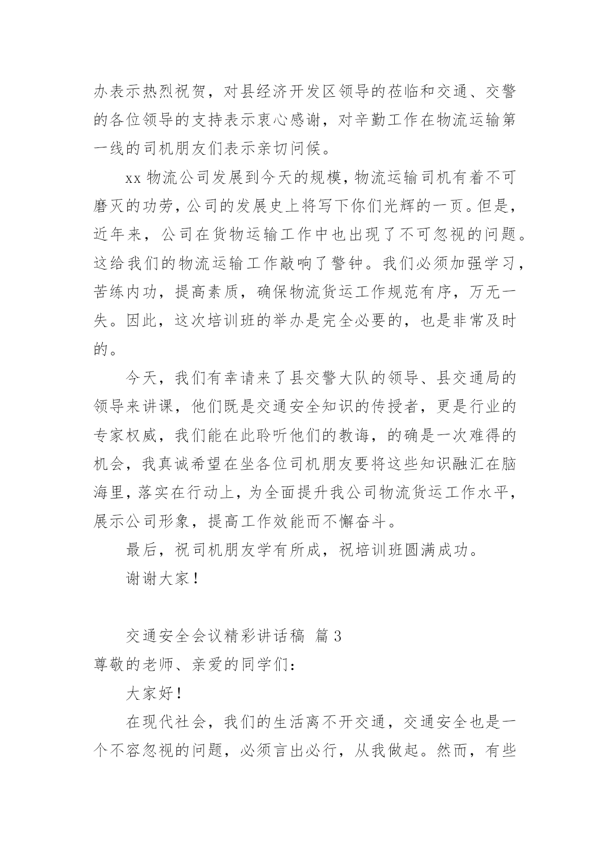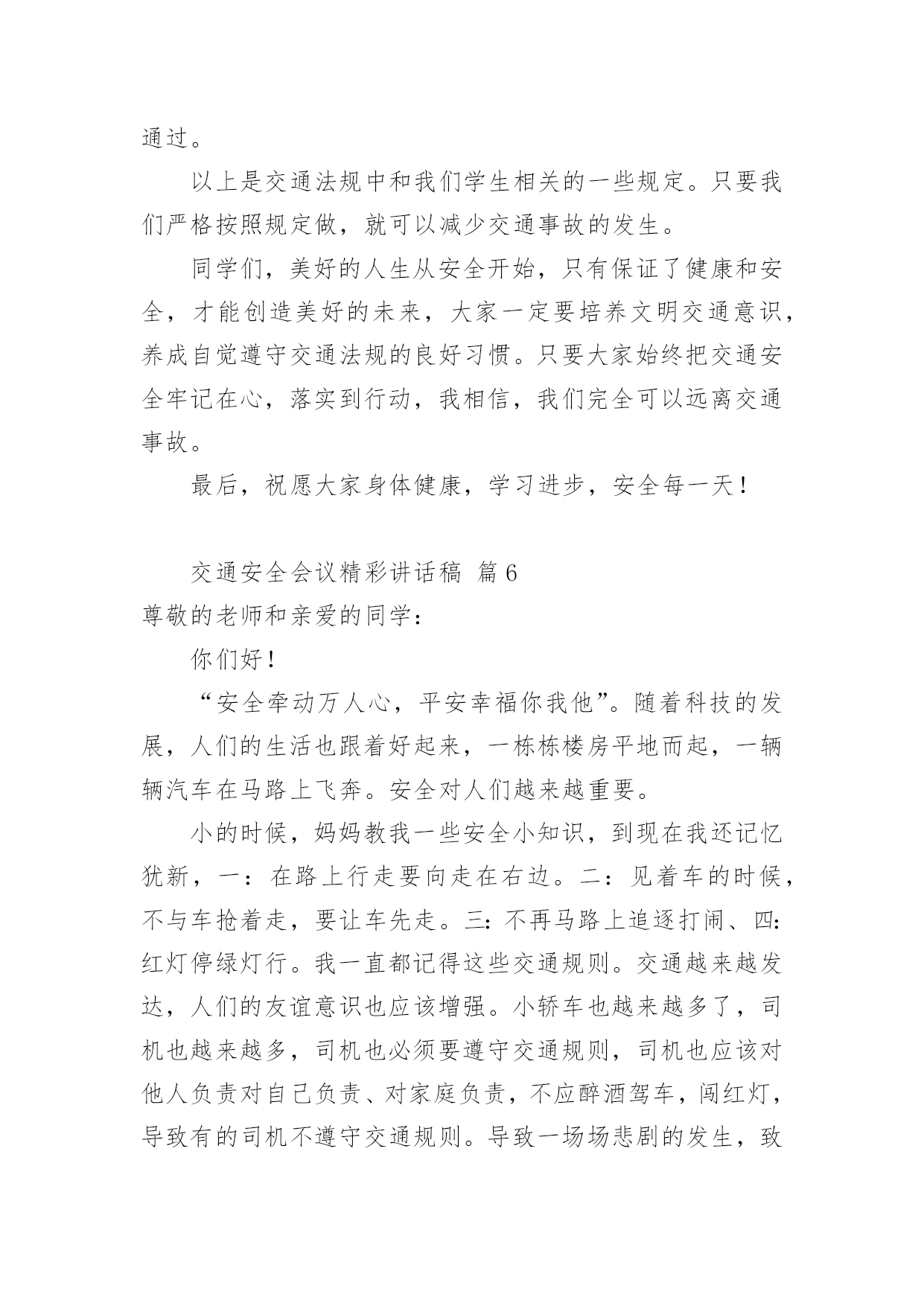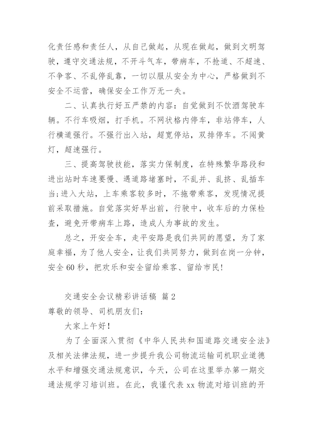 交通安全会议精彩讲话稿交通安全会议精彩讲话稿(精选15篇)在不断进步的时代,接触并使用讲话稿的人越来越多,讲话稿是人们在各种会议和一些较庄重、隆重的场合上发表带有宣传、指示、总结性质讲话的文稿。如何写一份恰当的讲话稿呢?以下是小编整理的交通安全会议精彩讲话稿(精选15篇),欢迎阅读与收藏。交通安全会议精彩讲话稿篇1各位领导,同志们:大家好!我是公交二公司xx车队驾驶员xx,很荣幸能够参加今天的会议。作为新时期的公交驾驶员,我认为安全就是最好服务,所以安全运营这根弦时刻都不能放松、也决不能随着驾龄的增长,就忽视、淡化安全工作。因为安全直接关系到乘客的生命和财产安全,更关系到社会的和谐稳定,把乘客视为亲人一般来抓安全保安全,既是确保运营的前提,也是对乘客的一种关爱。为了社会和谐,为了天津市交通的稳定,为了确保夏季运营的安全,结合这次开展的集中治理公交行车秩序活动,我作为青年驾驶员,向二公司全体驾驶员发出如下倡议:一、自觉遵守和认真学习《中华人民共和国道路安全法》,树立安全第一的思想,提高安全意识和安全素质,强化责任感和责任人,从自己做起,从现在做起,做到文明驾驶,遵守交通法规,不开斗气车,带病车,不抢道、不超速、不争客、不乱停乱靠,一切以服从安全为中心,严格做到不安全不运营,确保安全工作万无一失。二、认真执行好五严禁的内容:自觉做到不饮酒驾驶车辆。不行车吸烟,打手机。不网状格内停车,非站停车,人行横道强行。不强行出入站,超宽停站,双排停车。不闯黄灯,超速强行。三、提高驾驶技能,落实力保制度,在特殊繁华路段和进出站时车速要慢、遇道路堵塞时,不乱并、乱挤、乱插车当;进入大站,上车乘客较多时,不拖带乘客,发现情况提前采取措施。自觉落实好早出前,行驶中,收车后的力保检查,避免开带病车上路,造成人为事故的发生。总之,开安全车,走平安路是我们共同的愿望,为了家庭幸福,为了他人安全,让我们共同努力,做到在岗一分钟,安全60秒,把欢乐和安全留给乘客、留给市民!交通安全会议精彩讲话稿篇2尊敬的领导、司机朋友们:大家上午好!为了全面深入贯彻《中华人民共和国道路交通安全法》及相关法律法规,进一步提升我公司物流运输司机职业道德水平和增强交通法规意识,今天,公司在这里举办第一期交通法规学习培训班。在此,我谨代表xx物流对培训班的开办表示热烈祝贺,对县经济开发区领导的莅临和交通、交警的各位领导的支持表示衷心感谢,对辛勤工作在物流运输第一线的司机朋友们表示亲切问候。xx物流公司发展到今天的规模,物流运输司机有着不可磨灭的功劳,公司的发展史上将写下你们光辉的一页。但是,近年来,公司在货物运输工作中也出现了不可忽视的问题。这给我们的物流运输工作敲响了警钟。我们必须加强学习,苦练内功,提高素质,确保物流货运工作规范有序,万无一失。因此,这次培训班的举办是完全必要的,也是非常及时的。今天,我们有幸请来了县交警大队的领导、县交通局的领导来讲课,他们既是交通安全知识的传授者,更是行业的专家权威,我们能在此聆听他们的教诲,的确是一次难得的机会,我真诚希望在坐各位司机朋友要将这些知识融汇在脑海里,落实在行动上,为全面提升我公司物流货运工作水平,展示公司形象,提高工作效能而不懈奋斗。最后,祝司机朋友学有所成,祝培训班圆满成功。谢谢大家!交通安全会议精彩讲话稿篇3尊敬的老师、亲爱的同学们:大家好!在现代社会,我们的生活离不开交通,交通安全也是一个不容忽视的问题,必须言出必行,从我做起。然而,有些人不注意交通安全。你有没有想过,一点点的疏忽,可能会让你后悔一辈子?记得有一次,我从学校走回家的路上,突然听到不远处有“嘘——”的紧急刹车声和撞车声。听说一辆校车和一辆转弯的车相撞,车头撞上了校车尾部,校车的油漆被撞掉了,有的变形了,车的大灯也下来了。当时我的心猛地一抖,心想:校车上那么多学生有多危险!如果司机反应稍微慢一点,含苞待放的小花车可能还没开就被车祸撞死了。一想到这我就吓出一身冷汗。这时候双方业主吵起来了,我也靠近了一点。听说车主身上有股难闻的酒味,显然喝了不少酒。这时,交警也赶到现场处理交通事故。那些酒驾的人,不要让自己的生命徘徊在生死线上;不遵守交通规则的,请遵守交通规则!作为一名小学生,我必须以身作则,严格遵守交通规则。交通安全,从我做起。这是一个迫切的问题。让我们珍惜生命,关注交通安全。交通安全会议精彩讲话稿篇4各位领导,同事们:大家好!今天,我能参加总段开展的“学规章制度,做守纪模范”的演讲比赛,心情无比激动。我没有什么华丽的辞藻,但我希望通过我的真诚,唤醒大家对安全生产的重视,对生命的珍爱。我演讲的题目是“敲响心中的安全警钟”。哪一个人不愿笑语长在,哪一个家庭不愿幸福美满,哪一个企业不愿兴旺发达,哪一个国家不愿繁荣昌盛。安全就如一根七彩的丝线把我们这一个个美好的愿