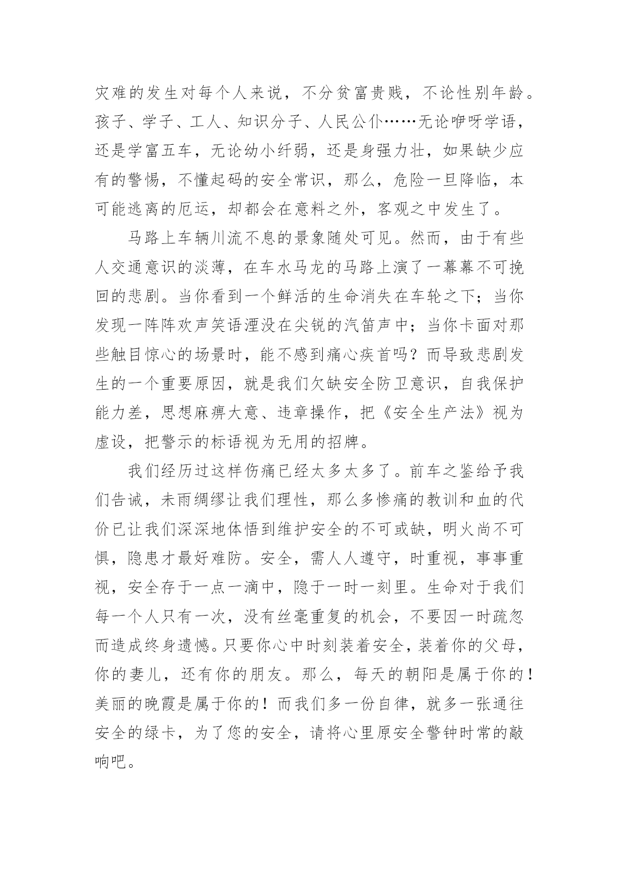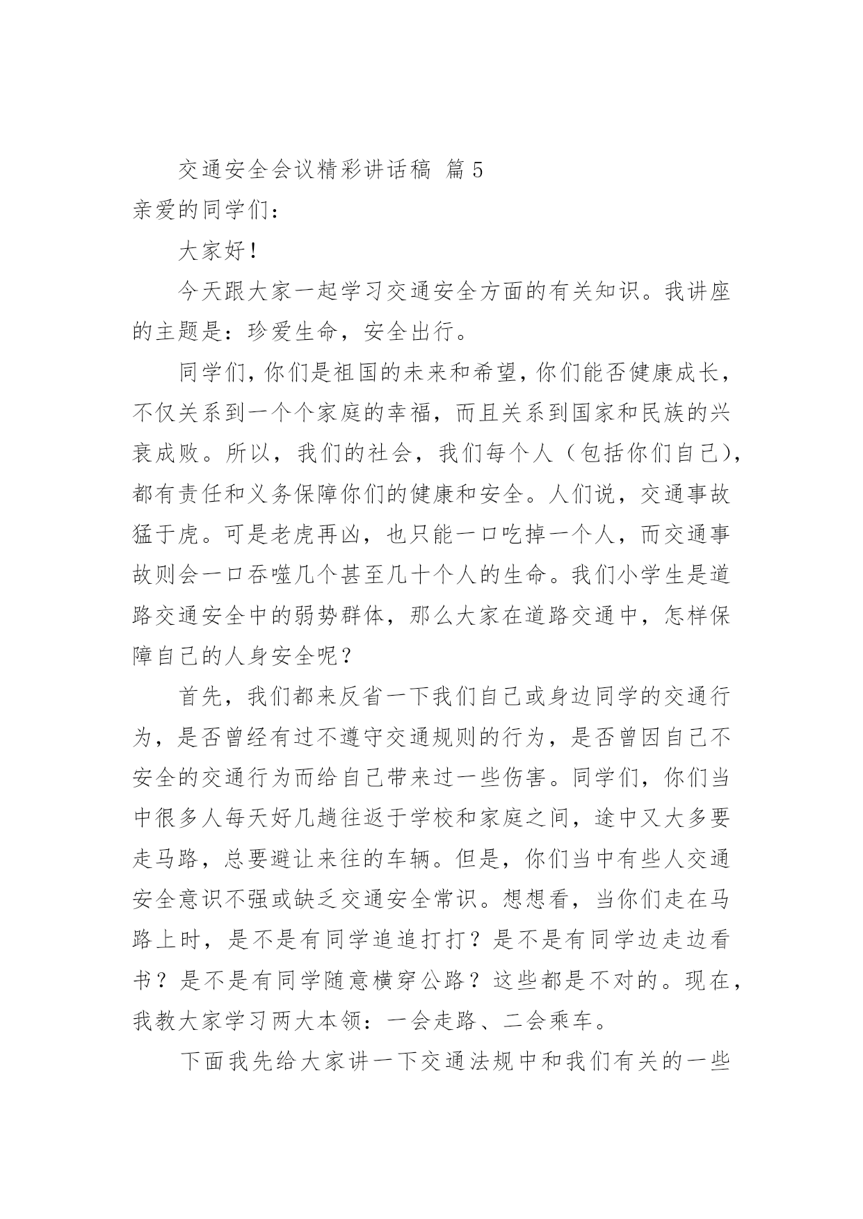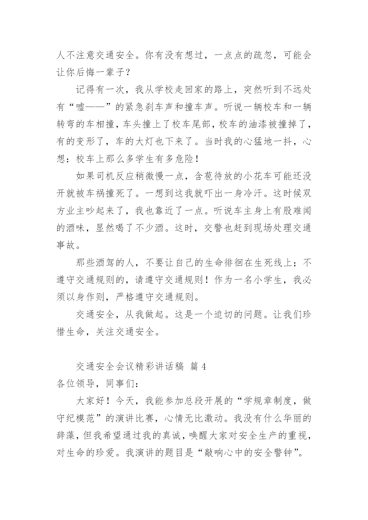 交通安全会议精彩讲话稿交通安全会议精彩讲话稿(精选15篇)在不断进步的时代,接触并使用讲话稿的人越来越多,讲话稿是人们在各种会议和一些较庄重、隆重的场合上发表带有宣传、指示、总结性质讲话的文稿。如何写一份恰当的讲话稿呢?以下是小编整理的交通安全会议精彩讲话稿(精选15篇),欢迎阅读与收藏。交通安全会议精彩讲话稿篇1各位领导,同志们:大家好!我是公交二公司xx车队驾驶员xx,很荣幸能够参加今天的会议。作为新时期的公交驾驶员,我认为安全就是最好服务,所以安全运营这根弦时刻都不能放松、也决不能随着驾龄的增长,就忽视、淡化安全工作。因为安全直接关系到乘客的生命和财产安全,更关系到社会的和谐稳定,把乘客视为亲人一般来抓安全保安全,既是确保运营的前提,也是对乘客的一种关爱。为了社会和谐,为了天津市交通的稳定,为了确保夏季运营的安全,结合这次开展的集中治理公交行车秩序活动,我作为青年驾驶员,向二公司全体驾驶员发出如下倡议:一、自觉遵守和认真学习《中华人民共和国道路安全法》,树立安全第一的思想,提高安全意识和安全素质,强化责任感和责任人,从自己做起,从现在做起,做到文明驾驶,遵守交通法规,不开斗气车,带病车,不抢道、不超速、不争客、不乱停乱靠,一切以服从安全为中心,严格做到不安全不运营,确保安全工作万无一失。二、认真执行好五严禁的内容:自觉做到不饮酒驾驶车辆。不行车吸烟,打手机。不网状格内停车,非站停车,人行横道强行。不强行出入站,超宽停站,双排停车。不闯黄灯,超速强行。三、提高驾驶技能,落实力保制度,在特殊繁华路段和进出站时车速要慢、遇道路堵塞时,不乱并、乱挤、乱插车当;进入大站,上车乘客较多时,不拖带乘客,发现情况提前采取措施。自觉落实好早出前,行驶中,收车后的力保检查,避免开带病车上路,造成人为事故的发生。总之,开安全车,走平安路是我们共同的愿望,为了家庭幸福,为了他人安全,让我们共同努力,做到在岗一分钟,安全60秒,把欢乐和安全留给乘客、留给市民!交通安全会议精彩讲话稿篇2尊敬的领导、司机朋友们:大家上午好!为了全面深入贯彻《中华人民共和国道路交通安全法》及相关法律法规,进一步提升我公司物流运输司机职业道德水平和增强交通法规意识,今天,公司在这里举办第一期交通法规学习培训班。在此,我谨代表xx物流对培训班的开办表示热烈祝贺,对县经济开发区领导的莅临和交通、交警的各位领导的支持表示衷心感谢,对辛勤工作在物流运输第一线的司机朋友们表示亲切问候。xx物流公司发展到今天的规模,物流运输司机有着不可磨灭的功劳,公司的发展史上将写下你们光辉的一页。但是,近年来,公司在货物运输工作中也出现了不可忽视的问题。这给我们的物流运输工作敲响了警钟。我们必须加强学习,苦练内功,提高素质,确保物流货运工作规范有序,万无一失。因此,这次培训班的举办是完全必要的,也是非常及时的。今天,我们有幸请来了县交警大队的领导、县交通局的领导来讲课,他们既是交通安全知识的传授者,更是行业的专家权威,我们能在此聆听他们的教诲,的确是一次难得的机会,我真诚希望在坐各位司机朋友要将这些知识融汇在脑海里,落实在行动上,为全面提升我公司物流货运工作水平,展示公司形象,提高工作效能而不懈奋斗。最后,祝司机朋友学有所成,祝培训班圆满成功。谢谢大家!交通安全会议精彩讲话稿篇3尊敬的老师、亲爱的同学们:大家好!在现代社会,我们的生活离不开交通,交通安全也是一个不容忽视的问题,必须言出必行,从我做起。然而,有些人不注意交通安全。你有没有想过,一点点的疏忽,可能会让你后悔一辈子?记得有一次,我从学校走回家的路上,突然听到不远处有“嘘——”的紧急刹车声和撞车声。听说一辆校车和一辆转弯的车相撞,车头撞上了校车尾部,校车的油漆被撞掉了,有的变形了,车的大灯也下来了。当时我的心猛地一抖,心想:校车上那么多学生有多危险!如果司机反应稍微慢一点,含苞待放的小花车可能还没开就被车祸撞死了。一想到这我就吓出一身冷汗。这时候双方业主吵起来了,我也靠近了一点。听说车主身上有股难闻的酒味,显然喝了不少酒。这时,交警也赶到现场处理交通事故。那些酒驾的人,不要让自己的生命徘徊在生死线上;不遵守交通规则的,请遵守交通规则!作为一名小学生,我必须以身作则,严格遵守交通规则。交通安全,从我做起。这是一个迫切的问题。让我们珍惜生命,关注交通安全。交通安全会议精彩讲话稿篇4各位领导,同事们:大家好!今天,我能参加总段开展的“学规章制度,做守纪模范”的演讲比赛,心情无比激动。我没有什么华丽的辞藻,但我希望通过我的真诚,唤醒大家对安全生产的重视,对生命的珍爱。我演讲的题目是“敲响心中的安全警钟”。哪一个人不愿笑语长在,哪一个家庭不愿幸福美满,哪一个企业不愿兴旺发达,哪一个国家不愿繁荣昌盛。安全就如一根七彩的丝线把我们这一个个美好的愿