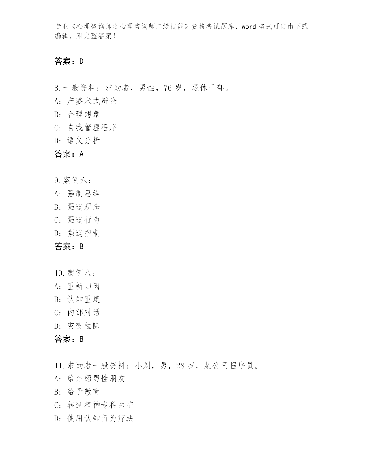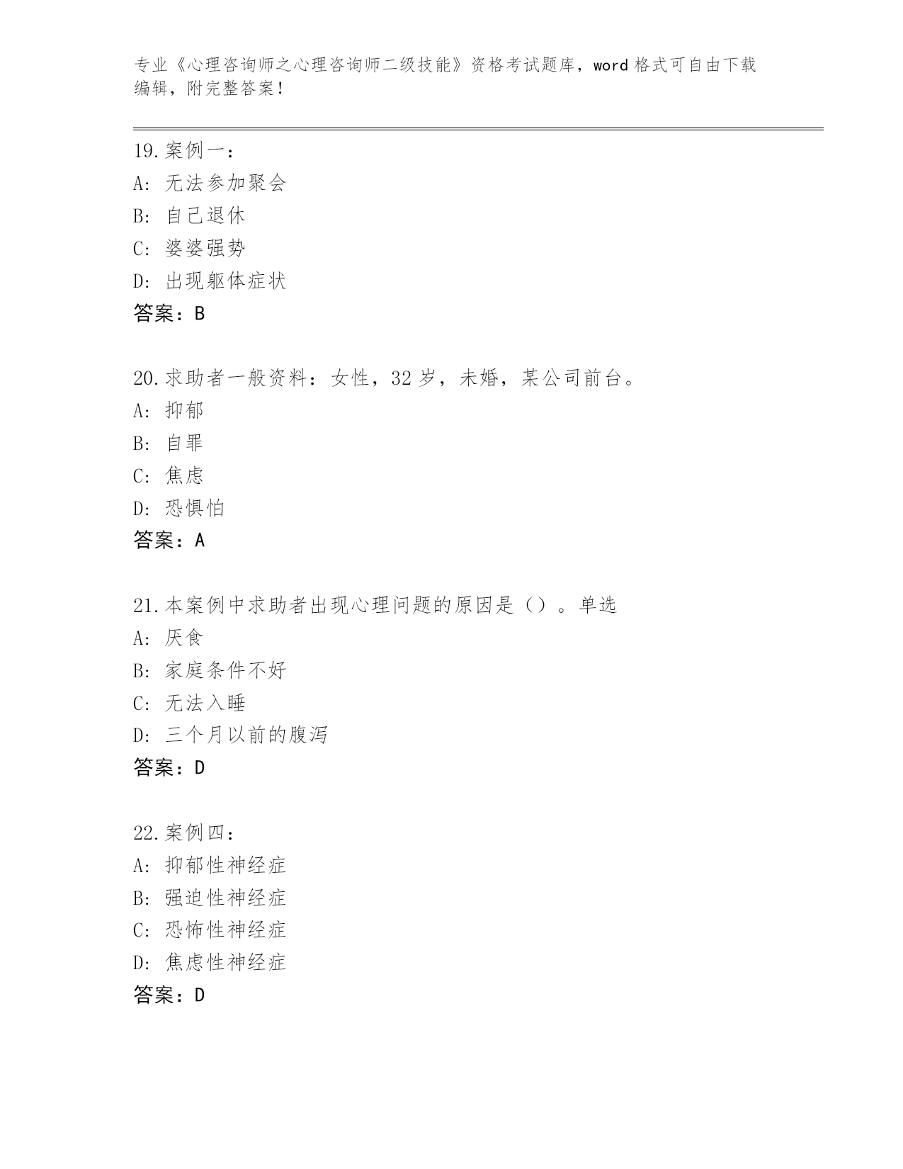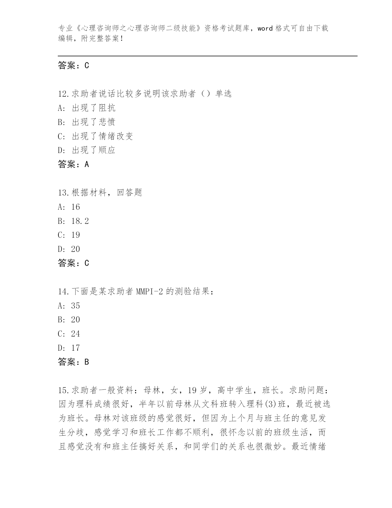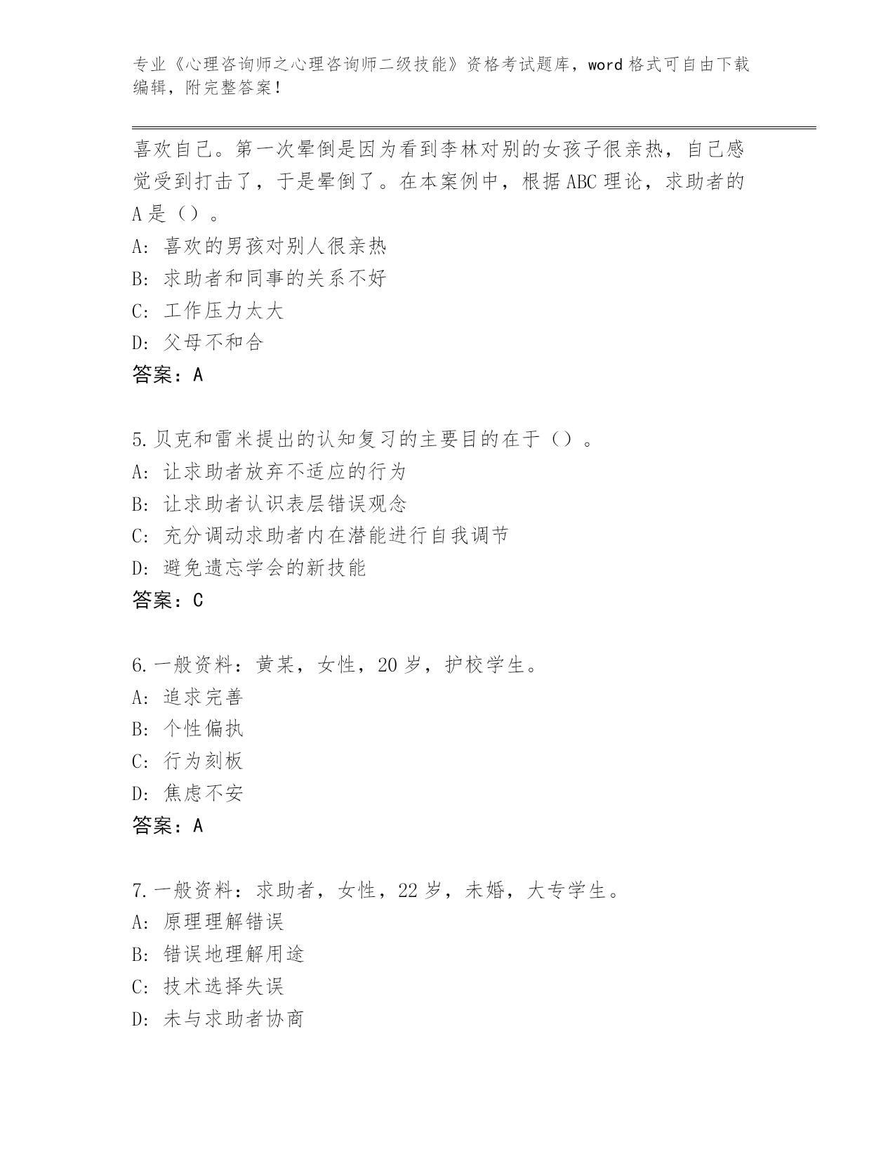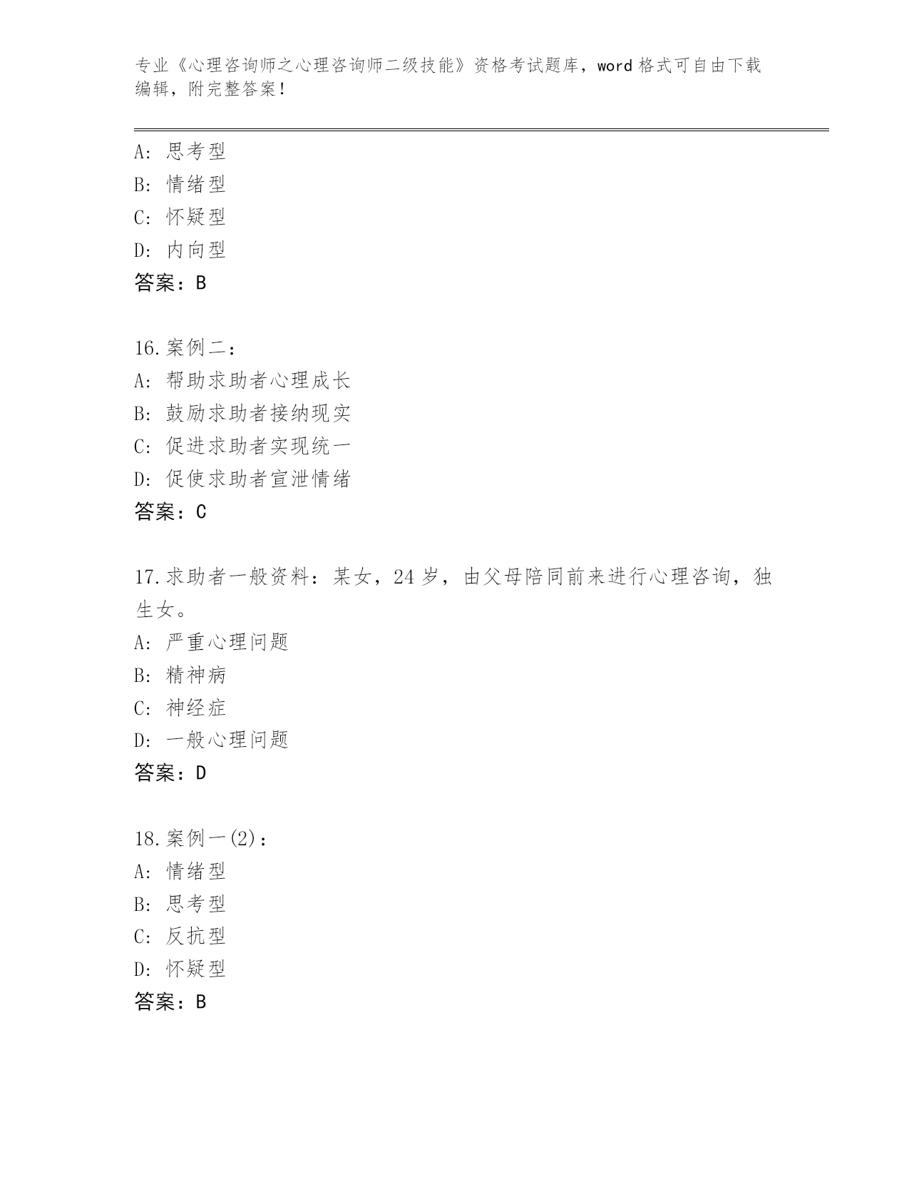 浙江省天台县2024年《心理咨询师之心理咨询师二级技能》资格考试必背200题通关秘籍题库含答案(培优B卷)