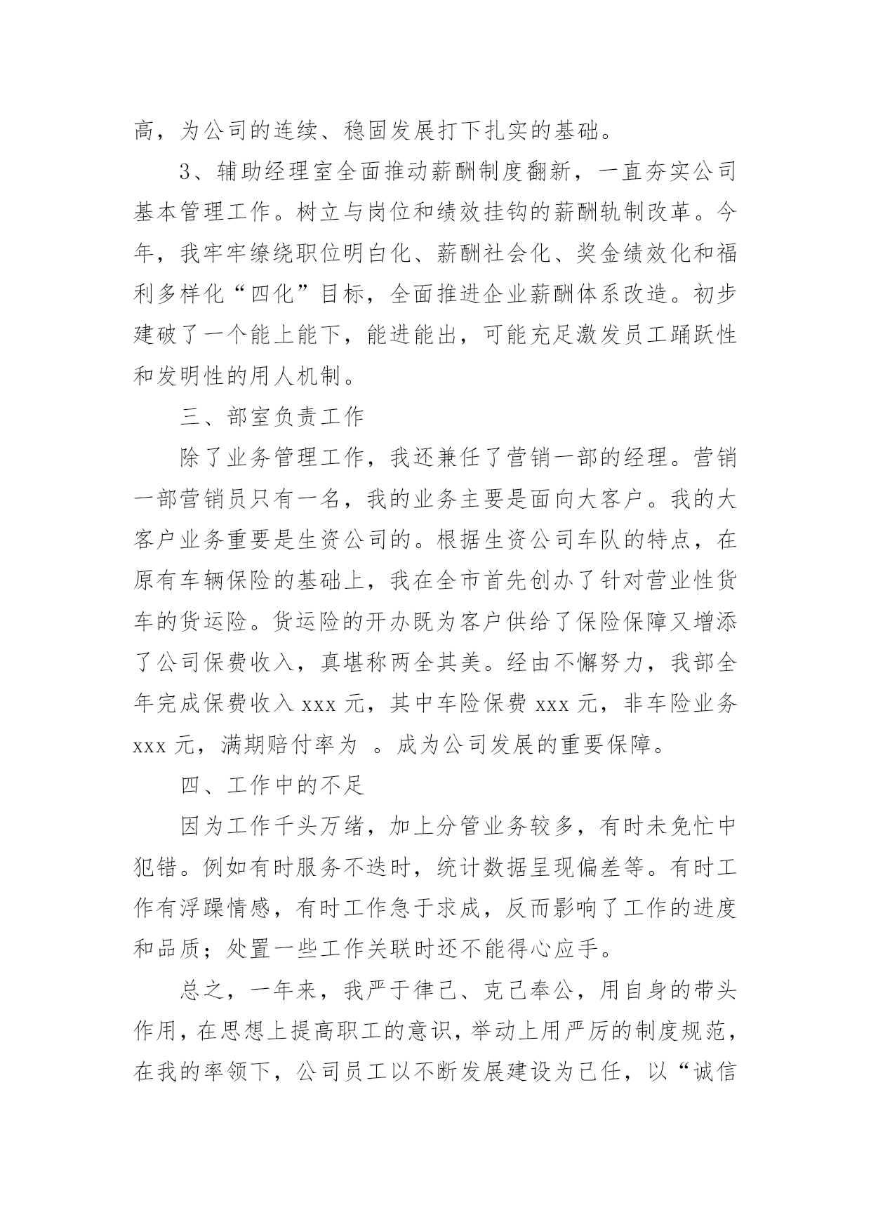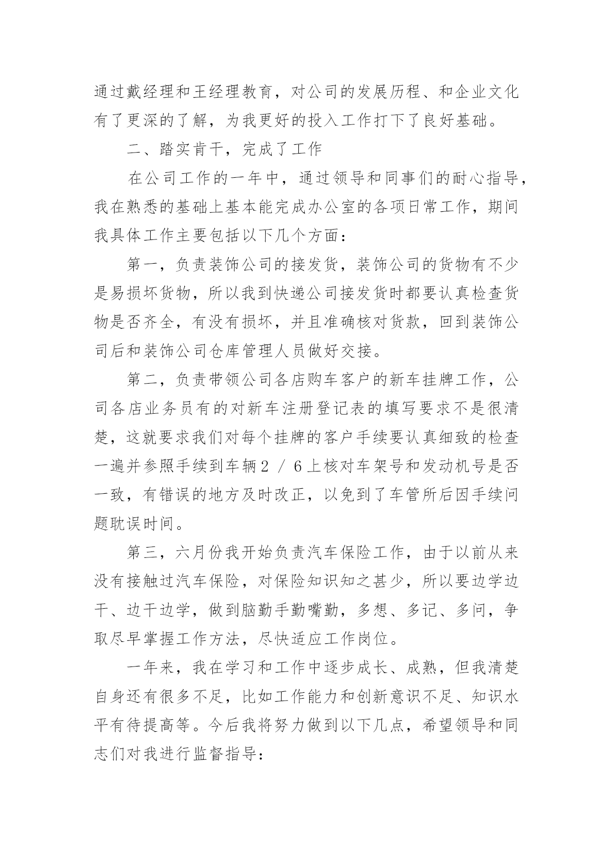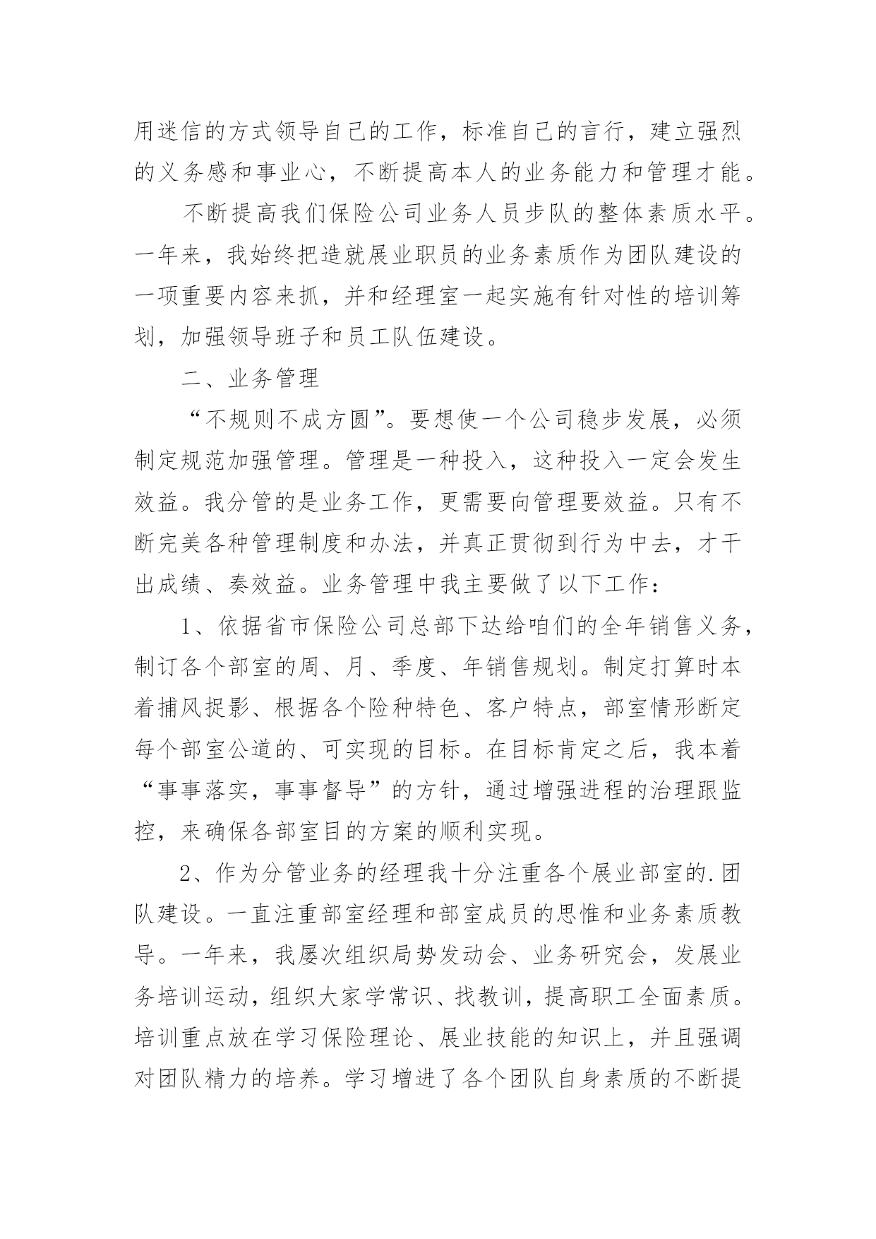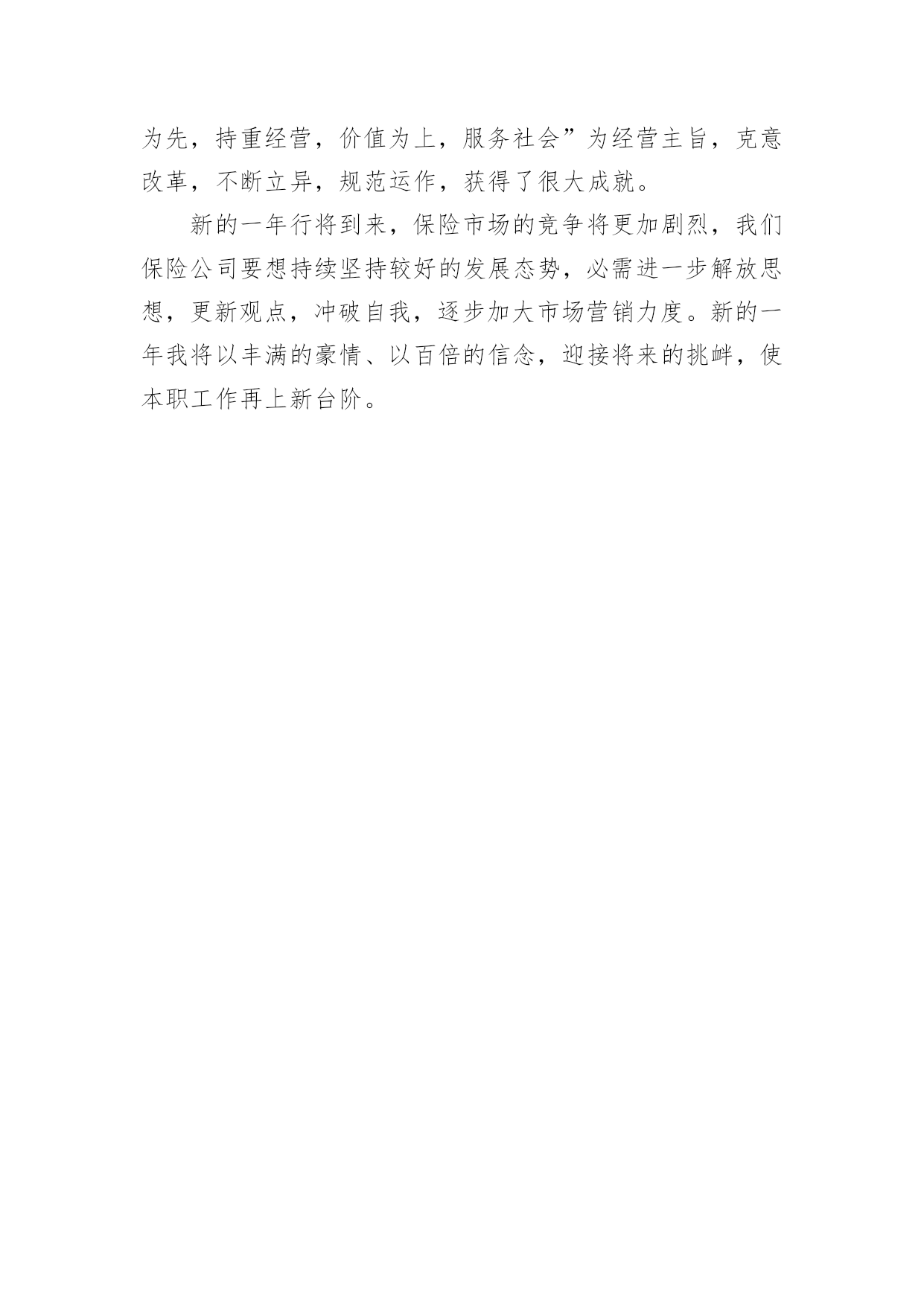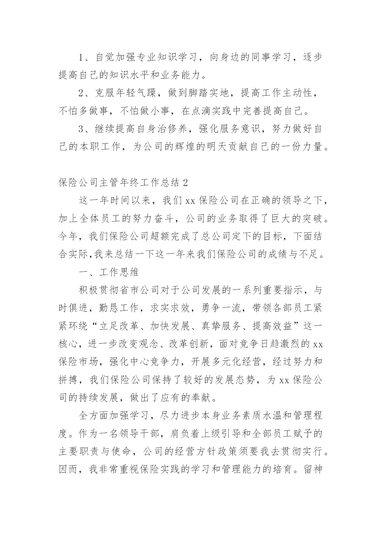 保险公司主管年终工作总结(精选)保险公司主管年终工作总结总结是把一定阶段内的有关情况分析研究,做出有指导性结论的书面材料,它能帮我们理顺知识结构,突出重点,突破难点,不如我们来制定一份总结吧。那么你真的懂得怎么写总结吗?下面是小编帮大家整理的保险公司主管年终工作总结,欢迎阅读,希望大家能够喜欢。保险公司主管年终工作总结1转眼我到公司工作已接近一年了。在这不到一年的时间里是我人生旅途中的重要一程,期间在领导的培养帮助、同志们的关心支持下我逐步适应了工作环境,较为圆满地完成了自己所承担的各项工作,个人素质和业务工作能力都取得了一定的进步,为今后的工作和学习打下了良好的基础,静心回顾这一年的'工作生活,收获颇丰。现将我这一年来的学习工作情况总结如下:一、加强了学习,提高了素质首先,认真学习了企业管理细则,并严格要求自己,自觉遵守,进一步强化自己的责任意识和团体意识,其次,在业务学习方面,我虚心向身边的同事请教,通过多看多听多想多问多做,努力使自己在尽短的时间内熟悉工作环境和内容,积累自己的业务知识。此外,根据公司安排参加了新员工入职培训。在培训中,通过戴经理和王经理教育,对公司的发展历程、和企业文化有了更深的了解,为我更好的投入工作打下了良好基础。二、踏实肯干,完成了工作在公司工作的一年中,通过领导和同事们的耐心指导,我在熟悉的基础上基本能完成办公室的各项日常工作,期间我具体工作主要包括以下几个方面:第一,负责装饰公司的接发货,装饰公司的货物有不少是易损坏货物,所以我到快递公司接发货时都要认真检查货物是否齐全,有没有损坏,并且准确核对货款,回到装饰公司后和装饰公司仓库管理人员做好交接。第二,负责带领公司各店购车客户的新车挂牌工作,公司各店业务员有的对新车注册登记表的填写要求不是很清楚,这就要求我们对每个挂牌的客户手续要认真细致的检查一遍并参照手续到车辆2/6上核对车架号和发动机号是否一致,有错误的地方及时改正,以免到了车管所后因手续问题耽误时间。第三,六月份我开始负责汽车保险工作,由于以前从来没有接触过汽车保险,对保险知识知之甚少,所以要边学边干、边干边学,做到脑勤手勤嘴勤,多想、多记、多问,争取尽早掌握工作方法,尽快适应工作岗位。一年来,我在学习和工作中逐步成长、成熟,但我清楚自身还有很多不足,比如工作能力和创新意识不足、知识水平有待提高等。今后我将努力做到以下几点,希望领导和同志们对我进行监督指导:1、自觉加强专业知识学习,向身边的同事学习,逐步提高自己的知识水平和业务能力。2、克服年轻气躁,做到脚踏实地,提高工作主动性,不怕多做事,不怕做小事,在点滴实践中完善提高自己。3、继续提高自身治修养,强化服务意识,努力做好自己的本职工作,为公司的辉煌的明天贡献自己的一份力量。保险公司主管年终工作总结2这一年时间以来,我们xx保险公司在正确的领导之下,加上全体员工的努力奋斗,公司的业务取得了巨大的突破。今年,我们保险公司超额完成了总公司定下的目标,下面结合实际,我来总结一下这一年来我们保险公司的成绩与不足。一、工作思维积极贯彻省市公司对于公司发展的一系列重要指示,与时俱进,勤恳工作,求实求效,勇争一流,带领各部员工紧紧环绕“立足改革、加快发展、真挚服务、提高效益”这一核心,进一步改变观念、改革创新,面对竞争日趋激烈的xx保险市场,强化中心竞争力,开展多元化经营,经过努力和拼搏,我们保险公司保持了较好的发展态势,为xx保险公司的持续发展,做出了应有的奉献。全方面加强学习,尽力进步本身业务素质水温和管理程度。作为一名领导干部,肩负着上级引导和全部员工赋予的主要职责与使命,公司的经营方针政策须要我去贯彻实行。因而,我非常重视保险实践的学习和管理能力的培育。留神用迷信的方式领导自己的工作,标准自己的言行,建立强烈的义务感和事业心,不断提高本人的业务能力和管理才能。不断提高我们保险公司业务人员步队的整体素质水平。一年来,我始终把造就展业职员的业务素质作为团队建设的一项重要内容来抓,并和经理室一起实施有针对性的培训筹划,加强领导班子和员工队伍建设。二、业务管理“不规则不成方圆”。要想使一个公司稳步发展,必须制定规范加强管理。管理是一种投入,这种投入一定会发生效益。我分管的是业务工作,更需要向管理要效益。只有不断完美各种管理制度和办法,并真正贯彻到行为中去,才干出成绩、奏效益。业务管理中我主要做了以下工作:1、依据省市保险公司总部下达给咱们的全年销售义务,制订各个部室的周、月、季度、年销售规划。制定打算时本着捕风捉影、根据各个险种特色、客户特点,部室情形断定每个部室公道的、可实现的目标。在目标肯定之后,我本着“事事落实,事事督导”的方针,通过增强进程的治理跟监控,来确保各部室目的方案的顺利实现。2、作为分管业务的经理我十分注重各个展业部室的.团队