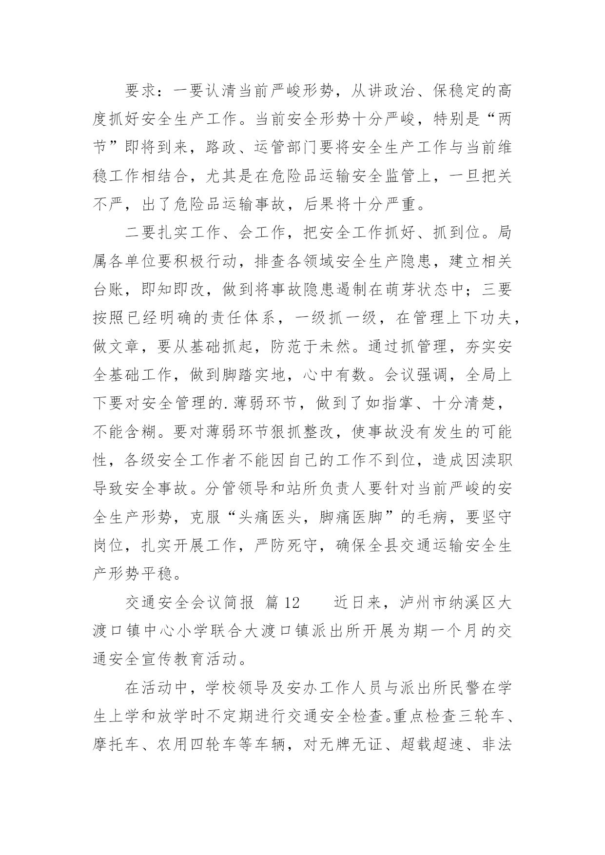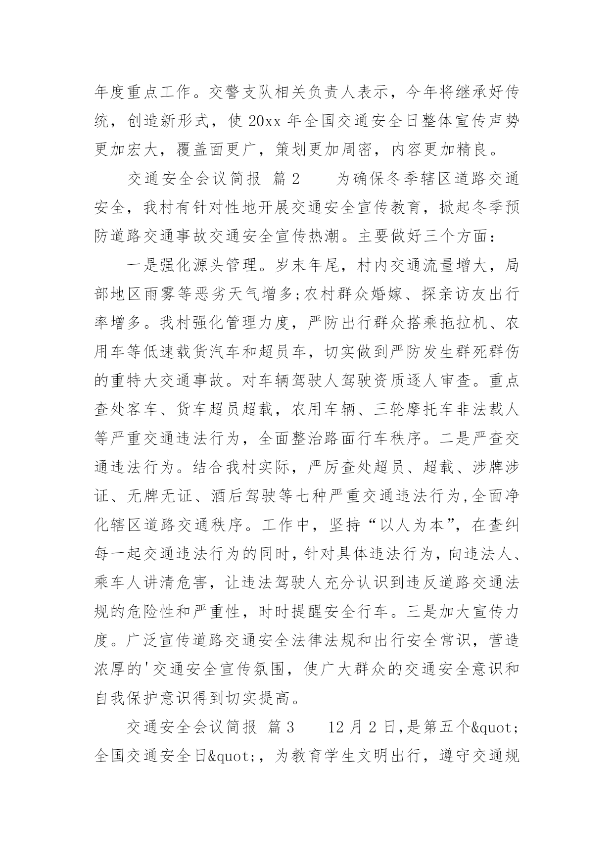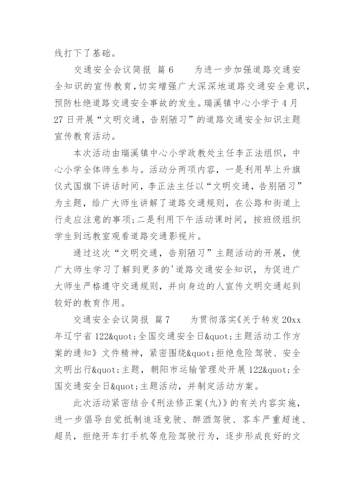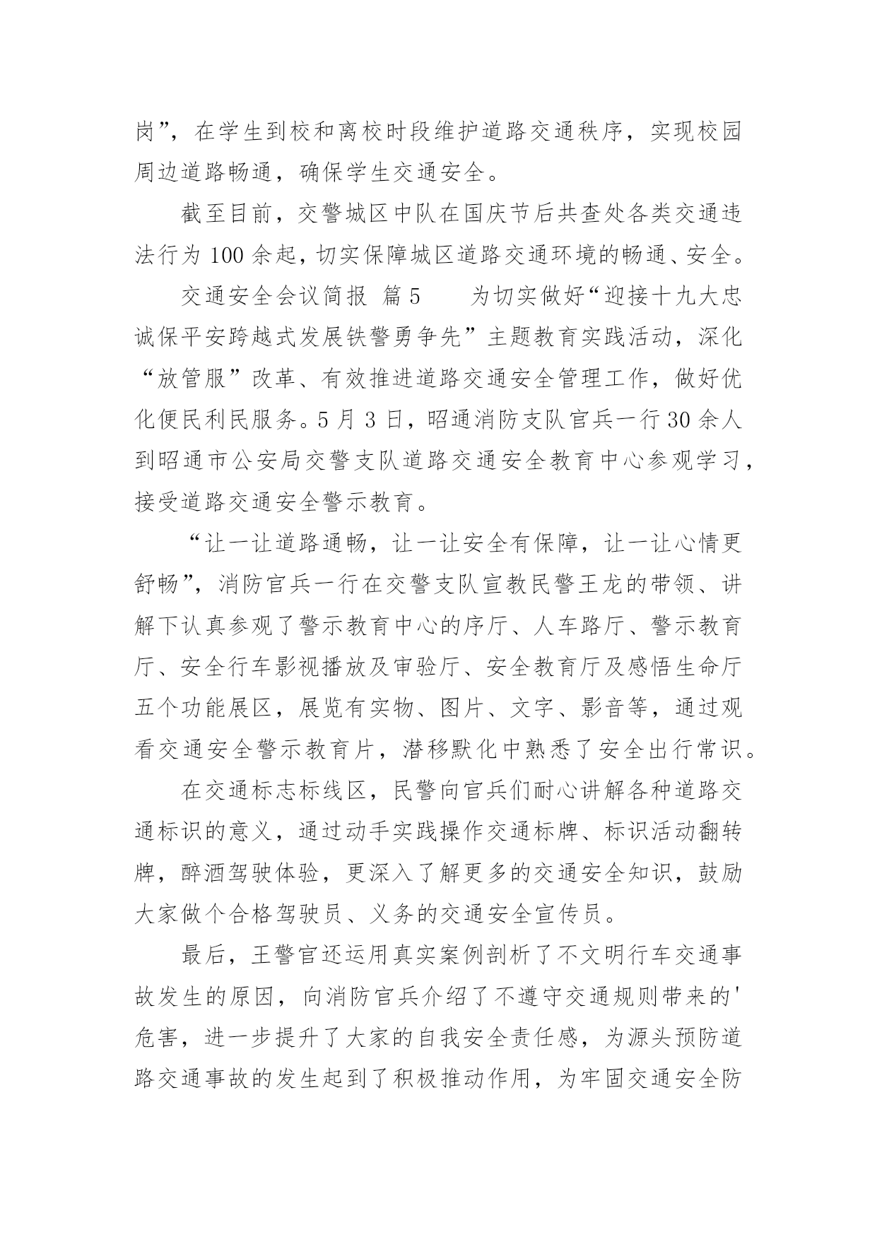 交通安全会议简报交通安全会议简报(精选25篇)在生活、工作和学习中,接触到简报的地方越来越多,简报又称“动态”“简讯”“要情”“摘报”“工作通讯”“情况反映”“情况交流”“内部参考”等。你所接触过的简报都是什么样子的呢?下面是小编为大家整理的交通安全会议简报,希望能够帮助到大家。交通安全会议简报篇1为组织开展第xx个"全国交通安全日"主题活动,在全社会营造共同关注交通安全,携手创建文明交通的良好氛围,11月14日下午,萍乡市公安局交警支队召开"全国交通安全日"主题宣传活动媒体联席会。萍乡市交警支队法宣科科长余汉章介绍了萍乡市20xx年全国交通安全日活动。各交警大队负责人汇报辖区"全国交通安全日"工作重点安排。新闻媒体代表对"全国交通安全日"活动策划提出建议,并结合自身特点和优势提出宣传报道方案。参会的新闻媒体相关负责人表示,将在传统媒体和新媒体中大力弘扬交通法治精神,通过丰富多彩的宣传活动为"全国交通安全日"造势,以"接地气"的`报道方式将文明交通理念根植于社会公众的内心,达到良好地传播效果。每年的"12.2"宣传都是公安交警部门的一项年度重点工作。交警支队相关负责人表示,今年将继承好传统,创造新形式,使20xx年全国交通安全日整体宣传声势更加宏大,覆盖面更广,策划更加周密,内容更加精良。交通安全会议简报篇2为确保冬季辖区道路交通安全,我村有针对性地开展交通安全宣传教育,掀起冬季预防道路交通事故交通安全宣传热潮。主要做好三个方面:一是强化源头管理。岁末年尾,村内交通流量增大,局部地区雨雾等恶劣天气增多;农村群众婚嫁、探亲访友出行率增多。我村强化管理力度,严防出行群众搭乘拖拉机、农用车等低速载货汽车和超员车,切实做到严防发生群死群伤的重特大交通事故。对车辆驾驶人驾驶资质逐人审查。重点查处客车、货车超员超载,农用车辆、三轮摩托车非法载人等严重交通违法行为,全面整治路面行车秩序。二是严查交通违法行为。结合我村实际,严厉查处超员、超载、涉牌涉证、无牌无证、酒后驾驶等七种严重交通违法行为,全面净化辖区道路交通秩序。工作中,坚持“以人为本”,在查纠每一起交通违法行为的同时,针对具体违法行为,向违法人、乘车人讲清危害,让违法驾驶人充分认识到违反道路交通法规的危险性和严重性,时时提醒安全行车。三是加大宣传力度。广泛宣传道路交通安全法律法规和出行安全常识,营造浓厚的'交通安全宣传氛围,使广大群众的交通安全意识和自我保护意识得到切实提高。交通安全会议简报篇312月2日,是第五个"全国交通安全日",为教育学生文明出行,遵守交通规则,预防交通事故的发生,武陵源区索溪中心学校联合区交警大队利用升旗仪式对学生开展交通安全主题教育活动。在升旗仪式上,学校少先大队首先作了"增强交通安全意识,提高自我保护能力"的演讲,倡导同学们摒弃"交通陋习",增强交通安全意识和自我保护能力。随后,区交警大队的干警们向全体师生发放了文明交通的宣传单,并开展了"大小交警的对话"和"爸爸听我讲",强化"小手拉大手"的带动方式,使学生不仅自己能够遵守交通法规,而且积极向家人宣传交通安全知识,进一步深化"平安校园"建设,倡导六大文明行为。据悉,在本周内,该校各班级将围绕这一主题举行交通安全教育主题班会,进一步加强对交通安全法规及常识的'宣传教育,倡导全体师生能从自己做起,从现在做起,自觉遵守交通规则,做文明人走文明路,共同维护和谐景区的交通环境。交通安全会议简报篇4国庆节后,泸县公安局交警城区中队紧抓道路交通管理工作不放松,严查城区各类交通违法行为,确保城区交通秩序持续平稳。交警城区中队实行定点执勤与流动巡查相结合,落实多种查控措施:一是在彩虹桥、国道321线城北分校、二级路(针织厂)等重点路口对重点车辆严重交通违法行为查处;二是加强城区花园干道、县政府等交通违法、交通事故多发路段的违法查纠力度;三是结合辖区学校分布情况设置“护学岗”,在学生到校和离校时段维护道路交通秩序,实现校园周边道路畅通,确保学生交通安全。截至目前,交警城区中队在国庆节后共查处各类交通违法行为100余起,切实保障城区道路交通环境的畅通、安全。交通安全会议简报篇5为切实做好“迎接十九大忠诚保平安跨越式发展铁警勇争先”主题教育实践活动,深化“放管服”改革、有效推进道路交通安全管理工作,做好优化便民利民服务。5月3日,昭通消防支队官兵一行30余人到昭通市公安局交警支队道路交通安全教育中心参观学习,接受道路交通安全警示教育。“让一让道路通畅