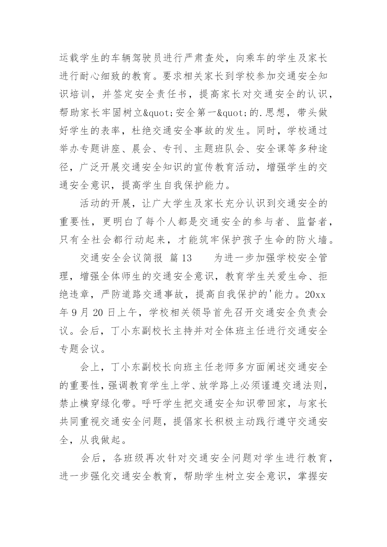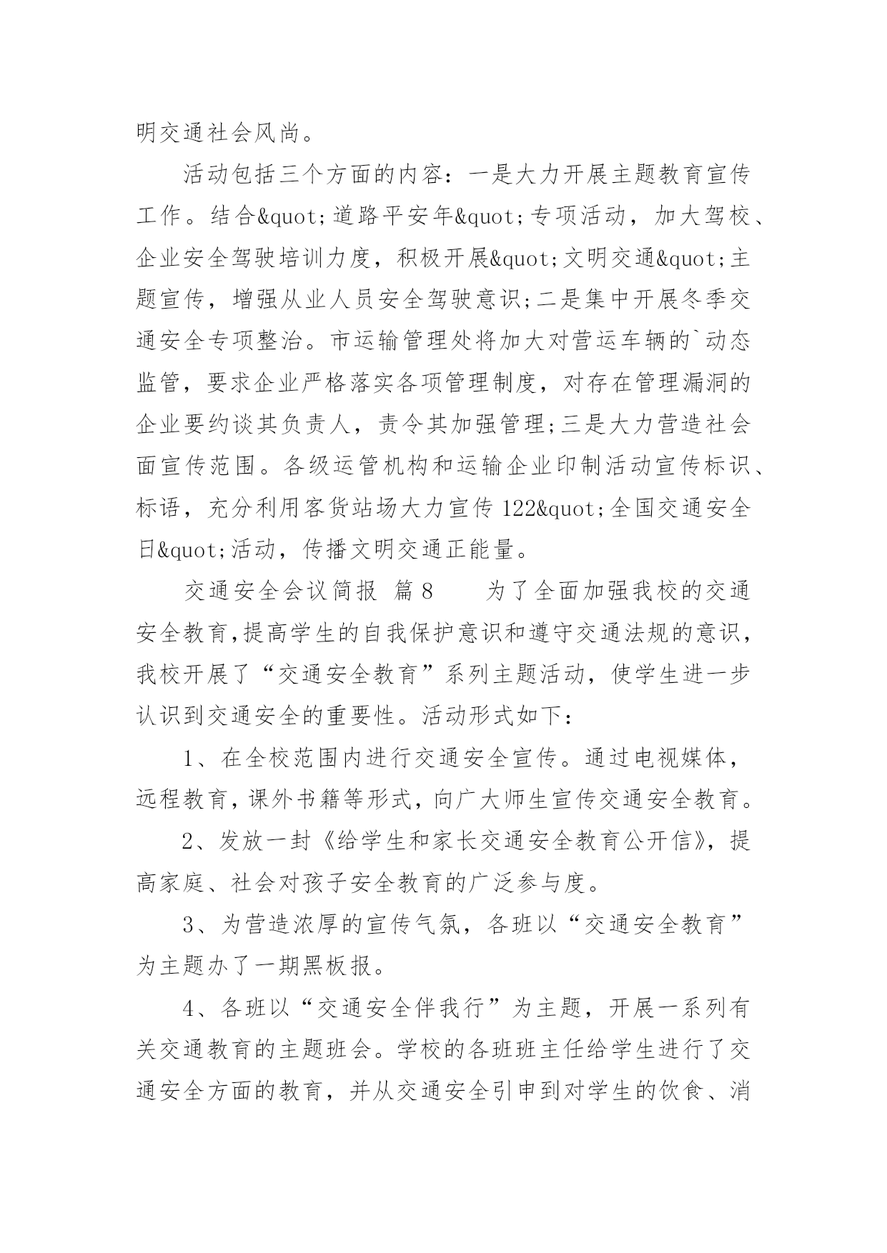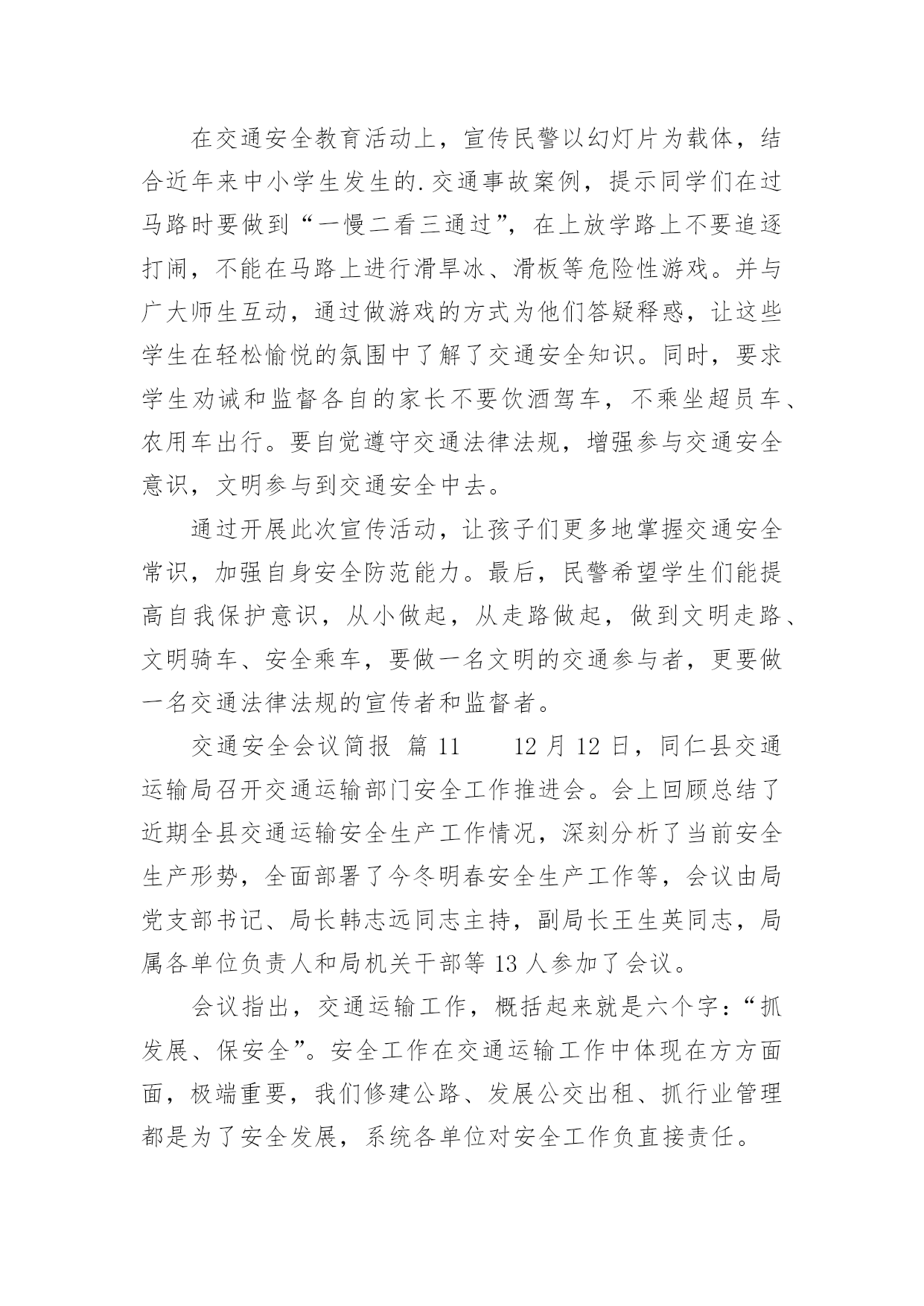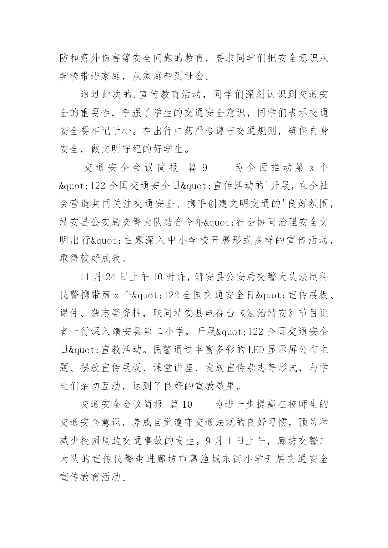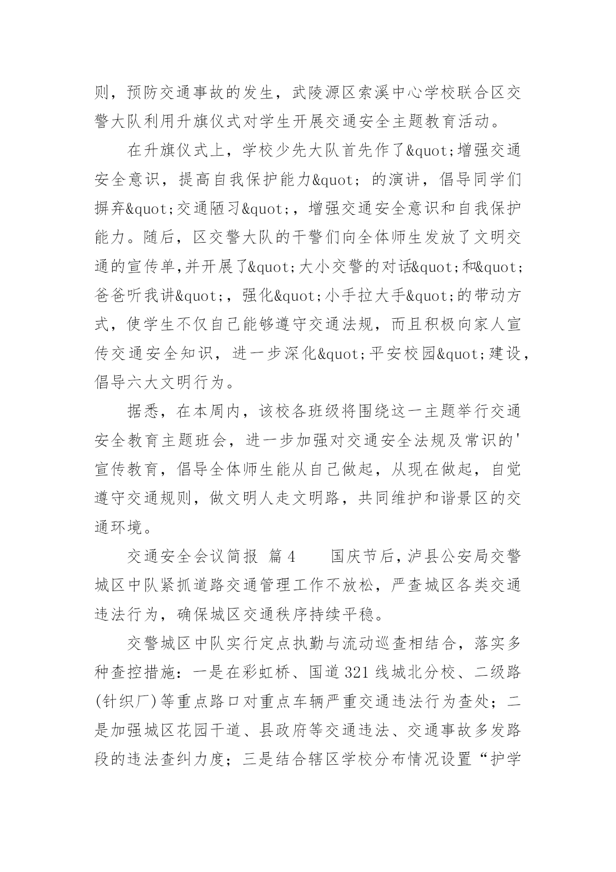 交通安全会议简报交通安全会议简报(精选25篇)在生活、工作和学习中,接触到简报的地方越来越多,简报又称“动态”“简讯”“要情”“摘报”“工作通讯”“情况反映”“情况交流”“内部参考”等。你所接触过的简报都是什么样子的呢?下面是小编为大家整理的交通安全会议简报,希望能够帮助到大家。交通安全会议简报篇1为组织开展第xx个"全国交通安全日"主题活动,在全社会营造共同关注交通安全,携手创建文明交通的良好氛围,11月14日下午,萍乡市公安局交警支队召开"全国交通安全日"主题宣传活动媒体联席会。萍乡市交警支队法宣科科长余汉章介绍了萍乡市20xx年全国交通安全日活动。各交警大队负责人汇报辖区"全国交通安全日"工作重点安排。新闻媒体代表对"全国交通安全日"活动策划提出建议,并结合自身特点和优势提出宣传报道方案。参会的新闻媒体相关负责人表示,将在传统媒体和新媒体中大力弘扬交通法治精神,通过丰富多彩的宣传活动为"全国交通安全日"造势,以"接地气"的`报道方式将文明交通理念根植于社会公众的内心,达到良好地传播效果。每年的"12.2"宣传都是公安交警部门的一项年度重点工作。交警支队相关负责人表示,今年将继承好传统,创造新形式,使20xx年全国交通安全日整体宣传声势更加宏大,覆盖面更广,策划更加周密,内容更加精良。交通安全会议简报篇2为确保冬季辖区道路交通安全,我村有针对性地开展交通安全宣传教育,掀起冬季预防道路交通事故交通安全宣传热潮。主要做好三个方面:一是强化源头管理。岁末年尾,村内交通流量增大,局部地区雨雾等恶劣天气增多;农村群众婚嫁、探亲访友出行率增多。我村强化管理力度,严防出行群众搭乘拖拉机、农用车等低速载货汽车和超员车,切实做到严防发生群死群伤的重特大交通事故。对车辆驾驶人驾驶资质逐人审查。重点查处客车、货车超员超载,农用车辆、三轮摩托车非法载人等严重交通违法行为,全面整治路面行车秩序。二是严查交通违法行为。结合我村实际,严厉查处超员、超载、涉牌涉证、无牌无证、酒后驾驶等七种严重交通违法行为,全面净化辖区道路交通秩序。工作中,坚持“以人为本”,在查纠每一起交通违法行为的同时,针对具体违法行为,向违法人、乘车人讲清危害,让违法驾驶人充分认识到违反道路交通法规的危险性和严重性,时时提醒安全行车。三是加大宣传力度。广泛宣传道路交通安全法律法规和出行安全常识,营造浓厚的'交通安全宣传氛围,使广大群众的交通安全意识和自我保护意识得到切实提高。交通安全会议简报篇312月2日,是第五个"全国交通安全日",为教育学生文明出行,遵守交通规则,预防交通事故的发生,武陵源区索溪中心学校联合区交警大队利用升旗仪式对学生开展交通安全主题教育活动。在升旗仪式上,学校少先大队首先作了"增强交通安全意识,提高自我保护能力"的演讲,倡导同学们摒弃"交通陋习",增强交通安全意识和自我保护能力。随后,区交警大队的干警们向全体师生发放了文明交通的宣传单,并开展了"大小交警的对话"和"爸爸听我讲",强化"小手拉大手"的带动方式,使学生不仅自己能够遵守交通法规,而且积极向家人宣传交通安全知识,进一步深化"平安校园"建设,倡导六大文明行为。据悉,在本周内,该校各班级将围绕这一主题举行交通安全教育主题班会,进一步加强对交通安全法规及常识的'宣传教育,倡导全体师生能从自己做起,从现在做起,自觉遵守交通规则,做文明人走文明路,共同维护和谐景区的交通环境。交通安全会议简报篇4国庆节后,泸县公安局交警城区中队紧抓道路交通管理工作不放松,严查城区各类交通违法行为,确保城区交通秩序持续平稳。交警城区中队实行定点执勤与流动巡查相结合,落实多种查控措施:一是在彩虹桥、国道321线城北分校、二级路(针织厂)等重点路口对重点车辆严重交通违法行为查处;二是加强城区花园干道、县政府等交通违法、交通事故多发路段的违法查纠力度;三是结合辖区学校分布情况设置“护学岗”,在学生到校和离校时段维护道路交通秩序,实现校园周边道路畅通,确保学生交通安全。截至目前,交警城区中队在国庆节后共查处各类交通违法行为100余起,切实保障城区道路交通环境的畅通、安全。交通安全会议简报篇5为切实做好“迎接十九大忠诚保平安跨越式发展铁警勇争先”主题教育实践活动,深化“放管服”改革、有效推进道路交通安全管理工作,做好优化便民利民服务。5月3日,昭通消防支队官兵一行30余人到昭通市公安局交警支队道路交通安全教育中心参观学习,接受道路交通安全警示教育。“让一让道路通畅