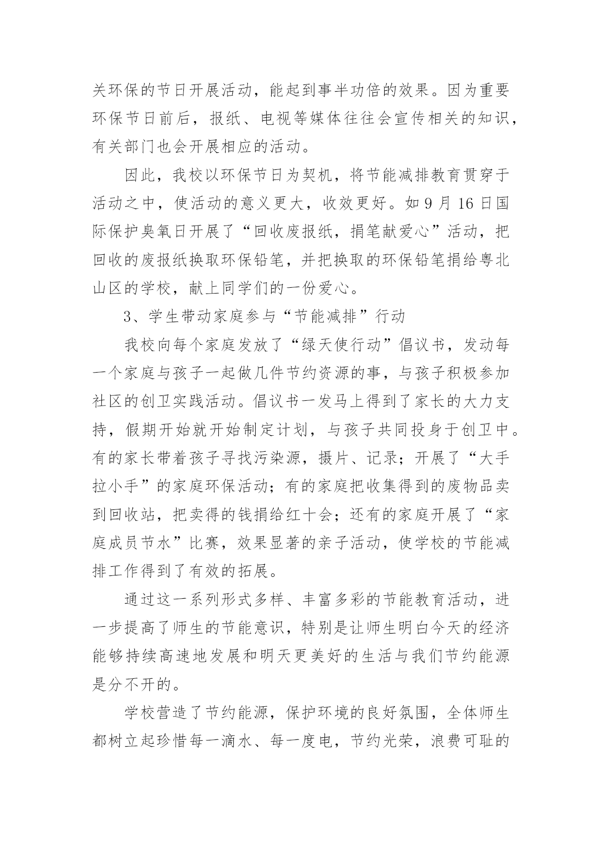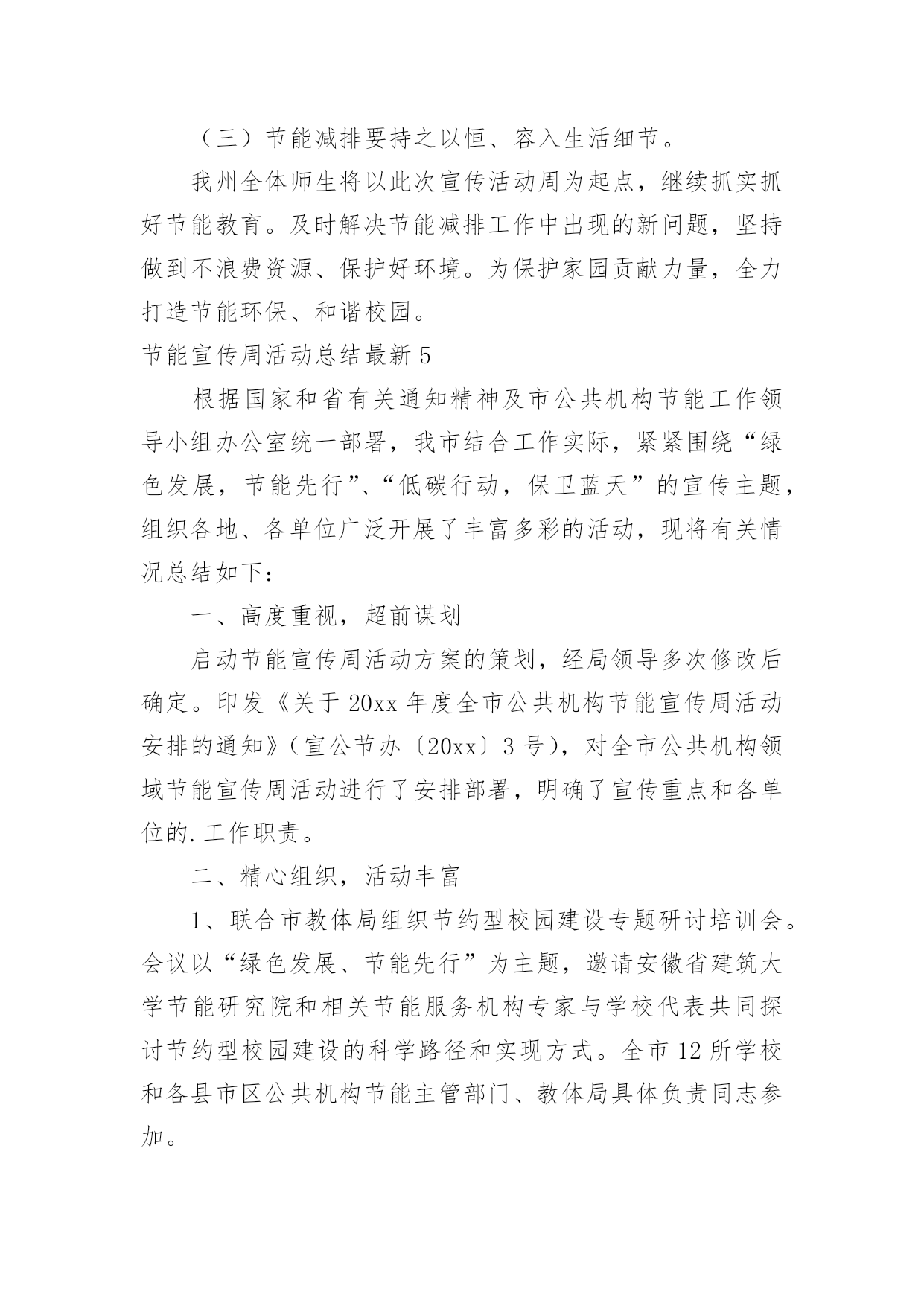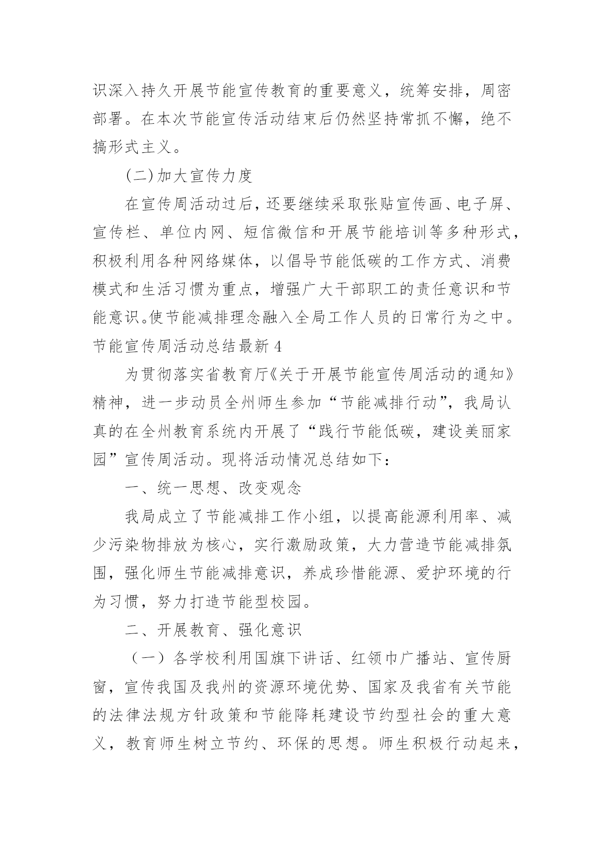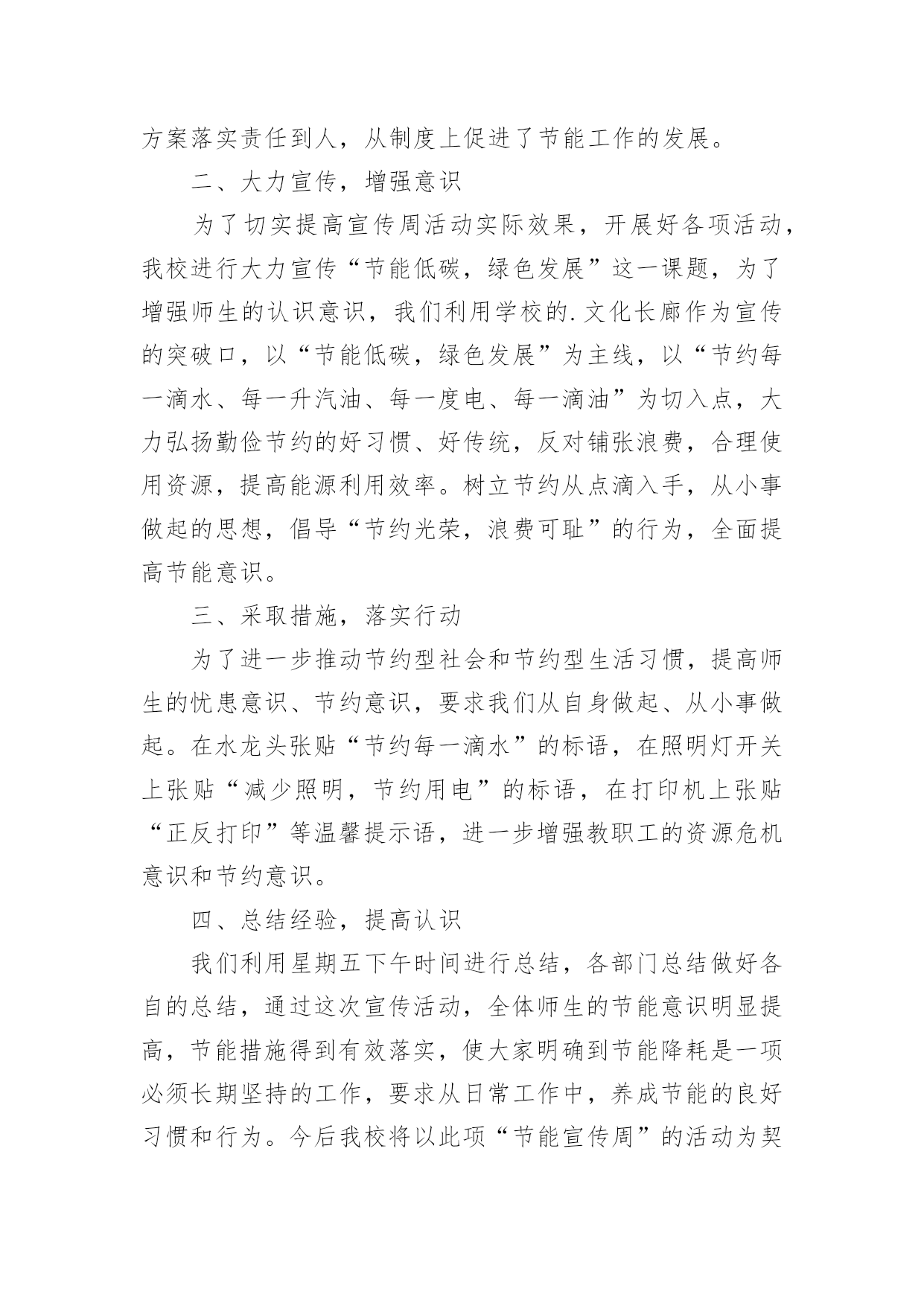 节能宣传周活动总结最新节能宣传周活动总结最新总结是指对某一阶段的工作、学习或思想中的经验或情况进行分析研究,做出带有规律性结论的书面材料,它可以促使我们思考,让我们好好写一份总结吧。总结怎么写才不会千篇一律呢?下面是小编整理的节能宣传周活动总结最新,欢迎大家分享。节能宣传周活动总结最新1XX年6月11—16日,是全国“节能宣传”的活动周,按照国务院的《“十二五”节能减排综合性工作方案》的有关要求,充分调动各方面力量参与节能减排,确定完成全年节能目标。我校结合实际情况,围绕“节能低碳,绿色发展”的宣传主题,广泛开展节能宣传活动,现将有关的情况总结如下:一、高度重视,统筹安排节能宣传周的活动一开始,我校领导就高度重视,围绕“节能低碳,绿色发展”这一主题,做好宣传工作,制订周密的活动方案。首先,学校领导召开的《“十二五”节能减排综合性工作方案》的文件精神,对日常生活、工作要节约用水、用电、用纸等,以节约为规范的活动。其次,召开全体教职工会议,布置“节约宣传周”的工作要求。制定完善方案落实责任到人,从制度上促进了节能工作的发展。二、大力宣传,增强意识为了切实提高宣传周活动实际效果,开展好各项活动,我校进行大力宣传“节能低碳,绿色发展”这一课题,为了增强师生的认识意识,我们利用学校的.文化长廊作为宣传的突破口,以“节能低碳,绿色发展”为主线,以“节约每一滴水、每一升汽油、每一度电、每一滴油”为切入点,大力弘扬勤俭节约的好习惯、好传统,反对铺张浪费,合理使用资源,提高能源利用效率。树立节约从点滴入手,从小事做起的思想,倡导“节约光荣,浪费可耻”的行为,全面提高节能意识。三、采取措施,落实行动为了进一步推动节约型社会和节约型生活习惯,提高师生的忧患意识、节约意识,要求我们从自身做起、从小事做起。在水龙头张贴“节约每一滴水”的标语,在照明灯开关上张贴“减少照明,节约用电”的标语,在打印机上张贴“正反打印”等温馨提示语,进一步增强教职工的资源危机意识和节约意识。四、总结经验,提高认识我们利用星期五下午时间进行总结,各部门总结做好各自的总结,通过这次宣传活动,全体师生的节能意识明显提高,节能措施得到有效落实,使大家明确到节能降耗是一项必须长期坚持的工作,要求从日常工作中,养成节能的良好习惯和行为。今后我校将以此项“节能宣传周”的活动为契机,进一步加强节能工作,切实抓好节水、节油、节能源工作,形成全民节能的良好风气。节能宣传周活动总结最新2我校充分利用学校现有资源的优势,以校园网、广播站、宣传栏、宣传画、标语、黑板报等渠道,以国旗下讲话、班队会、级会、晨会、家长会等形式开展各种宣传活动,营造了浓厚的宣传氛围。1、以节约为主题的教育周活动为使学生树立“节约高尚、浪费可耻”的意识,增强资源忧患意识,注意日常节约每一滴水,每一度电、每一张纸和每一粒粮食,我校开展了以节约为主题的教育周活动:第九周“节约用水”教育周,第十周“节约用电”教育周,第十一周“节约纸笔”教育周,第十二周“节约粮食”教育周。一周一个教育主题,大队部和各班级根据主题有针对性地进行了一系列的活动,如知识竞赛、绘画征文、读环保新闻、讲环保故事等。同时,各中队开展了“节能减排,从我做起”主题队会,以小品、游戏、讨论、采访等形式,让学生了解浪费资源带来的危害,倡导有利于保护环境的生产、生活方式,进一步增强学生的能源忧患意识、节约意识和环境保护意识,动员他们踊跃参与节能减排工作,使减少污染物排放、与环境友好相处成为全社会的自觉行动。2、结合节日开展“节能减排”活动在做好一系列常规工作的'同时我们也注意到,结合有关环保的节日开展活动,能起到事半功倍的效果。因为重要环保节日前后,报纸、电视等媒体往往会宣传相关的知识,有关部门也会开展相应的活动。因此,我校以环保节日为契机,将节能减排教育贯穿于活动之中,使活动的意义更大,收效更好。如9月16日国际保护臭氧日开展了“回收废报纸,捐笔献爱心”活动,把回收的废报纸换取环保铅笔,并把换取的环保铅笔捐给粤北山区的学校,献上同学们的一份爱心。3、学生带动家庭参与“节能减排”行动我校向每个家庭发放了“绿天使行动”倡议书,发动每一个家庭与孩子一起做几件节约资源的事,与孩子积极参加社区的创卫实践活动。倡议书一发马上得到了家长的大力支持,假期开始就开始制定计划,与孩子共同投身于创卫中。有的家长带着孩子寻找污染源,摄片、记录;开展了“大手拉小手”的家庭环保活动;有的家庭把收集得到的废物品卖到回收站,把卖得的钱捐给红十会;还有的家庭开展了“家庭成员节水”比赛,效果显著的亲子活动,使学校的节能减排工作得到了有效的拓展。通过这一系列形式多样、丰富多彩的节能教育活动,进一步提高了师生的节能意识,特别是让师生明白今天的经济能够持续高速地发展和明天更美好的生活与我们节约能源是分不开