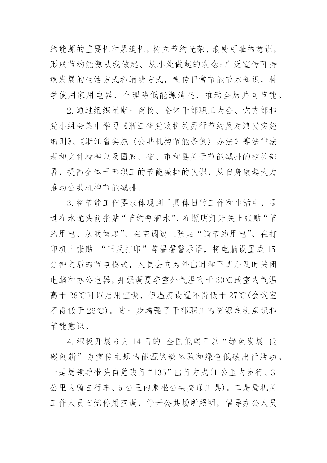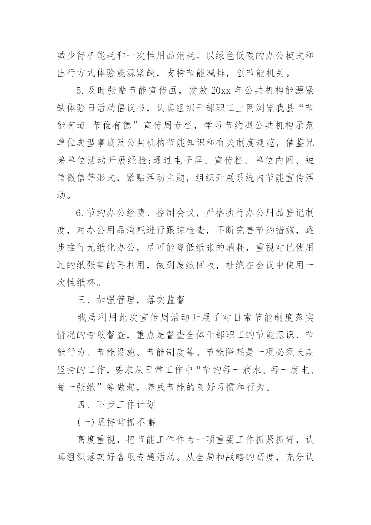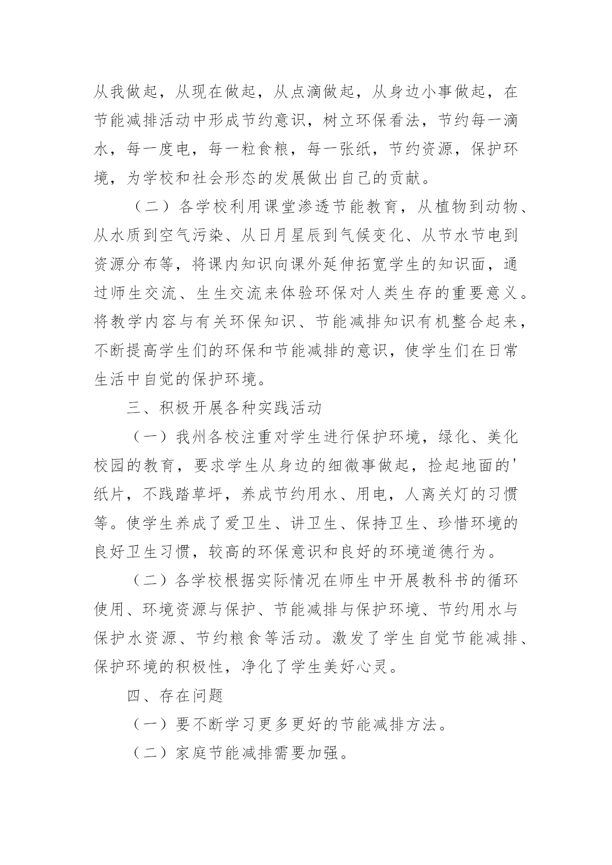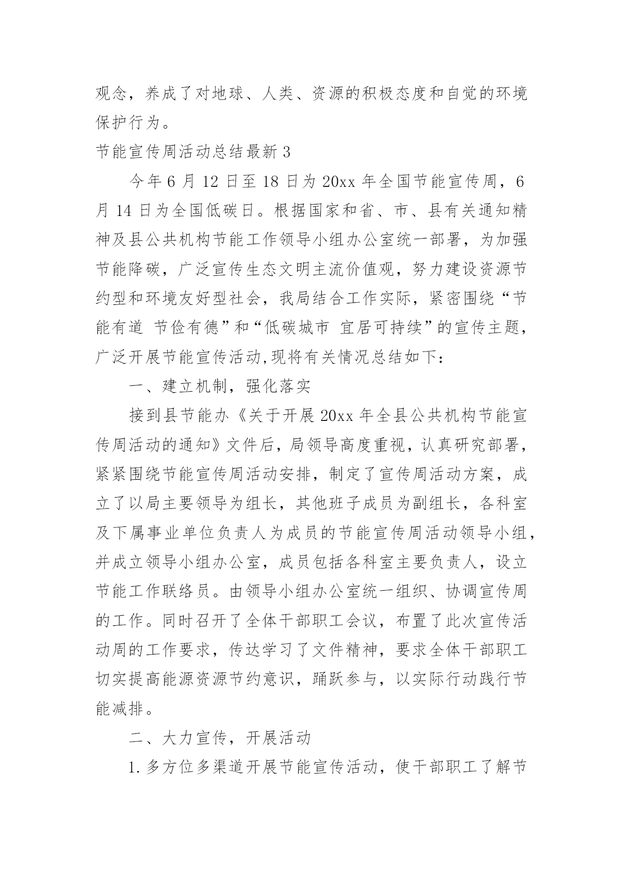 节能宣传周活动总结最新节能宣传周活动总结最新总结是指对某一阶段的工作、学习或思想中的经验或情况进行分析研究,做出带有规律性结论的书面材料,它可以促使我们思考,让我们好好写一份总结吧。总结怎么写才不会千篇一律呢?下面是小编整理的节能宣传周活动总结最新,欢迎大家分享。节能宣传周活动总结最新1XX年6月11—16日,是全国“节能宣传”的活动周,按照国务院的《“十二五”节能减排综合性工作方案》的有关要求,充分调动各方面力量参与节能减排,确定完成全年节能目标。我校结合实际情况,围绕“节能低碳,绿色发展”的宣传主题,广泛开展节能宣传活动,现将有关的情况总结如下:一、高度重视,统筹安排节能宣传周的活动一开始,我校领导就高度重视,围绕“节能低碳,绿色发展”这一主题,做好宣传工作,制订周密的活动方案。首先,学校领导召开的《“十二五”节能减排综合性工作方案》的文件精神,对日常生活、工作要节约用水、用电、用纸等,以节约为规范的活动。其次,召开全体教职工会议,布置“节约宣传周”的工作要求。制定完善方案落实责任到人,从制度上促进了节能工作的发展。二、大力宣传,增强意识为了切实提高宣传周活动实际效果,开展好各项活动,我校进行大力宣传“节能低碳,绿色发展”这一课题,为了增强师生的认识意识,我们利用学校的.文化长廊作为宣传的突破口,以“节能低碳,绿色发展”为主线,以“节约每一滴水、每一升汽油、每一度电、每一滴油”为切入点,大力弘扬勤俭节约的好习惯、好传统,反对铺张浪费,合理使用资源,提高能源利用效率。树立节约从点滴入手,从小事做起的思想,倡导“节约光荣,浪费可耻”的行为,全面提高节能意识。三、采取措施,落实行动为了进一步推动节约型社会和节约型生活习惯,提高师生的忧患意识、节约意识,要求我们从自身做起、从小事做起。在水龙头张贴“节约每一滴水”的标语,在照明灯开关上张贴“减少照明,节约用电”的标语,在打印机上张贴“正反打印”等温馨提示语,进一步增强教职工的资源危机意识和节约意识。四、总结经验,提高认识我们利用星期五下午时间进行总结,各部门总结做好各自的总结,通过这次宣传活动,全体师生的节能意识明显提高,节能措施得到有效落实,使大家明确到节能降耗是一项必须长期坚持的工作,要求从日常工作中,养成节能的良好习惯和行为。今后我校将以此项“节能宣传周”的活动为契机,进一步加强节能工作,切实抓好节水、节油、节能源工作,形成全民节能的良好风气。节能宣传周活动总结最新2我校充分利用学校现有资源的优势,以校园网、广播站、宣传栏、宣传画、标语、黑板报等渠道,以国旗下讲话、班队会、级会、晨会、家长会等形式开展各种宣传活动,营造了浓厚的宣传氛围。1、以节约为主题的教育周活动为使学生树立“节约高尚、浪费可耻”的意识,增强资源忧患意识,注意日常节约每一滴水,每一度电、每一张纸和每一粒粮食,我校开展了以节约为主题的教育周活动:第九周“节约用水”教育周,第十周“节约用电”教育周,第十一周“节约纸笔”教育周,第十二周“节约粮食”教育周。一周一个教育主题,大队部和各班级根据主题有针对性地进行了一系列的活动,如知识竞赛、绘画征文、读环保新闻、讲环保故事等。同时,各中队开展了“节能减排,从我做起”主题队会,以小品、游戏、讨论、采访等形式,让学生了解浪费资源带来的危害,倡导有利于保护环境的生产、生活方式,进一步增强学生的能源忧患意识、节约意识和环境保护意识,动员他们踊跃参与节能减排工作,使减少污染物排放、与环境友好相处成为全社会的自觉行动。2、结合节日开展“节能减排”活动在做好一系列常规工作的'同时我们也注意到,结合有关环保的节日开展活动,能起到事半功倍的效果。因为重要环保节日前后,报纸、电视等媒体往往会宣传相关的知识,有关部门也会开展相应的活动。因此,我校以环保节日为契机,将节能减排教育贯穿于活动之中,使活动的意义更大,收效更好。如9月16日国际保护臭氧日开展了“回收废报纸,捐笔献爱心”活动,把回收的废报纸换取环保铅笔,并把换取的环保铅笔捐给粤北山区的学校,献上同学们的一份爱心。3、学生带动家庭参与“节能减排”行动我校向每个家庭发放了“绿天使行动”倡议书,发动每一个家庭与孩子一起做几件节约资源的事,与孩子积极参加社区的创卫实践活动。倡议书一发马上得到了家长的大力支持,假期开始就开始制定计划,与孩子共同投身于创卫中。有的家长带着孩子寻找污染源,摄片、记录;开展了“大手拉小手”的家庭环保活动;有的家庭把收集得到的废物品卖到回收站,把卖得的钱捐给红十会;还有的家庭开展了“家庭成员节水”比赛,效果显著的亲子活动,使学校的节能减排工作得到了有效的拓展。通过这一系列形式多样、丰富多彩的节能教育活动,进一步提高了师生的节能意识,特别是让师生明白今天的经济能够持续高速地发展和明天更美好的生活与我们节约能源是分不开