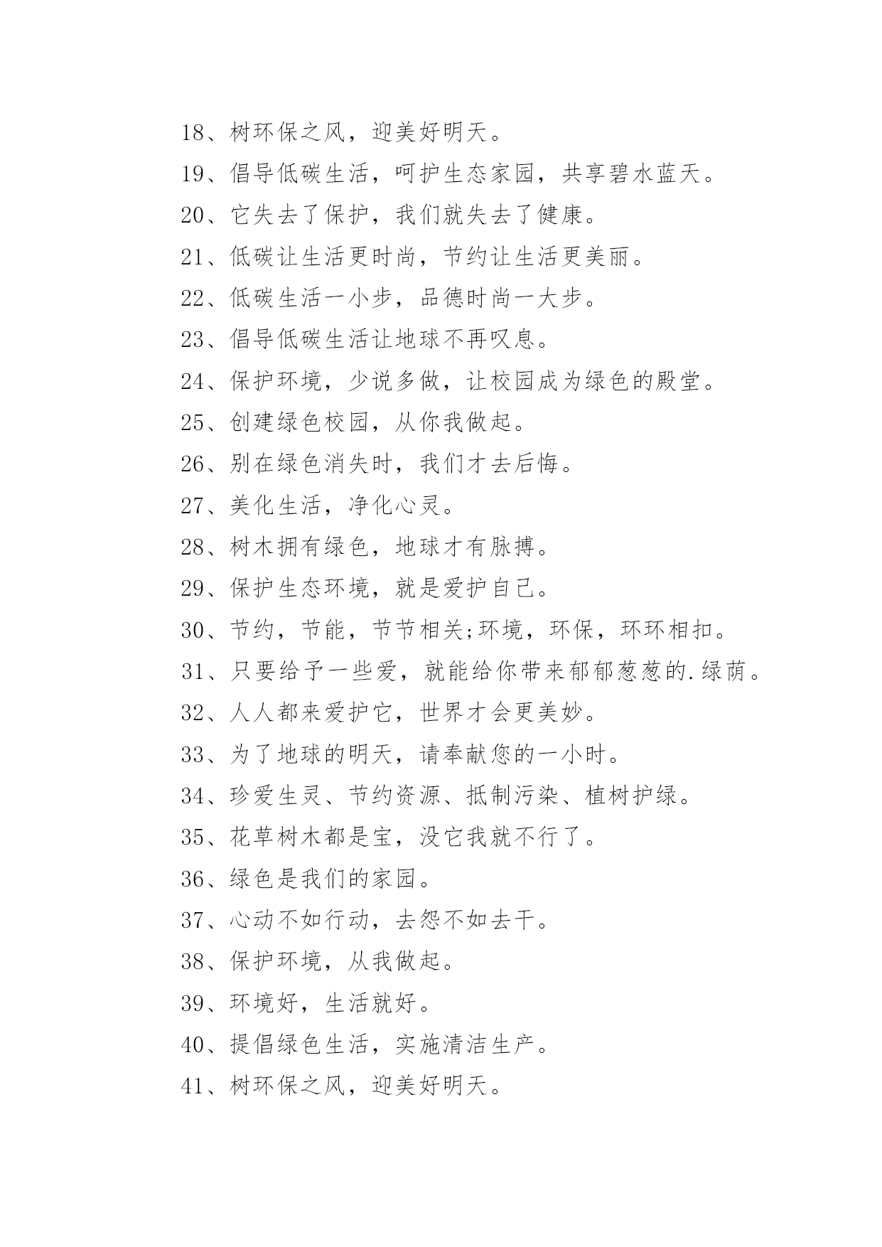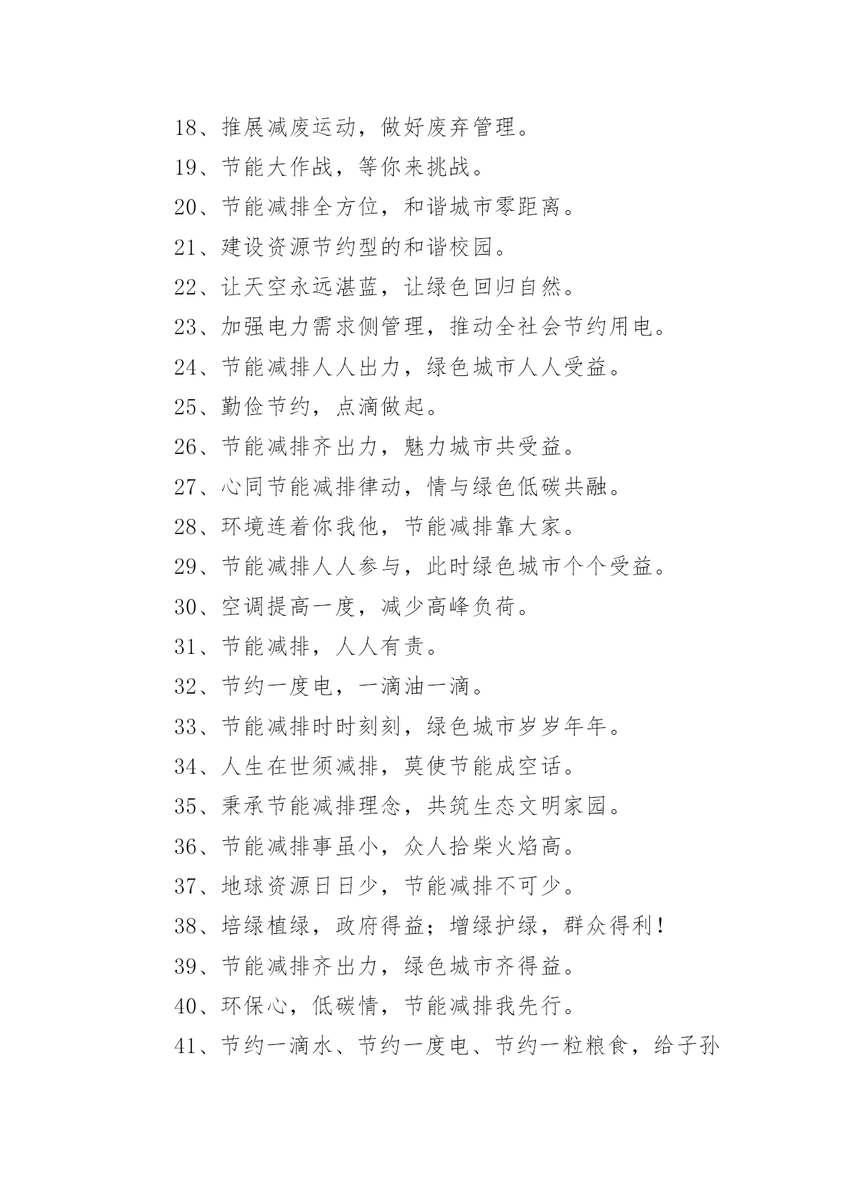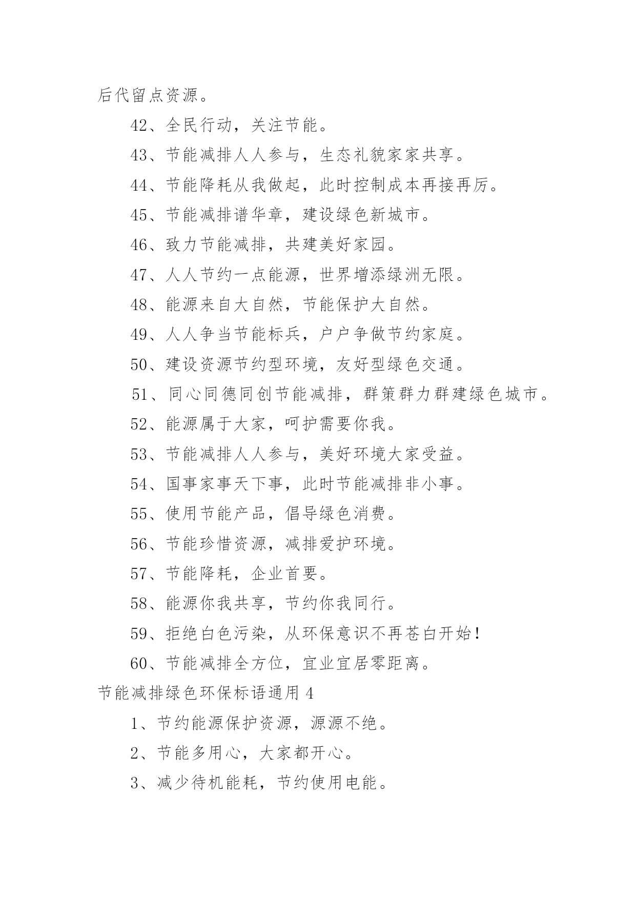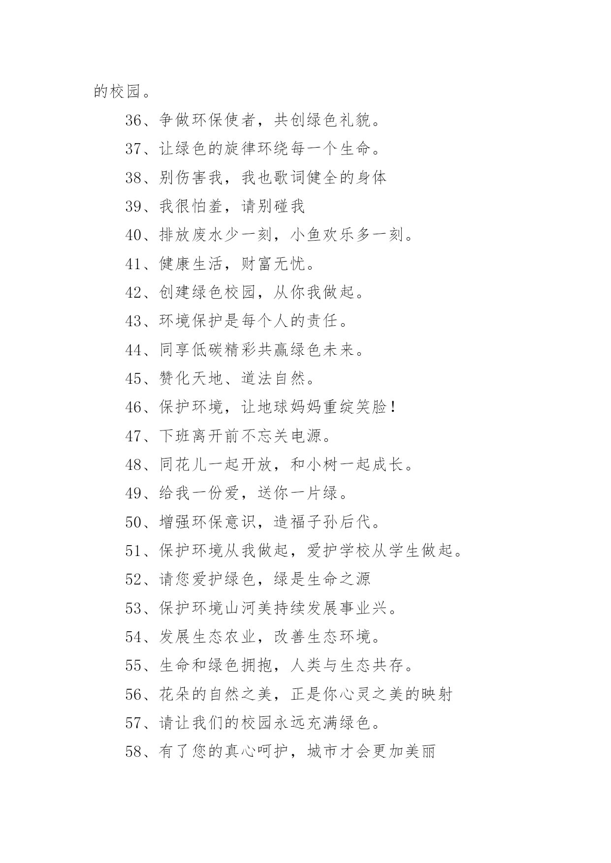 节能减排绿色环保标语节能减排绿色环保标语通用在现实生活或工作学习中,大家一定都接触过一些使用较为普遍的标语吧,通过标语,可以增强人们的社会责任心。标语的类型多样,你所见过的标语是什么样的呢?下面是小编精心整理的节能减排绿色环保标语通用,希望对大家有所帮助。节能减排绿色环保标语通用11、爱护环境,热心环保,回归自然。2、爱无限,绿无边。3、绿色是我们的家园。4、你我环保,一起健康,共创财富,共享自由。5、喝洁净的水,呼吸新鲜的空气,这需要您每时每刻爱护环境!6、环保畅享绿色人生,健康乐活财富自由。7、绿色,是自然之美,是心灵之声,是人类的依靠。8、只要给予一些爱,就能给你带来郁郁葱葱的绿荫。9、人人爱花草,空气环境好。10、建节约型机关,做低碳型表率。11、地球是我们的母亲,保护地球就是保护母亲。12、用我们的爱心,迎来校园的.一片绿。13、保护环境,功在当代,利在千秋。14、要想校园净又美,健康文明记心里。15、少一个脚印,多一个生命,不锈钢水箱。16、保护环境,造福人民。17、低碳新时尚,中国是积极的。18、改善空气质量,提高民众环保意识。19、保护学校环境,共创学生圣地!20、留我一片绿色,还您一个健康21、小草正睡觉,请你勿打扰。22、一言一行如有爱,一草一木均含情。23、大路朝天尽情走,绿地花丛切莫过。24、享受低碳美好的双赢绿色未来。25、美好环境需要我们共同建设。26、草木绿,花儿笑,空气清新环境好。27、关注环境保护,从现在开始,支持环境保护,从小事情开始。28、环保不分民族,生态没有国界。29、花草从中笑,园外观其貌30、城市需要环保,节能改变生活。31、学校是我家,绿化靠大家。32、让我们亲近绿色,一路同行。33、滴水之愿,以绿相报34、绿色发展手牵手,生态富民心连心。35、伸出您的手,伸出我的手,并使五彩纸屑远离我们的校园。36、争做环保使者,共创绿色礼貌。37、让绿色的旋律环绕每一个生命。38、别伤害我,我也歌词健全的身体39、我很怕羞,请别碰我40、排放废水少一刻,小鱼欢乐多一刻。41、健康生活,财富无忧。42、创建绿色校园,从你我做起。43、环境保护是每个人的责任。44、同享低碳精彩共赢绿色未来。45、赞化天地、道法自然。46、保护环境,让地球妈妈重绽笑脸!47、下班离开前不忘关电源。48、同花儿一起开放,和小树一起成长。49、给我一份爱,送你一片绿。50、增强环保意识,造福子孙后代。51、保护环境从我做起,爱护学校从学生做起。52、请您爱护绿色,绿是生命之源53、保护环境山河美持续发展事业兴。54、发展生态农业,改善生态环境。55、生命和绿色拥抱,人类与生态共存。56、花朵的自然之美,正是你心灵之美的映射57、请让我们的校园永远充满绿色。58、有了您的真心呵护,城市才会更加美丽59、“爱惜生命之源,“关”住滴滴点点”60、追求绿色时尚,拥抱绿色生活。节能减排绿色环保标语通用21、选择低碳,绿色相伴。2、建设绿色校园,增强环保意识。3、节能是一种美德,环保是一种时尚。4、企业求发展,环保须先行。5、绿色象征生命,珍惜生命,环保第一。6、保护环境,保护自然就是保护人类自己。7、节能低碳意义大,行动落实靠大家,关灯节水多步行,绿水青天笑脸迎。8、人类只有好好地对待大自然,大自然才能无限地回报人类。9、喝洁净的水,呼吸新鲜的空气,这需要您每时每刻爱护环境!10、树立“低碳”理念,创建绿色家园。11、节约好比燕衔泥,浪费犹如河缺口,能源连着你我他,低碳生活靠大家。12、树立节水意识,反对浪费水源。13、如果没有树木,世界将会暗淡无光。14、节能,有限资源无限循环。15、保护环境从我做起,爱护学校从学生做起。16、给我一片绿,还你一片荫。17、合理利用资源,保护生态平衡。18、树环保之风,迎美好明天。19、倡导低碳生活,呵护生态家园,共享碧水蓝天。20、它失去了保护,我们就失去了健康。21、低碳让生活更时尚,节约让生活更美丽。22、低碳生活一小步,品德时尚一大步。23、倡导低碳生活让地球不再叹息。24、保护环境,少说多做,让校园成为绿色的殿堂。25、创建绿色校园,从你我做起。26、别在绿色消失时,我们才去后悔。27、美化生活,净化心灵。28、树木拥有绿色,地球才有脉搏。29、保护生态环境,就是爱护自己。30、节约,节能,节节相关;环境,环保,环环相扣。31、只要给予一些爱,就能给你带来郁郁葱葱的.绿荫。32、人人都来爱护它,世界才会更美妙。33、为了地球的明天,请奉献您的一小时。34、珍爱生灵、节约资源、抵制污染、植树护绿。35、花草树木都是宝,没它我就不行了。36、绿色是我们的家园。37、心动不如行动,去怨不如去干。38、保护环境,从我做起。39、环境好,生活就好。40、提倡绿色生活,实施清洁生产。41、
