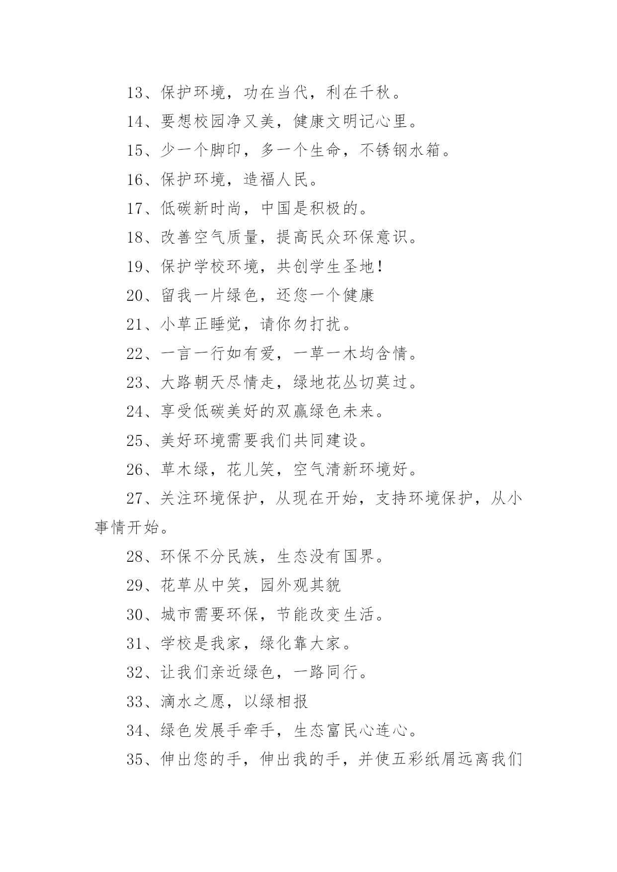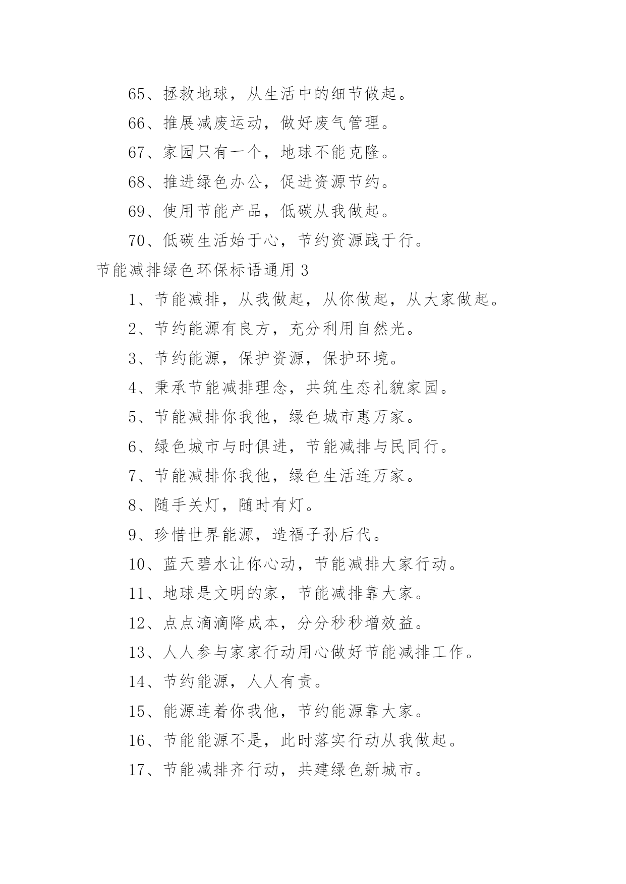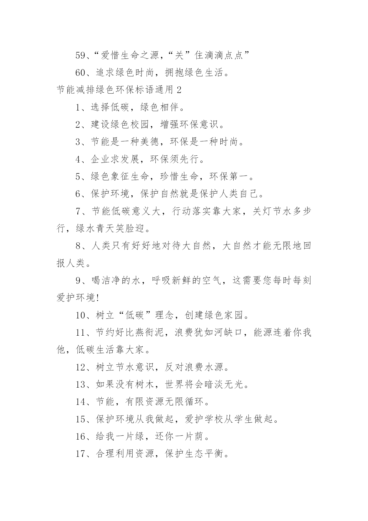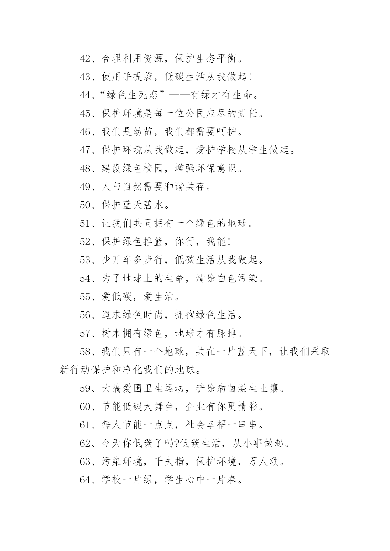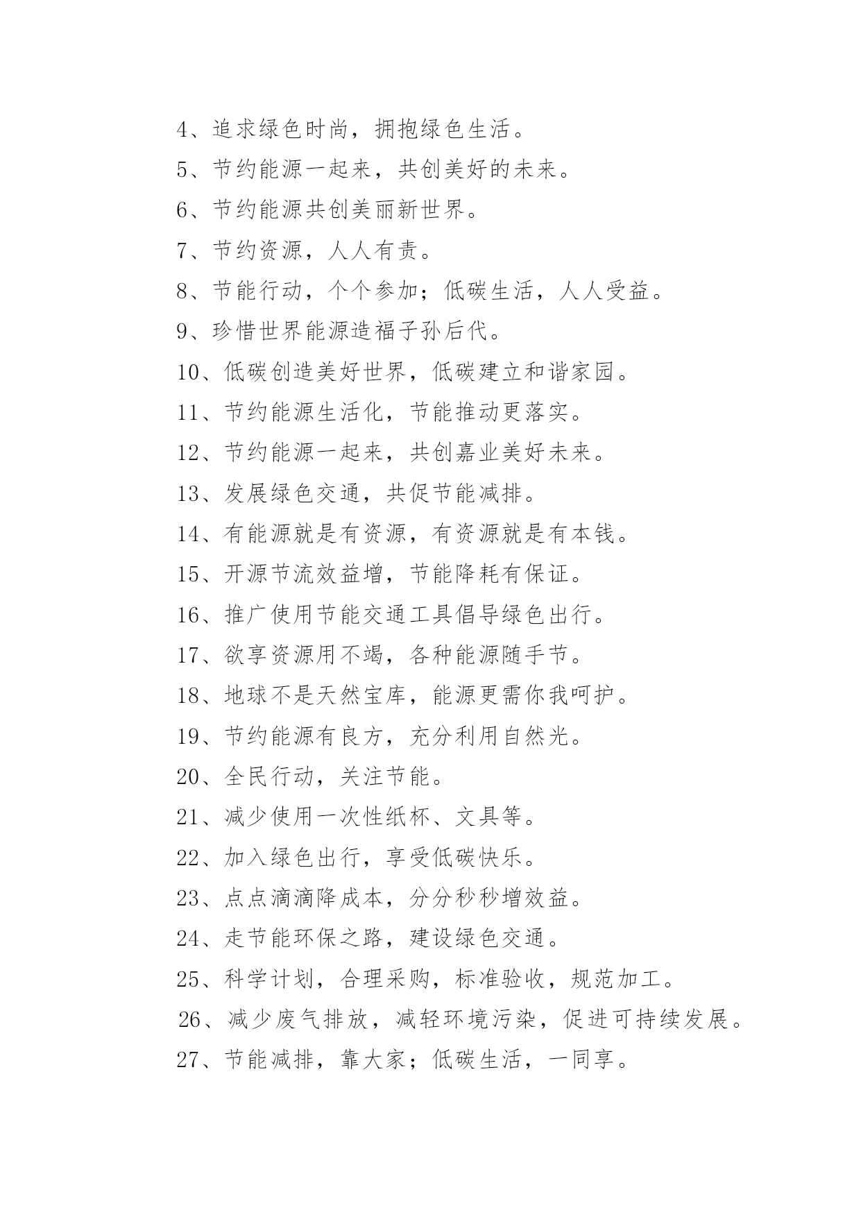 节能减排绿色环保标语节能减排绿色环保标语通用在现实生活或工作学习中,大家一定都接触过一些使用较为普遍的标语吧,通过标语,可以增强人们的社会责任心。标语的类型多样,你所见过的标语是什么样的呢?下面是小编精心整理的节能减排绿色环保标语通用,希望对大家有所帮助。节能减排绿色环保标语通用11、爱护环境,热心环保,回归自然。2、爱无限,绿无边。3、绿色是我们的家园。4、你我环保,一起健康,共创财富,共享自由。5、喝洁净的水,呼吸新鲜的空气,这需要您每时每刻爱护环境!6、环保畅享绿色人生,健康乐活财富自由。7、绿色,是自然之美,是心灵之声,是人类的依靠。8、只要给予一些爱,就能给你带来郁郁葱葱的绿荫。9、人人爱花草,空气环境好。10、建节约型机关,做低碳型表率。11、地球是我们的母亲,保护地球就是保护母亲。12、用我们的爱心,迎来校园的.一片绿。13、保护环境,功在当代,利在千秋。14、要想校园净又美,健康文明记心里。15、少一个脚印,多一个生命,不锈钢水箱。16、保护环境,造福人民。17、低碳新时尚,中国是积极的。18、改善空气质量,提高民众环保意识。19、保护学校环境,共创学生圣地!20、留我一片绿色,还您一个健康21、小草正睡觉,请你勿打扰。22、一言一行如有爱,一草一木均含情。23、大路朝天尽情走,绿地花丛切莫过。24、享受低碳美好的双赢绿色未来。25、美好环境需要我们共同建设。26、草木绿,花儿笑,空气清新环境好。27、关注环境保护,从现在开始,支持环境保护,从小事情开始。28、环保不分民族,生态没有国界。29、花草从中笑,园外观其貌30、城市需要环保,节能改变生活。31、学校是我家,绿化靠大家。32、让我们亲近绿色,一路同行。33、滴水之愿,以绿相报34、绿色发展手牵手,生态富民心连心。35、伸出您的手,伸出我的手,并使五彩纸屑远离我们的校园。36、争做环保使者,共创绿色礼貌。37、让绿色的旋律环绕每一个生命。38、别伤害我,我也歌词健全的身体39、我很怕羞,请别碰我40、排放废水少一刻,小鱼欢乐多一刻。41、健康生活,财富无忧。42、创建绿色校园,从你我做起。43、环境保护是每个人的责任。44、同享低碳精彩共赢绿色未来。45、赞化天地、道法自然。46、保护环境,让地球妈妈重绽笑脸!47、下班离开前不忘关电源。48、同花儿一起开放,和小树一起成长。49、给我一份爱,送你一片绿。50、增强环保意识,造福子孙后代。51、保护环境从我做起,爱护学校从学生做起。52、请您爱护绿色,绿是生命之源53、保护环境山河美持续发展事业兴。54、发展生态农业,改善生态环境。55、生命和绿色拥抱,人类与生态共存。56、花朵的自然之美,正是你心灵之美的映射57、请让我们的校园永远充满绿色。58、有了您的真心呵护,城市才会更加美丽59、“爱惜生命之源,“关”住滴滴点点”60、追求绿色时尚,拥抱绿色生活。节能减排绿色环保标语通用21、选择低碳,绿色相伴。2、建设绿色校园,增强环保意识。3、节能是一种美德,环保是一种时尚。4、企业求发展,环保须先行。5、绿色象征生命,珍惜生命,环保第一。6、保护环境,保护自然就是保护人类自己。7、节能低碳意义大,行动落实靠大家,关灯节水多步行,绿水青天笑脸迎。8、人类只有好好地对待大自然,大自然才能无限地回报人类。9、喝洁净的水,呼吸新鲜的空气,这需要您每时每刻爱护环境!10、树立“低碳”理念,创建绿色家园。11、节约好比燕衔泥,浪费犹如河缺口,能源连着你我他,低碳生活靠大家。12、树立节水意识,反对浪费水源。13、如果没有树木,世界将会暗淡无光。14、节能,有限资源无限循环。15、保护环境从我做起,爱护学校从学生做起。16、给我一片绿,还你一片荫。17、合理利用资源,保护生态平衡。18、树环保之风,迎美好明天。19、倡导低碳生活,呵护生态家园,共享碧水蓝天。20、它失去了保护,我们就失去了健康。21、低碳让生活更时尚,节约让生活更美丽。22、低碳生活一小步,品德时尚一大步。23、倡导低碳生活让地球不再叹息。24、保护环境,少说多做,让校园成为绿色的殿堂。25、创建绿色校园,从你我做起。26、别在绿色消失时,我们才去后悔。27、美化生活,净化心灵。28、树木拥有绿色,地球才有脉搏。29、保护生态环境,就是爱护自己。30、节约,节能,节节相关;环境,环保,环环相扣。31、只要给予一些爱,就能给你带来郁郁葱葱的.绿荫。32、人人都来爱护它,世界才会更美妙。33、为了地球的明天,请奉献您的一小时。34、珍爱生灵、节约资源、抵制污染、植树护绿。35、花草树木都是宝,没它我就不行了。36、绿色是我们的家园。37、心动不如行动,去怨不如去干。38、保护环境,从我做起。39、环境好,生活就好。40、提倡绿色生活,实施清洁生产。41、