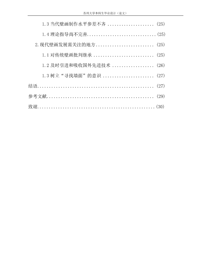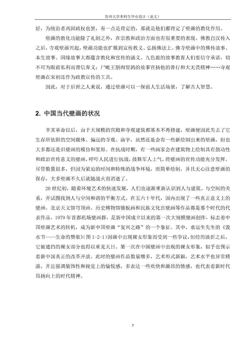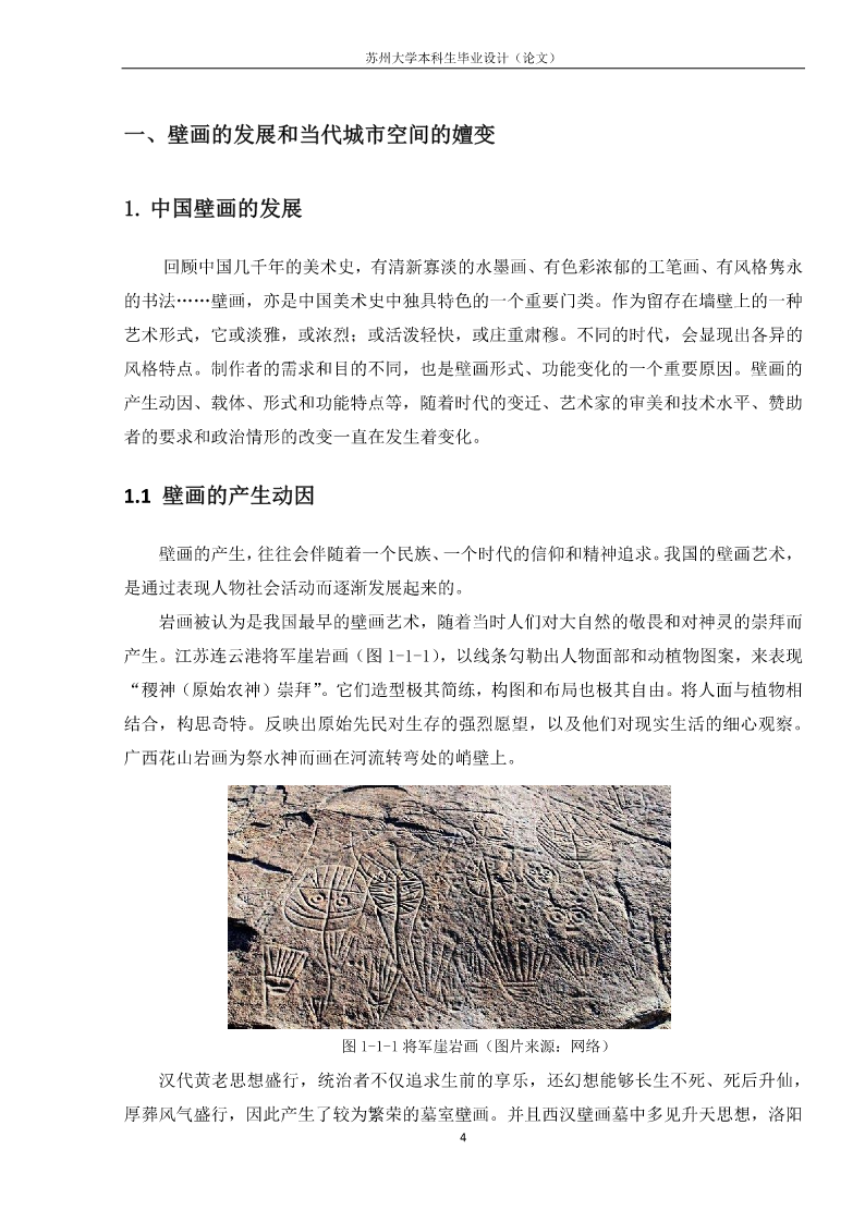 苏州大学本科生毕业设计(论文)目录中英文摘要及关键词.....................................(1)引言...................................................(3)一、壁画的发展和当代城市空间的嬗变.....................(4)1.中国壁画的发展....................................(4)1.1壁画的产生动因...............................(4)1.2壁画的形式和题材内容.........................(5)1.3壁画的功能...................................(6)2.中国当代壁画的状况................................(7)3.当代城市空间的样态................................(8)二、壁画在当代公共空间中的转换.........................(9)1.题材和形式的翻新..................................(9)2.创作方法与材料的变化.............................(11)3.陈列展示方式及场所的转换.........................(12)4.壁画艺术功能的转换...............................(12)4.1当代壁画的艺术特点..........................(12)4.2由“成教化、助人伦”到社会、精神等诸多功能..(13)4.3从柒先生的艺术实践看当代涂鸦壁画............(19)三、当今壁画创作中存在的主要问题......................(23)1.现代中国壁画界存在的一些问题.....................(23)1.1壁画界定过分“包容”........................(23)1.2壁画与建筑的脱离............................(24)苏州大学本科生毕业设计(论文)1.3当代壁画制作水平参差不齐....................(25)1.4理论指导尚不完善..............................(25)2.现代壁画发展需关注的地方.........................(25)1.1对传统壁画批判继承..........................(25)1.2及时引进和吸收国外先进技术..................(26)1.3树立“寻找墙面”的意识......................(27)结语..................................................(27)参考文献..............................................(29)致谢...................................................(30)苏州大学本科生毕业设计(论文)摘要:随着中国经济进入高速发展时期,国内生活水平日益提高,人们越来越重视生活环境与精神层面的质量,对城市公共空间的艺术化有更高要求。公共艺术经过艺术家的主观创造,融入了自己的价值观和审美观。在某种程度上,公共艺术的创作过程也注入了社会主流意识形态,同时也担任起满足广大民众审美和精神需求的重大责任。壁画作为公共艺术的一部分,具有艺术与文化的双重感染力,不仅在视觉上刺激着民众,也在精神上熏陶着民众。本文通过阐述壁画艺术的历史发展,对比古今中国壁画的题材内容、创作方式、材料、展陈方式、艺术特点和功能等方面,探索中国当代城市公共空间中壁画的特点,结合公共空间中多种形式壁画艺术的案例,探讨壁画在当代公共空间中所发挥的作用和在发展过程中应着重注意的一些问题。为其更好地发挥公共艺术该有的作用、更好地融入城市公共文化建设。关键词:当代壁画公共性城市空间功能转换1苏州大学本科生毕业设计(论文)Abstract:AsChina'seconomyintoaperiodofrapiddevelopment,thedomesticlivinglevelisincreasingdaybyday,peoplepaym