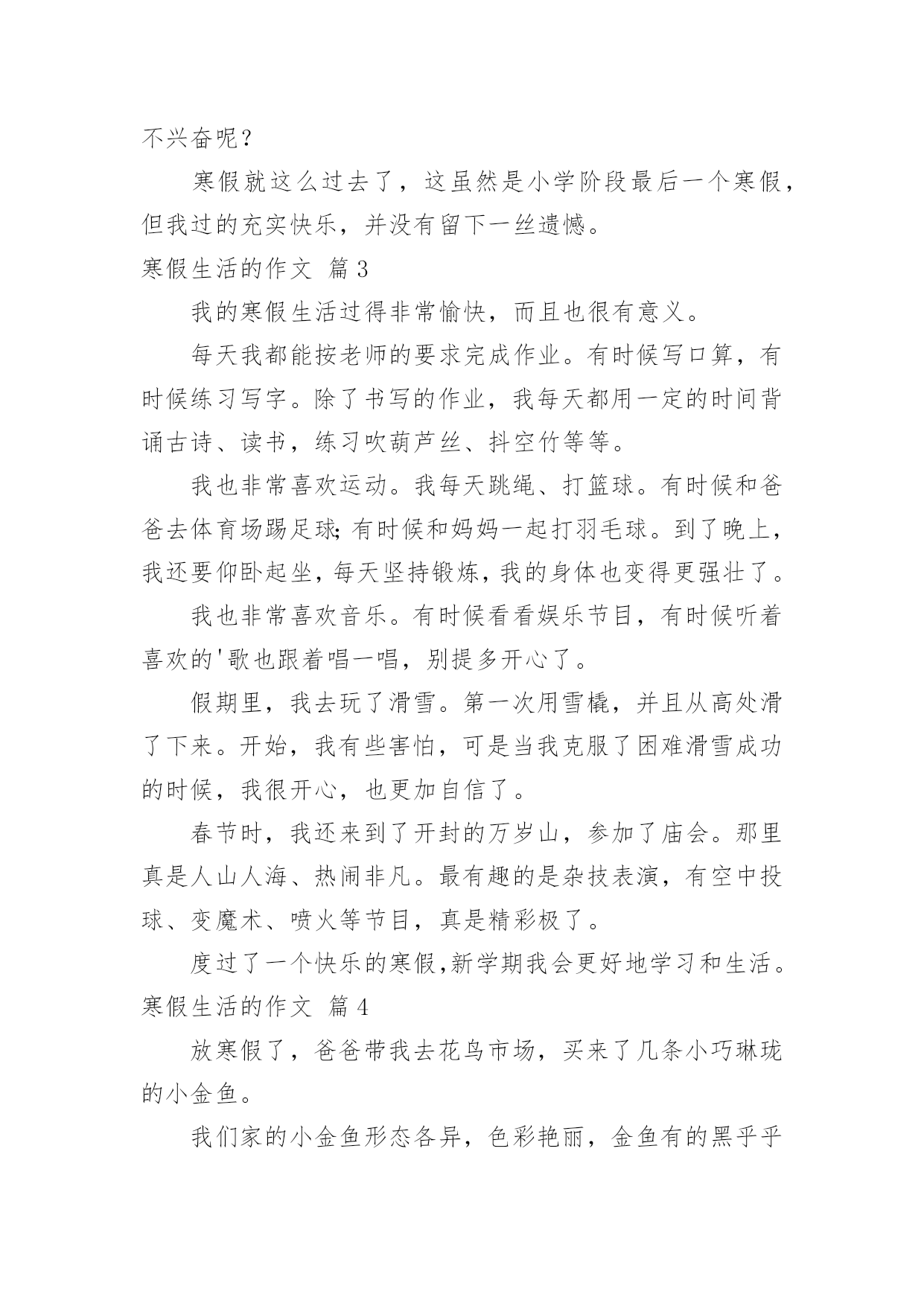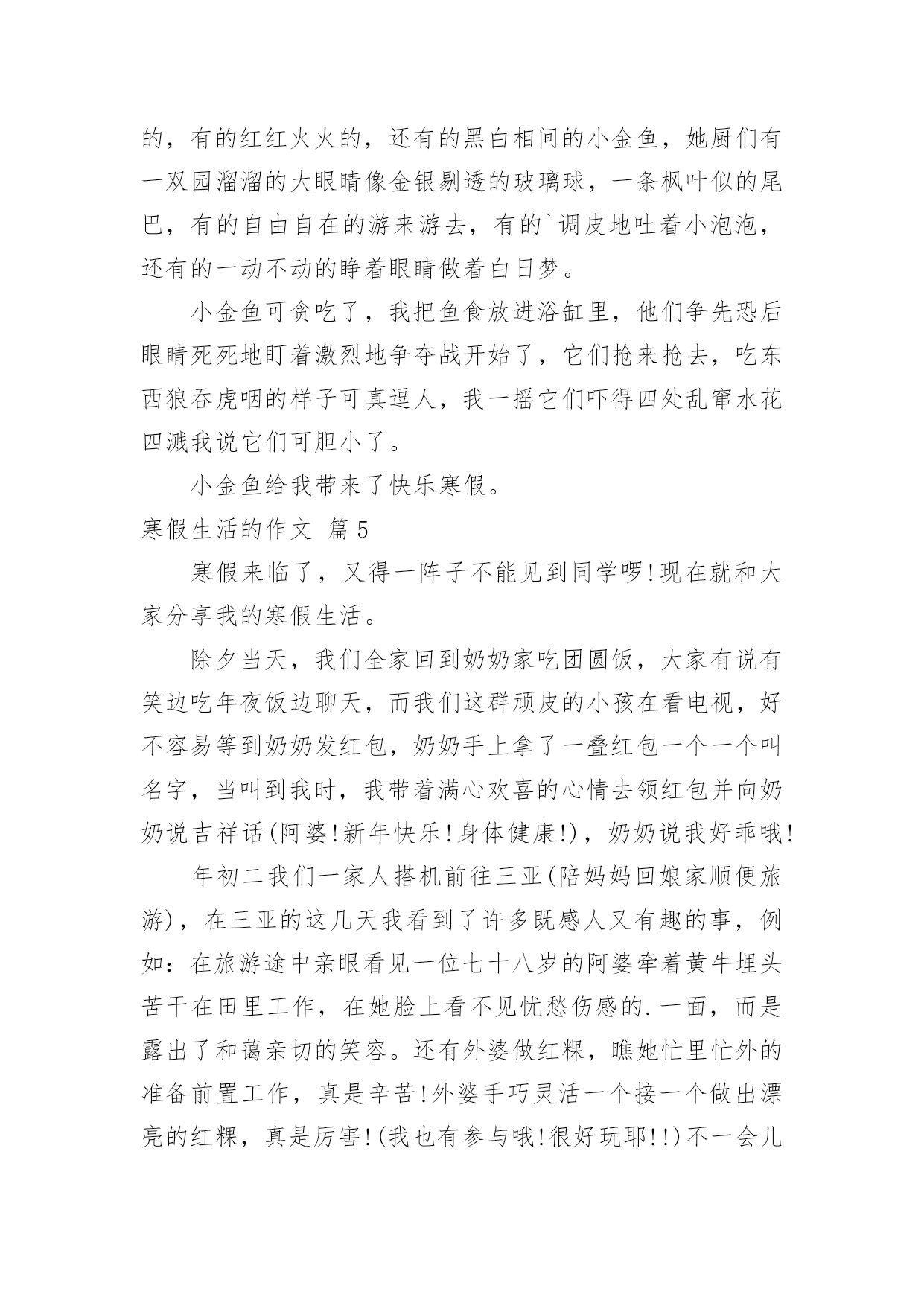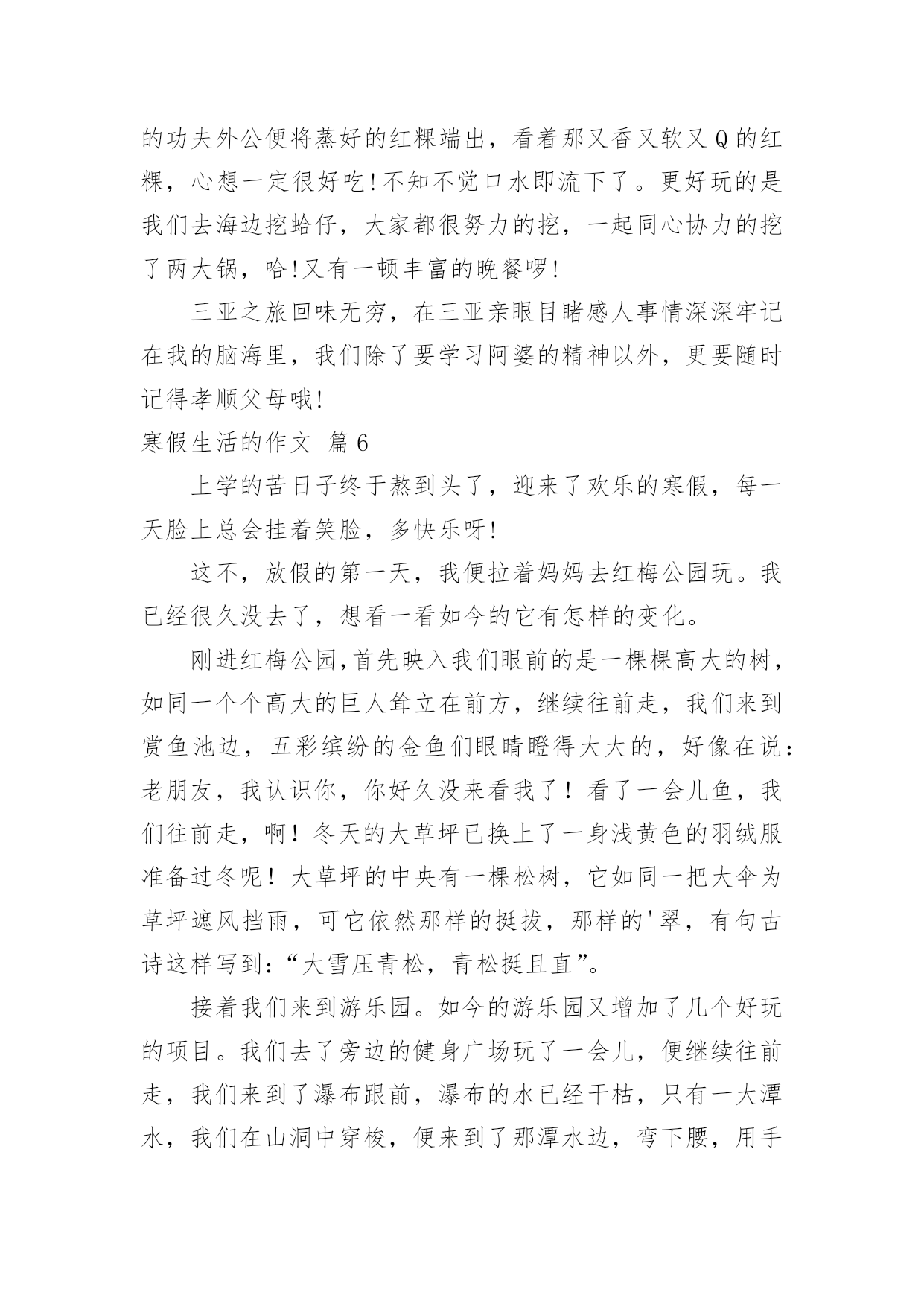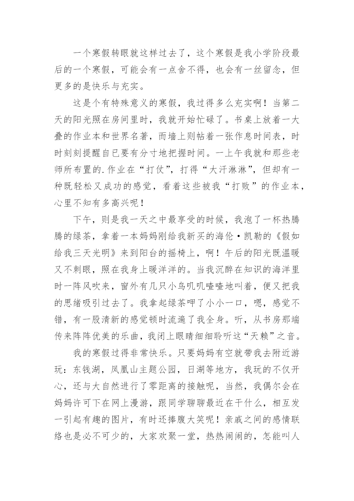 寒假生活的作文【实用】寒假生活的作文6篇在日常生活或是工作学习中,大家都有写作文的经历,对作文很是熟悉吧,作文是人们以书面形式表情达意的言语活动。一篇什么样的作文才能称之为优秀作文呢?以下是小编收集整理的寒假生活的作文6篇,欢迎大家分享。寒假生活的作文篇1放寒假前,老师给我们布置了一项作业,就是让我们在假期中为家长做一件好事。思前想后,我决定帮奶奶做事。寒假中的一天晚上,奶奶把饭做好,我就开始吃了。吃完饭,该刷碗了。我就对奶奶说:“奶奶,我来刷碗吧,您歇一歇吧!”我把碗刷了一遍。奶奶检查了一下,笑着摇了摇头说:“不过,还有一点儿脏,你还要再刷一遍,才能刷干净。”我听了奶奶的话,决定再刷一遍。经过自己的又一番努力,这一次我把碗刷的特别干净。奶奶看了非常满意。我又对奶奶说:“奶奶您平时太辛苦啦!现在我放假了,以后就让我给您刷碗吧。我已经长大了,可以帮您做事了。”奶奶听了,笑得合不拢嘴:“好,我的`孙女长大了,孝顺了,懂得替奶奶做事了。奶奶真的很开心。”这时,我看着奶奶甜滋滋的笑容,我感觉到我的心里美美的、暖暖的。经过这件事,我觉得自己一下子长大了许多。老师布置的这项假期作业真有意义,我要坚持做好它。寒假生活的作文篇2一个寒假转眼就这样过去了,这个寒假是我小学阶段最后的一个寒假,可能会有一点舍不得,也会有一丝留念,但更多的是快乐与充实。这是个有特殊意义的寒假,我过得多么充实啊!当第二天的阳光照在房间里时,我就开始忙碌了。书桌上放着一大叠的作业本和世界名著,而墙上则帖着一张作息时间表,时时刻刻提醒自已要有分寸地把握时间。一上午我就和那些老师所布置的.作业在“打仗”,打得“大汗淋淋”,但却有一种既轻松又成功的感觉,看着这些被我“打败”的作业本,心里不知有多高兴呢!下午,则是我一天之中最享受的时候,我泡了一杯热腾腾的绿茶,拿着一本妈妈刚给我新买的海伦·凯勒的《假如给我三天光明》来到阳台的摇椅上,啊!午后的阳光既温暖又不刺眼,照在我身上暖洋洋的。当我沉醉在知识的海洋里时一阵风吹来,窗外有几只小鸟叽叽喳喳地叫着,便又把我的思绪吸引过去了。我拿起绿茶呷了小小一口,嗯,感觉不错,有一股清新的感觉顿时流遍了我全身。听,从书房那端传来阵阵优美的乐曲,我闭上眼睛细细聆听这“天赖”之音。我的寒假过得非常快乐。只要妈妈有空就带我去附近游玩:东钱湖,凤凰山主题公园,日湖等地方,我玩的不仅开心,还与大自然进行了零距离的接触呢,当然,我偶尔会在妈妈许可下在网上漫游,跟同学聊聊最近在干什么,相互发一引起有趣的图片,有时还捧腹大笑呢!亲戚之间的感情联络也是必不可少的,大家欢聚一堂,热热闹闹的,怎能叫人不兴奋呢?寒假就这么过去了,这虽然是小学阶段最后一个寒假,但我过的充实快乐,并没有留下一丝遗憾。寒假生活的作文篇3我的寒假生活过得非常愉快,而且也很有意义。每天我都能按老师的要求完成作业。有时候写口算,有时候练习写字。除了书写的作业,我每天都用一定的时间背诵古诗、读书,练习吹葫芦丝、抖空竹等等。我也非常喜欢运动。我每天跳绳、打篮球。有时候和爸爸去体育场踢足球;有时候和妈妈一起打羽毛球。到了晚上,我还要仰卧起坐,每天坚持锻炼,我的身体也变得更强壮了。我也非常喜欢音乐。有时候看看娱乐节目,有时候听着喜欢的'歌也跟着唱一唱,别提多开心了。假期里,我去玩了滑雪。第一次用雪橇,并且从高处滑了下来。开始,我有些害怕,可是当我克服了困难滑雪成功的时候,我很开心,也更加自信了。春节时,我还来到了开封的万岁山,参加了庙会。那里真是人山人海、热闹非凡。最有趣的是杂技表演,有空中投球、变魔术、喷火等节目,真是精彩极了。度过了一个快乐的寒假,新学期我会更好地学习和生活。寒假生活的作文篇4放寒假了,爸爸带我去花鸟市场,买来了几条小巧琳珑的小金鱼。我们家的小金鱼形态各异,色彩艳丽,金鱼有的黑乎乎的,有的红红火火的,还有的黑白相间的小金鱼,她厨们有一双园溜溜的大眼睛像金银剔透的玻璃球,一条枫叶似的尾巴,有的自由自在的游来游去,有的`调皮地吐着小泡泡,还有的一动不动的睁着眼睛做着白日梦。小金鱼可贪吃了,我把鱼食放进浴缸里,他们争先恐后眼睛死死地盯着激烈地争夺战开始了,它们抢来抢去,吃东西狼吞虎咽的样子可真逗人,我一摇它们吓得四处乱窜水花四溅我说它们可胆小了。小金鱼给我带来了快乐寒假。寒假生活的作文篇5寒假来临了,又得一阵子不能见到同学啰!现在就和大家分享我的寒假生活。除夕当天,我们全家回到奶奶家吃团圆饭,大家有说有笑边吃年夜饭边聊天,而我们这群顽皮的小孩在看电视,好不容易等到奶奶发红包,奶奶手上拿了一叠红包一个一个叫名字,当叫到我时,我带着满心欢喜的心情去领红包并向奶奶说吉祥话(阿婆!新年快乐!身体健康!),奶奶说我好乖哦!年初二我们一家人搭机前往三亚(陪妈妈回娘家顺便旅游),在三亚的这几天我看到
