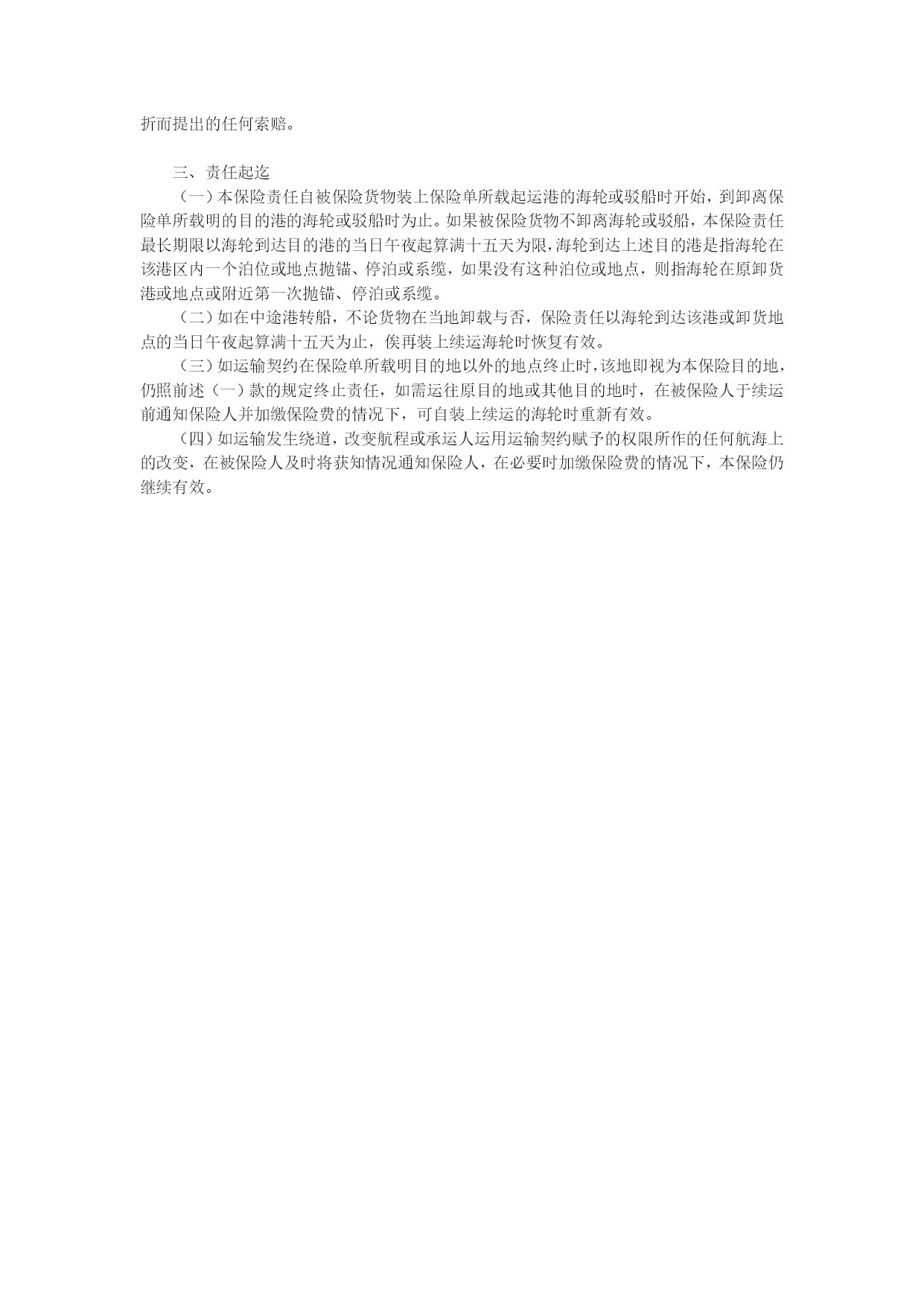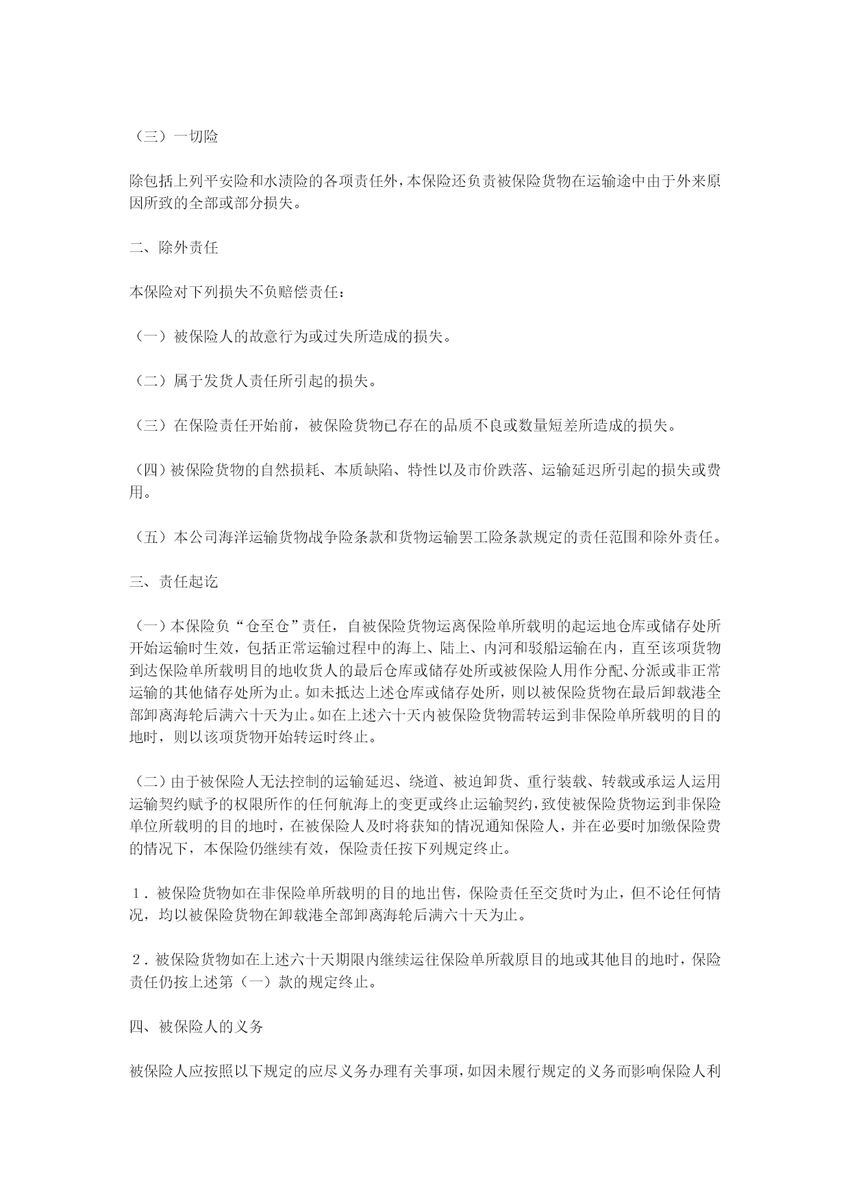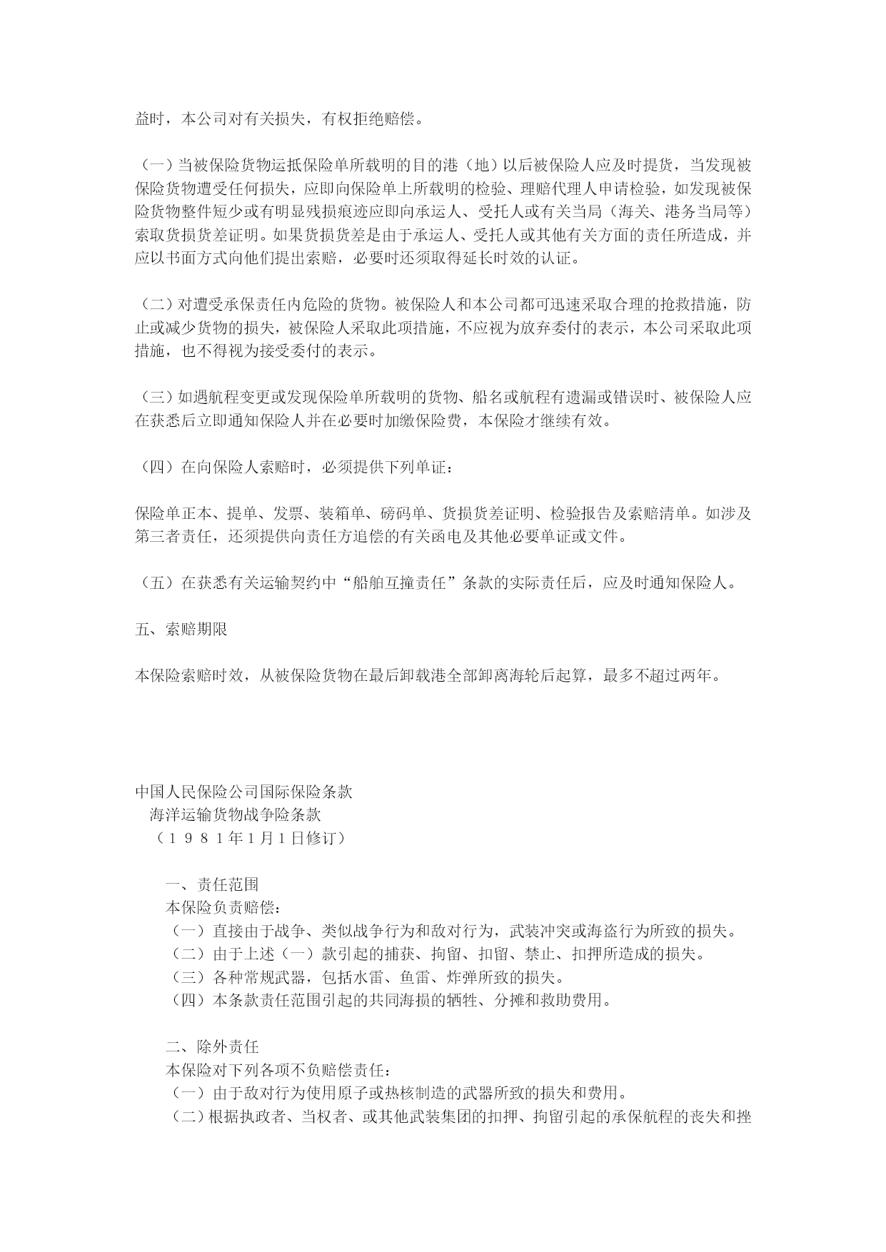 中国人民保险公司国际保险条款海洋运输货物保险条款(1981年1月1日修订)一、责任范围本保险分为平安险、水渍险及一切险三种。被保险货物遭受损失时,本保险按照保险单上订明承保险别的条款规定,负赔偿责任。(一)平安险本保险负责赔偿:1.被保险货物在运输途中由于恶劣气候,雷电、海啸、地震、洪水自然灾害造成整批货物的全部损失或推定全损。当被保险人要求赔付推定全损时,须将受损货物及其权利委付给保险公司。被保险货物用驳船运往或运离海轮的,每一驳船所装的货物可视作一个整批。推定全损是指被保险货物的实际全损已经不可避免,或者恢复、修复受损货物以及运送货物到原定目的地的费用超过该目的地的货物价值。2.由于运输工具遭受搁浅、触礁、沉没、互撞、与流冰或其他物体碰撞以及失火、爆炸意外事故造成货物的全部或部分损失。3.在运输工具已经发生搁浅、触礁、沉没、焚毁意外事故的情况下,货物在此前后又在海上遭受恶劣气候、雷电、海啸等自然灾害所造成的部分损失。4.在装卸或转运时由于一件或数件整件货物落海造成的全部或部分损失。5.被保险人对遭受承保责任内危险的货物采取抢救、防止或减少货损的措施而支付的合理费用,但以不超过该批被救货物的保险金额为限。6.运输工具遭遇海难后,在避难港由于卸货所引起的损失以及在中途港、避难港由于卸货、存仓以及运送货物所产生的特别费用。7.共同海损的牺牲、分摊和救助费用。8.运输契约订有“船舶互撞责任”条款,根据该条款规定应由货方偿还船方的损失。(二)水渍险除包括上列平安险的各项责任外,本保险还负责被保险货物由于恶劣气候、雷电、海啸、地震、洪水自然灾害所造成的部分损失。(三)一切险除包括上列平安险和水渍险的各项责任外,本保险还负责被保险货物在运输途中由于外来原因所致的全部或部分损失。二、除外责任本保险对下列损失不负赔偿责任:(一)被保险人的故意行为或过失所造成的损失。(二)属于发货人责任所引起的损失。(三)在保险责任开始前,被保险货物已存在的品质不良或数量短差所造成的损失。(四)被保险货物的自然损耗、本质缺陷、特性以及市价跌落、运输延迟所引起的损失或费用。(五)本公司海洋运输货物战争险条款和货物运输罢工险条款规定的责任范围和除外责任。三、责任起讫(一)本保险负“仓至仓”责任,自被保险货物运离保险单所载明的起运地仓库或储存处所开始运输时生效,包括正常运输过程中的海上、陆上、内河和驳船运输在内,直至该项货物到达保险单所载明目的地收货人的最后仓库或储存处所或被保险人用作分配、分派或非正常运输的其他储存处所为止。如未抵达上述仓库或储存处所,则以被保险货物在最后卸载港全部卸离海轮后满六十天为止。如在上述六十天内被保险货物需转运到非保险单所载明的目的地时,则以该项货物开始转运时终止。(二)由于被保险人无法控制的运输延迟、绕道、被迫卸货、重行装载、转载或承运人运用运输契约赋予的权限所作的任何航海上的变更或终止运输契约,致使被保险货物运到非保险单位所载明的目的地时,在被保险人及时将获知的情况通知保险人,并在必要时加缴保险费的情况下,本保险仍继续有效,保险责任按下列规定终止。1.被保险货物如在非保险单所载明的目的地出售,保险责任至交货时为止,但不论任何情况,均以被保险货物在卸载港全部卸离海轮后满六十天为止。2.被保险货物如在上述六十天期限内继续运往保险单所载原目的地或其他目的地时,保险责任仍按上述第(一)款的规定终止。四、被保险人的义务被保险人应按照以下规定的应尽义务办理有关事项,如因未履行规定的义务而影响保险人利益时,本公司对有关损失,有权拒绝赔偿。(一)当被保险货物运抵保险单所载明的目的港(地)以后被保险人应及时提货,当发现被保险货物遭受任何损失,应即向保险单上所载明的检验、理赔代理人申请检验,如发现被保险货物整件短少或有明显残损痕迹应即向承运人、受托人或有关当局(海关、港务当局等)索取货损货差证明。如果货损货差是由于承运人、受托人或其他有关方面的责任所造成,并应以书面方式向他们提出索赔,必要时还须取得延长时效的认证。(二)对遭受承保责任内危险的货物。被保险人和本公司都可迅速采取合理的抢救措施,防止或减少货物的损失,被保险人采取此项措施,不应视为放弃委付的表示,本公司采取此项措施,也不得视为接受委付的表示。(三)如遇航程变更或发现保险单所载明的货物、船名或航程有遗漏或错误时、被保险人应在获悉后立即通知保险人并在必要时加缴保险费,本保险才继续有效。(四)在向保险人索赔时,必须提供下列单证:保险单正本、提单、发票、装箱单、磅码单、货损货差证明、检验报告及索赔清单。如涉及第三者责任,还须提供向责任方追偿的有关函电