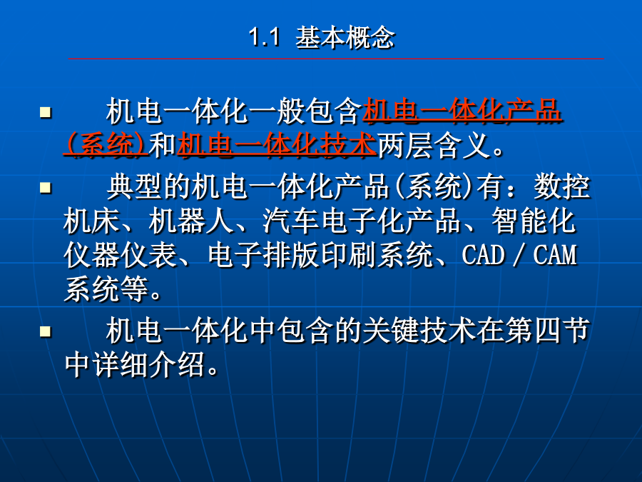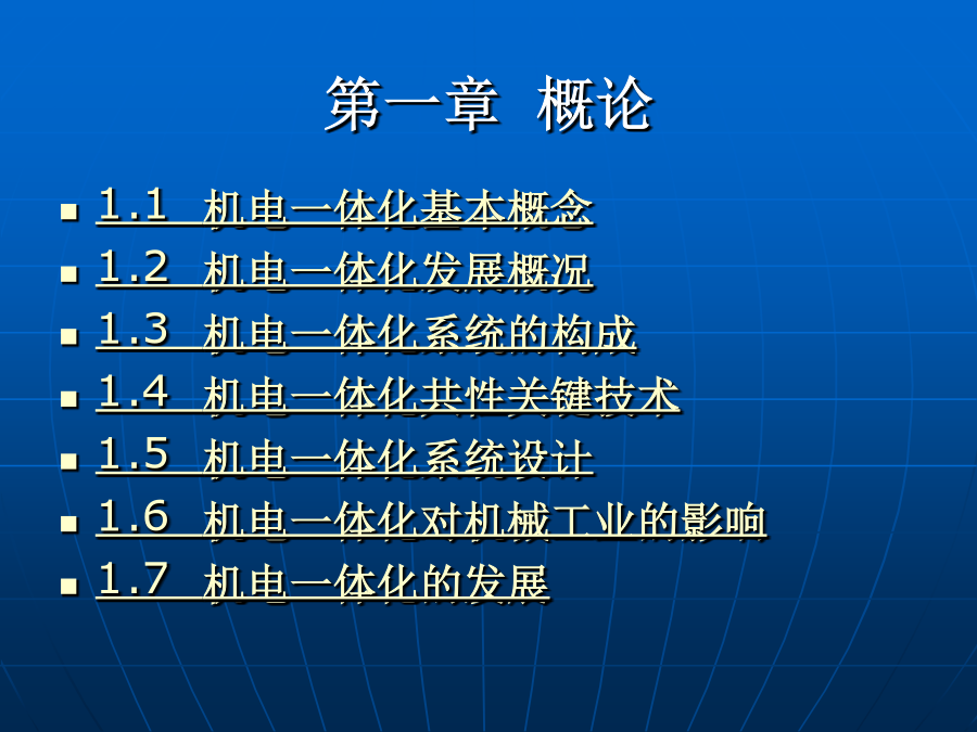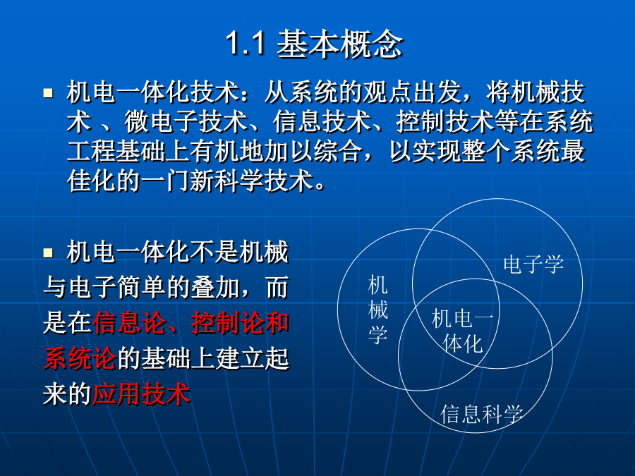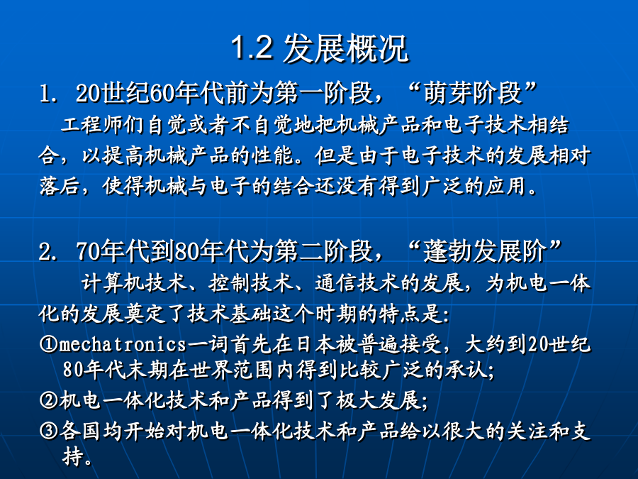 机电一体化产品设计第一章概论1.1基本概念机电一体化一般包含机电一体化产品(系统)和机电一体化技术两层含义。典型的机电一体化产品(系统)有:数控机床、机器人、汽车电子化产品、智能化仪器仪表、电子排版印刷系统、CAD/CAM系统等。机电一体化中包含的关键技术在第四节中详细介绍。1.2发展概况3.90年代后期开始为第三阶段,“智能化阶段”①光学、通信技术等进入了机电一体化,微细加工技术也在机电一体化中崭露头脚,出现了光机电一体化和微机电一体化等新分支;②对机电一体化系统的建模设计、分析和集成方法,机电一体化的学科体系和发展趋势都进行了深入研究。③由于人工智能技术、神经网络技术及光纤技术等领域取得的巨大进步,为机电一体化技术开辟了发展的广阔天地。这些研究,将促使机电一体化进一步建立完整的基础和逐渐形成完整的科学体系。1.数控机床的问世,写下了“机电一体化”历史的第一页。2.微电子技术为“机电一体化‘’带来勃勃生机。3.可编程序控制器、”电力电子“等的发展为”机电一体化“提供了坚强基础。4.激光技术、模糊技术、信息技术等新技术使”机电一体化“跃上新台阶。1.3机电一体化系统的构成1.3机电一体化系统的构成1、机械本体3、检测传感装置5、执行机构1.4共性关键技术2、信息处理技术4、伺服驱动技术6、系统总体技术系统总体技术是一种从整体目标出发,用系统工程的观点和方法,将系统各个功能模块有机的结合起来,以实现整体最优。其重要内容为接口技术。接口包括电气接口、机械接口、人机接口1.5机电一体化系统设计一、市场调研二、总体方案设计三、详细设计四、样机试制与试验五、小批量生产产品的小批量生产阶段实际上是产品的试生产试销售阶段。这一阶段的主要任务是跟踪调查产品在市场上的情况,收集用户意见,发现产品在设计和制造方面存在的问题,并反馈给设计、制造和质量控制部门。六、大批量生产经过小批量试生产和试销售的考核,排除产品设计和制造中存在的各种问题后,即可投入大批量生产。1.6机电一体化对机械工业的影响1.6机电一体化对机械工业的影响3提高可靠性在提高电子元件质量、可靠性的前提下,机电一体化产品可以提高耐久性,减少故障率。另一方面由于赋予其自动监视诊断功能,并采取安全联锁控制,过负荷和失控保护、停电对策,提高了设备的安全可靠性。4节约能源例如目前我国各类电风扇年产量在200万台左右,如每台电扇的调速器和定时器(现常用电磁机械式)用电子调速器和定时器代替,估计每台风扇可节电5W以上,全年以用扇100天,每天开扇6h计,则每年可节约用电量600万kW·h,还可节省大批铜材和钢材。再如传统的电焊机以电磁原理和手工操作为基础,即使是一般的自动电焊机,其动作过程也仅为简单的机械动作和相应的控制。这类电焊机耗能多、效率低、质量不易保证。采用微型机技术后,发展新颖的电子控制电源以取代传统的焊接电源,实现焊接电源的节能、高效、小型化、多样化。1.7机电一体化的发展趋势2模块化由于机电一体化产品种类和生产厂家繁多,研制和开发具有标准机械接口、电气接口、动力接口、环境接口的机电一体化产品单元是一项十分复杂但又是非常重要的事。这需要制定各项标准,以便各部件、单元的匹配和接口。由于利益冲突,近期很难制定国际或国内这方面的标准,但可以通过组建一些大企业逐渐形成。显然,从电气产品的标准化、系列化带来的好处可以肯定,无论是对生产标准机电一体化单元的企业还是对生产机电一体化产品的企业,规模化将给机电一体化企业带来美好的前程。3网络化20世纪90年代,计算机技术等的突出成就是网络技术。机电一体化新产品一旦研制出来,只要其功能独到,质量可靠,很快就会畅销全球。由于网络的普及,基于网络的各种远程控制和监视技术方兴未艾,而远程控制的终端设备本身就是机电一体化产品。因此,机电一体化产品无疑朝着网络化方向发展。4微型化微型化兴起于20世纪80年代末,指的是机电一体化向微型机器和微观领域发展的趋势。国外称其为微电子机械系统(MEMS),泛指几何尺寸不超过1cm3的机电一体化产品,并向微米、纳米级发展。微机电一体化产品体积小、耗能少、运动灵活,在生物医疗、军事、信息等方面具有不可比拟的优势。微机电一体化发展的瓶颈在于微机械技术,微机电一体化产品的加工采用精细加工技术,即超精密技术,它包括光刻技术和蚀刻技术两类。5系统化系统化的表现特征之一就是系统体系结构进一步采用开放式和模式化的总线结构。系统可以灵活组态,进行任意剪裁和组合,同时寻求实现多子系统协调控制和综合管理。表现之二是通信功能的大大加强,一般除RS232外,还有RS485等等
