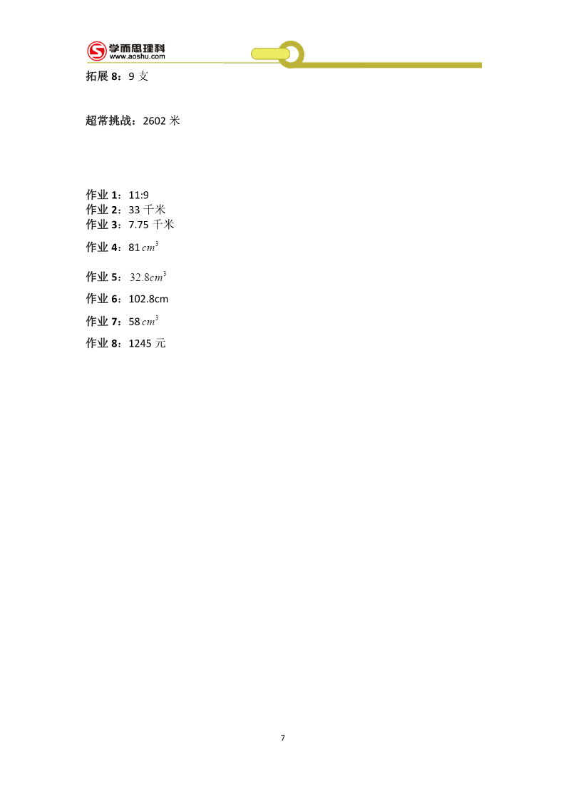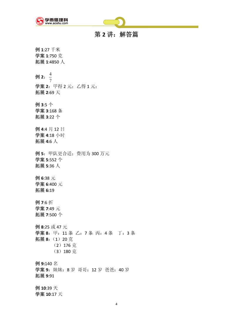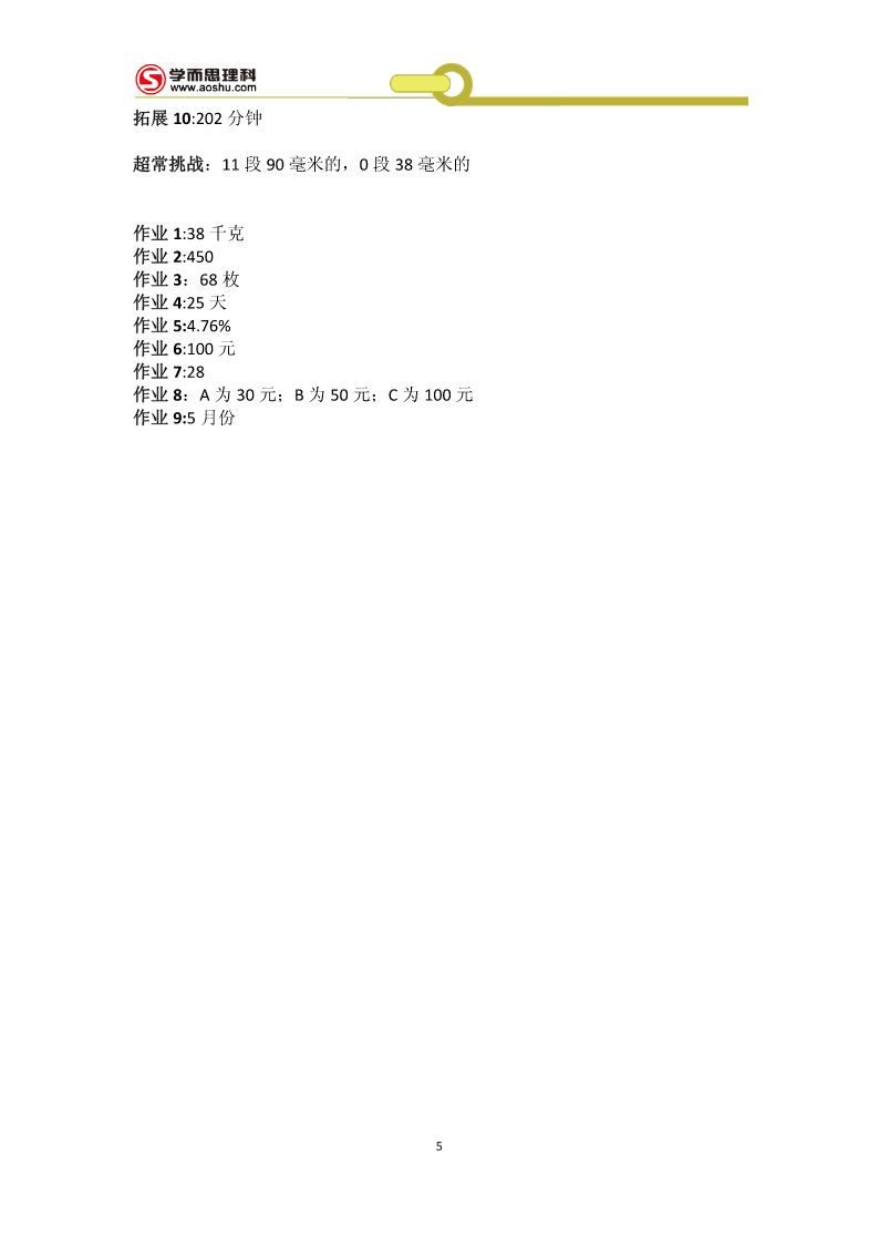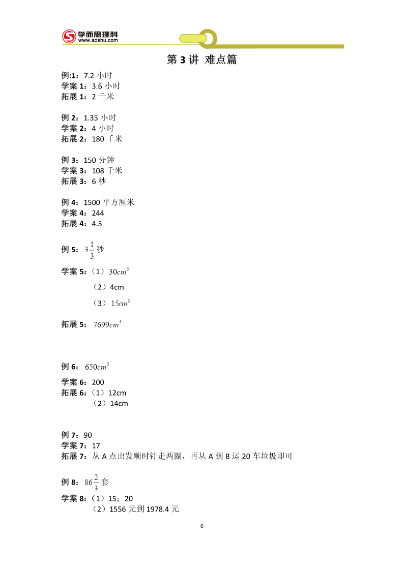 工大附中526冲刺班第1讲基础篇例1:181块学案1:(1)10100秒(2)(44,12)(3)a为奇数,先到Aa为偶数,先到B拓展1:25128例2够,画图:略学案2:(1)108m2(2)如下图(3)如下图拓展2:如下图例3:方案1:229100元方案2:246650元所以方案1省钱学案3:(1)500户(2)a=20%b=24%.(3)1160户拓展3:11.25元例4:(1)24人(2)8400元学案4:(1)180;20;(2)画图:略(3)480人拓展4:(1)a=80;b=10%;(2)108度1(3)0.56万人例5:分别是11781;12750;学案5:甲:24环;乙:28环拓展5:158个例6:1045人学案6:17个拓展6:33个例7:67个拓展7:10种拓展7:略例8:132天学案8:A拓展8:(1)120种(2)24种例9:(1)8种3(2)41学案9:12051拓展9:,369超常挑战:71作业1:2n+1作业2:(1)101.6(2)100.1+0.3n(3)182作业3:128作业4:(1)174万辆(2)略(3)372.6万吨作业5:7个作业6:141名作业7:9种111111作业8:A=;B=;C=;D=;E=;F=;6666663第2讲:解答篇例1:27千米学案1:750克拓展1:4850人4例2:7学案2:甲得2元;乙得1元;拓展2:69天例3:5个学案3:168条拓展3:22个例4:4月12日学案4:18小时拓展4:6人例5:甲队更合适;费用为300万元学案5:552个拓展5:36人例6:38元学案6:400元拓展6:19例7:6折学案7:49元拓展7:500个例8:25或47元学案8:甲:11条乙:7条丙:4条丁:3条拓展8:(1)20克(2)176克(3)180克例9:140名学案9:妹妹:8岁哥哥:12岁爸爸:40岁拓展9:91例10:39天学案10:17天4拓展10:202分钟超常挑战:11段90毫米的,0段38毫米的作业1:38千克作业2:450作业3:68枚作业4:25天作业5:4.76%作业6:100元作业7:28作业8:A为30元;B为50元;C为100元作业9:5月份5第3讲难点篇例:1:7.2小时学案1:3.6小时拓展1:2千米例2:1.35小时学案2:4小时拓展2:180千米例3:150分钟学案3:108千米拓展3:6秒例4:1500平方厘米学案4:244拓展4:4.51例5:3秒3学案5:(1)30cm3(2)4cm(3)15cm3拓展5:7699cm3例6:650cm3学案6:200拓展6:(1)12cm(2)14cm例7:90学案7:17拓展7:从A点出发顺时针走两圈,再从A到B运20车垃圾即可2例8:86套3学案8:(1)15;20(2)1556元到1978.4元6拓展8:9支超常挑战:2602米作业1:11:9作业2:33千米作业3:7.75千米作业4:81cm3作业5:32.8cm3作业6:102.8cm作业7:58cm3作业8:1245元7第4讲补充篇整数:填空:1.888000或808800;880800或880080或880008或800088或808080或808008;800808;2.503.46.67;2或两4.A+38;5.26;52000选择:CBDBB判断:1.×2.√3.√4.×5.×小数:填空:1.5.75;9.970;2.73.994.2.35.20.408;2020.8选择:BCBBC判断:1.×2.×3.×4.×5.×整除:填空:1.802.b、c;a;b;a3.2、5、8;04.25.750;750=2××353选择:DCBBA判断:1.×2.√3.×4.×5.×8百分数:填空:1.542.17113.104.175.合格率:甲是99.52%,乙是99.5%,丙是99.519%选择:DABCB判断:1.×2.×3.×4.√5.×几何:填空:1.22.563.丙;甲、丁