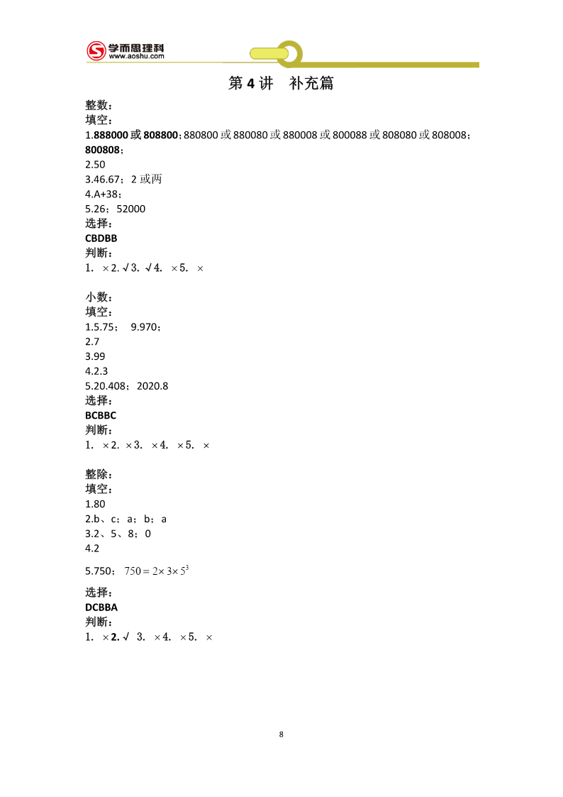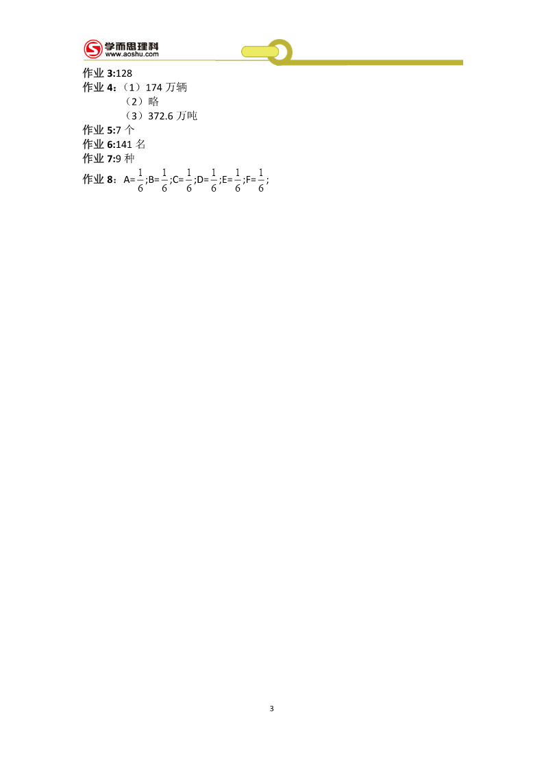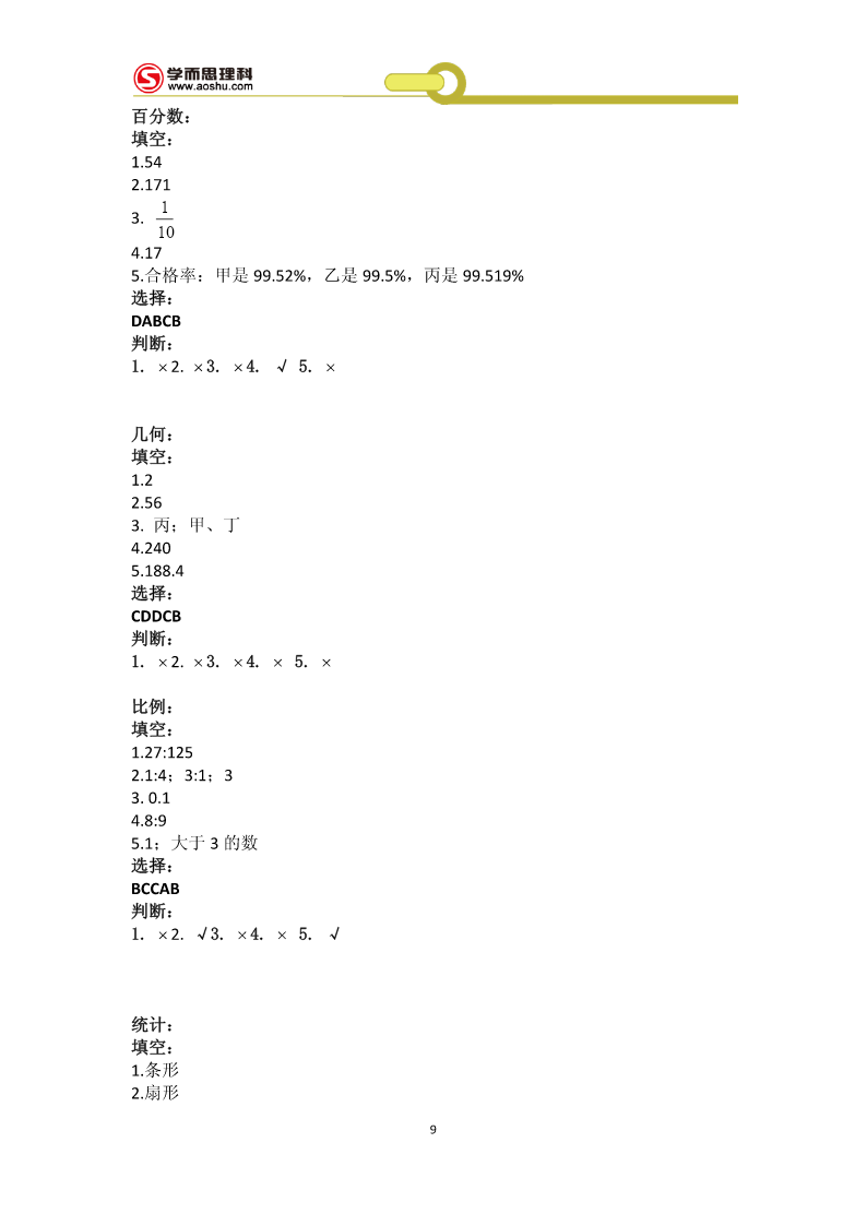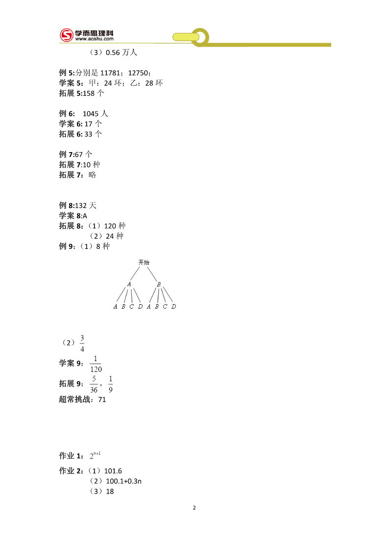 工大附中526冲刺班第1讲基础篇例1:181块学案1:(1)10100秒(2)(44,12)(3)a为奇数,先到Aa为偶数,先到B拓展1:25128例2够,画图:略学案2:(1)108m2(2)如下图(3)如下图拓展2:如下图例3:方案1:229100元方案2:246650元所以方案1省钱学案3:(1)500户(2)a=20%b=24%.(3)1160户拓展3:11.25元例4:(1)24人(2)8400元学案4:(1)180;20;(2)画图:略(3)480人拓展4:(1)a=80;b=10%;(2)108度1(3)0.56万人例5:分别是11781;12750;学案5:甲:24环;乙:28环拓展5:158个例6:1045人学案6:17个拓展6:33个例7:67个拓展7:10种拓展7:略例8:132天学案8:A拓展8:(1)120种(2)24种例9:(1)8种3(2)41学案9:12051拓展9:,369超常挑战:71作业1:2n+1作业2:(1)101.6(2)100.1+0.3n(3)182作业3:128作业4:(1)174万辆(2)略(3)372.6万吨作业5:7个作业6:141名作业7:9种111111作业8:A=;B=;C=;D=;E=;F=;6666663第2讲:解答篇例1:27千米学案1:750克拓展1:4850人4例2:7学案2:甲得2元;乙得1元;拓展2:69天例3:5个学案3:168条拓展3:22个例4:4月12日学案4:18小时拓展4:6人例5:甲队更合适;费用为300万元学案5:552个拓展5:36人例6:38元学案6:400元拓展6:19例7:6折学案7:49元拓展7:500个例8:25或47元学案8:甲:11条乙:7条丙:4条丁:3条拓展8:(1)20克(2)176克(3)180克例9:140名学案9:妹妹:8岁哥哥:12岁爸爸:40岁拓展9:91例10:39天学案10:17天4拓展10:202分钟超常挑战:11段90毫米的,0段38毫米的作业1:38千克作业2:450作业3:68枚作业4:25天作业5:4.76%作业6:100元作业7:28作业8:A为30元;B为50元;C为100元作业9:5月份5第3讲难点篇例:1:7.2小时学案1:3.6小时拓展1:2千米例2:1.35小时学案2:4小时拓展2:180千米例3:150分钟学案3:108千米拓展3:6秒例4:1500平方厘米学案4:244拓展4:4.51例5:3秒3学案5:(1)30cm3(2)4cm(3)15cm3拓展5:7699cm3例6:650cm3学案6:200拓展6:(1)12cm(2)14cm例7:90学案7:17拓展7:从A点出发顺时针走两圈,再从A到B运20车垃圾即可2例8:86套3学案8:(1)15;20(2)1556元到1978.4元6拓展8:9支超常挑战:2602米作业1:11:9作业2:33千米作业3:7.75千米作业4:81cm3作业5:32.8cm3作业6:102.8cm作业7:58cm3作业8:1245元7第4讲补充篇整数:填空:1.888000或808800;880800或880080或880008或800088或808080或808008;800808;2.503.46.67;2或两4.A+38;5.26;52000选择:CBDBB判断:1.×2.√3.√4.×5.×小数:填空:1.5.75;9.970;2.73.994.2.35.20.408;2020.8选择:BCBBC判断:1.×2.×3.×4.×5.×整除:填空:1.802.b、c;a;b;a3.2、5、8;04.25.750;750=2××353选择:DCBBA判断:1.×2.√3.×4.×5.×8百分数:填空:1.542.17113.104.175.合格率:甲是99.52%,乙是99.5%,丙是99.519%选择:DABCB判断:1.×2.×3.×4.√5.×几何:填空:1.22.563.丙;甲、丁