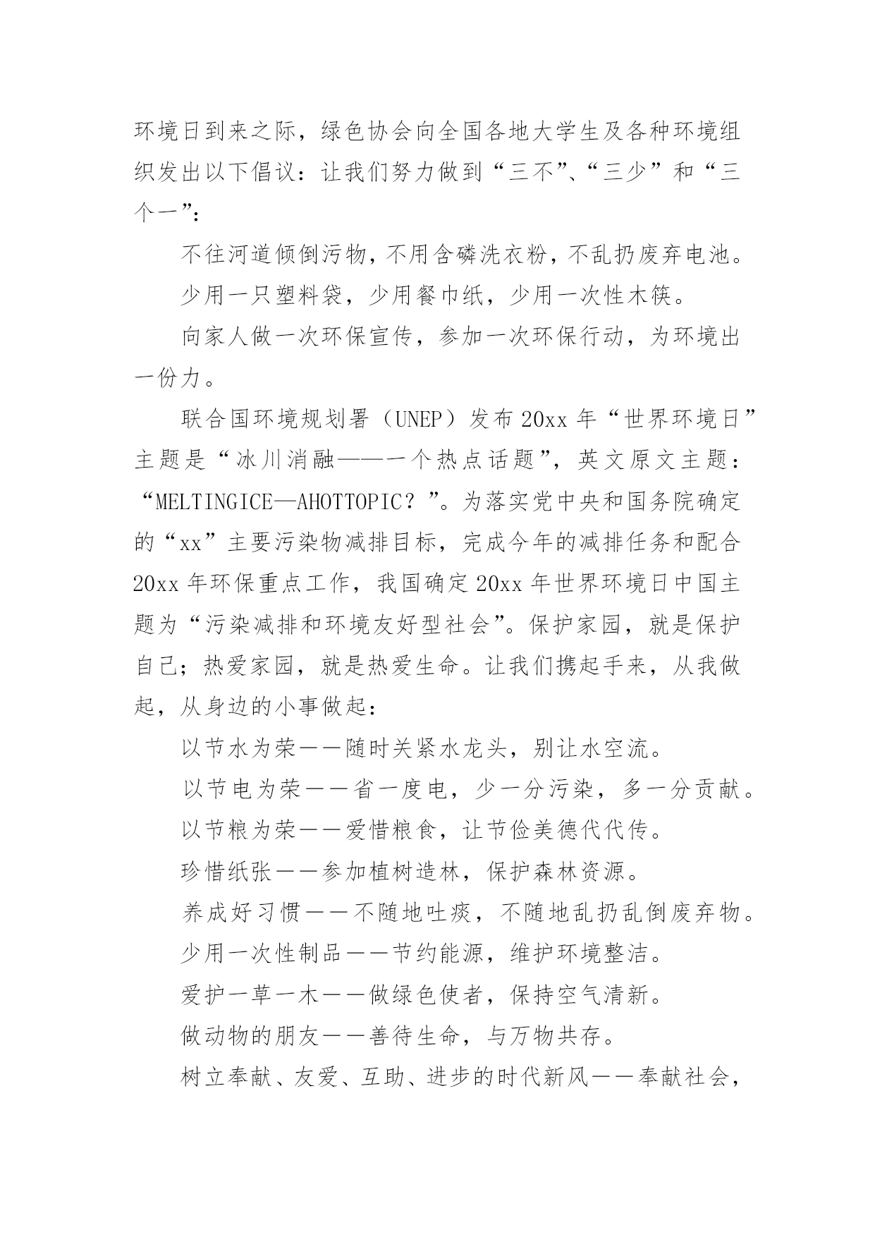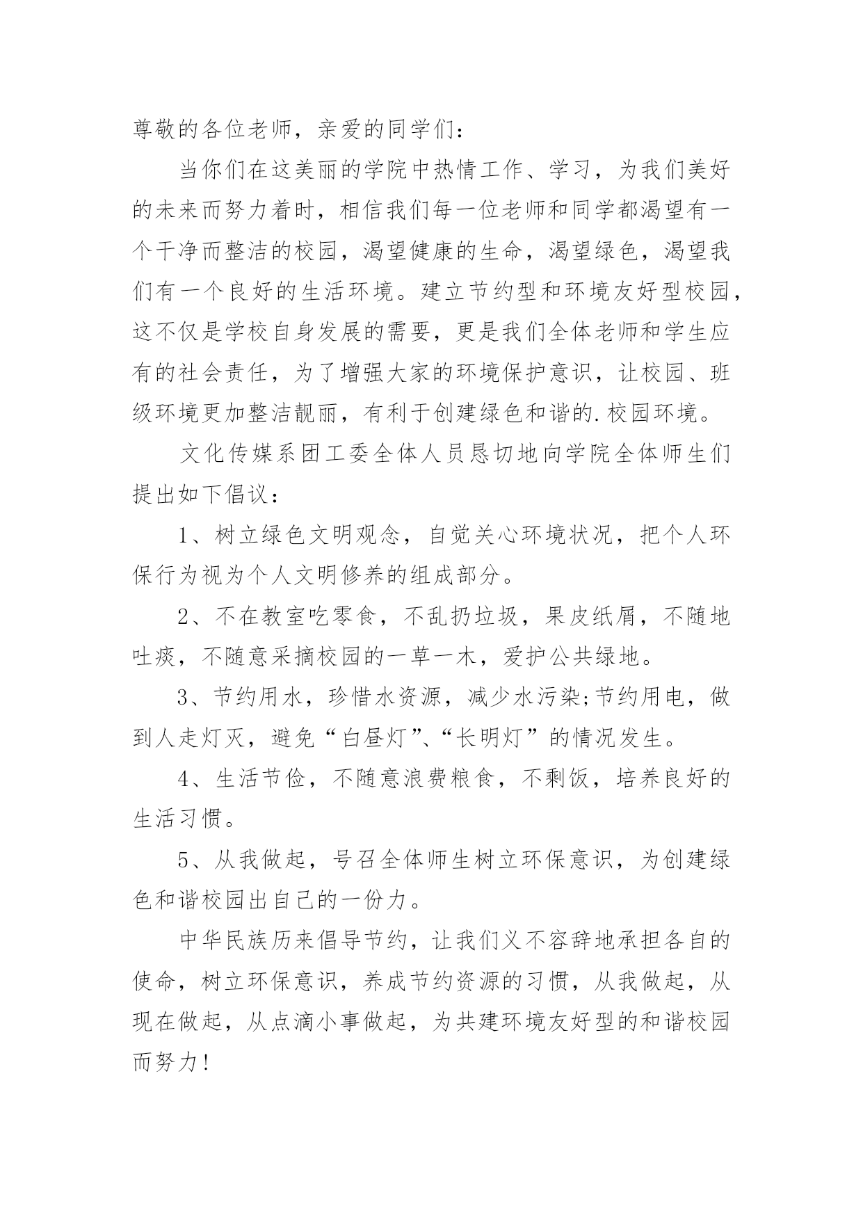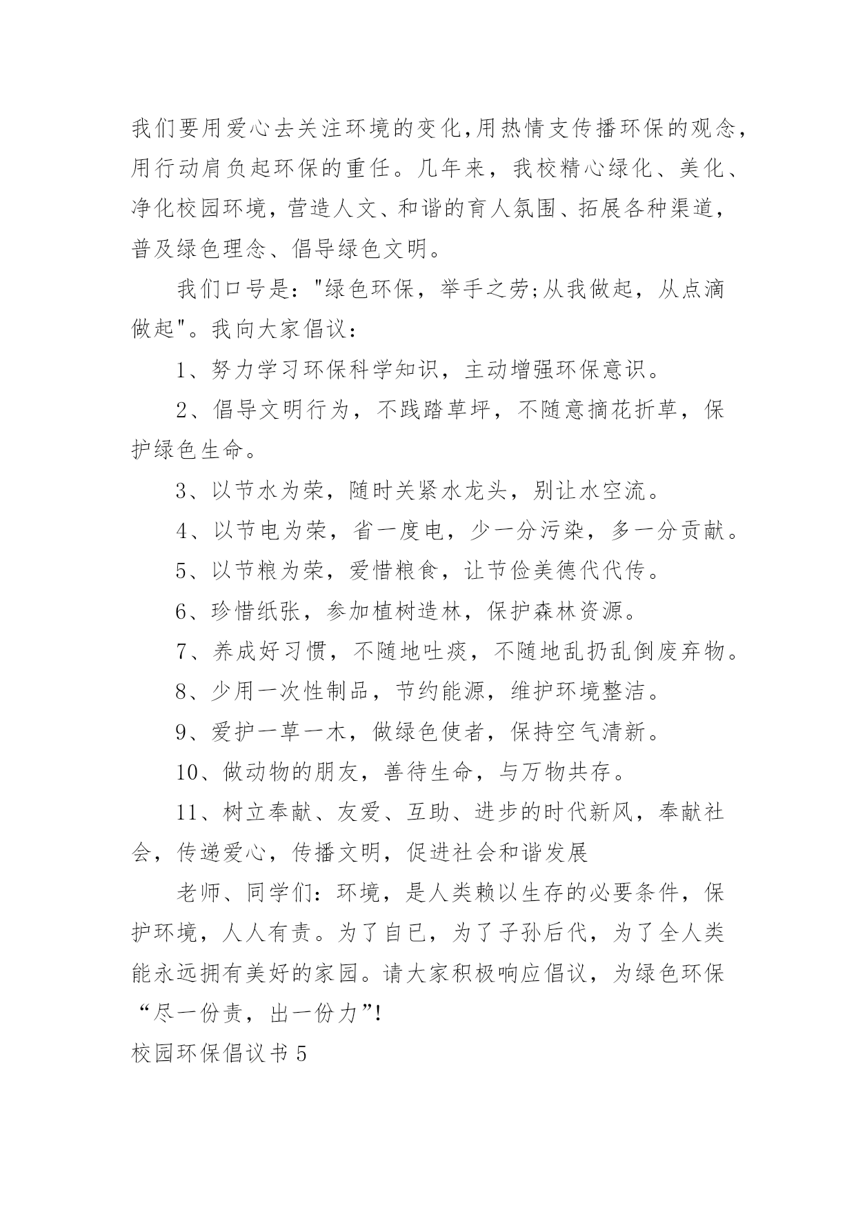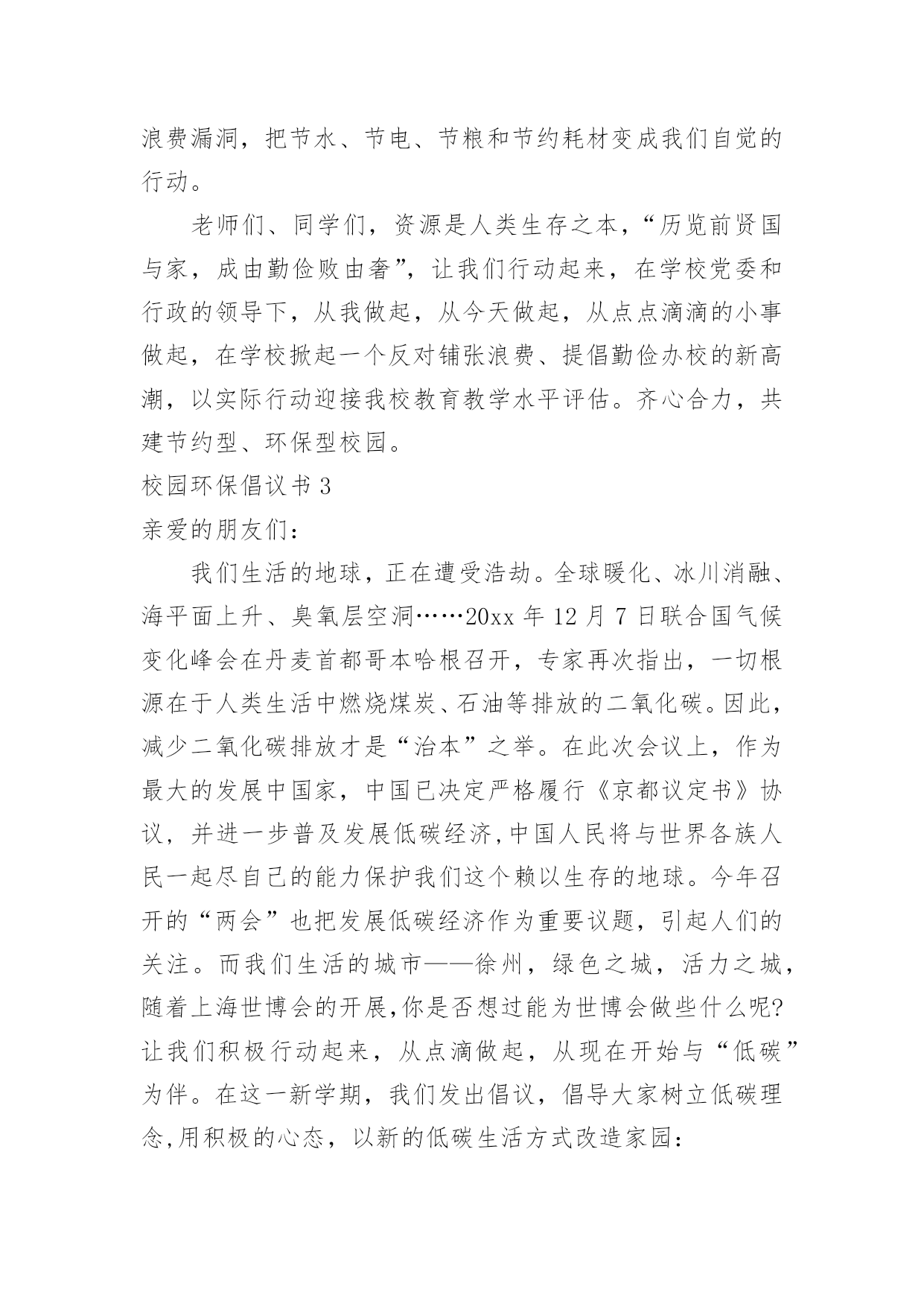 校园环保倡议书校园环保倡议书现如今,倡议书的使用频率越来越高,倡议书本身不具有很强的约束力,有关人员可以表示响应,也可以不表示响应。来参考自己需要的倡议书吧!下面是小编为大家收集的校园环保倡议书,供大家参考借鉴,希望可以帮助到有需要的朋友。校园环保倡议书1亲爱的老师、同学们:当你流连于风光秀美的校园中,当你沉醉于桂香袭人的学院路,当你漫步于芳草遍地的校园春景,当你徜徉于气象宏伟的象牙塔中的时候,你为自己是一个华农人而感到自豪吗?我们生活在华农,我们生活在天堂,环境优美,空气清新。然而,我们也发现不少地方在遭受着各种污染,环境日益恶劣。跨出校园,有害气体还在一些厂区弥漫;身边实景,废水、污物使南湖严重污损,白色垃圾还在蔓延┄┄所有这一些,直接影响着人类的生存。环境,是赖以生存的必要条件,保护环境就是保护我们自己。青年是环境保护与可持续发展的重要力量,构建和谐社会需要大学生积极主动的广泛参与。我们——来自全国五湖四海的社会主义新人才——大学生,作为积极承担社会责任的青年学子,在20xx年世界环境日到来之际,绿色协会向全国各地大学生及各种环境组织发出以下倡议:让我们努力做到“三不”、“三少”和“三个一”:不往河道倾倒污物,不用含磷洗衣粉,不乱扔废弃电池。少用一只塑料袋,少用餐巾纸,少用一次性木筷。向家人做一次环保宣传,参加一次环保行动,为环境出一份力。联合国环境规划署(UNEP)发布20xx年“世界环境日”主题是“冰川消融——一个热点话题”,英文原文主题:“MELTINGICE—AHOTTOPIC?”。为落实党中央和国务院确定的“xx”主要污染物减排目标,完成今年的减排任务和配合20xx年环保重点工作,我国确定20xx年世界环境日中国主题为“污染减排和环境友好型社会”。保护家园,就是保护自己;热爱家园,就是热爱生命。让我们携起手来,从我做起,从身边的小事做起:以节水为荣――随时关紧水龙头,别让水空流。以节电为荣――省一度电,少一分污染,多一分贡献。以节粮为荣――爱惜粮食,让节俭美德代代传。珍惜纸张――参加植树造林,保护森林资源。养成好习惯――不随地吐痰,不随地乱扔乱倒废弃物。少用一次性制品――节约能源,维护环境整洁。爱护一草一木――做绿色使者,保持空气清新。做动物的朋友――善待生命,与万物共存。树立奉献、友爱、互助、进步的时代新风――奉献社会,传递爱心,传播文明,构建和谐社会。参与环保活动对我们认识社会,确定人生目标,挖掘自身潜力,承担公民责任具有很好的促进作用,对我们选择、走好人生的道路是很重要的一步,与国与家与个人成长都发挥着积极的作用。环境保护,学子有责,我们郑重承诺:以自己的积极参与,融入社会的环保行为;以自己努力学习和实践,让环保成为大众的行为习惯;以自己捍卫环境的行动,让环保成为每一个公民的责任和义务。地球只有一个,她的生命是脆弱的`,不能因为我们为着眼前的发展和获得微小利益,以肆虐的行为,无“度”的获取,使本以脆弱的躯体更加脆弱的获取!让我们以主人翁的姿态投入到环保的行动中去,让天更蓝,让水更清,让地更绿,让我们的家园更加美丽!同学们,快行动起来吧!让生命之水长流,让生命之绿永驻,让文明之花永不凋谢!此致敬礼!xxx年月日校园环保倡议书2老师们、同学们:勤俭节约是中华民族的传统美德,环境保护是我们的生存之本,节俭办学是学校发展的内在动力。居安思危、戒奢以俭、环境保护、节约资源,利在当即、功在千秋。我们向全校师生发出如下倡议:一、节约每一滴水1、养成良好的.用水习惯,自觉做到爱水惜水节水。做到人走水断,严防跑冒滴漏;2、控制出水量,避免“长流水”;3、发现水龙头滴水主动拧紧,发现供水设施损坏及时报修。二、节约每一度电1、充分利用自然光照,尽可能关闭照明电源或减少照明源数量,杜绝长明灯,做到人走灯灭;2、减少空调等大功率电器的使用时间,合理控制电器使用功率;3、办公设备、实验设备使用完毕后及时切断电源,减少待机消耗;4、办公室、实验室、学生公寓不使用违章电器,不使用不相关电器,离开房间及时关闭所有电器电源。三、节约每一粒米爱惜粮食,杜绝浪费,节约每一粒米,节约每一盘菜,减少剩饭剩菜。四、节约每一项耗材1、充分利用现代办公手段,开展电子办公,减少纸张使用量,提倡双面用纸;2、减少一次性签字笔、纸杯等日常用品使用量;五、互相监督,共建节约型、环保型校园,作到勤俭节约人人有责,人人负责,关注每一项节约环节,堵塞每一处浪费漏洞,把节水、节电、节粮和节约耗材变成我们自觉的行动。老师们、同学们,资源是人类生存之本,“历览前贤国与家,成由勤俭败由奢”,让我们行动起来,在学校党委和行政的领导下,从我做起,从今天做起,从点点滴滴的小事做起,在学校掀起一个反对铺张浪费、提倡勤俭办校的新高潮,以实际行动迎接我校教育教学水平评估。齐心合力,共