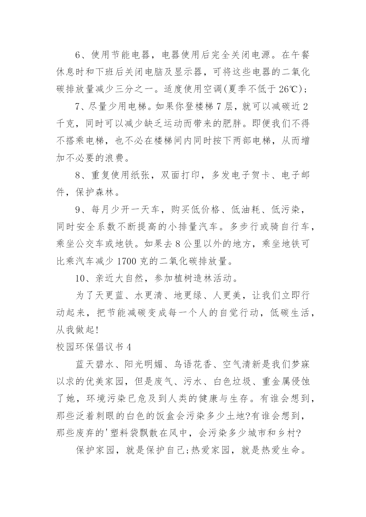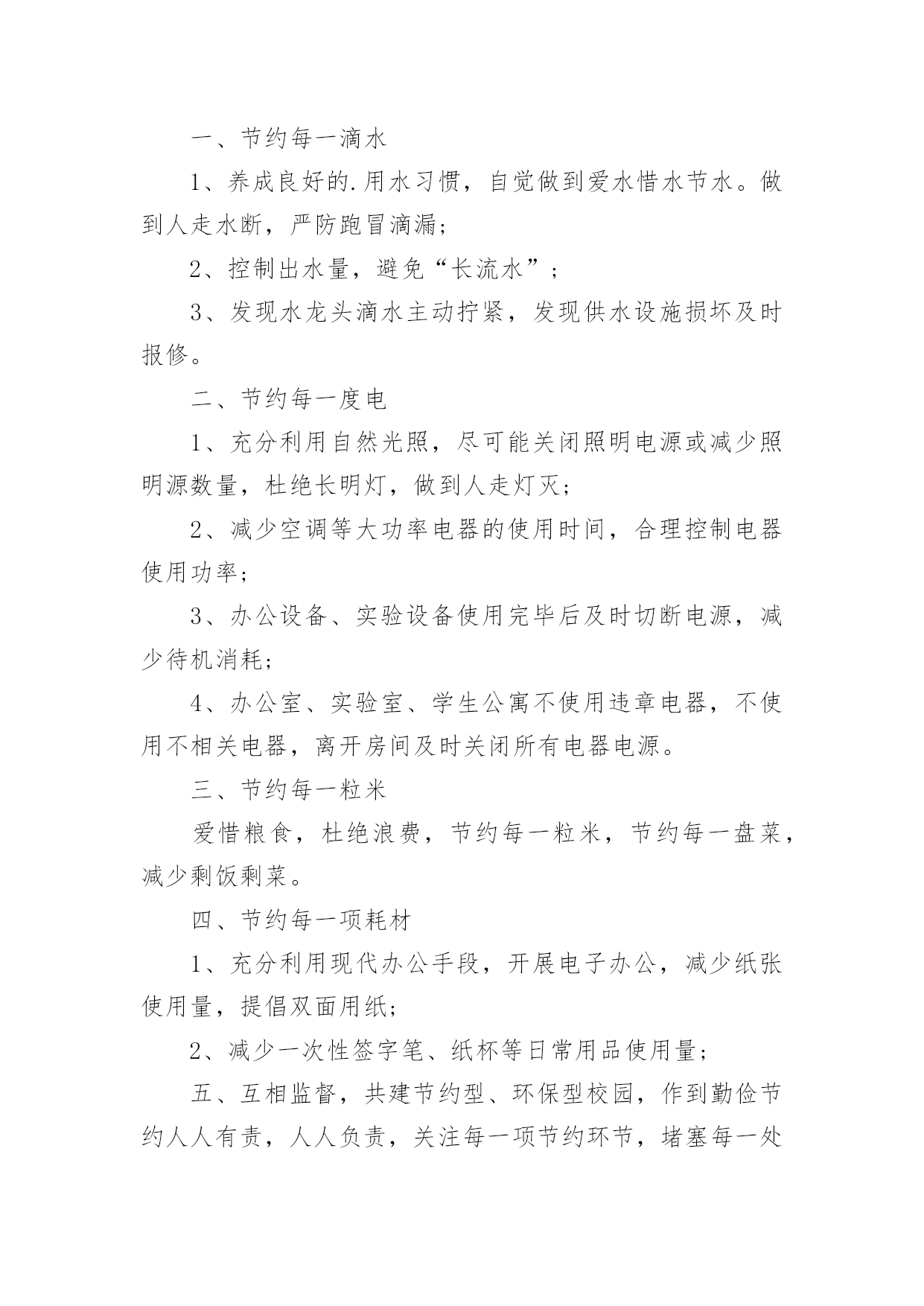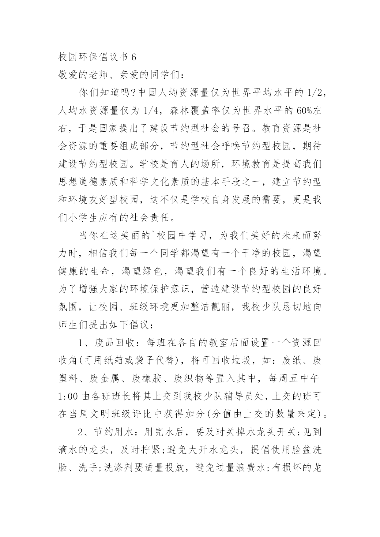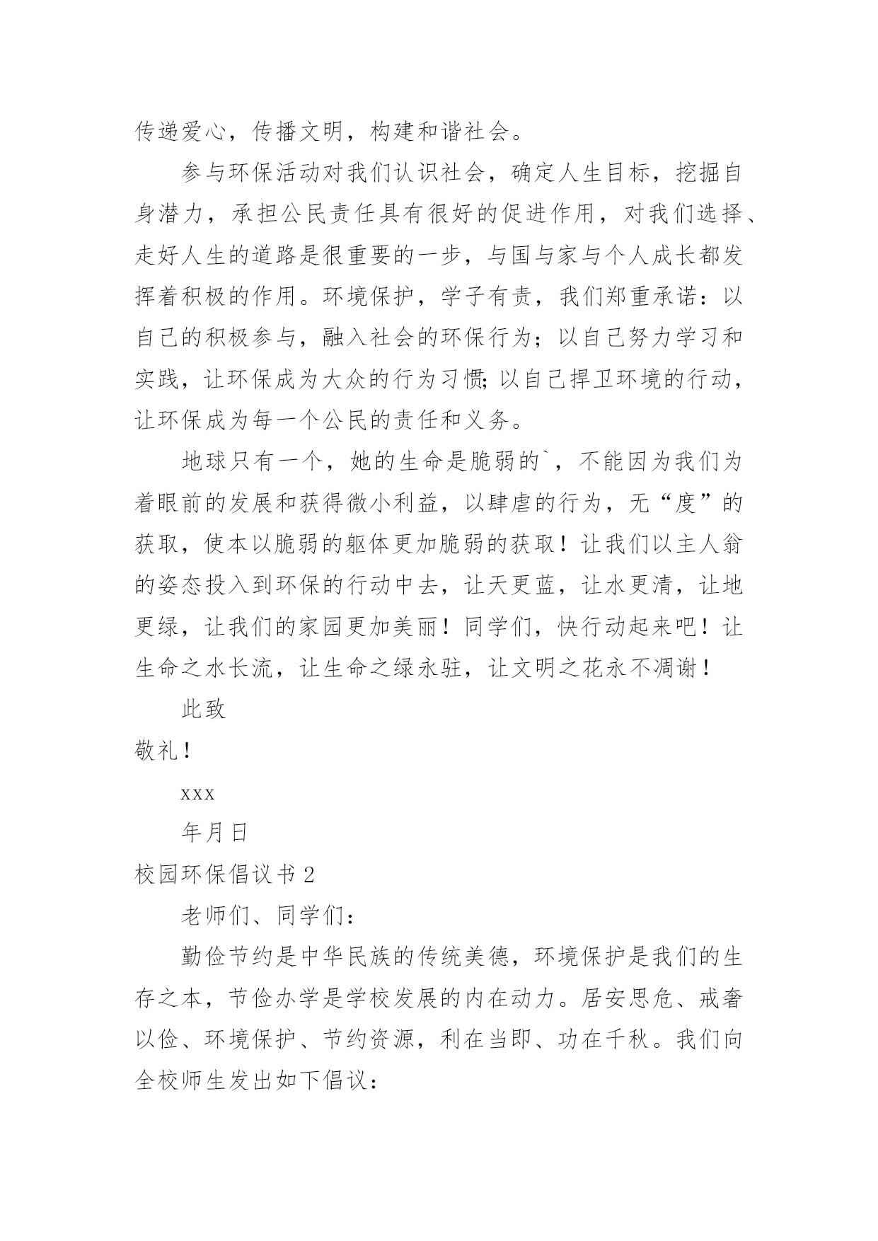校园环保倡议书校园环保倡议书现如今,倡议书的使用频率越来越高,倡议书本身不具有很强的约束力,有关人员可以表示响应,也可以不表示响应。来参考自己需要的倡议书吧!下面是小编为大家收集的校园环保倡议书,供大家参考借鉴,希望可以帮助到有需要的朋友。校园环保倡议书1亲爱的老师、同学们:当你流连于风光秀美的校园中,当你沉醉于桂香袭人的学院路,当你漫步于芳草遍地的校园春景,当你徜徉于气象宏伟的象牙塔中的时候,你为自己是一个华农人而感到自豪吗?我们生活在华农,我们生活在天堂,环境优美,空气清新。然而,我们也发现不少地方在遭受着各种污染,环境日益恶劣。跨出校园,有害气体还在一些厂区弥漫;身边实景,废水、污物使南湖严重污损,白色垃圾还在蔓延┄┄所有这一些,直接影响着人类的生存。环境,是赖以生存的必要条件,保护环境就是保护我们自己。青年是环境保护与可持续发展的重要力量,构建和谐社会需要大学生积极主动的广泛参与。我们——来自全国五湖四海的社会主义新人才——大学生,作为积极承担社会责任的青年学子,在20xx年世界环境日到来之际,绿色协会向全国各地大学生及各种环境组织发出以下倡议:让我们努力做到“三不”、“三少”和“三个一”:不往河道倾倒污物,不用含磷洗衣粉,不乱扔废弃电池。少用一只塑料袋,少用餐巾纸,少用一次性木筷。向家人做一次环保宣传,参加一次环保行动,为环境出一份力。联合国环境规划署(UNEP)发布20xx年“世界环境日”主题是“冰川消融——一个热点话题”,英文原文主题:“MELTINGICE—AHOTTOPIC?”。为落实党中央和国务院确定的“xx”主要污染物减排目标,完成今年的减排任务和配合20xx年环保重点工作,我国确定20xx年世界环境日中国主题为“污染减排和环境友好型社会”。保护家园,就是保护自己;热爱家园,就是热爱生命。让我们携起手来,从我做起,从身边的小事做起:以节水为荣――随时关紧水龙头,别让水空流。以节电为荣――省一度电,少一分污染,多一分贡献。以节粮为荣――爱惜粮食,让节俭美德代代传。珍惜纸张――参加植树造林,保护森林资源。养成好习惯――不随地吐痰,不随地乱扔乱倒废弃物。少用一次性制品――节约能源,维护环境整洁。爱护一草一木――做绿色使者,保持空气清新。做动物的朋友――善待生命,与万物共存。树立奉献、友爱、互助、进步的时代新风――奉献社会,传递爱心,传播文明,构建和谐社会。参与环保活动对我们认识社会,确定人生目标,挖掘自身潜力,承担公民责任具有很好的促进作用,对我们选择、走好人生的道路是很重要的一步,与国与家与个人成长都发挥着积极的作用。环境保护,学子有责,我们郑重承诺:以自己的积极参与,融入社会的环保行为;以自己努力学习和实践,让环保成为大众的行为习惯;以自己捍卫环境的行动,让环保成为每一个公民的责任和义务。地球只有一个,她的生命是脆弱的`,不能因为我们为着眼前的发展和获得微小利益,以肆虐的行为,无“度”的获取,使本以脆弱的躯体更加脆弱的获取!让我们以主人翁的姿态投入到环保的行动中去,让天更蓝,让水更清,让地更绿,让我们的家园更加美丽!同学们,快行动起来吧!让生命之水长流,让生命之绿永驻,让文明之花永不凋谢!此致敬礼!xxx年月日校园环保倡议书2老师们、同学们:勤俭节约是中华民族的传统美德,环境保护是我们的生存之本,节俭办学是学校发展的内在动力。居安思危、戒奢以俭、环境保护、节约资源,利在当即、功在千秋。我们向全校师生发出如下倡议:一、节约每一滴水1、养成良好的.用水习惯,自觉做到爱水惜水节水。做到人走水断,严防跑冒滴漏;2、控制出水量,避免“长流水”;3、发现水龙头滴水主动拧紧,发现供水设施损坏及时报修。二、节约每一度电1、充分利用自然光照,尽可能关闭照明电源或减少照明源数量,杜绝长明灯,做到人走灯灭;2、减少空调等大功率电器的使用时间,合理控制电器使用功率;3、办公设备、实验设备使用完毕后及时切断电源,减少待机消耗;4、办公室、实验室、学生公寓不使用违章电器,不使用不相关电器,离开房间及时关闭所有电器电源。三、节约每一粒米爱惜粮食,杜绝浪费,节约每一粒米,节约每一盘菜,减少剩饭剩菜。四、节约每一项耗材1、充分利用现代办公手段,开展电子办公,减少纸张使用量,提倡双面用纸;2、减少一次性签字笔、纸杯等日常用品使用量;五、互相监督,共建节约型、环保型校园,作到勤俭节约人人有责,人人负责,关注每一项节约环节,堵塞每一处浪费漏洞,把节水、节电、节粮和节约耗材变成我们自觉的行动。老师们、同学们,资源是人类生存之本,“历览前贤国与家,成由勤俭败由奢”,让我们行动起来,在学校党委和行政的领导下,从我做起,从今天做起,从点点滴滴的小事做起,在学校掀起一个反对铺张浪费、提倡勤俭办校的新高潮,以实际行动迎接我校教育教学水平评估。齐心合力,共