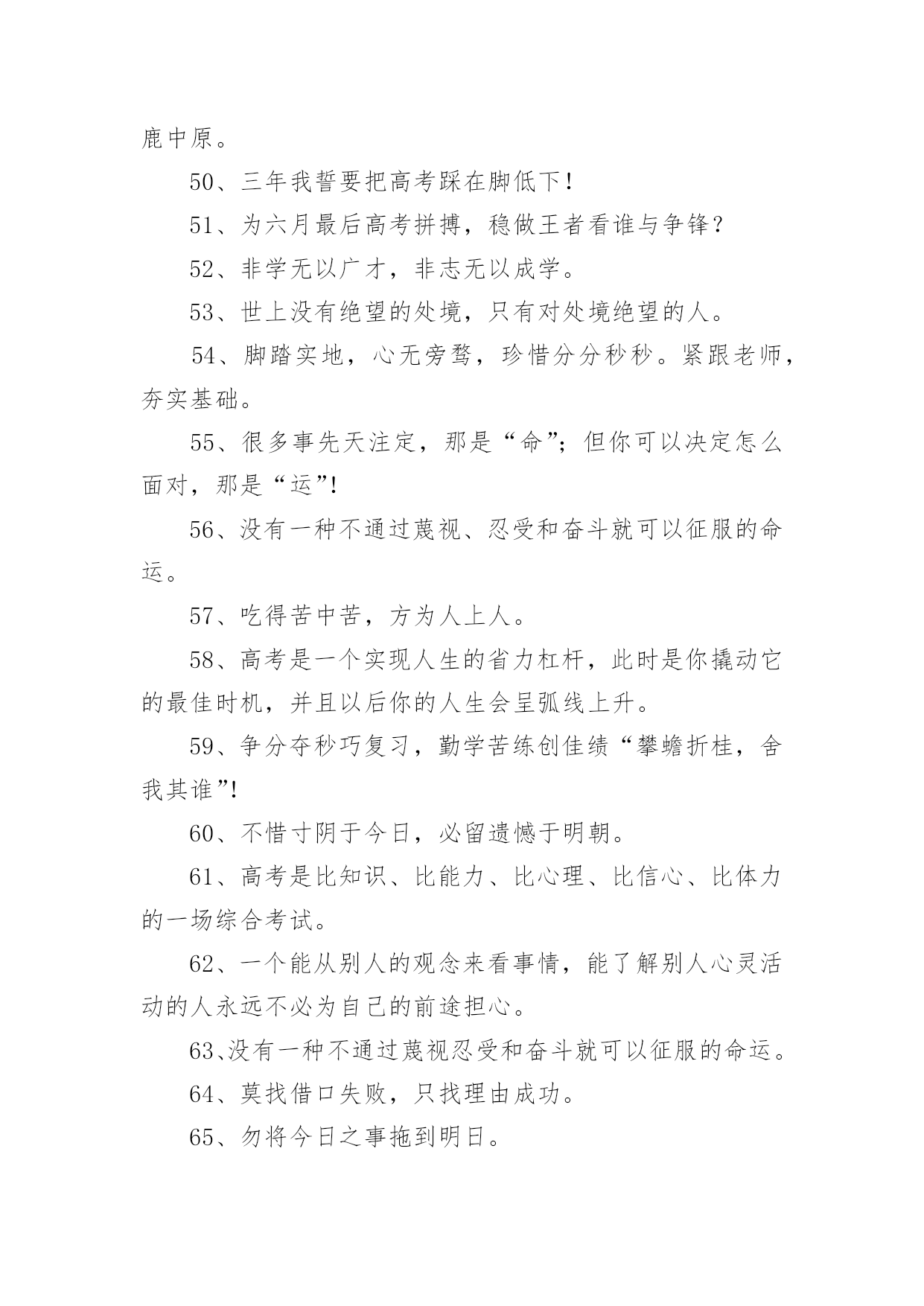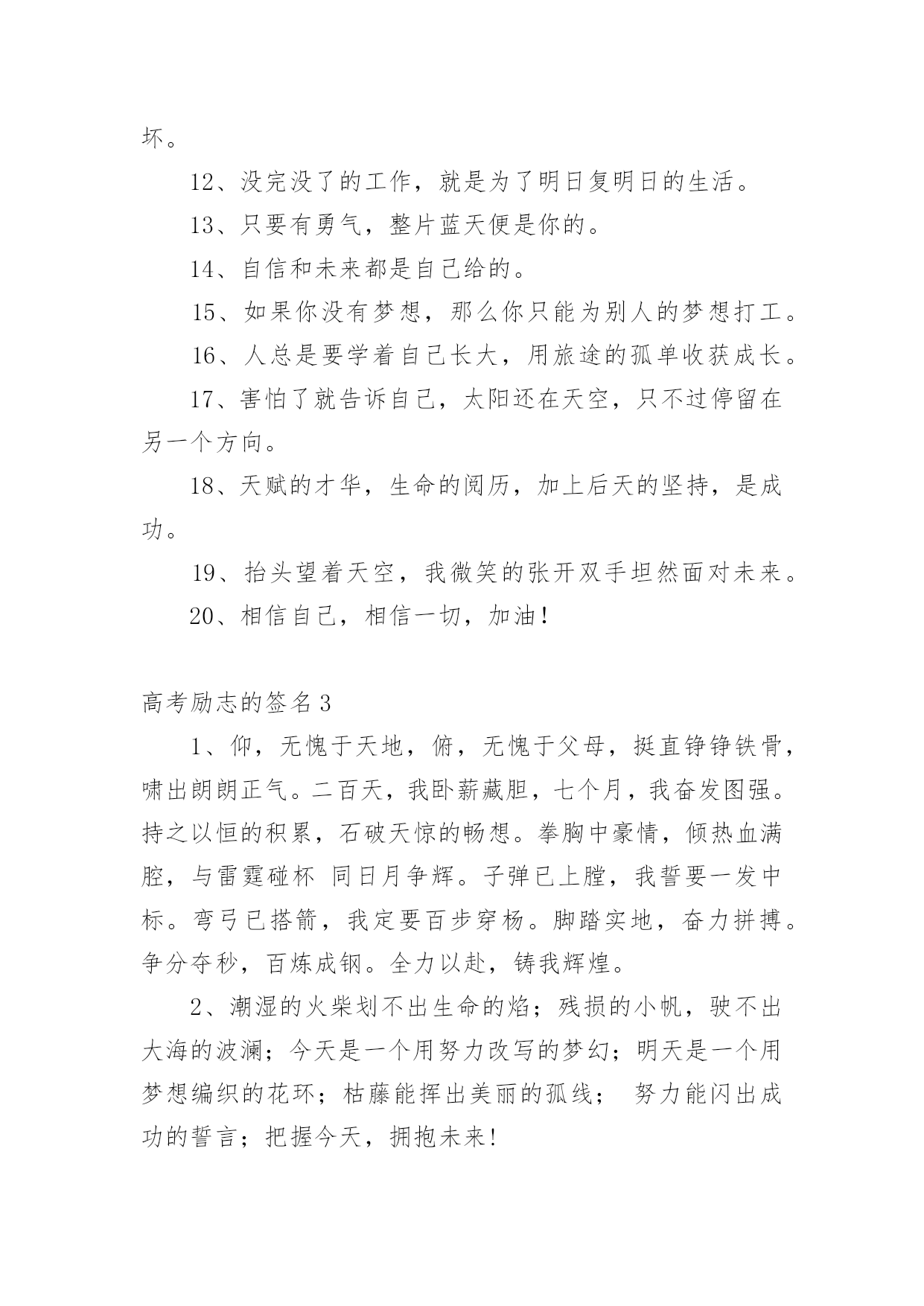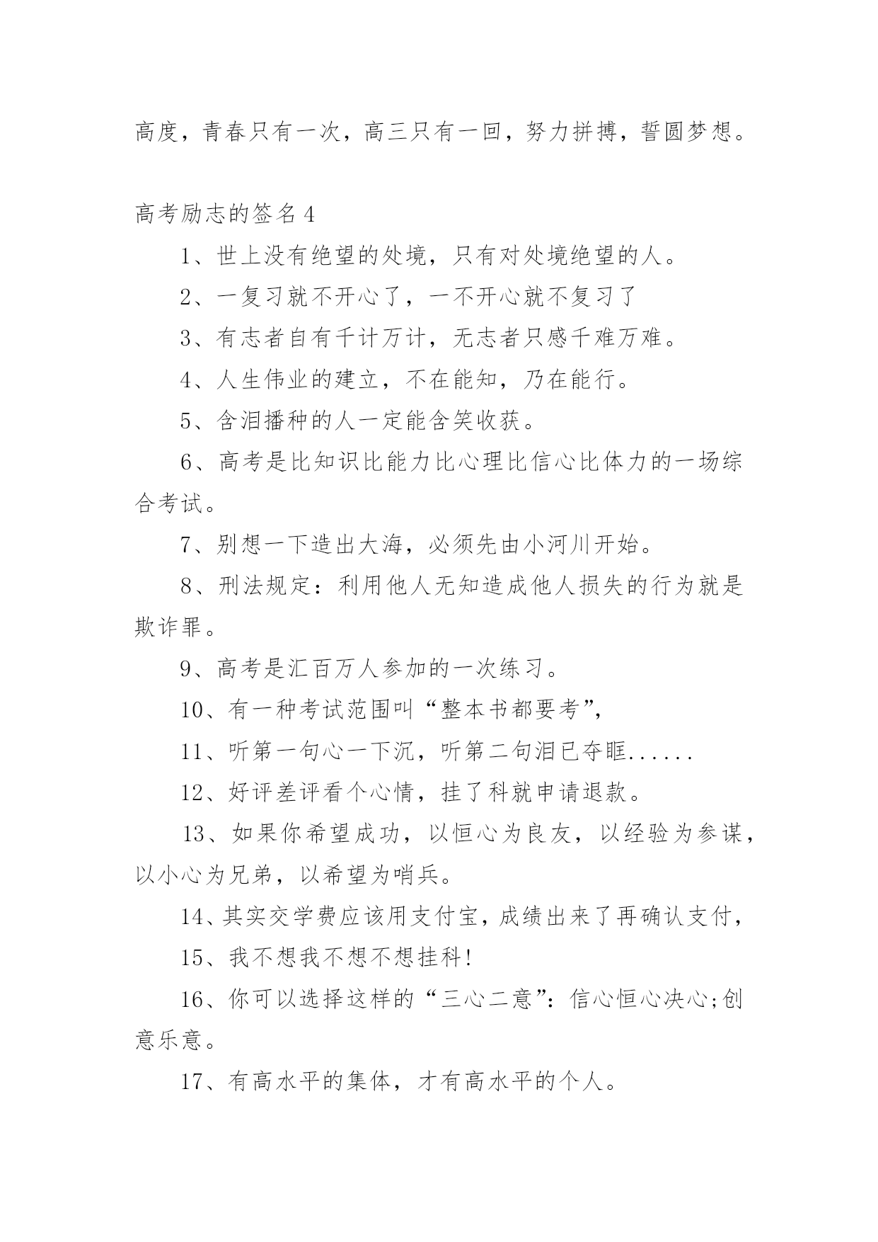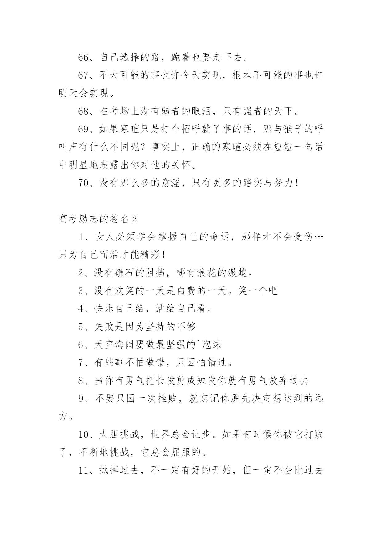 高考励志的签名高考励志的签名11、天下断无易处之境遇;人间哪有空闲的光阴。2、困难挑战机会助我成功,时间效率健康帮俺成材。3、人格的完善是本,财富的确立是末。4、若有恒何必三更眠五更起;最无益莫过一日曝十日寒。5、我自信,我拼搏,我出色,我成功。6、未曾失败的人恐怕也未曾成功过。7、此刻打盹,你将做梦;而此刻学习,你将圆梦!8、抢时间,抓基础,勤演练定有收获;树自信,誓拼搏,升大学回报父母。9、最难的题,对你而言,并不一定在于最后一道。10、月考分数高低何足挂齿,平时名次浮动纯属正常。11、每道错题做三遍。第一遍:讲评时;第二遍:一周后;第三遍:考试前。12、学习并不是人生的全部。但既然连人生的一部分——学习也无法征服,还能做什么?13、只要路是对的,就不怕路远。14、笑到最后的人才是笑的最好的人。15、仰望天空时,什么都比你高,你会自卑;俯视大地时,什么都比你低,你会自负;只有放宽视野,把天空和大地尽收眼底,才能在苍穹泛土之间找到你真正的。16、今天多一份拼搏明天多几份欢笑。17、拼两个春夏秋冬,博高考无怨无悔。18、挑战人生是我无悔的选择,决胜高考是我不懈的追求!19、不要轻言放弃否则对不起自己。20、与其羡慕别人,不如加快自己的脚步。21、昨天是张过期的支票,明天是张信用卡,只有今天才是现金,要善加利用。22、有志者自有千方百计,无志者只感千难万难。23、勤学,勤思,勤问,苦钻。24、祝愿你以平静的心态迎接高考:对待难题——我难人难我不畏难;对待易题——我易人易我不大意!25、六十同窗同甘共苦拼搏从此时;十二春秋风雨兼程成败在今年。26、同闯峥嵘十春秋,共创辉煌佳年华!27、拼十年寒窗挑灯苦读不畏难;携双亲期盼背水勇战定夺魁。28、眉毛上的汗水和眉毛下的泪水你必须选择一样!29、模拟的成绩一定不要成为包袱,成为阴影。30、行者常至,为者常成。31、读书改变命运,刻苦成就事业,态度决定一切。32、拧成一股绳,搏尽一份力,狠下一条心,共圆一个梦。33、进更理想大学,铸更辉煌人生。34、在考场上没有弱者的.眼泪只有强者的天下。35、积极的人在每一次忧患中都看到一个机会,而消极的人则在每个机会都看到某种忧患。36、一腔热血备高考,满腹经纶方成功。37、遇难心不慌,遇易心更细。38、不要回避哪怕是一个简单得不好意思的问题,其实它对你很重要,其实它对别人也是一个了不起的难题。39、谁也不能随随便便地成功,它来自彻底的自我管理和毅力。40、理想是力量的泉源、智慧的摇篮、冲锋的战旗、斩棘的利剑。41、百尺高梧,撑得起一轮月色;数椽矮屋,锁不住五夜书声。42、快马加鞭,君为先,自古英雄出少年。43、奋起飞翔,路在脚下。44、争分夺秒巧复习,勤学苦练创佳绩。45、最重要的就是不要去看远方模糊的,而要做手边清楚的事。46、再长的路,一步步也能走完,再短的路,不迈开双脚也无法到达。、再冷的石头,坐上三年也会暖。47、没有天生的信心,只有不断培养的信心。48、人生若没有一段想起来就热泪盈眶的奋斗史,那这一生就算白活了。49、点点心血勤育英才厚泽九州;滴滴汗水勇赴学海逐鹿中原。50、三年我誓要把高考踩在脚低下!51、为六月最后高考拼搏,稳做王者看谁与争锋?52、非学无以广才,非志无以成学。53、世上没有绝望的处境,只有对处境绝望的人。54、脚踏实地,心无旁骛,珍惜分分秒秒。紧跟老师,夯实基础。55、很多事先天注定,那是“命”;但你可以决定怎么面对,那是“运”!56、没有一种不通过蔑视、忍受和奋斗就可以征服的命运。57、吃得苦中苦,方为人上人。58、高考是一个实现人生的省力杠杆,此时是你撬动它的最佳时机,并且以后你的人生会呈弧线上升。59、争分夺秒巧复习,勤学苦练创佳绩“攀蟾折桂,舍我其谁”!60、不惜寸阴于今日,必留遗憾于明朝。61、高考是比知识、比能力、比心理、比信心、比体力的一场综合考试。62、一个能从别人的观念来看事情,能了解别人心灵活动的人永远不必为自己的前途担心。63、没有一种不通过蔑视忍受和奋斗就可以征服的命运。64、莫找借口失败,只找理由成功。65、勿将今日之事拖到明日。66、自己选择的路,跪着也要走下去。67、不大可能的事也许今天实现,根本不可能的事也许明天会实现。68、在考场上没有弱者的眼泪,只有强者的天下。69、如果寒暄只是打个招呼就了事的话,那与猴子的呼叫声有什么不同呢?事实上,正确的寒暄必须在短短一句话中明显地表露出你对他的关怀。70、没有那么多的意淫,只有更多的踏实与努力!高考励志的签名21、女人必须学会掌握自己的命运,那样才不会受伤…只为自己而活才能精彩!2、没有礁石的阻挡,哪有浪花的激越。3、没有欢笑的一天是白费的一天。笑一个吧4、快乐自己给,活给自己看。5、失败是因为坚持的不够6、天空海阔要做最坚强的`泡沫7、有