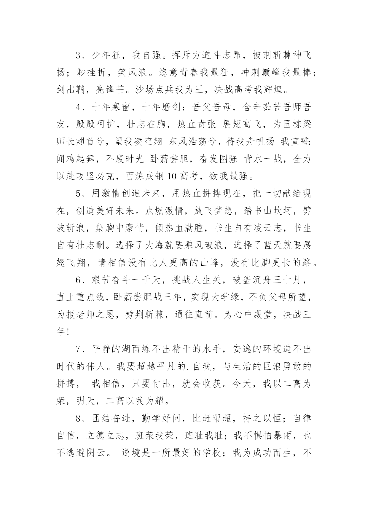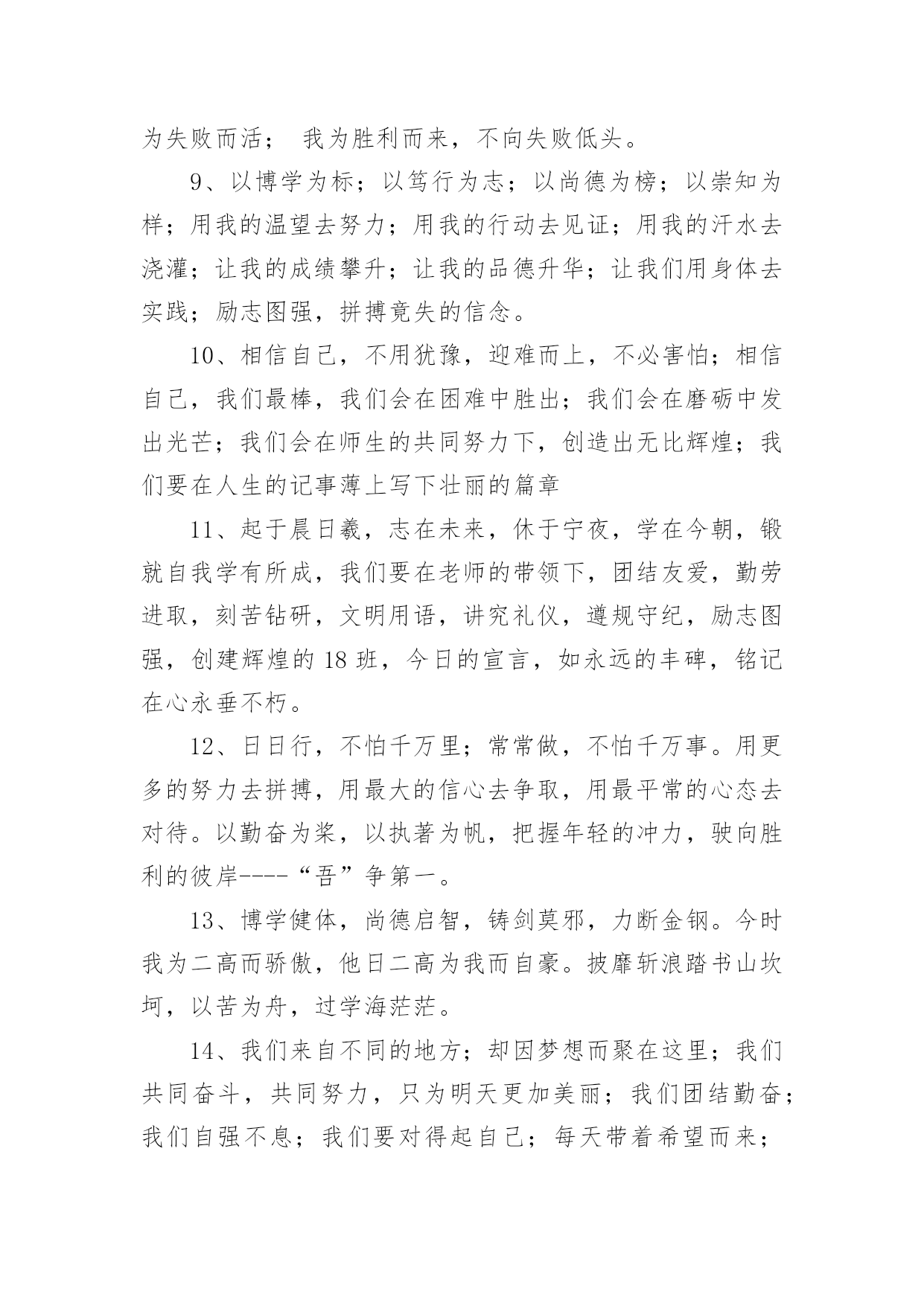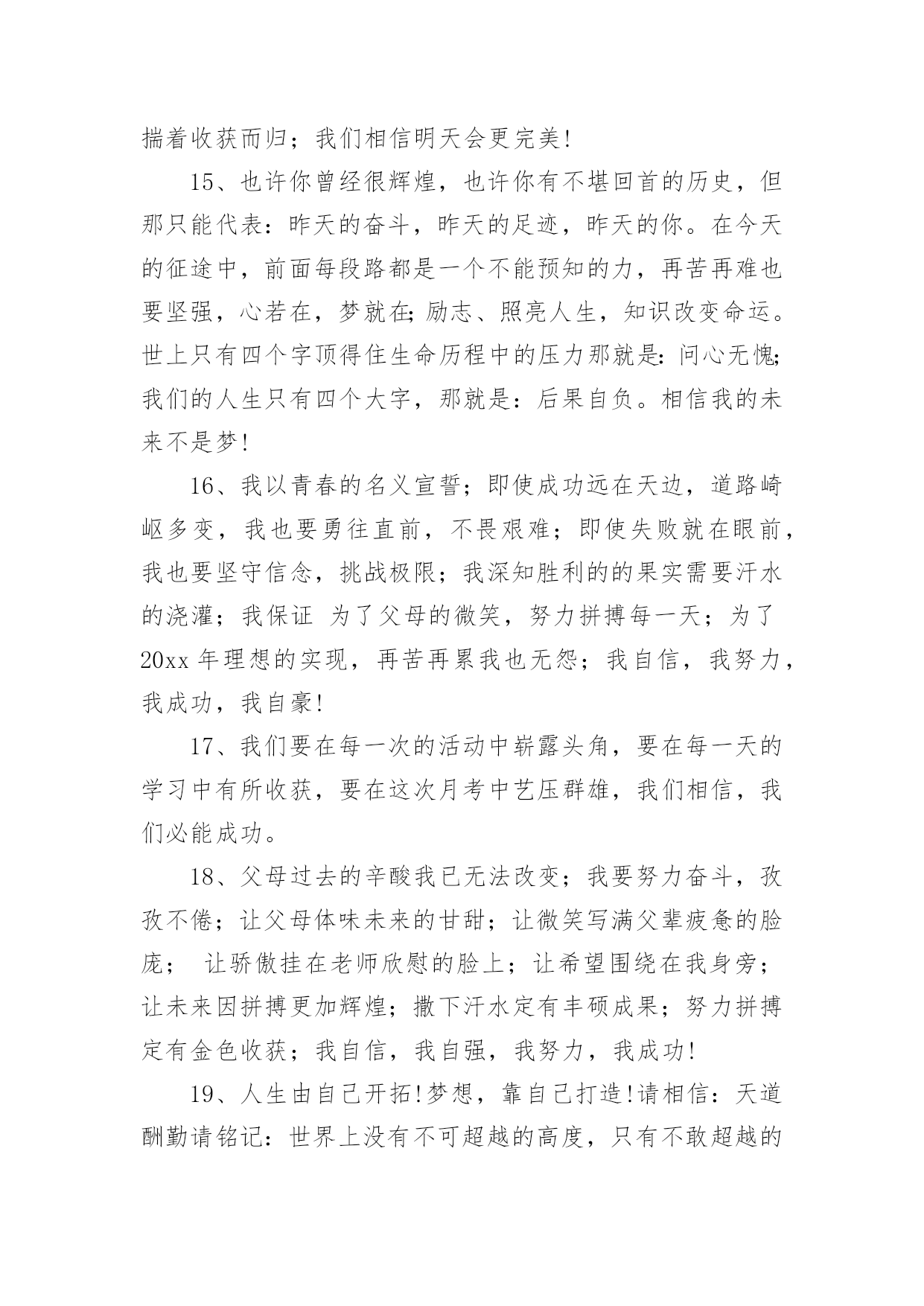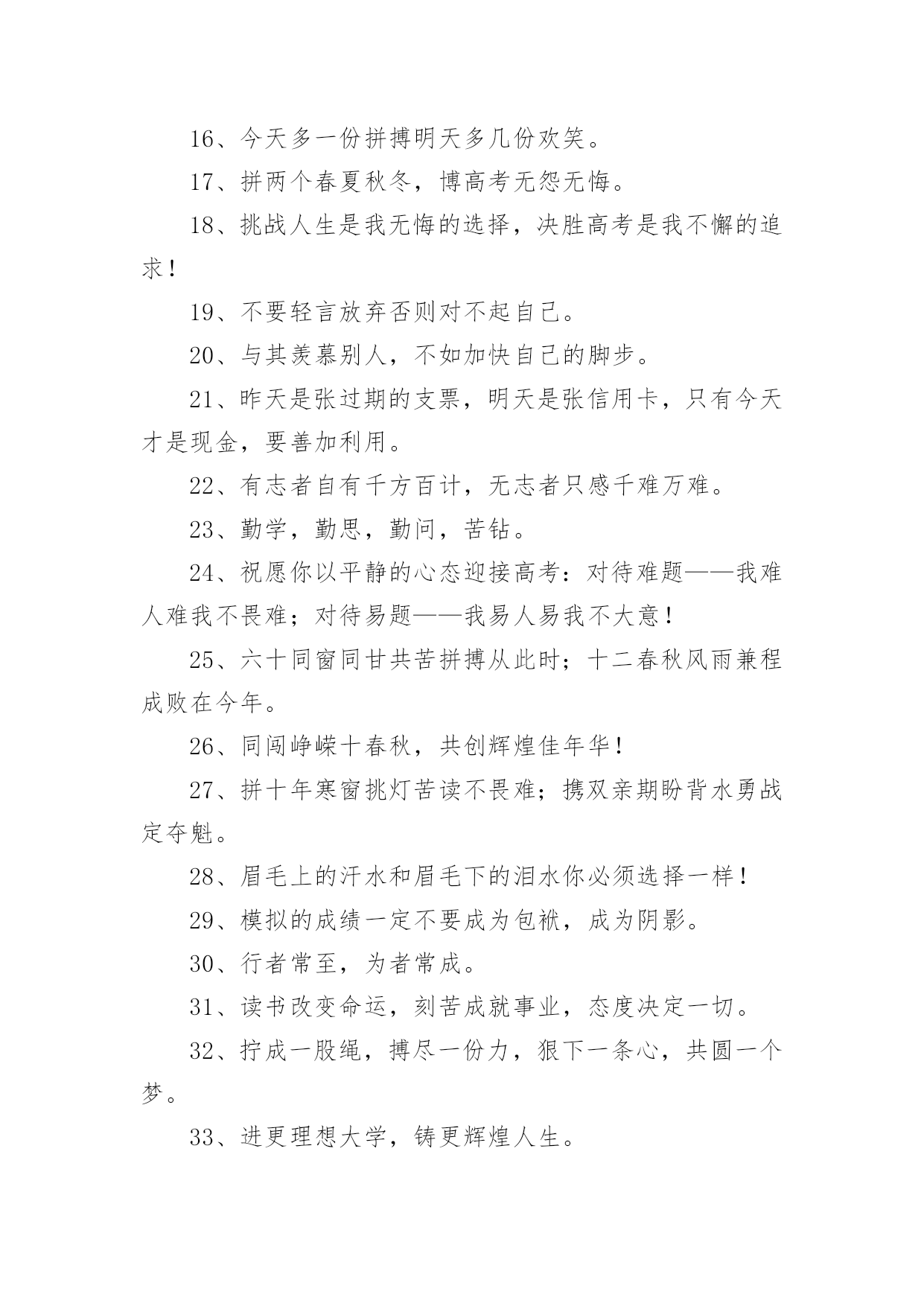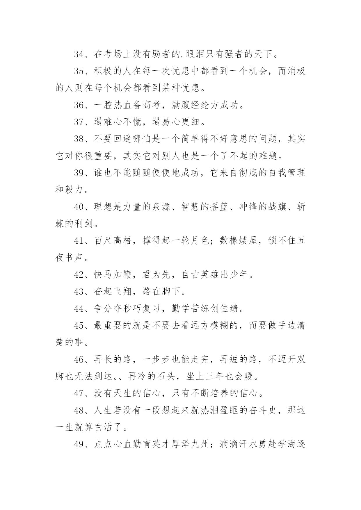 高考励志的签名高考励志的签名11、天下断无易处之境遇;人间哪有空闲的光阴。2、困难挑战机会助我成功,时间效率健康帮俺成材。3、人格的完善是本,财富的确立是末。4、若有恒何必三更眠五更起;最无益莫过一日曝十日寒。5、我自信,我拼搏,我出色,我成功。6、未曾失败的人恐怕也未曾成功过。7、此刻打盹,你将做梦;而此刻学习,你将圆梦!8、抢时间,抓基础,勤演练定有收获;树自信,誓拼搏,升大学回报父母。9、最难的题,对你而言,并不一定在于最后一道。10、月考分数高低何足挂齿,平时名次浮动纯属正常。11、每道错题做三遍。第一遍:讲评时;第二遍:一周后;第三遍:考试前。12、学习并不是人生的全部。但既然连人生的一部分——学习也无法征服,还能做什么?13、只要路是对的,就不怕路远。14、笑到最后的人才是笑的最好的人。15、仰望天空时,什么都比你高,你会自卑;俯视大地时,什么都比你低,你会自负;只有放宽视野,把天空和大地尽收眼底,才能在苍穹泛土之间找到你真正的。16、今天多一份拼搏明天多几份欢笑。17、拼两个春夏秋冬,博高考无怨无悔。18、挑战人生是我无悔的选择,决胜高考是我不懈的追求!19、不要轻言放弃否则对不起自己。20、与其羡慕别人,不如加快自己的脚步。21、昨天是张过期的支票,明天是张信用卡,只有今天才是现金,要善加利用。22、有志者自有千方百计,无志者只感千难万难。23、勤学,勤思,勤问,苦钻。24、祝愿你以平静的心态迎接高考:对待难题——我难人难我不畏难;对待易题——我易人易我不大意!25、六十同窗同甘共苦拼搏从此时;十二春秋风雨兼程成败在今年。26、同闯峥嵘十春秋,共创辉煌佳年华!27、拼十年寒窗挑灯苦读不畏难;携双亲期盼背水勇战定夺魁。28、眉毛上的汗水和眉毛下的泪水你必须选择一样!29、模拟的成绩一定不要成为包袱,成为阴影。30、行者常至,为者常成。31、读书改变命运,刻苦成就事业,态度决定一切。32、拧成一股绳,搏尽一份力,狠下一条心,共圆一个梦。33、进更理想大学,铸更辉煌人生。34、在考场上没有弱者的.眼泪只有强者的天下。35、积极的人在每一次忧患中都看到一个机会,而消极的人则在每个机会都看到某种忧患。36、一腔热血备高考,满腹经纶方成功。37、遇难心不慌,遇易心更细。38、不要回避哪怕是一个简单得不好意思的问题,其实它对你很重要,其实它对别人也是一个了不起的难题。39、谁也不能随随便便地成功,它来自彻底的自我管理和毅力。40、理想是力量的泉源、智慧的摇篮、冲锋的战旗、斩棘的利剑。41、百尺高梧,撑得起一轮月色;数椽矮屋,锁不住五夜书声。42、快马加鞭,君为先,自古英雄出少年。43、奋起飞翔,路在脚下。44、争分夺秒巧复习,勤学苦练创佳绩。45、最重要的就是不要去看远方模糊的,而要做手边清楚的事。46、再长的路,一步步也能走完,再短的路,不迈开双脚也无法到达。、再冷的石头,坐上三年也会暖。47、没有天生的信心,只有不断培养的信心。48、人生若没有一段想起来就热泪盈眶的奋斗史,那这一生就算白活了。49、点点心血勤育英才厚泽九州;滴滴汗水勇赴学海逐鹿中原。50、三年我誓要把高考踩在脚低下!51、为六月最后高考拼搏,稳做王者看谁与争锋?52、非学无以广才,非志无以成学。53、世上没有绝望的处境,只有对处境绝望的人。54、脚踏实地,心无旁骛,珍惜分分秒秒。紧跟老师,夯实基础。55、很多事先天注定,那是“命”;但你可以决定怎么面对,那是“运”!56、没有一种不通过蔑视、忍受和奋斗就可以征服的命运。57、吃得苦中苦,方为人上人。58、高考是一个实现人生的省力杠杆,此时是你撬动它的最佳时机,并且以后你的人生会呈弧线上升。59、争分夺秒巧复习,勤学苦练创佳绩“攀蟾折桂,舍我其谁”!60、不惜寸阴于今日,必留遗憾于明朝。61、高考是比知识、比能力、比心理、比信心、比体力的一场综合考试。62、一个能从别人的观念来看事情,能了解别人心灵活动的人永远不必为自己的前途担心。63、没有一种不通过蔑视忍受和奋斗就可以征服的命运。64、莫找借口失败,只找理由成功。65、勿将今日之事拖到明日。66、自己选择的路,跪着也要走下去。67、不大可能的事也许今天实现,根本不可能的事也许明天会实现。68、在考场上没有弱者的眼泪,只有强者的天下。69、如果寒暄只是打个招呼就了事的话,那与猴子的呼叫声有什么不同呢?事实上,正确的寒暄必须在短短一句话中明显地表露出你对他的关怀。70、没有那么多的意淫,只有更多的踏实与努力!高考励志的签名21、女人必须学会掌握自己的命运,那样才不会受伤…只为自己而活才能精彩!2、没有礁石的阻挡,哪有浪花的激越。3、没有欢笑的一天是白费的一天。笑一个吧4、快乐自己给,活给自己看。5、失败是因为坚持的不够6、天空海阔要做最坚强的`泡沫7、有