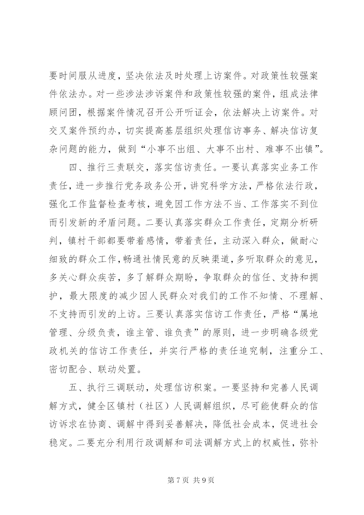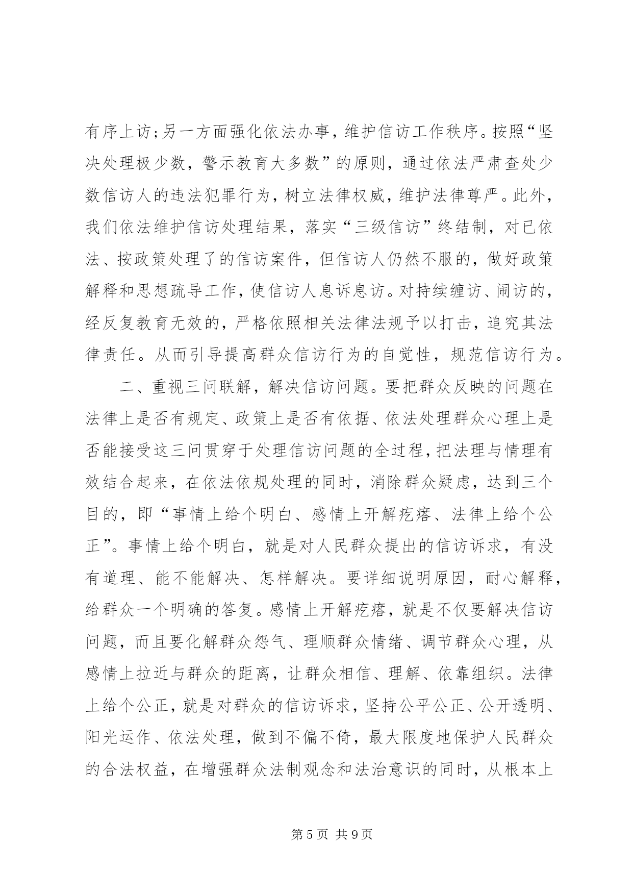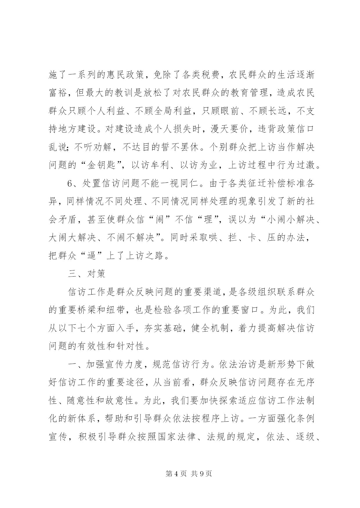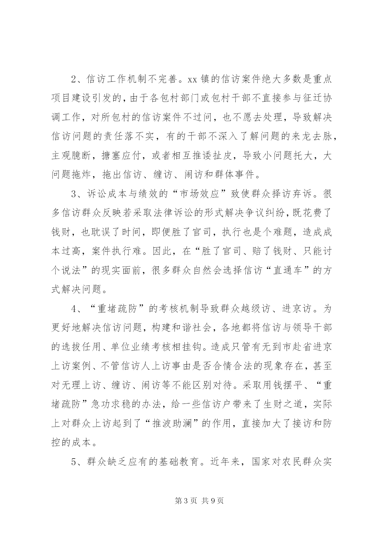 第PAGE\*Arabic\*MERGEFORMAT9页共NUMPAGES\*MERGEFORMAT9页对做好交通信访工作的思考做好信访工作的思考xx镇地处城乡结合部,当前正处在各项重点建设的机遇期、经济社会转型跨越发展的关键期、各类社会复杂矛盾叠加显现期,信访工作面临前所未有的严峻挑战,呈现出署名信访逐渐增多、“三访”(越级访、重复访、无理访)增多、集体访增多、重信访轻法律、上访老户居多等特点,成为全市挂号的信访大镇,信访堰塞湖严重影响项目建设和农村经济发展。如何做好当前的信访工作,努力化解社会矛盾,切实维护社会稳定,是xx当前必须破解的一个重大而紧迫的课题。一、现状1、项目建设引发的问题。2000年以来,330变电站、x铁路复线、x铁路复线、x大道东沿工程、x镍项目园、x汽柴油、xx城东大桥、xx中心港等一批市区重点项目在xx实施,因土地征用、拆迁安置等问题引发了大量矛盾纠纷,征地拆迁补偿标准低,拆迁安置点基础设施配套建设不到位,施工爆破强震,群众房屋受损要求补偿,征地村出嫁女和在校大学生要求参加征地款集体分配,因没有明确政策规定,导致分配方案因村组而异,引发群众上访。这些问题随着时间的推移,越来越复杂,解决起来非常棘手。2、各类突发事件引发的的问题。xx村李xx、xx村汪xx非正常死亡、xx村交通事故、xx中学学生被杀等突发事件引发了群体上访。2000年xx镇引进xx客商骆xx新建汉滨区南方工业品批发市场,由于管理不到位,后来发生了客商卷走商户店铺租赁金外逃事件,造成农户租赁费、赊借的建筑材料费和拖欠工人工资及店铺租赁金累计300多万元无法兑付,问题解决十分棘手,致使群众长期上访。3、村务不够公开引发的信访问题。部分村组财务不规范,存在包包账、捆捆账、片片账、陈年累月不记账的问题,缺乏有效监督与制约,引起群众强烈不满,低保指标、“7.18”水灾恢复建房等惠农政策落实,少数干部优亲厚友,暗箱操作,引发了大量矛盾问题。4、换届选举引发的问题。少数村因地方宗派问题严重,换届选举中和落选后拉帮结派,相互制肘,制造矛盾,如xx、xx、xx、xx等村的群体上访问题。二、原因1、基层组织执政能力薄弱。对项目建设和新农村发展的重要意义认识不到位,支持力度不够,造成与发展的新形势新任务新要求有一定差距。干部工作方式方法简单粗暴、工作不细致、责任心不强,导致农村群众对基层干部失去信心,加之离XX县区较近,自然不愿向镇村组织表达自身诉求。一有矛盾就选择越级上访,只要有人牵头煽动就会造成集体越级访。2、信访工作机制不完善。xx镇的信访案件绝大多数是重点项目建设引发的,由于各包村部门或包村干部不直接参与征迁协调工作,对所包村的信访案件不过问,也不愿去处理,导致解决信访问题的责任落不实,有的干部不深入了解问题的来龙去脉,主观臆断,搪塞应付,或者相互推诿扯皮,导致小问题托大,大问题拖炸,拖出信访、缠访、闹访和群体事件。3、诉讼成本与绩效的“市场效应”致使群众择访弃诉。很多信访群众反映若采取法律诉讼的形式解决争议纠纷,既花费了钱财,也耽误了时间,即便胜了官司,执行也是个难题,造成成本过高,案件执行难。因此,在“胜了官司、赔了钱财、只能讨个说法”的现实面前,很多群众自然会选择信访“直通车”的方式解决问题。4、“重堵疏防”的考核机制导致群众越级访、进京访。为更好地解决信访问题,构建和谐社会,各地都将信访与领导干部的选拔任用、单位业绩考核相挂钩。造成只管有无到市赴省进京上访案例、不管信访人上访事由是否合情合法的现象存在,甚至对无理上访、缠访、闹访等不能区别对待。采取用钱摆平、“重堵疏防”急功求稳的办法,给一些信访户带来了生财之道,实际上对群众上访起到了“推波助澜”的作用,直接加大了接访和防控的成本。5、群众缺乏应有的基础教育。近年来,国家对农民群众实施了一系列的惠民政策,免除了各类税费,农民群众的生活逐渐富裕,但最大的教训是放松了对农民群众的教育管理,造成农民群众只顾个人利益、不顾全局利益,只顾眼前、不顾长远,不支持地方建设。对建设造成个人损失时,漫天要价,违背政策信口乱说;不听劝解,不达目的誓不罢休。个别群众把上访当作解决问题的“金钥匙”,以访牟利、以访为业,上访过程中行为过激。6、处置信访问题不能一视同仁。由于各类征迁补偿标准各异,同样情况不同处理、不同情况同样处理的现象引发了新的社会矛盾,甚至使群众信“闹”不信“理”,误以为“小闹小解决、大闹大解决、不闹不解决”。同时采取哄、拦、卡、压的办法,把群众“逼”上了上访之路。三、对策信访工作是群众反映问题的重要渠道,是各级组织联系群众的重要桥梁和纽带,也是检验各项工作的重要窗口。为此,我们从以下七个方面入手,夯实基础,健全机制,着力提高解决信访问题的有效性和针对性。一、加强宣传力度,
