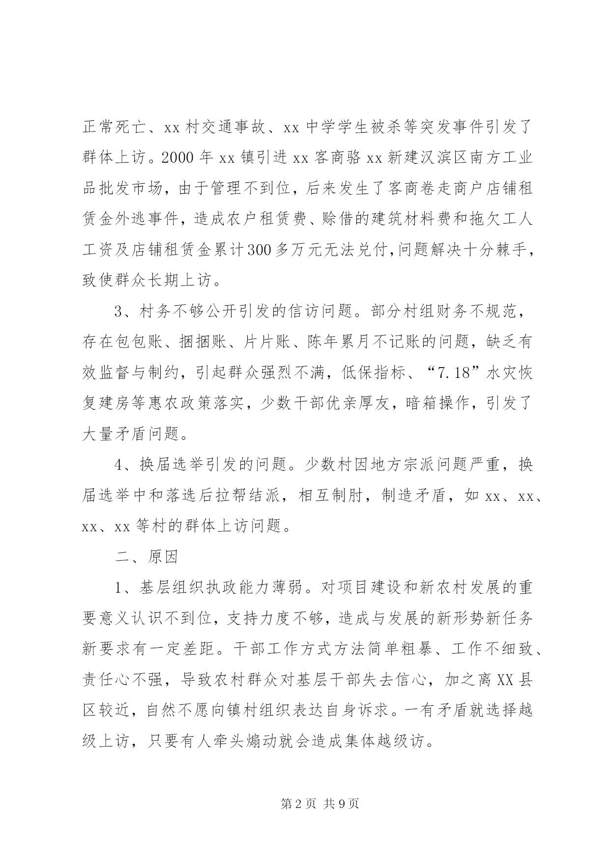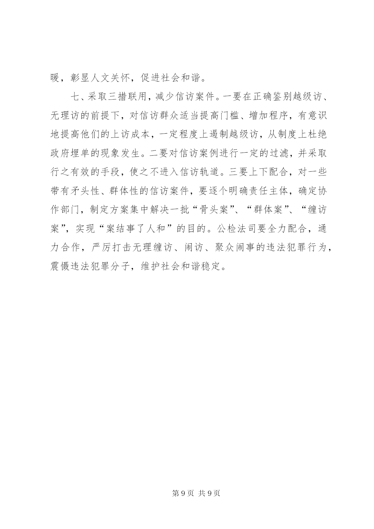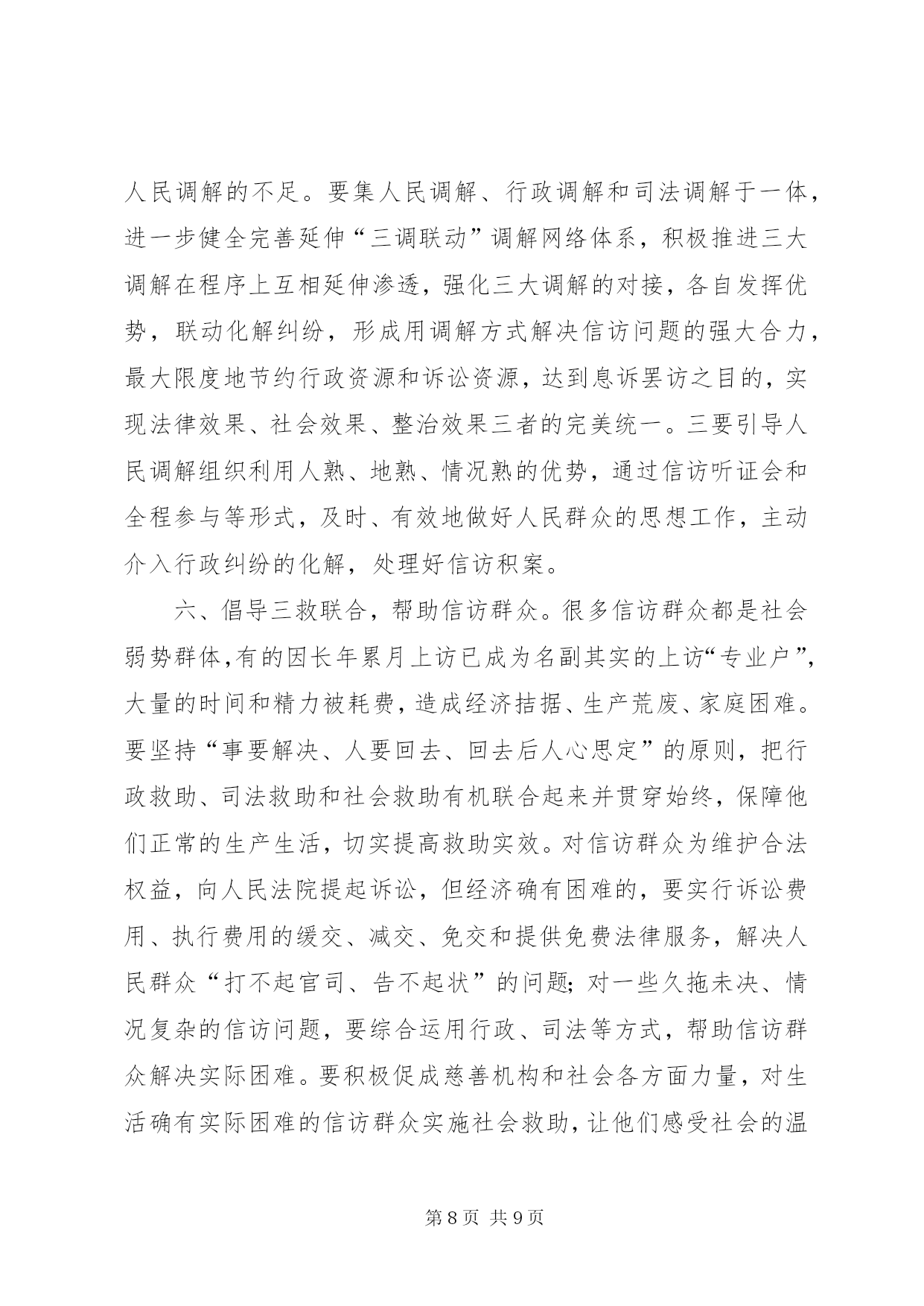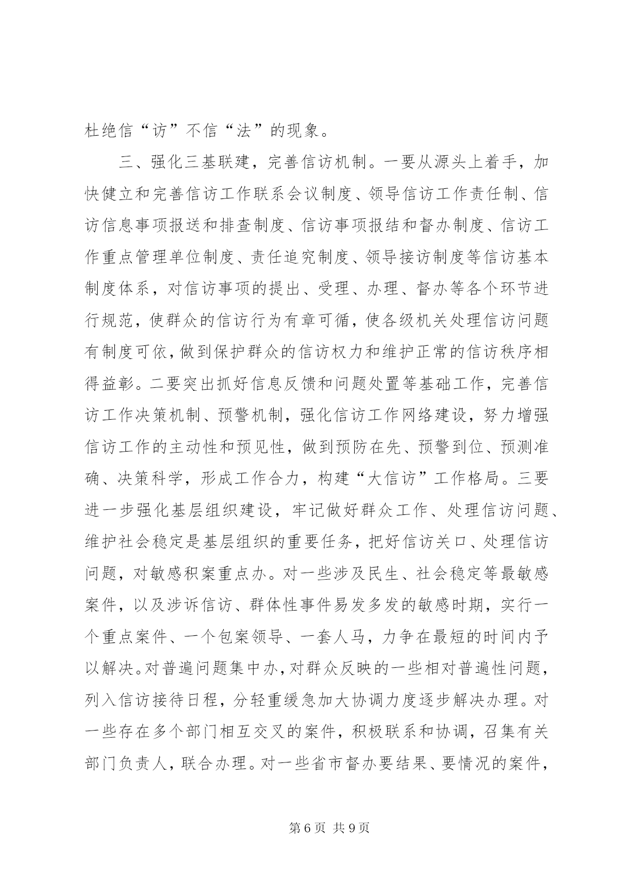第PAGE\*Arabic\*MERGEFORMAT9页共NUMPAGES\*MERGEFORMAT9页对做好交通信访工作的思考做好信访工作的思考xx镇地处城乡结合部,当前正处在各项重点建设的机遇期、经济社会转型跨越发展的关键期、各类社会复杂矛盾叠加显现期,信访工作面临前所未有的严峻挑战,呈现出署名信访逐渐增多、“三访”(越级访、重复访、无理访)增多、集体访增多、重信访轻法律、上访老户居多等特点,成为全市挂号的信访大镇,信访堰塞湖严重影响项目建设和农村经济发展。如何做好当前的信访工作,努力化解社会矛盾,切实维护社会稳定,是xx当前必须破解的一个重大而紧迫的课题。一、现状1、项目建设引发的问题。2000年以来,330变电站、x铁路复线、x铁路复线、x大道东沿工程、x镍项目园、x汽柴油、xx城东大桥、xx中心港等一批市区重点项目在xx实施,因土地征用、拆迁安置等问题引发了大量矛盾纠纷,征地拆迁补偿标准低,拆迁安置点基础设施配套建设不到位,施工爆破强震,群众房屋受损要求补偿,征地村出嫁女和在校大学生要求参加征地款集体分配,因没有明确政策规定,导致分配方案因村组而异,引发群众上访。这些问题随着时间的推移,越来越复杂,解决起来非常棘手。2、各类突发事件引发的的问题。xx村李xx、xx村汪xx非正常死亡、xx村交通事故、xx中学学生被杀等突发事件引发了群体上访。2000年xx镇引进xx客商骆xx新建汉滨区南方工业品批发市场,由于管理不到位,后来发生了客商卷走商户店铺租赁金外逃事件,造成农户租赁费、赊借的建筑材料费和拖欠工人工资及店铺租赁金累计300多万元无法兑付,问题解决十分棘手,致使群众长期上访。3、村务不够公开引发的信访问题。部分村组财务不规范,存在包包账、捆捆账、片片账、陈年累月不记账的问题,缺乏有效监督与制约,引起群众强烈不满,低保指标、“7.18”水灾恢复建房等惠农政策落实,少数干部优亲厚友,暗箱操作,引发了大量矛盾问题。4、换届选举引发的问题。少数村因地方宗派问题严重,换届选举中和落选后拉帮结派,相互制肘,制造矛盾,如xx、xx、xx、xx等村的群体上访问题。二、原因1、基层组织执政能力薄弱。对项目建设和新农村发展的重要意义认识不到位,支持力度不够,造成与发展的新形势新任务新要求有一定差距。干部工作方式方法简单粗暴、工作不细致、责任心不强,导致农村群众对基层干部失去信心,加之离XX县区较近,自然不愿向镇村组织表达自身诉求。一有矛盾就选择越级上访,只要有人牵头煽动就会造成集体越级访。2、信访工作机制不完善。xx镇的信访案件绝大多数是重点项目建设引发的,由于各包村部门或包村干部不直接参与征迁协调工作,对所包村的信访案件不过问,也不愿去处理,导致解决信访问题的责任落不实,有的干部不深入了解问题的来龙去脉,主观臆断,搪塞应付,或者相互推诿扯皮,导致小问题托大,大问题拖炸,拖出信访、缠访、闹访和群体事件。3、诉讼成本与绩效的“市场效应”致使群众择访弃诉。很多信访群众反映若采取法律诉讼的形式解决争议纠纷,既花费了钱财,也耽误了时间,即便胜了官司,执行也是个难题,造成成本过高,案件执行难。因此,在“胜了官司、赔了钱财、只能讨个说法”的现实面前,很多群众自然会选择信访“直通车”的方式解决问题。4、“重堵疏防”的考核机制导致群众越级访、进京访。为更好地解决信访问题,构建和谐社会,各地都将信访与领导干部的选拔任用、单位业绩考核相挂钩。造成只管有无到市赴省进京上访案例、不管信访人上访事由是否合情合法的现象存在,甚至对无理上访、缠访、闹访等不能区别对待。采取用钱摆平、“重堵疏防”急功求稳的办法,给一些信访户带来了生财之道,实际上对群众上访起到了“推波助澜”的作用,直接加大了接访和防控的成本。5、群众缺乏应有的基础教育。近年来,国家对农民群众实施了一系列的惠民政策,免除了各类税费,农民群众的生活逐渐富裕,但最大的教训是放松了对农民群众的教育管理,造成农民群众只顾个人利益、不顾全局利益,只顾眼前、不顾长远,不支持地方建设。对建设造成个人损失时,漫天要价,违背政策信口乱说;不听劝解,不达目的誓不罢休。个别群众把上访当作解决问题的“金钥匙”,以访牟利、以访为业,上访过程中行为过激。6、处置信访问题不能一视同仁。由于各类征迁补偿标准各异,同样情况不同处理、不同情况同样处理的现象引发了新的社会矛盾,甚至使群众信“闹”不信“理”,误以为“小闹小解决、大闹大解决、不闹不解决”。同时采取哄、拦、卡、压的办法,把群众“逼”上了上访之路。三、对策信访工作是群众反映问题的重要渠道,是各级组织联系群众的重要桥梁和纽带,也是检验各项工作的重要窗口。为此,我们从以下七个方面入手,夯实基础,健全机制,着力提高解决信访问题的有效性和针对性。一、加强宣传力度,