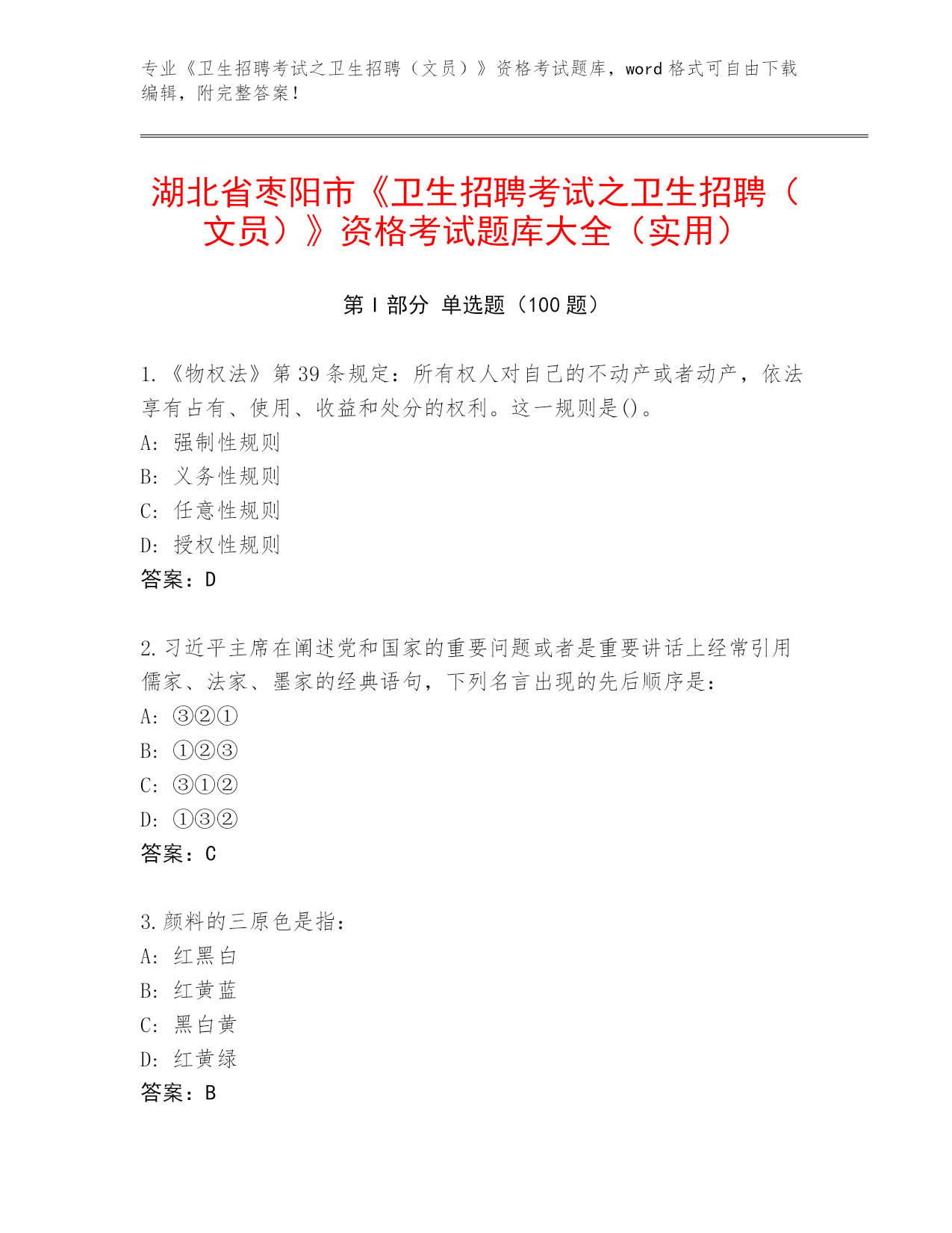 完整版湖北省枣阳市《卫生招聘考试之卫生招聘(文员)》资格考试完整题库【巩固】
