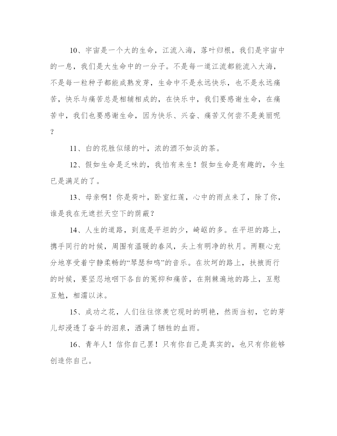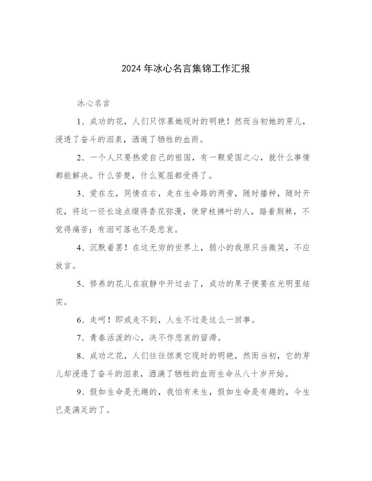 2024年冰心名言集锦工作汇报冰心名言1、成功的花,人们只惊慕她现时的明艳!然而当初她的芽儿,浸透了奋斗的泪泉,洒遍了牺牲的血雨。2、一个人只要热爱自己的祖国,有一颗爱国之心,就什么事情都能解决。什么苦楚,什么冤屈都受得了。3、爱在左,同情在右,走在生命路的两旁,随时播种,随时开花,将这一径长途点缀得香花弥漫,使穿枝拂叶的人,踏着荆棘,不觉得痛苦;有泪可落也不是悲哀。4、沉默着罢!在这无穷的世界上,弱小的我原只当微笑,不应放言。5、修养的花儿在寂静中开过去了,成功的果子便要在光明里结实。6、走呵!即或走不到,人生不过是这么一回事。7、青春活泼的心,决不作悲哀的留滞。8、成功之花,人们往往惊羡它现时的明艳,然而当初,它的芽儿却浸透了奋斗的泪泉,洒满了牺牲的血雨生命从八十岁开始。9、假如生命是无趣的,我怕有来生,假如生命是有趣的,今生已是满足的了。10、宇宙是一个大的生命,江流入海,落叶归根,我们是宇宙中的一息,我们是大生命中的一分子。不是每一道江流都能流入大海,不是每一粒种子都能成熟发芽,生命中不是永远快乐,也不是永远痛苦,快乐与痛苦总是相辅相成的,在快乐中,我们要感谢生命,在痛苦中,我们也要感谢生命,因为快乐、兴奋、痛苦又何尝不是美丽呢?11、白的花胜似绿的叶,浓的酒不如淡的茶。12、假如生命是乏味的,我怕有来生!假如生命是有趣的,今生已是满足的了。13、母亲啊!你是荷叶,卧室红莲,心中的雨点来了,除了你,谁是我在无遮拦天空下的荫蔽?14、人生的道路,到底是平坦的少,崎岖的多。在平坦的路上,携手同行的时候,周围有温暖的春风,头上有明净的秋月。两颗心充分地享受着宁静柔畅的“琴瑟和鸣”的音乐。在坎坷的路上,扶掖而行的时候,要坚忍地咽下各自的冤抑和痛苦,在荆棘遍地的路上,互慰互勉,相濡以沫。15、成功之花,人们往往惊羡它现时的明艳,然而当初,它的芽儿却浸透了奋斗的泪泉,洒满了牺牲的血雨。16、青年人!信你自己罢!只有你自己是真实的,也只有你能够创造你自己。17、娱乐至少与工作有同等的价值,或者说娱乐是工作之一部分。18、青年人呵!为着后来的回忆,小心着意的指你现在的图画。19、青年人!你不能像风般飞扬,便应当像山般静止。20、春何曾说话呢?但她那伟大潜隐的力量,已这般的温柔了世界!21、爱在左,情在右,走在生命路的两旁,随时撒种,随时开花,将这一径长途点缀得香花弥漫,使穿枝拂叶的行人,踏着荆棘,不觉痛苦;有泪可落,也不觉是悲哀。22、我自己是凡人,我只求凡人的幸福。23、有了爱就有了一切。24、世界上若没有女人,这世界至少要失去十分之五的真、十分之六的善、十分之七的美。25、春水!又是一年了还这般的微微吹动。可以再照个影儿么?春水温静的答谢我说:“我的朋友!我从来没留下一个影子不但对你是如此。冰心作品名言1、流星,飞走天空,可能有一秒时的凝望?然而这一瞥的光明,已长久遗留在人的心怀里出处:繁星春水2、命运如同海风——吹着青春的舟飘摇的曲折的渡过了时间的海。:春水3、小松树,容我伴你罢,完成了“自然”的图画。:繁星·春水4、向日葵对那些未见过白莲的人承认他们是最好的朋友白莲出水了向日葵低下头了她亭亭的傲骨分别了自己出处:繁星5、无希望的永古不失望,不希翼那不可希翼的,永古无悲哀。:往事6、读书好,好读书,读好书。:忆读书7、倘若世间没有风和雨,这枝上繁花,又归何处?只惹得人心生烦厌。:繁星·春水8、爱在左,同情在右,走在生命路的两旁,随时撒种,随时开花,将这一径长途点缀得香花弥漫,使穿枝拂叶的行人,踏着荆棘,不觉痛苦;有泪可落,也不觉是悲哀。:寄小读者9、如果你的心简单,那么这个世界也就简单。10、心是冷的泪是热的心--凝固了世界泪--温柔了世界出处:繁星春水11、爱在左,同情在右,走在生命的两旁,一边撒种,一边开花,将这一径长途,点缀的香花弥漫,让其中穿枝拂叶的行人,踩着荆棘,却不觉得痛苦,有泪可流,却不显悲凉。12、我的心呵!你昨天告诉我世界是欢乐的今天又告诉我世界是失望的明天的言语又是什么教我如何相信你!13、深林里的黄昏,是第一次么?又好似是几时经历过。:繁星14、墙角的花儿当你孤芳自赏时,世界便小了15、然而我不敢说来生,也不敢信来生出处:谈生命16、为着后来的回忆,小心着意地描绘你现在的图画出处:冰心散文集17、我和你,是无限之生中的偶遇,也是无限之生中的永别;再来时,万千同类中,何处更寻你?出处:繁星·春水18、星星——只能白了青年人的发,不能灰了青年人的心。:繁星·春水19、生离-是朦胧的月日,死别-是憔悴的落花。:繁心·春水20、雨后的青山,好像泪洗过的良心。21、心灵的灯,在寂静中光明,在热闹中熄灭。:繁星·春水22