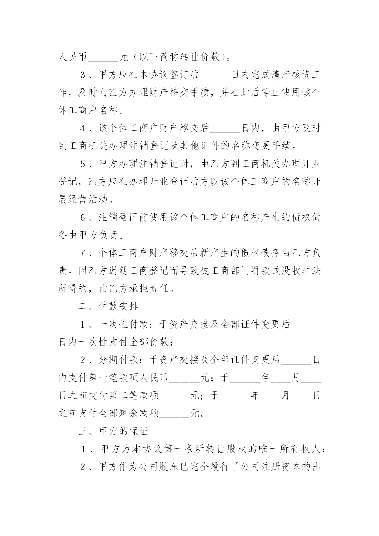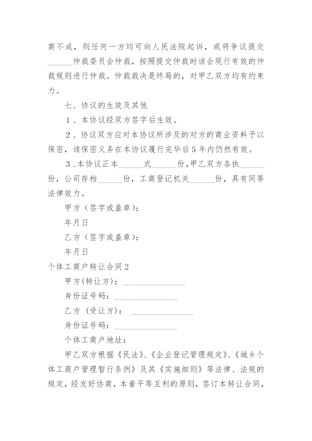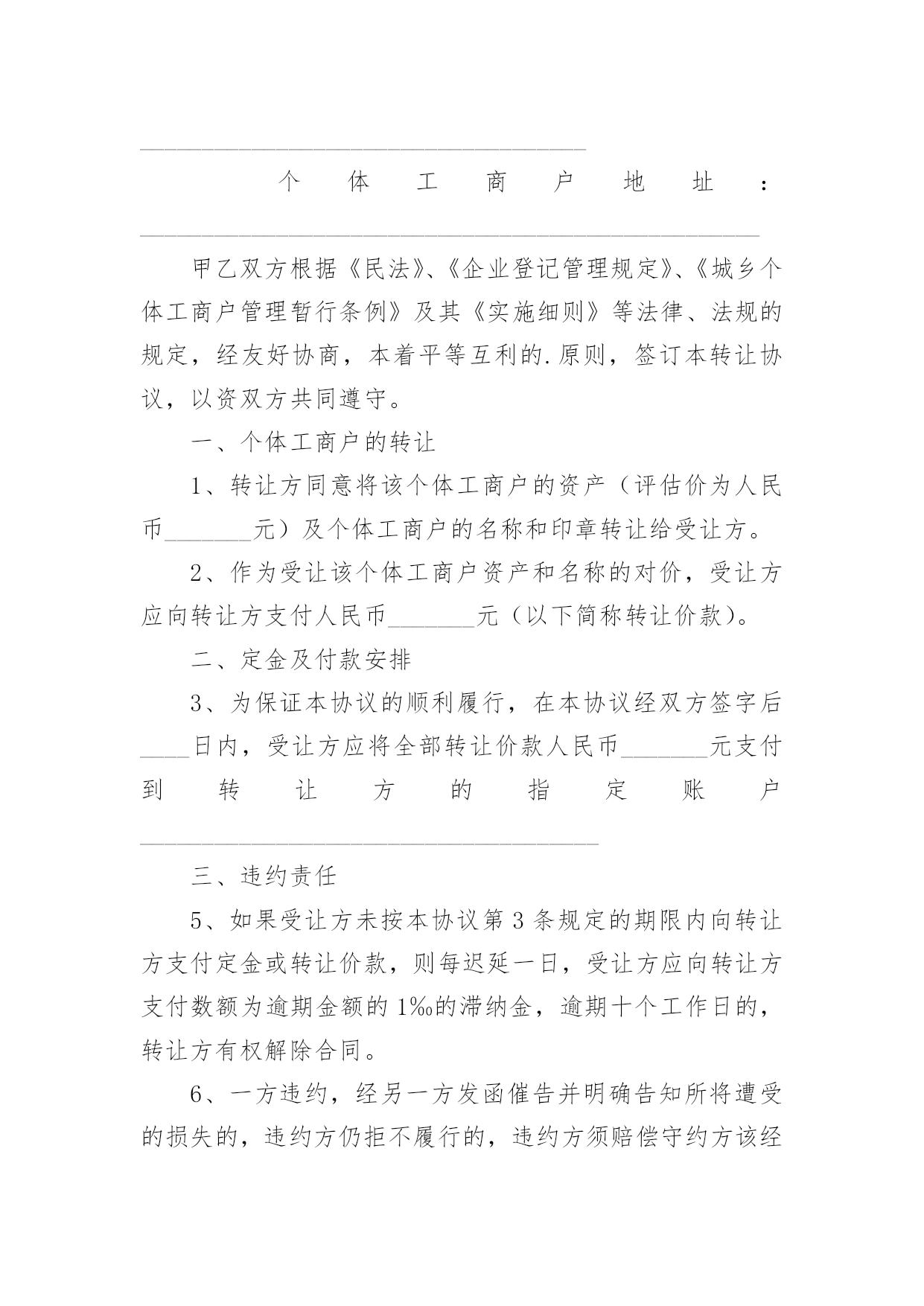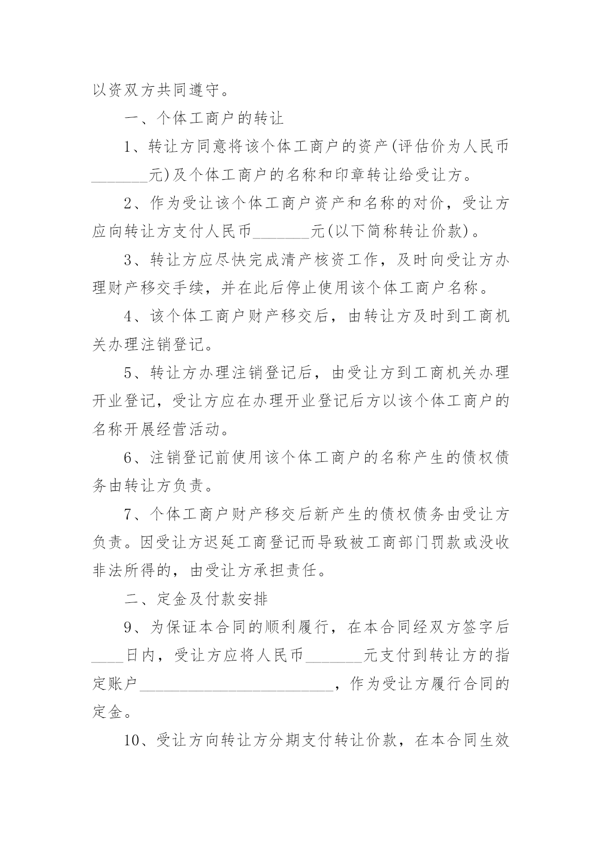 个体工商户转让合同个体工商户转让合同现今很多公民的维权意识在不断增强,很多场合都离不了合同,签订合同可以明确双方当事人的权利和义务。那么一般合同是怎么起草的呢?以下是小编收集整理的个体工商户转让合同,欢迎大家借鉴与参考,希望对大家有所帮助。个体工商户转让合同1转让方(甲方):身份证号码:个体工商户地址:受让方(乙方):身份证号码:个体工商户地址:甲乙双方根据《个体工商户条例》、《个体工商户登记管理办法》、《中华人民共和国合同法》等法律、法规的规定,经友好协商,本着平等互利的原则,签订本转让协议,以资双方共同遵守。一、个体工商户的转让1、甲方同意将该个体工商户的资产、个体工商户的名称和印章及其他许可证书转让给乙方。2、作为受让该个体工商户的对价,乙方应向甲方支付人民币______元(以下简称转让价款)。3、甲方应在本协议签订后______日内完成清产核资工作,及时向乙方办理财产移交手续,并在此后停止使用该个体工商户名称。4、该个体工商户财产移交后______日内,由甲方及时到工商机关办理注销登记及其他证件的名称变更手续。5、甲方办理注销登记时,由乙方到工商机关办理开业登记,乙方应在办理开业登记后方以该个体工商户的名称开展经营活动。6、注销登记前使用该个体工商户的名称产生的债权债务由甲方负责。7、个体工商户财产移交后新产生的债权债务由乙方负责。因乙方迟延工商登记而导致被工商部门罚款或没收非法所得的,由乙方承担责任。二、付款安排1、一次性付款:于资产交接及全部证件变更后______日内一次性支付全部价款;2、分期付款:于资产交接及全部证件变更后______日内支付第一笔款项人民币______元;于______年____月____日之前支付第二笔款项______元;于______年____月____日之前支付全部剩余款项______元。三、甲方的保证1、甲方为本协议第一条所转让股权的唯一所有权人;2、甲方作为公司股东已完全履行了公司注册资本的出资义务;3、保证所与本次转让股权有关的活动中所提及的文件完整、真实、且合法有效;4、保证转让的股权完整,未设定任何担保、抵押及其他第三方权益;5、保证其主体资格合法,有出让股权的权利能力与行为能力;6、保证因涉及股权交割日前的事实而产生的诉讼或仲裁由甲方承担;7、自本协议生效之日起,甲方完全退出公司的经营,不再参与公司财产、利润的分配。四、乙方的保证1、乙方以出资额为限对公司承担责任;2、乙方承认本公司章程及本合同规定,保证按章程规定履行义务和责任;3、乙方保证按本合同所规定的方式支付价款。五、违约责任1、乙方未按本协议约定支付价款的,每逾期一日向甲方支付应付款项______%的违约金;2、甲方未按本协议约定办理变更手续及资产移交的,每逾期一日向甲方支付合同总价款______%的违约金;逾期______日,乙方有权利单方解除协议。六、争议解决因履行本合同发生争议,双方应友好协商解决。如果协商不成,则任何一方均可向人民法院起诉,或将争议提交______仲裁委员会仲裁,按照提交仲裁时该会现行有效的仲裁规则进行仲裁。仲裁裁决是终局的,对甲乙双方均有约束力。七、协议的生效及其他1、本协议经双方签字后生效。2、协议双方应对本协议所涉及的对方的商业资料予以保密,该保密义务在本协议履行完毕后5年内仍然有效。3、本协议正本______式______份,甲乙双方各执______份,公司存档______份,工商登记机关______份,具有同等法律效力。甲方(签字或盖章):年月日乙方(签字或盖章):年月日个体工商户转让合同2甲方(转让方):_______________身份证号码:_______________乙方(受让方):_______________身份证号码:_______________个体工商户地址:甲乙双方根据《民法》、《企业登记管理规定》、《城乡个体工商户管理暂行条例》及其《实施细则》等法律、法规的规定,经友好协商,本着平等互利的原则,签订本转让合同,以资双方共同遵守。一、个体工商户的转让1、转让方同意将该个体工商户的资产(评估价为人民币_______元)及个体工商户的名称和印章转让给受让方。2、作为受让该个体工商户资产和名称的对价,受让方应向转让方支付人民币_______元(以下简称转让价款)。3、转让方应尽快完成清产核资工作,及时向受让方办理财产移交手续,并在此后停止使用该个体工商户名称。4、该个体工商户财产移交后,由转让方及时到工商机关办理注销登记。5、转让方办理注销登记后,由受让方到工商机关办理开业登记,受让方应在办理开业登记后方以该个体工商户的名称开展经营活动。6、注销登记前使用该个体工商户的名称产生的债权债务由转让方负责。7、个体工商户财产移交后新产生的债权债务由受让方负责。因受让方迟