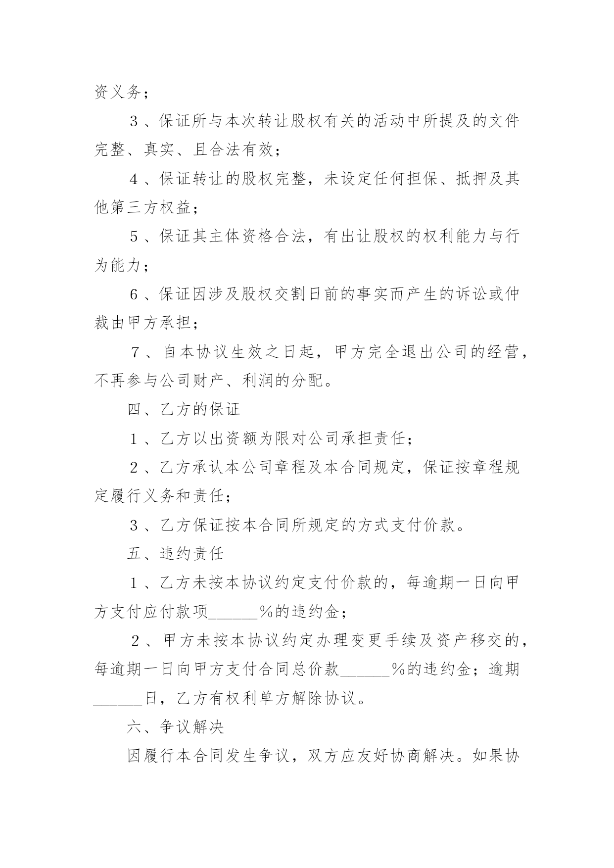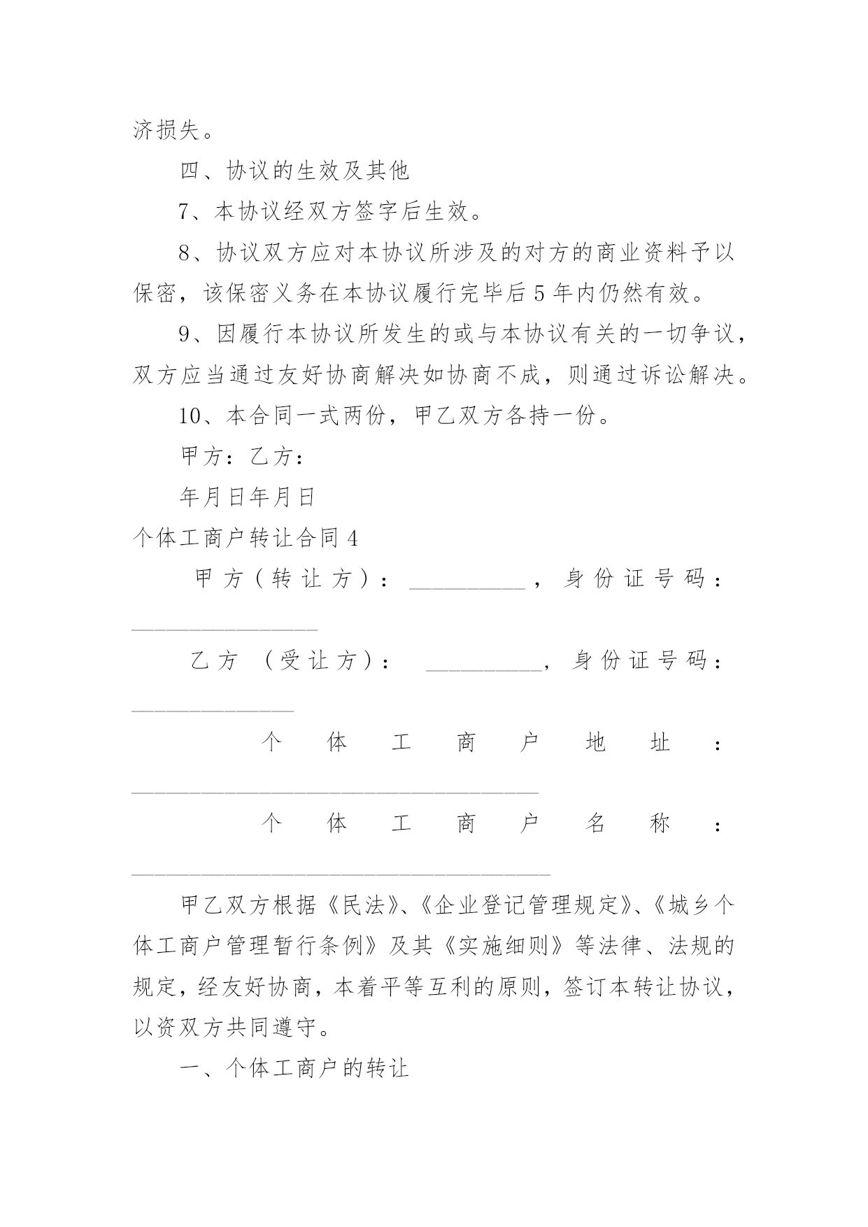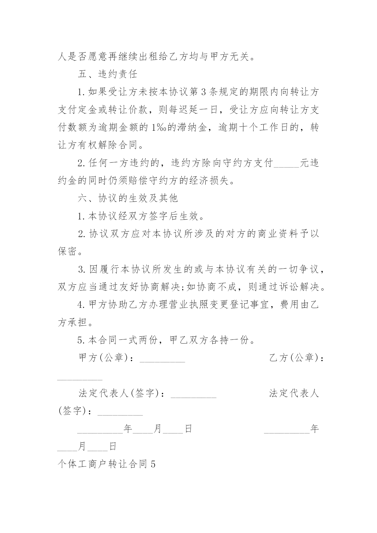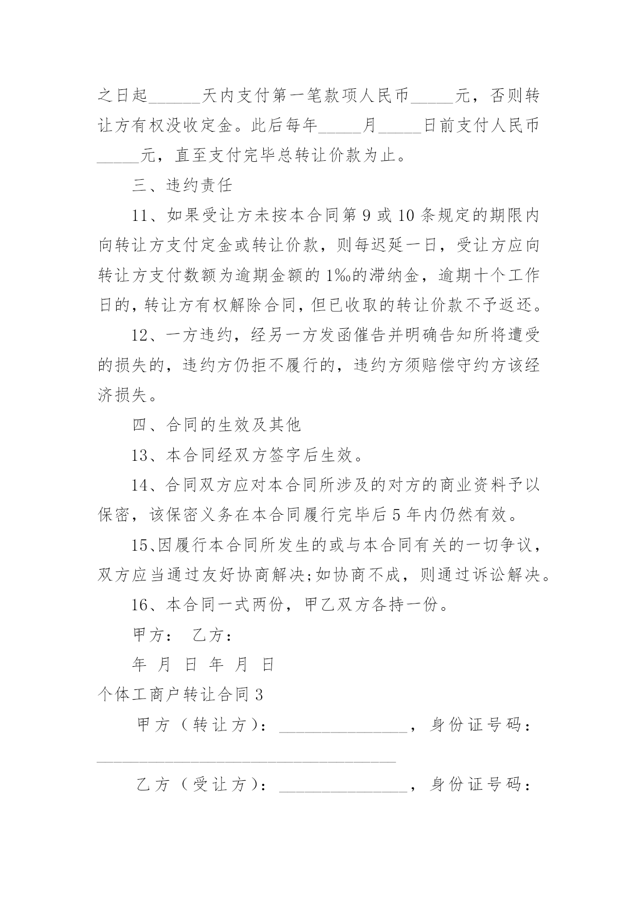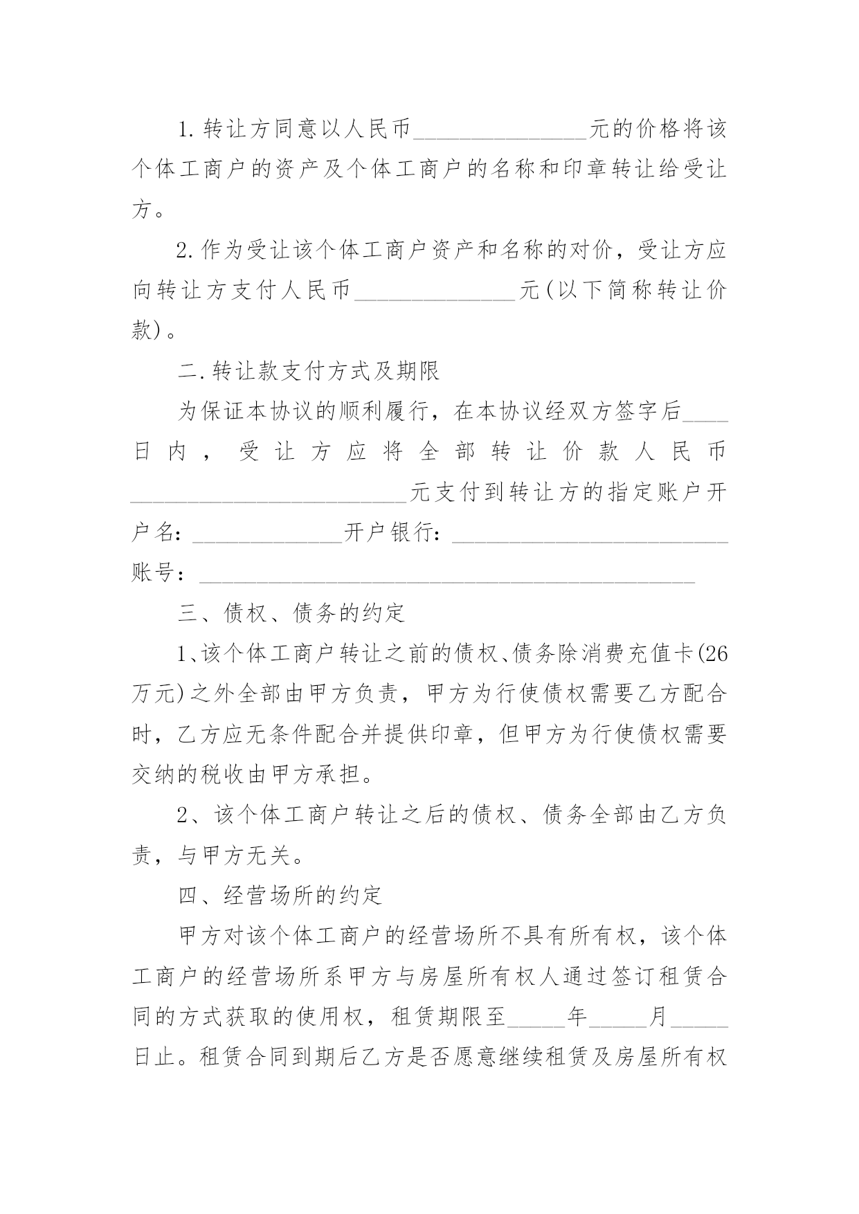 个体工商户转让合同个体工商户转让合同现今很多公民的维权意识在不断增强,很多场合都离不了合同,签订合同可以明确双方当事人的权利和义务。那么一般合同是怎么起草的呢?以下是小编收集整理的个体工商户转让合同,欢迎大家借鉴与参考,希望对大家有所帮助。个体工商户转让合同1转让方(甲方):身份证号码:个体工商户地址:受让方(乙方):身份证号码:个体工商户地址:甲乙双方根据《个体工商户条例》、《个体工商户登记管理办法》、《中华人民共和国合同法》等法律、法规的规定,经友好协商,本着平等互利的原则,签订本转让协议,以资双方共同遵守。一、个体工商户的转让1、甲方同意将该个体工商户的资产、个体工商户的名称和印章及其他许可证书转让给乙方。2、作为受让该个体工商户的对价,乙方应向甲方支付人民币______元(以下简称转让价款)。3、甲方应在本协议签订后______日内完成清产核资工作,及时向乙方办理财产移交手续,并在此后停止使用该个体工商户名称。4、该个体工商户财产移交后______日内,由甲方及时到工商机关办理注销登记及其他证件的名称变更手续。5、甲方办理注销登记时,由乙方到工商机关办理开业登记,乙方应在办理开业登记后方以该个体工商户的名称开展经营活动。6、注销登记前使用该个体工商户的名称产生的债权债务由甲方负责。7、个体工商户财产移交后新产生的债权债务由乙方负责。因乙方迟延工商登记而导致被工商部门罚款或没收非法所得的,由乙方承担责任。二、付款安排1、一次性付款:于资产交接及全部证件变更后______日内一次性支付全部价款;2、分期付款:于资产交接及全部证件变更后______日内支付第一笔款项人民币______元;于______年____月____日之前支付第二笔款项______元;于______年____月____日之前支付全部剩余款项______元。三、甲方的保证1、甲方为本协议第一条所转让股权的唯一所有权人;2、甲方作为公司股东已完全履行了公司注册资本的出资义务;3、保证所与本次转让股权有关的活动中所提及的文件完整、真实、且合法有效;4、保证转让的股权完整,未设定任何担保、抵押及其他第三方权益;5、保证其主体资格合法,有出让股权的权利能力与行为能力;6、保证因涉及股权交割日前的事实而产生的诉讼或仲裁由甲方承担;7、自本协议生效之日起,甲方完全退出公司的经营,不再参与公司财产、利润的分配。四、乙方的保证1、乙方以出资额为限对公司承担责任;2、乙方承认本公司章程及本合同规定,保证按章程规定履行义务和责任;3、乙方保证按本合同所规定的方式支付价款。五、违约责任1、乙方未按本协议约定支付价款的,每逾期一日向甲方支付应付款项______%的违约金;2、甲方未按本协议约定办理变更手续及资产移交的,每逾期一日向甲方支付合同总价款______%的违约金;逾期______日,乙方有权利单方解除协议。六、争议解决因履行本合同发生争议,双方应友好协商解决。如果协商不成,则任何一方均可向人民法院起诉,或将争议提交______仲裁委员会仲裁,按照提交仲裁时该会现行有效的仲裁规则进行仲裁。仲裁裁决是终局的,对甲乙双方均有约束力。七、协议的生效及其他1、本协议经双方签字后生效。2、协议双方应对本协议所涉及的对方的商业资料予以保密,该保密义务在本协议履行完毕后5年内仍然有效。3、本协议正本______式______份,甲乙双方各执______份,公司存档______份,工商登记机关______份,具有同等法律效力。甲方(签字或盖章):年月日乙方(签字或盖章):年月日个体工商户转让合同2甲方(转让方):_______________身份证号码:_______________乙方(受让方):_______________身份证号码:_______________个体工商户地址:甲乙双方根据《民法》、《企业登记管理规定》、《城乡个体工商户管理暂行条例》及其《实施细则》等法律、法规的规定,经友好协商,本着平等互利的原则,签订本转让合同,以资双方共同遵守。一、个体工商户的转让1、转让方同意将该个体工商户的资产(评估价为人民币_______元)及个体工商户的名称和印章转让给受让方。2、作为受让该个体工商户资产和名称的对价,受让方应向转让方支付人民币_______元(以下简称转让价款)。3、转让方应尽快完成清产核资工作,及时向受让方办理财产移交手续,并在此后停止使用该个体工商户名称。4、该个体工商户财产移交后,由转让方及时到工商机关办理注销登记。5、转让方办理注销登记后,由受让方到工商机关办理开业登记,受让方应在办理开业登记后方以该个体工商户的名称开展经营活动。6、注销登记前使用该个体工商户的名称产生的债权债务由转让方负责。7、个体工商户财产移交后新产生的债权债务由受让方负责。因受让方迟