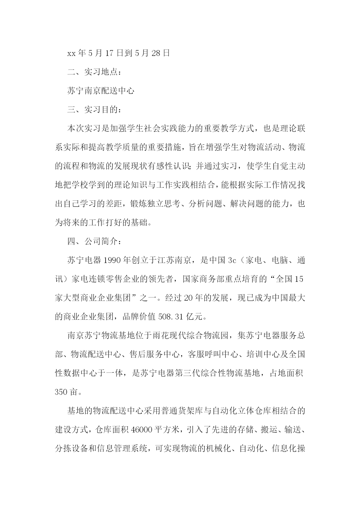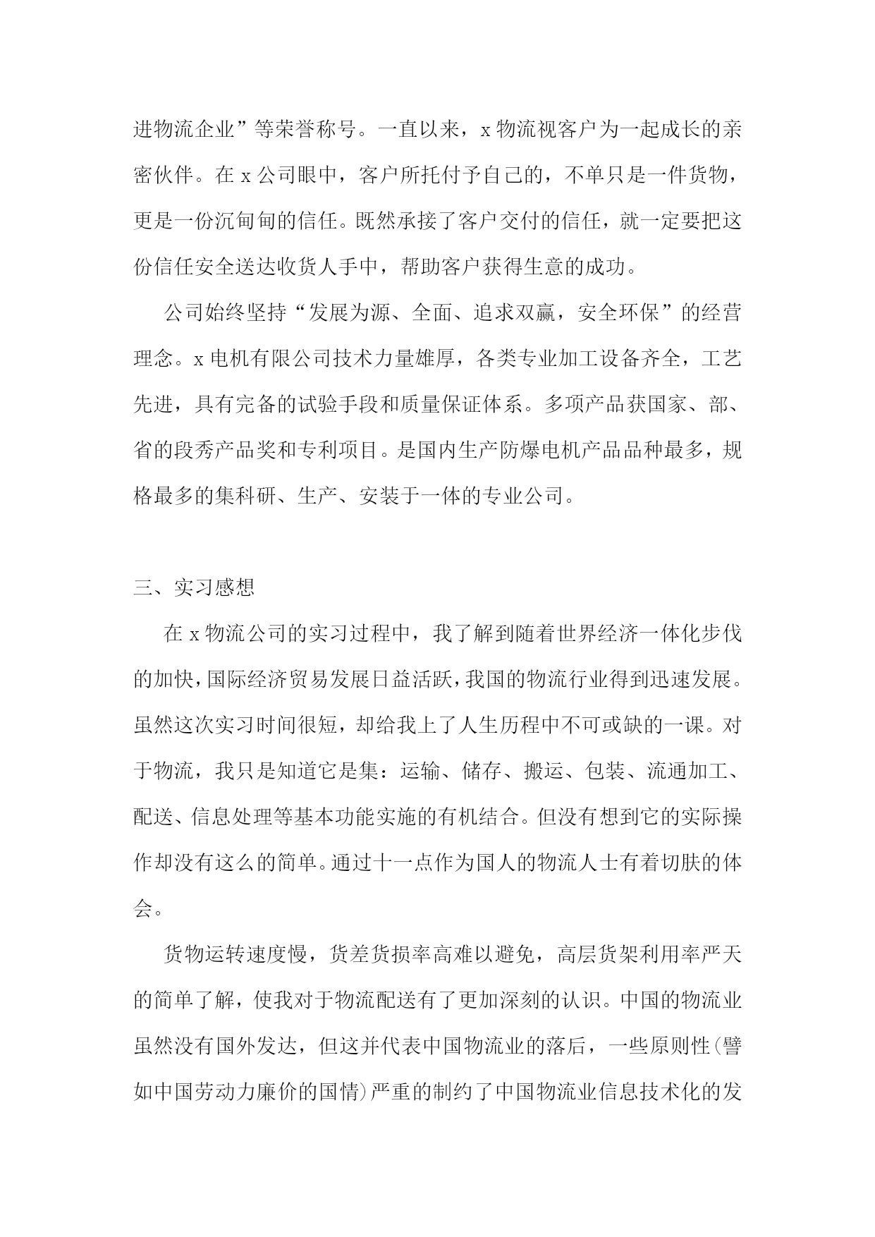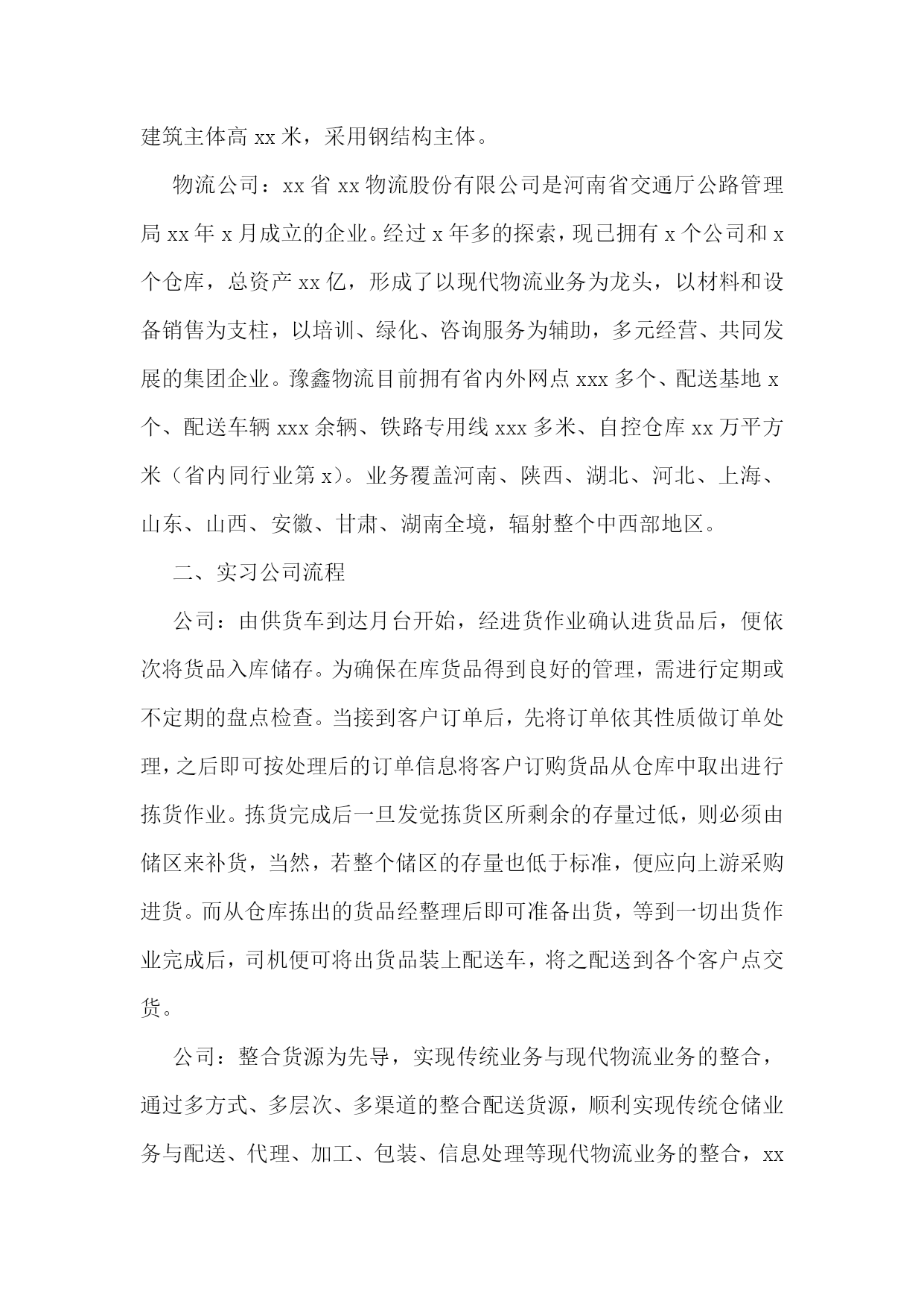 物流实习报告15篇物流实习报告1实习时间:xx年x月xx日实习地点:xxxx物流公司xxxx物流公司)实习目的:了解物流企业的运作和相关设施,设备与人员技术技能,物流设施设备等的基本常识;掌握物流系统的构成和物流基本环节,掌握运输,仓储,包装,装卸搬运,配送,信息处理等基本的物流作业功能;理解本课程理论知识和学习该专业其他课程提供感性知识,并依据学习的理论提出自己的意见。实习方式:采用实地参观的方式,集体参观丹尼斯物流配送中心,听专业人员的介绍及报告、查阅相关资料、上机专项练习等并整理资料讨论,使我们获得对标准化物流服务的’感性认识,并总结。一、实习公司简介物流公司:该公司自xx年xx月开始设计,位于航海路第一大街,并于xx年xx月破土动工,xx年x月投入使用。其配送能力可同时满足xx家大卖场,xxx家便利店需求,配送距离可达半径xx公里范围。其仓库总占地面积xx亩,拥有两座现代化库房,合计xxx平方米。建筑主体高xx米,采用钢结构主体。物流公司:xx省xx物流股份有限公司是河南省交通厅公路管理局xx年x月成立的企业。经过x年多的探索,现已拥有x个公司和x个仓库,总资产xx亿,形成了以现代物流业务为龙头,以材料和设备销售为支柱,以培训、绿化、咨询服务为辅助,多元经营、共同发展的集团企业。豫鑫物流目前拥有省内外网点xxx多个、配送基地x个、配送车辆xxx余辆、铁路专用线xxx多米、自控仓库xx万平方米(省内同行业第x)。业务覆盖河南、陕西、湖北、河北、上海、山东、山西、安徽、甘肃、湖南全境,辐射整个中西部地区。二、实习公司流程公司:由供货车到达月台开始,经进货作业确认进货品后,便依次将货品入库储存。为确保在库货品得到良好的管理,需进行定期或不定期的盘点检查。当接到客户订单后,先将订单依其性质做订单处理,之后即可按处理后的订单信息将客户订购货品从仓库中取出进行拣货作业。拣货完成后一旦发觉拣货区所剩余的存量过低,则必须由储区来补货,当然,若整个储区的存量也低于标准,便应向上游采购进货。而从仓库拣出的货品经整理后即可准备出货,等到一切出货作业完成后,司机便可将出货品装上配送车,将之配送到各个客户点交货。公司:整合货源为先导,实现传统业务与现代物流业务的整合,通过多方式、多层次、多渠道的整合配送货源,顺利实现传统仓储业务与配送、代理、加工、包装、信息处理等现代物流业务的整合,xx物流可为家电、服装、食品等xx个行业提供整个物流供应链服务。xx集团、xx集团、xx集团、xx集团将xx物流作为xx省指定物流商,国内知名家电连锁企业xx电器、xx电器、xx电器的xx市内配送也全部由该公司运输、配送,同时,xx长虹、xx电器、xx电子、xx玉柴、xx张裕、xx药业、xx药业等大型知名企业也将xx物流作为长期战略合作伙伴。与此流程相配套的,是xx物流以战略合作为试点,实现全程供应链业务整合。物流实习报告2为了以后能更好的适应工作和学习,学校组织到x物流配送中心与x防爆电机厂进行为期5天的实习。主要是熟悉物流的作业流程,掌握物流的工作流程,以便对我国的物流业能有更深的了解。一、实习要求了解物流特点,物流工作流程,工作设备,并针对这些实践依靠自己所学的理论提出自己的观点和看法。二、实习单位简介x物流公司是一家综合服务型物流企业,主营国内公路零担运输和空运代理服务,公司秉承“承载信任、助力成功”的服务理念,以每年超过60%的增长速度在中国物流行业迅速崛起,并获得“全国先进物流企业”等荣誉称号。一直以来,x物流视客户为一起成长的亲密伙伴。在x公司眼中,客户所托付予自己的,不单只是一件货物,更是一份沉甸甸的信任。既然承接了客户交付的信任,就一定要把这份信任安全送达收货人手中,帮助客户获得生意的成功。公司始终坚持“发展为源、全面、追求双赢,安全环保”的经营理念。x电机有限公司技术力量雄厚,各类专业加工设备齐全,工艺先进,具有完备的试验手段和质量保证体系。多项产品获国家、部、省的段秀产品奖和专利项目。是国内生产防爆电机产品品种最多,规格最多的集科研、生产、安装于一体的专业公司。三、实习感想在x物流公司的实习过程中,我了解到随着世界经济一体化步伐的加快,国际经济贸易发展日益活跃,我国的物流行业得到迅速发展。虽然这次实习时间很短,却给我上了人生历程中不可或缺的一课。对于物流,我只是知道它是集:运输、储存、搬运、包装、流通加工、配送、信息处理等基本功能实施的有机结合。但没有想到它的实际操作却没有这么的简单。通过十一点作为国人的物流人士有着切肤的体会。货物运转速度慢,货差货损率高难以避免,高层货架利用率严天的简单了解,使我对于物流配送有了更加深刻的认识。中国的物流业虽然没有国外发达,但这并代表中国物流业的落