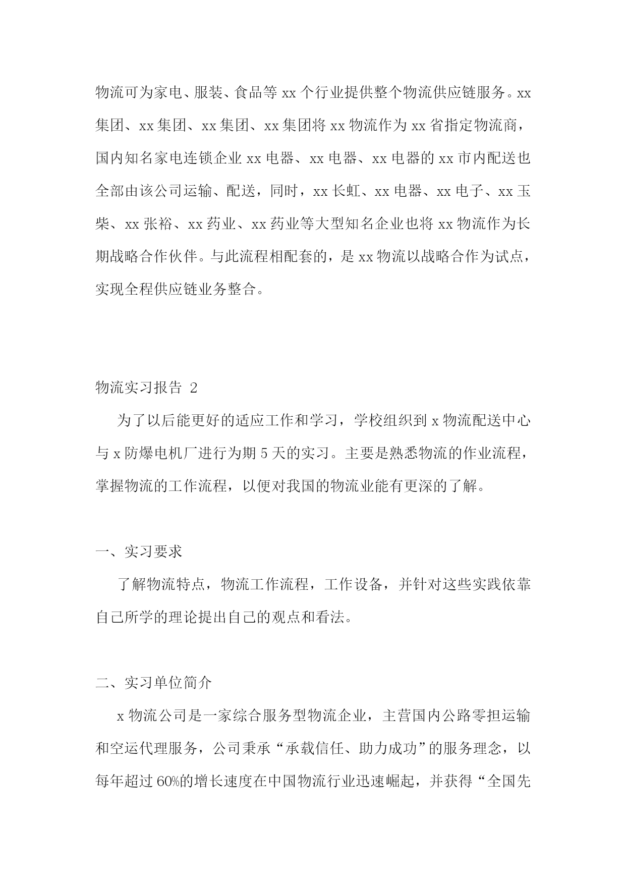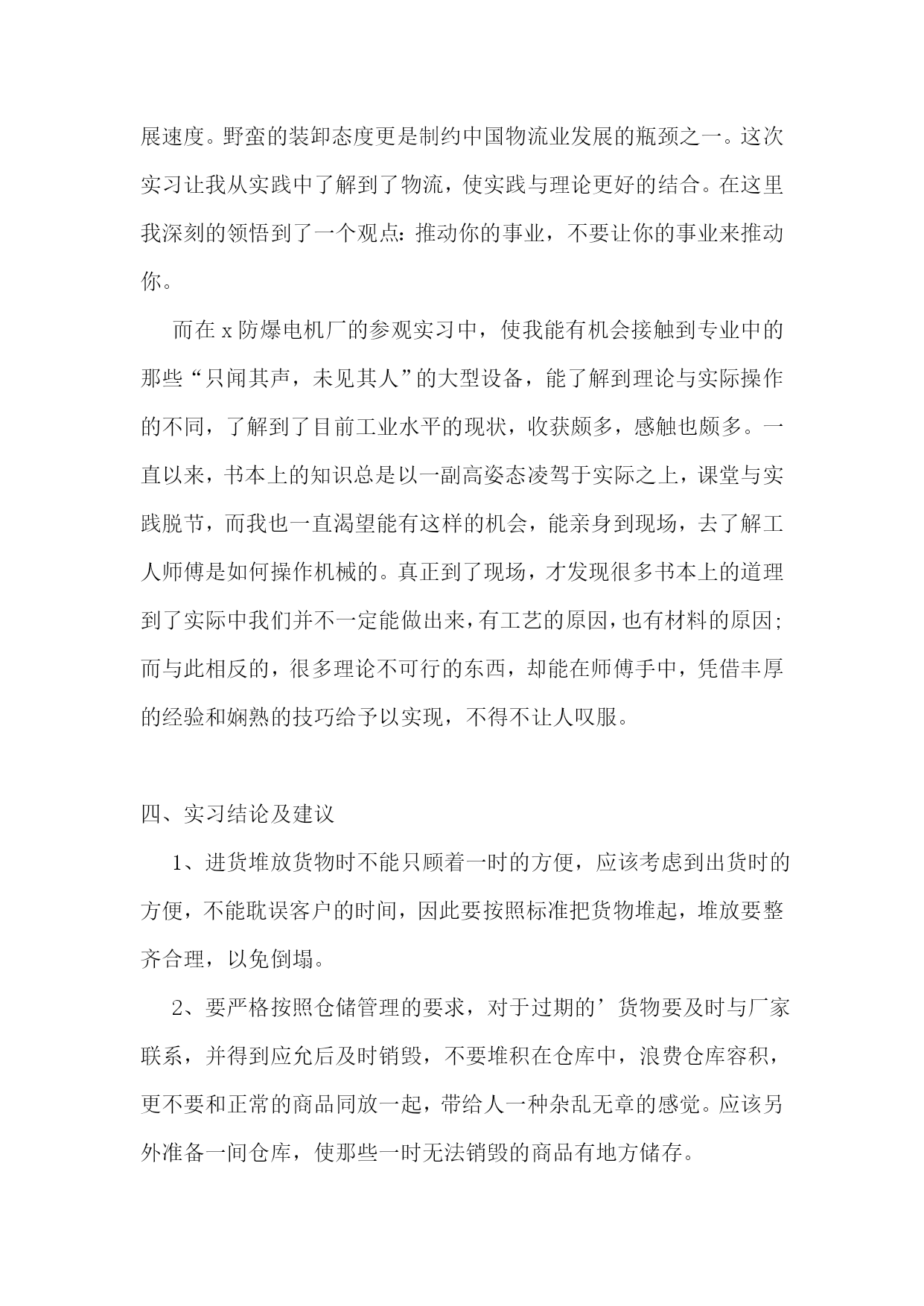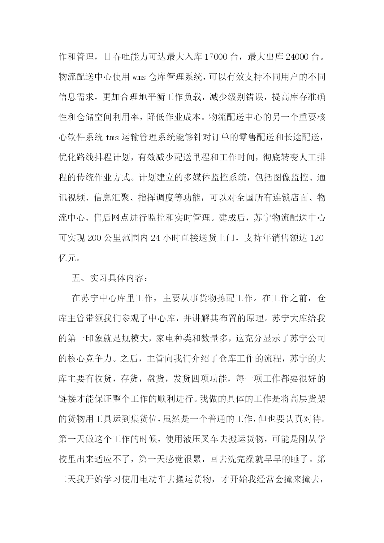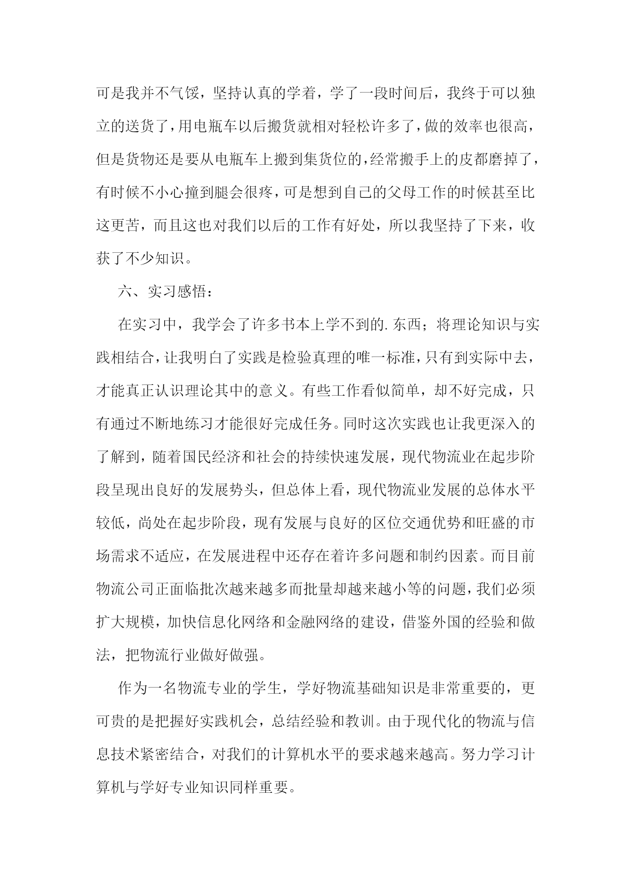 物流实习报告15篇物流实习报告1实习时间:xx年x月xx日实习地点:xxxx物流公司xxxx物流公司)实习目的:了解物流企业的运作和相关设施,设备与人员技术技能,物流设施设备等的基本常识;掌握物流系统的构成和物流基本环节,掌握运输,仓储,包装,装卸搬运,配送,信息处理等基本的物流作业功能;理解本课程理论知识和学习该专业其他课程提供感性知识,并依据学习的理论提出自己的意见。实习方式:采用实地参观的方式,集体参观丹尼斯物流配送中心,听专业人员的介绍及报告、查阅相关资料、上机专项练习等并整理资料讨论,使我们获得对标准化物流服务的’感性认识,并总结。一、实习公司简介物流公司:该公司自xx年xx月开始设计,位于航海路第一大街,并于xx年xx月破土动工,xx年x月投入使用。其配送能力可同时满足xx家大卖场,xxx家便利店需求,配送距离可达半径xx公里范围。其仓库总占地面积xx亩,拥有两座现代化库房,合计xxx平方米。建筑主体高xx米,采用钢结构主体。物流公司:xx省xx物流股份有限公司是河南省交通厅公路管理局xx年x月成立的企业。经过x年多的探索,现已拥有x个公司和x个仓库,总资产xx亿,形成了以现代物流业务为龙头,以材料和设备销售为支柱,以培训、绿化、咨询服务为辅助,多元经营、共同发展的集团企业。豫鑫物流目前拥有省内外网点xxx多个、配送基地x个、配送车辆xxx余辆、铁路专用线xxx多米、自控仓库xx万平方米(省内同行业第x)。业务覆盖河南、陕西、湖北、河北、上海、山东、山西、安徽、甘肃、湖南全境,辐射整个中西部地区。二、实习公司流程公司:由供货车到达月台开始,经进货作业确认进货品后,便依次将货品入库储存。为确保在库货品得到良好的管理,需进行定期或不定期的盘点检查。当接到客户订单后,先将订单依其性质做订单处理,之后即可按处理后的订单信息将客户订购货品从仓库中取出进行拣货作业。拣货完成后一旦发觉拣货区所剩余的存量过低,则必须由储区来补货,当然,若整个储区的存量也低于标准,便应向上游采购进货。而从仓库拣出的货品经整理后即可准备出货,等到一切出货作业完成后,司机便可将出货品装上配送车,将之配送到各个客户点交货。公司:整合货源为先导,实现传统业务与现代物流业务的整合,通过多方式、多层次、多渠道的整合配送货源,顺利实现传统仓储业务与配送、代理、加工、包装、信息处理等现代物流业务的整合,xx物流可为家电、服装、食品等xx个行业提供整个物流供应链服务。xx集团、xx集团、xx集团、xx集团将xx物流作为xx省指定物流商,国内知名家电连锁企业xx电器、xx电器、xx电器的xx市内配送也全部由该公司运输、配送,同时,xx长虹、xx电器、xx电子、xx玉柴、xx张裕、xx药业、xx药业等大型知名企业也将xx物流作为长期战略合作伙伴。与此流程相配套的,是xx物流以战略合作为试点,实现全程供应链业务整合。物流实习报告2为了以后能更好的适应工作和学习,学校组织到x物流配送中心与x防爆电机厂进行为期5天的实习。主要是熟悉物流的作业流程,掌握物流的工作流程,以便对我国的物流业能有更深的了解。一、实习要求了解物流特点,物流工作流程,工作设备,并针对这些实践依靠自己所学的理论提出自己的观点和看法。二、实习单位简介x物流公司是一家综合服务型物流企业,主营国内公路零担运输和空运代理服务,公司秉承“承载信任、助力成功”的服务理念,以每年超过60%的增长速度在中国物流行业迅速崛起,并获得“全国先进物流企业”等荣誉称号。一直以来,x物流视客户为一起成长的亲密伙伴。在x公司眼中,客户所托付予自己的,不单只是一件货物,更是一份沉甸甸的信任。既然承接了客户交付的信任,就一定要把这份信任安全送达收货人手中,帮助客户获得生意的成功。公司始终坚持“发展为源、全面、追求双赢,安全环保”的经营理念。x电机有限公司技术力量雄厚,各类专业加工设备齐全,工艺先进,具有完备的试验手段和质量保证体系。多项产品获国家、部、省的段秀产品奖和专利项目。是国内生产防爆电机产品品种最多,规格最多的集科研、生产、安装于一体的专业公司。三、实习感想在x物流公司的实习过程中,我了解到随着世界经济一体化步伐的加快,国际经济贸易发展日益活跃,我国的物流行业得到迅速发展。虽然这次实习时间很短,却给我上了人生历程中不可或缺的一课。对于物流,我只是知道它是集:运输、储存、搬运、包装、流通加工、配送、信息处理等基本功能实施的有机结合。但没有想到它的实际操作却没有这么的简单。通过十一点作为国人的物流人士有着切肤的体会。货物运转速度慢,货差货损率高难以避免,高层货架利用率严天的简单了解,使我对于物流配送有了更加深刻的认识。中国的物流业虽然没有国外发达,但这并代表中国物流业的落