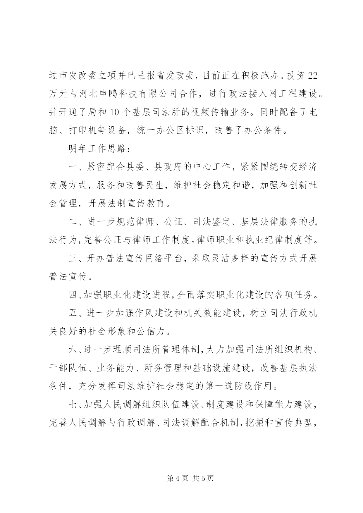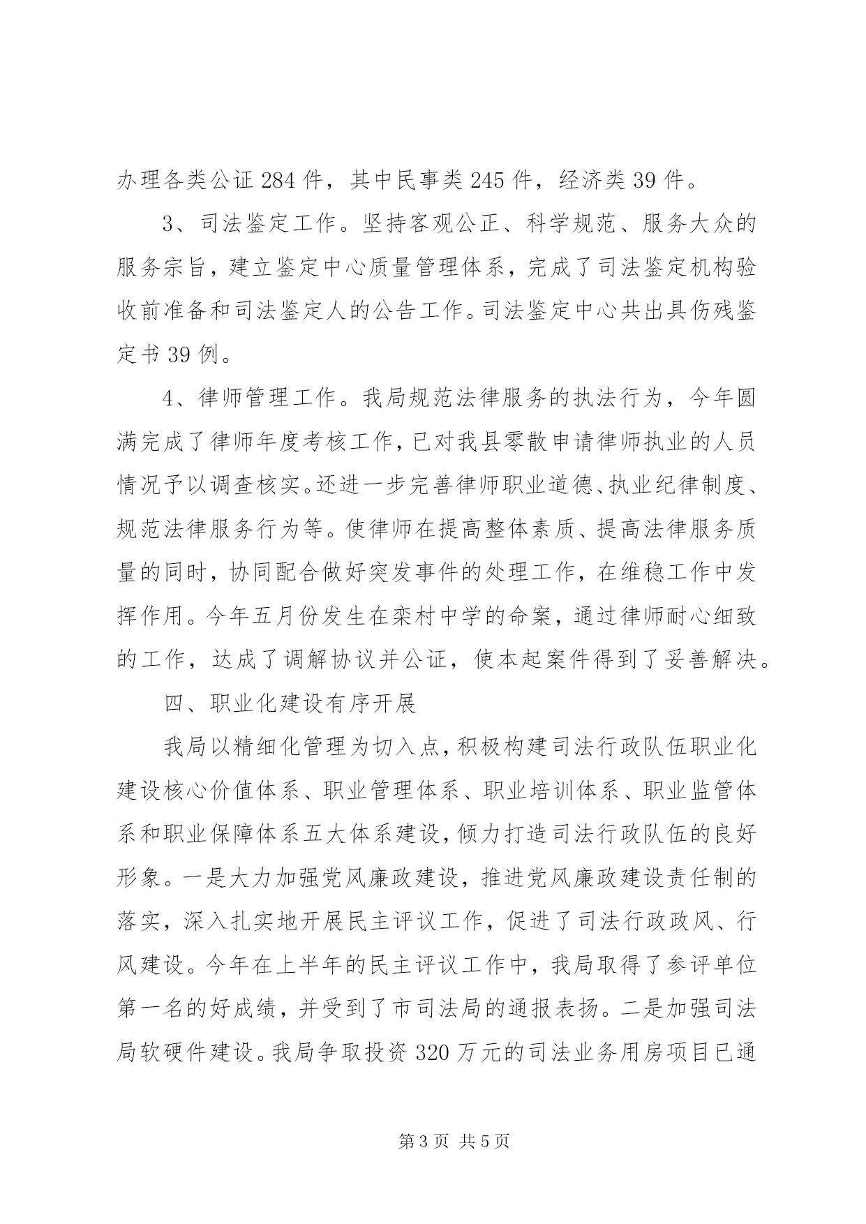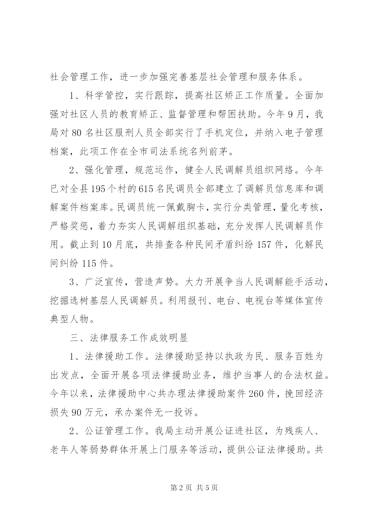第PAGE\*Arabic\*MERGEFORMAT5页共NUMPAGES\*MERGEFORMAT5页司法所XX年度工作总结一、普法工作有声有色。今年上半年我县五五普法工作顺利通过市局验收,精彩落幕。今年普法工作紧扣科学发展主题和加快转变经济发展方式,创新社会管理这条主线。创新理念、创新方法、创新载体,开展多种形式、生动有效的法制宣传教育活动,增强法制宣传教育的吸引力、说服力、感染力和渗透力,为我县经济社会发展创造了良好的法制环境。一是以法律进乡村、进社区、进校园、进企业、进市场、进机关、进单位、进家庭法律八进为载体,开展学法律、讲权利、讲义务、讲责任的一学三讲主题活动,进一步拓展了普法工作的覆盖面。二是以现代媒体为载体,搭建普法宣传的平台和阵地。9月份在XX县区报开设了《司法进行时》专版,辟有《六五普法吹风台》、《金牌调解》、《任律师热线》、《法规解读》、《举案说法》、《司法前哨》等10多个栏目,进一步拓宽了普法工作的新路径。三是以市百名法律人进千家企业活动为载体,组建了由6名律师、公证员、法律工作者组成的优化发展环境法律服务团,先后深入到全县28家重点企业和重点项目建设单位无偿提供法律服务。帮助企业解决企业注册、土地征用、生产扩规、经济纠纷等方面的问题40件。疏导化解企业矛盾纠纷,抵御防范企业法律风险,运用法律手段为企业保驾护航,进一步加长了法律服务的新链条。二、社会管理工作扎实推进。今年以来紧紧围绕加强和创新社会管理工作,进一步加强完善基层社会管理和服务体系。1、科学管控,实行跟踪,提高社区矫正工作质量。全面加强对社区人员的教育矫正、监督管理和帮困扶助。今年9月,我局对80名社区服刑人员全部实行了手机定位,并纳入电子管理档案,此项工作在全市司法系统名列前茅。2、强化管理,规范运作,健全人民调解员组织网络。今年已对全县195个村的615名民调员全部建立了调解员信息库和调解案件档案库。民调员统一佩戴胸卡,实行分类管理,量化考核,严格奖惩,着力夯实人民调解组织基础,充分发挥人民调解员作用。截止到10月底,共排查各种民间矛盾纠纷157件,化解民间纠纷115件。3、广泛宣传,营造声势。大力开展争当人民调解能手活动,挖掘选树基层人民调解员。利用报刊、电台、电视台等媒体宣传典型人物。三、法律服务工作成效明显1、法律援助工作。法律援助坚持以执政为民、服务百姓为出发点,全面开展各项法律援助业务,维护当事人的合法权益。今年以来,法律援助中心共办理法律援助案件260件,挽回经济损失90万元,承办案件无一投诉。2、公证管理工作。我局主动开展公证进社区,为残疾人、老年人等弱势群体开展上门服务等活动,提供公证法律援助。共办理各类公证284件,其中民事类245件,经济类39件。3、司法鉴定工作。坚持客观公正、科学规范、服务大众的服务宗旨,建立鉴定中心质量管理体系,完成了司法鉴定机构验收前准备和司法鉴定人的公告工作。司法鉴定中心共出具伤残鉴定书39例。4、律师管理工作。我局规范法律服务的执法行为,今年圆满完成了律师年度考核工作,已对我县零散申请律师执业的人员情况予以调查核实。还进一步完善律师职业道德、执业纪律制度、规范法律服务行为等。使律师在提高整体素质、提高法律服务质量的同时,协同配合做好突发事件的处理工作,在维稳工作中发挥作用。今年五月份发生在栾村中学的命案,通过律师耐心细致的工作,达成了调解协议并公证,使本起案件得到了妥善解决。四、职业化建设有序开展我局以精细化管理为切入点,积极构建司法行政队伍职业化建设核心价值体系、职业管理体系、职业培训体系、职业监管体系和职业保障体系五大体系建设,倾力打造司法行政队伍的良好形象。一是大力加强党风廉政建设,推进党风廉政建设责任制的落实,深入扎实地开展民主评议工作,促进了司法行政政风、行风建设。今年在上半年的民主评议工作中,我局取得了参评单位第一名的好成绩,并受到了市司法局的通报表扬。二是加强司法局软硬件建设。我局争取投资320万元的司法业务用房项目已通过市发改委立项并已呈报省发改委,目前正在积极跑办。投资22万元与河北申鸥科技有限公司合作,进行政法接入网工程建设。并开通了局和10个基层司法所的视频传输业务。同时配备了电脑、打印机等设备,统一办公区标识,改善了办公条件。明年工作思路:一、紧密配合县委、县政府的中心工作,紧紧围绕转变经济发展方式,服务和改善民生,维护社会稳定和谐,加强和创新社会管理,开展法制宣传教育。二、进一步规范律师、公证、司法鉴定、基层法律服务的执法行为,完善公证与律师工作制度。律师职业和执业纪律制度等。三、开办普法宣传网络平台,采取灵活多样的宣传方式开展普法宣传。四、加强职业化建设进程,全面落实职业化建设的各项任务。五、进一步加强作风建设和机关效能建设,树立司法行政