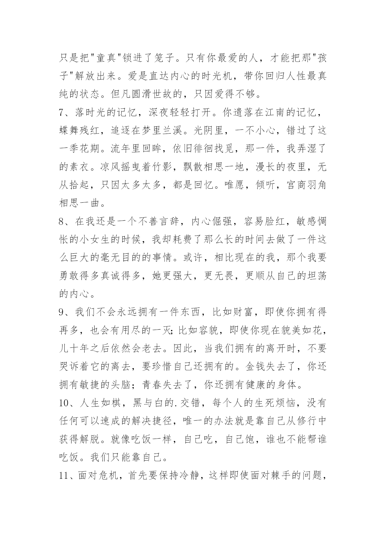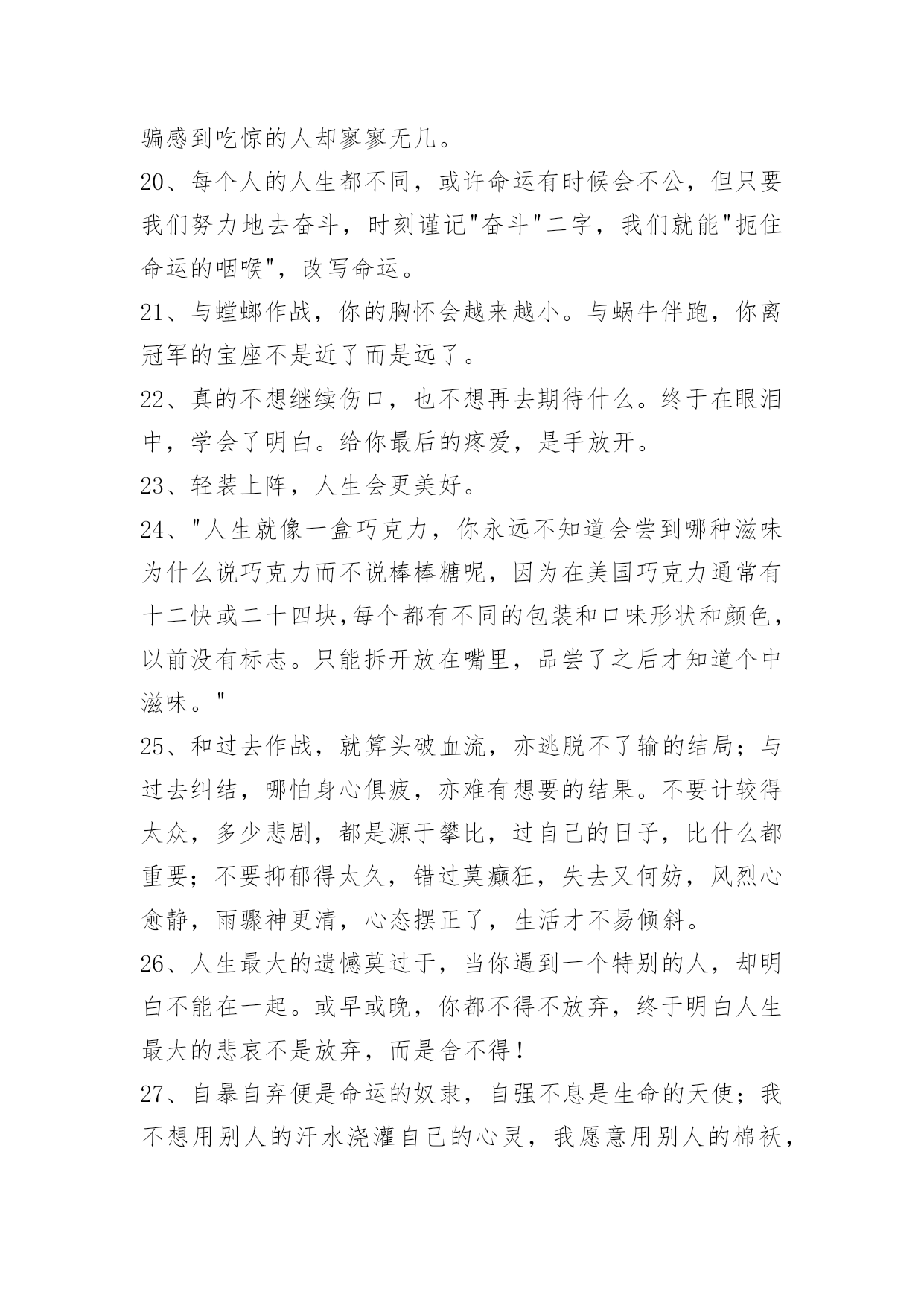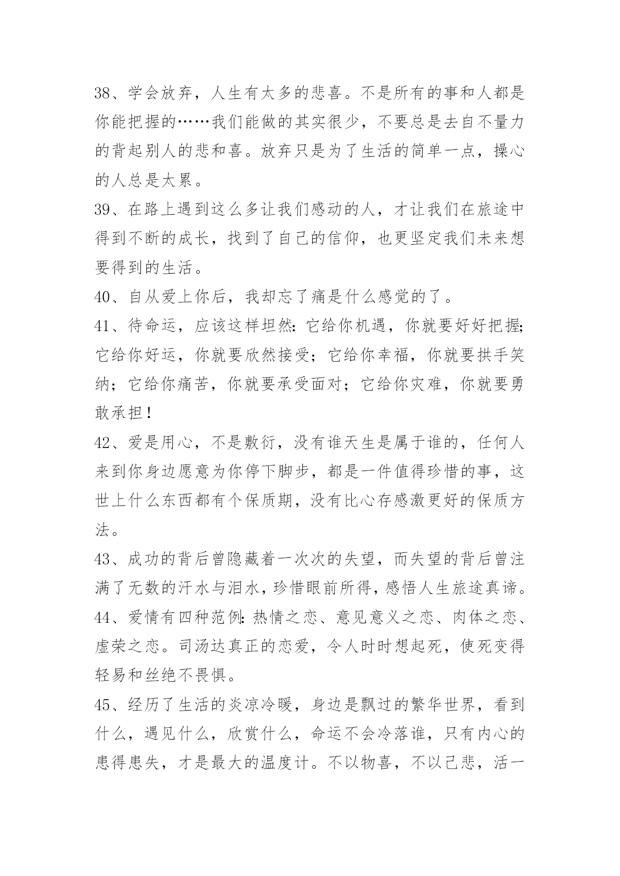 人生感悟句子58条【必备】人生感悟句子集合58条风的方向是由树决定,人的方向是由自已决定。下面是关于人生感悟句子58条,一起来欣赏吧。1、晨起、雾薄。明澈的天空散落着几片流云、淡而清、懒懒的、闲闲的;有风也无风。闲坐窗前、看云烟翩跹、心随云动而空、心空如镜、心静而明。云是白的、没有色彩、所以自在。心是闲的、没有烦恼、所以优哉。只有心静、看什么都是白云静水、看什么都会赏心悦目、看什么都能悟出禅心。2、做人事如意,做事不容易。3、有的人因为怕鱼刺刺到自己,便不再吃鱼。很多人,因为怕做事情的过程中给自己带来伤害,便拒绝了一切的开始。4、问天,淡然静默,素颜清心的人能否握得住片片飘忽的情缘?问地,醉笑红尘,翻云覆雨的手能否托得起缕缕忧伤的命轮?问自己,天涯路远,倾心奔赴的来生可否遇见今生错过的爱人?5、我们每个人都认为自己善良,很多人也愿意去做善事,可我们总是把自己的需求放在他人的需求之前,因而,常常在最需要表现善良的时候却失之交臂。6、在最爱的人面前,你看起来会像个孩子。每个人内心都有个永不长大的孩子,那是本真的天性。所谓的成长与成熟,只是把"童真"锁进了笼子。只有你最爱的人,才能把那"孩子"解放出来。爱是直达内心的时光机,带你回归人性最真纯的状态。但凡圆滑世故的,只因爱得不够。7、落时光的记忆,深夜轻轻打开。你遗落在江南的记忆,蝶舞残红,追逐在梦里兰溪。光阴里,一不小心,错过了这一季花期。流年里回眸,依旧徘徊找觅,那一件,我弄湿了的素衣。凉风摇曳着竹影,飘散相思一地,漫长的夜里,无从拾起,只因太多太多,都是回忆。唯愿,倾听,宫商羽角相思一曲。8、在我还是一个不善言辞,内心倔强,容易脸红,敏感惆怅的小女生的时候,我却耗费了那么长的时间去做了一件这么巨大的毫无目的的事情。或许,相比现在的我,那个我要勇敢得多真诚得多,她更强大,更无畏,更顺从自己的坦荡的内心。9、我们不会永远拥有一件东西,比如财富,即使你拥有得再多,也会有用尽的一灭;比如容貌,即使你现在貌美如花,儿十年之后依然会老去。因此,当我们拥有的离开时,不要哭诉着它的离去,要珍惜自己还拥有的。金钱失去了,你还拥有敏捷的头脑;青春失去了,你还拥有健康的身体。10、人生如棋,黑与白的.交错,每个人的生死烦恼,没有任何可以速成的解决捷径,唯一的办法就是靠自己从修行中获得解脱。就像吃饭一样,自己吃,自己饱,谁也不能帮谁吃饭。我们只能靠自己。11、面对危机,首先要保持冷静,这样即使面对棘手的问题,也往往能通过客观全面的思考和分析,对事情做出比较正确的处理。12、一辈子不长,不要让自己总是活在回忆里。13、你想要好的成绩,但是你不去努力学习。你想要健康的身体,但是你没能坚持锻炼。你想要称心如意的生活,但是你从来没有真正想过改变自己。与其为流逝的时光惶恐,不如结结实实地抓住分秒。改变,从今天的努力开始。14、幸福更应该是一种内心的归宿,走过人生的四季,即面对了一路风霜,更要活出人生的风度,这世间花开花落,云卷云舒,不是岁月在掩饰什么,而是一种提醒,人生随缘,转变心态,发现幸福的平凡与存在,它就存在于悲观中的沉思,疲惫中的坚持,失落中的珍惜,心地亦然,幸福当然。15、我希望在爱里,继续活下去,活的比爱还要久。我相信,这个世界上一定会有一个你爱的人。他会穿越这个世界汹涌的人群,怀着一颗用力跳动的心脏,捧着满腔的热和沉甸甸的爱,走向你,抓紧你,他一定会找到你的,你要等。16、死亡并不可怕。有生就必然有死;自出娘胎,我们每一分钟都在朝死亡步近。真正可怕与可悲的是:在生与死之间没有做过什么。17、任何事情都是痛并快乐着的,如果自己只是享受了快乐,那么必然有其他人帮自己承担了痛苦。18、现在不努力,将来拿什么向曾经抛弃你的人,嫌弃你的人,低头看你的人,证明它有多瞎。19、令人沮丧的是,对诚实感到吃惊的人不在少数,而对欺骗感到吃惊的人却寥寥无几。20、每个人的人生都不同,或许命运有时候会不公,但只要我们努力地去奋斗,时刻谨记"奋斗"二字,我们就能"扼住命运的咽喉",改写命运。21、与螳螂作战,你的胸怀会越来越小。与蜗牛伴跑,你离冠军的宝座不是近了而是远了。22、真的不想继续伤口,也不想再去期待什么。终于在眼泪中,学会了明白。给你最后的疼爱,是手放开。23、轻装上阵,人生会更美好。24、"人生就像一盒巧克力,你永远不知道会尝到哪种滋味为什么说巧克力而不说棒棒糖呢,因为在美国巧克力通常有十二快或二十四块,每个都有不同的包装和口味形状和颜色,以前没有标志。只能拆开放在嘴里,品尝了之后才知道个中滋味。"25、和过去作战,就算头破血流,亦逃脱不了输的结局;与过去纠结,哪怕身心俱疲,亦难有想要的结果。不要计较得太众,多少悲剧,都是源于攀比,过自己的日子,比什么都重要;不要抑郁得太久,错过莫癫狂,失去又何妨,风烈心愈