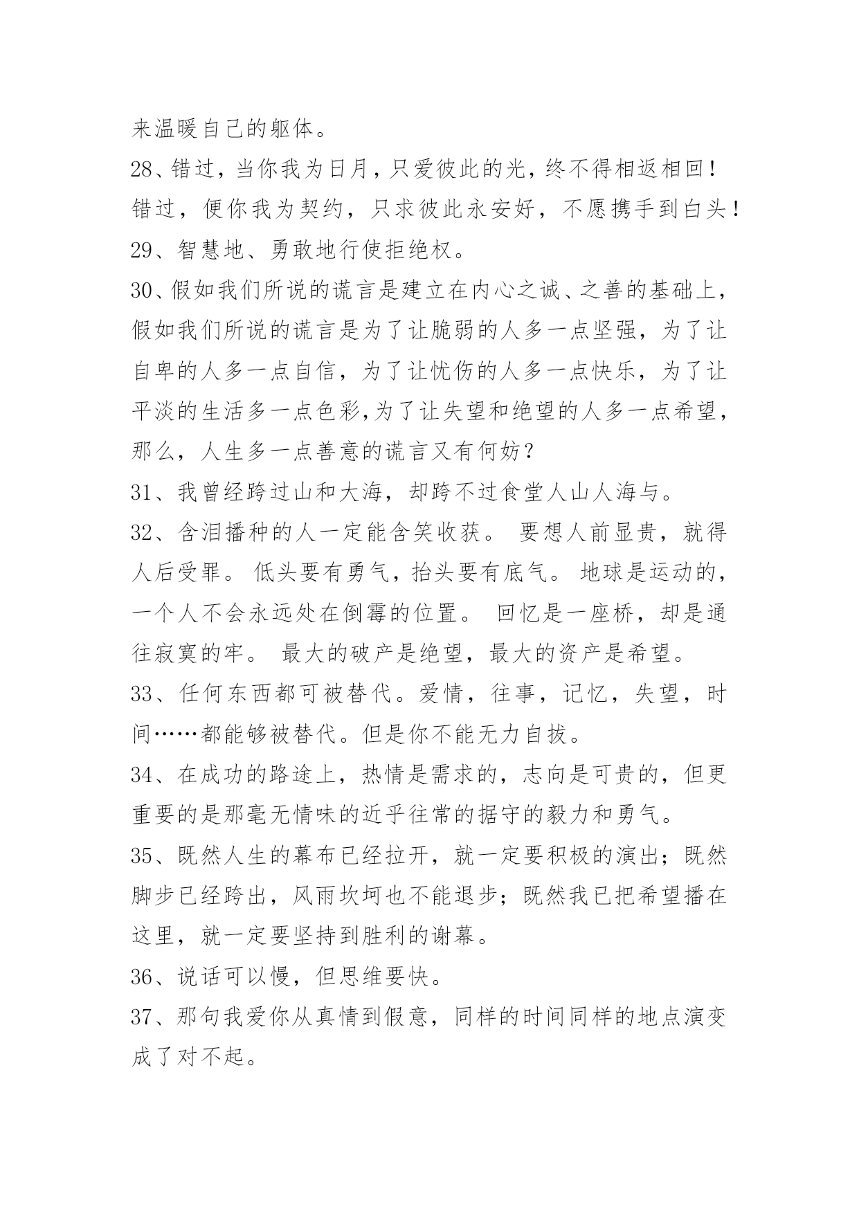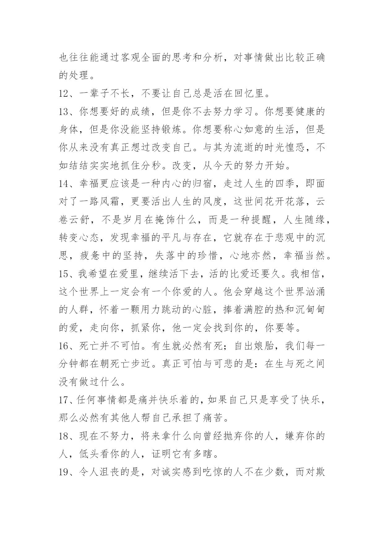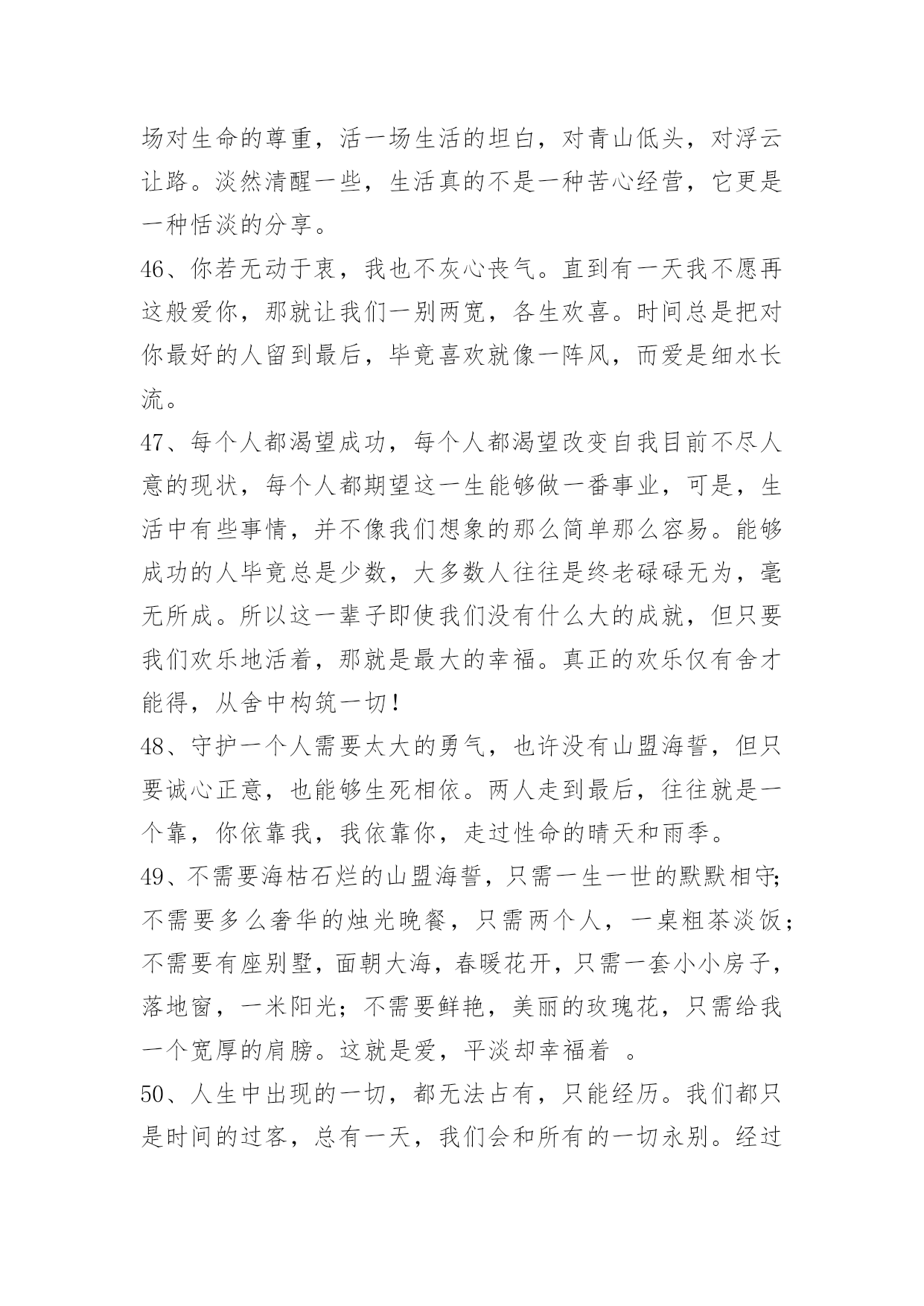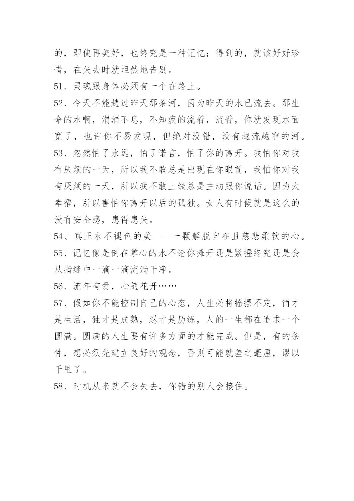 人生感悟句子58条【必备】人生感悟句子集合58条风的方向是由树决定,人的方向是由自已决定。下面是关于人生感悟句子58条,一起来欣赏吧。1、晨起、雾薄。明澈的天空散落着几片流云、淡而清、懒懒的、闲闲的;有风也无风。闲坐窗前、看云烟翩跹、心随云动而空、心空如镜、心静而明。云是白的、没有色彩、所以自在。心是闲的、没有烦恼、所以优哉。只有心静、看什么都是白云静水、看什么都会赏心悦目、看什么都能悟出禅心。2、做人事如意,做事不容易。3、有的人因为怕鱼刺刺到自己,便不再吃鱼。很多人,因为怕做事情的过程中给自己带来伤害,便拒绝了一切的开始。4、问天,淡然静默,素颜清心的人能否握得住片片飘忽的情缘?问地,醉笑红尘,翻云覆雨的手能否托得起缕缕忧伤的命轮?问自己,天涯路远,倾心奔赴的来生可否遇见今生错过的爱人?5、我们每个人都认为自己善良,很多人也愿意去做善事,可我们总是把自己的需求放在他人的需求之前,因而,常常在最需要表现善良的时候却失之交臂。6、在最爱的人面前,你看起来会像个孩子。每个人内心都有个永不长大的孩子,那是本真的天性。所谓的成长与成熟,只是把"童真"锁进了笼子。只有你最爱的人,才能把那"孩子"解放出来。爱是直达内心的时光机,带你回归人性最真纯的状态。但凡圆滑世故的,只因爱得不够。7、落时光的记忆,深夜轻轻打开。你遗落在江南的记忆,蝶舞残红,追逐在梦里兰溪。光阴里,一不小心,错过了这一季花期。流年里回眸,依旧徘徊找觅,那一件,我弄湿了的素衣。凉风摇曳着竹影,飘散相思一地,漫长的夜里,无从拾起,只因太多太多,都是回忆。唯愿,倾听,宫商羽角相思一曲。8、在我还是一个不善言辞,内心倔强,容易脸红,敏感惆怅的小女生的时候,我却耗费了那么长的时间去做了一件这么巨大的毫无目的的事情。或许,相比现在的我,那个我要勇敢得多真诚得多,她更强大,更无畏,更顺从自己的坦荡的内心。9、我们不会永远拥有一件东西,比如财富,即使你拥有得再多,也会有用尽的一灭;比如容貌,即使你现在貌美如花,儿十年之后依然会老去。因此,当我们拥有的离开时,不要哭诉着它的离去,要珍惜自己还拥有的。金钱失去了,你还拥有敏捷的头脑;青春失去了,你还拥有健康的身体。10、人生如棋,黑与白的.交错,每个人的生死烦恼,没有任何可以速成的解决捷径,唯一的办法就是靠自己从修行中获得解脱。就像吃饭一样,自己吃,自己饱,谁也不能帮谁吃饭。我们只能靠自己。11、面对危机,首先要保持冷静,这样即使面对棘手的问题,也往往能通过客观全面的思考和分析,对事情做出比较正确的处理。12、一辈子不长,不要让自己总是活在回忆里。13、你想要好的成绩,但是你不去努力学习。你想要健康的身体,但是你没能坚持锻炼。你想要称心如意的生活,但是你从来没有真正想过改变自己。与其为流逝的时光惶恐,不如结结实实地抓住分秒。改变,从今天的努力开始。14、幸福更应该是一种内心的归宿,走过人生的四季,即面对了一路风霜,更要活出人生的风度,这世间花开花落,云卷云舒,不是岁月在掩饰什么,而是一种提醒,人生随缘,转变心态,发现幸福的平凡与存在,它就存在于悲观中的沉思,疲惫中的坚持,失落中的珍惜,心地亦然,幸福当然。15、我希望在爱里,继续活下去,活的比爱还要久。我相信,这个世界上一定会有一个你爱的人。他会穿越这个世界汹涌的人群,怀着一颗用力跳动的心脏,捧着满腔的热和沉甸甸的爱,走向你,抓紧你,他一定会找到你的,你要等。16、死亡并不可怕。有生就必然有死;自出娘胎,我们每一分钟都在朝死亡步近。真正可怕与可悲的是:在生与死之间没有做过什么。17、任何事情都是痛并快乐着的,如果自己只是享受了快乐,那么必然有其他人帮自己承担了痛苦。18、现在不努力,将来拿什么向曾经抛弃你的人,嫌弃你的人,低头看你的人,证明它有多瞎。19、令人沮丧的是,对诚实感到吃惊的人不在少数,而对欺骗感到吃惊的人却寥寥无几。20、每个人的人生都不同,或许命运有时候会不公,但只要我们努力地去奋斗,时刻谨记"奋斗"二字,我们就能"扼住命运的咽喉",改写命运。21、与螳螂作战,你的胸怀会越来越小。与蜗牛伴跑,你离冠军的宝座不是近了而是远了。22、真的不想继续伤口,也不想再去期待什么。终于在眼泪中,学会了明白。给你最后的疼爱,是手放开。23、轻装上阵,人生会更美好。24、"人生就像一盒巧克力,你永远不知道会尝到哪种滋味为什么说巧克力而不说棒棒糖呢,因为在美国巧克力通常有十二快或二十四块,每个都有不同的包装和口味形状和颜色,以前没有标志。只能拆开放在嘴里,品尝了之后才知道个中滋味。"25、和过去作战,就算头破血流,亦逃脱不了输的结局;与过去纠结,哪怕身心俱疲,亦难有想要的结果。不要计较得太众,多少悲剧,都是源于攀比,过自己的日子,比什么都重要;不要抑郁得太久,错过莫癫狂,失去又何妨,风烈心愈