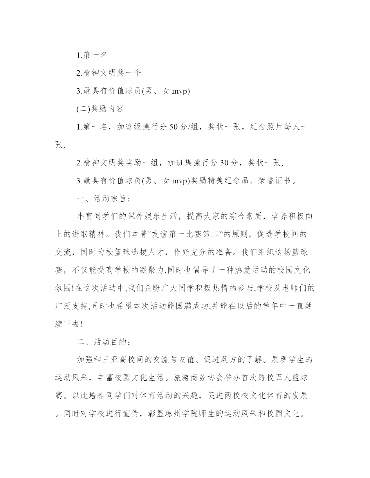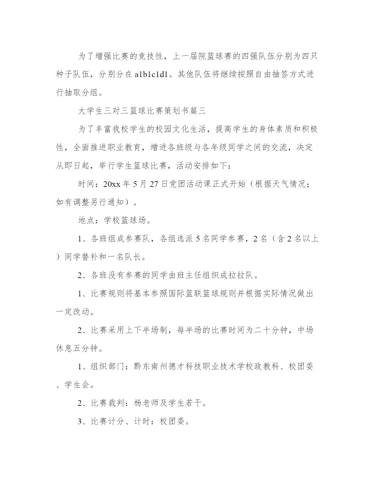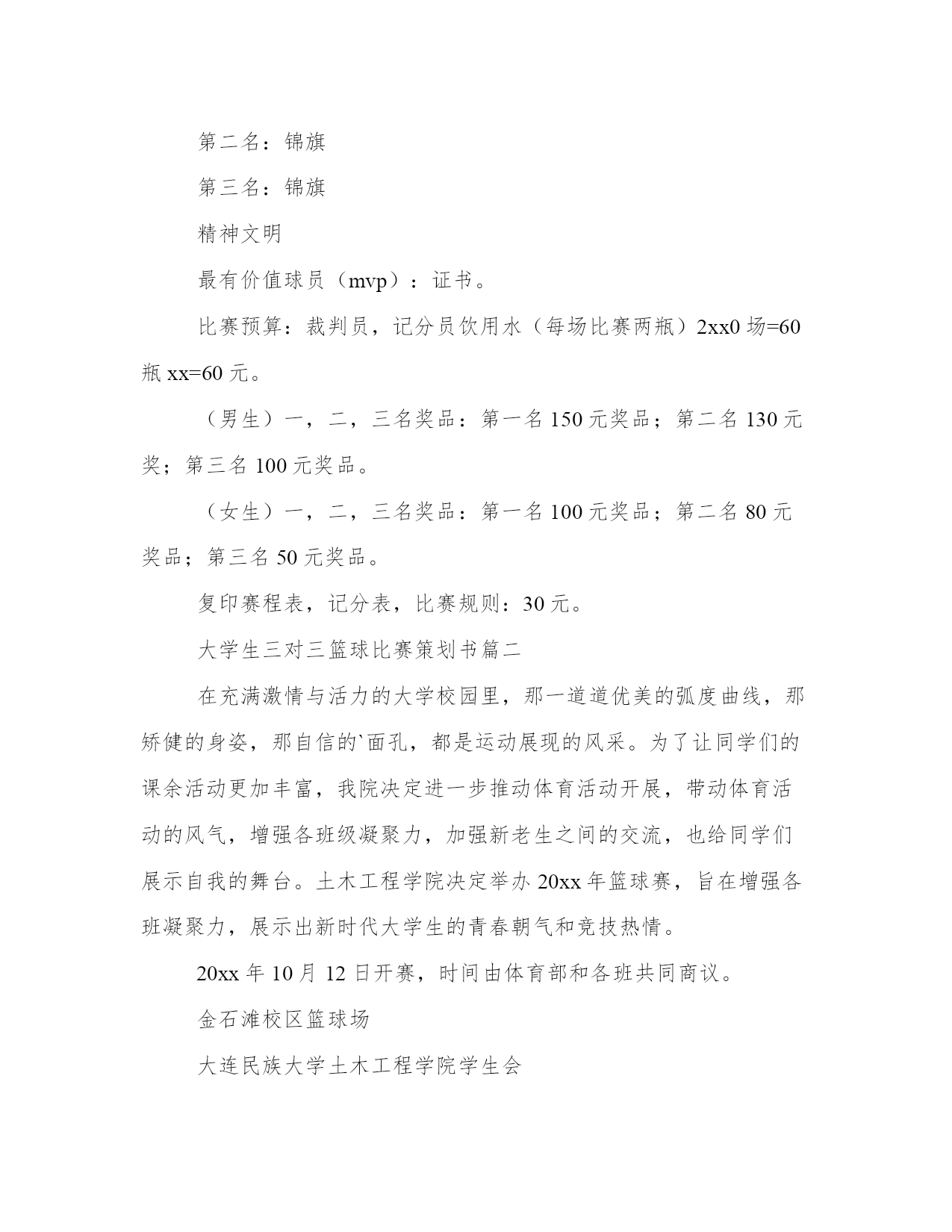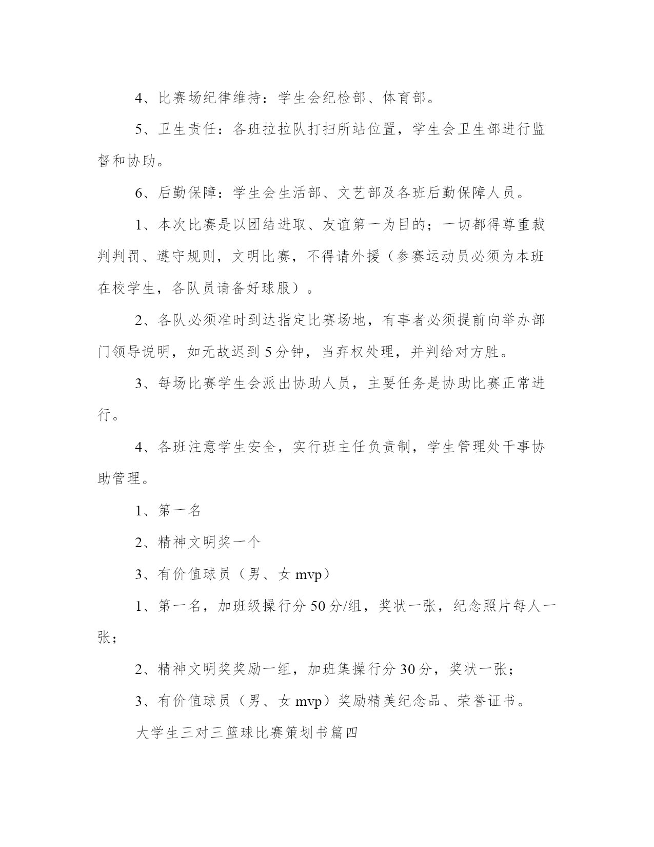 大学生三对三篮球比赛策划书(汇总8篇)无论是身处学校还是步入社会,大家都尝试过写作吧,借助写作也可以提高我们的语言组织能力。大家想知道怎么样才能写一篇比较优质的范文吗?下面是小编帮大家整理的优质范文,仅供参考,大家一起来看看吧。大学生三对三篮球比赛策划书篇一为了丰富同学们课余生活,进一步推动体育活动开展,带动体育活动风气,增强社团凝聚力,也给同学们展现自我的舞台,我xx学院团委定于9月下旬开展院新生篮球联赛。本次活动是我xx学院传统的大型赛事,也是我xx健儿的优势项目。旨在增强各个团队的凝聚力,展示出新时代大学生的蓬勃朝气和竞技热情。在学习之余锻炼身体和意志,注意各种才能的挖掘,培养,展示,同时增加同学之间的交流,促进友谊升华,为美好的大学生活留下灿烂的一笔财富。弘扬奥运精神,增加团队凝聚力,活跃在赛场上,今天的球员,明日的新星。在这个充满活力与光明的时代,有挑战才有财富。我们有理由相信,此次篮球赛将会非常成功,而我们xx学院的篮球健儿们会一如既往,勇往之前,发扬拼搏精神,去卫冕那荣耀的奖杯。今年xx学院又迎来一批新生力量,为了让新成员能尽快融入集体,也为了促进加强班级的沟通交流,我们院团委青年志愿者协会精心策划了班际篮球赛。我们相信,通过我们的努力,本次活动一定能够达到预期的目的。丰富同学们的课外娱乐生活,提高我们的综合素质,培养积极向上的进取精神,致力于打造成一个真正属于信息所有热爱篮球,钟情篮球的学生的节日,致力于打造一个互相交流,互相学习的平台。我们将本着“友谊第一,比赛第二”的原则,以促进部门间成员以及新老成员间的交流和沟通为根本出发点,让本次活动顺利进行。活动时间:20xx年xx月下旬。活动地点:学院篮球场。活动参与对象:xx届新生。活动主题:20xx迎生杯班际篮球赛。活动具体形式:(1)以xx学院各班为单位,进行班际篮球赛。(2)采用循环赛机制进行比赛。(3)具体的比赛配对方式抽签决定。(4)女生以班级的为单位自愿报名参加,如果队伍不超过3个,则取消比赛奖励方法:男生取前3名,并评选精神文明奖,最有价值球员一名;女生只取前3第一名:锦旗,奖品第二名:锦旗第三名:锦旗精神文明最有价值球员(mvp):证书。比赛预算:裁判员,记分员饮用水(每场比赛两瓶)2xx0场=60瓶xx=60元。(男生)一,二,三名奖品:第一名150元奖品;第二名130元奖;第三名100元奖品。(女生)一,二,三名奖品:第一名100元奖品;第二名80元奖品;第三名50元奖品。复印赛程表,记分表,比赛规则:30元。大学生三对三篮球比赛策划书篇二在充满激情与活力的大学校园里,那一道道优美的弧度曲线,那矫健的身姿,那自信的`面孔,都是运动展现的风采。为了让同学们的课余活动更加丰富,我院决定进一步推动体育活动开展,带动体育活动的风气,增强各班级凝聚力,加强新老生之间的交流,也给同学们展示自我的舞台。土木工程学院决定举办20xx年篮球赛,旨在增强各班凝聚力,展示出新时代大学生的青春朝气和竞技热情。20xx年10月12日开赛,时间由体育部和各班共同商议。金石滩校区篮球场大连民族大学土木工程学院学生会1、以班级为单位,参赛队伍队员最少5人。2、在截止日期前,各班直接把名单发到学生会体育部。10月9日(即本周五)1、参赛选手必须为本班级学生(大四联队、工管13级除外)。2、全场比赛采用小组循环―淘汰制。1、各班代表于10月9日晚上进行抽签分组。2、裁判员以及计分由体育部负责。1、时间:本次比赛采用男子2×20分钟的比赛模式,半场的休息时间为5分钟。2、计时:罚球、换人、场外暂停停表,在下半场最后2分钟停表。其他均不停表。(裁判要求停表的情况除外)3、球权:本次比赛仅上半场开始跳球。在比赛过程中是采取球权轮替制。4、加时赛:下半场比赛结束后若仍未分胜负,进入一次或多次的五分钟延长赛,延长赛开始中圈跳球争取球权,中间有两分钟休息时间,下半场开始交换场地交换球权。5、暂停:每队上下半场均可要求两次暂停。延长赛上下半场各一次暂停机会6、犯规:球员犯规满6次即刻离场,该队换上一名替补球员上场。全队每节满7次犯规进入犯规罚球状态。1、比赛中不得有非正规动作出现,比赛遵循友谊第一,比赛第二的原则。2、运动员必须在比赛开始前10分钟签到。如有一方队伍在规定比赛时间后迟到10分钟将以弃权论处。3、裁判必须在比赛开始前10分钟前签到。4、在比赛中严格遵守比赛规程,尊重裁判,服从裁判判决,不得有任何对裁判不文明的行为,比赛过程中要做到尊重对手,不得进行恶意的言语犯规等行为。5篮球赛期间不得以比赛为由迟到旷课早退,违者取消比赛资格,且学院将以严肃处理。1.安全问题:篮球是一项高强度、高