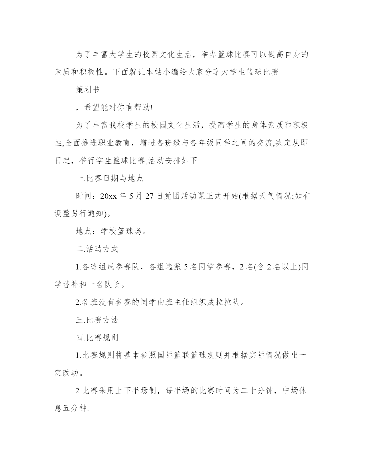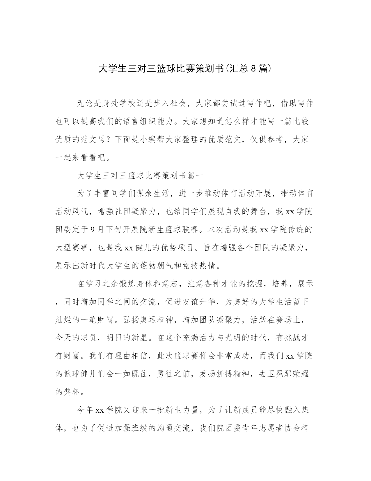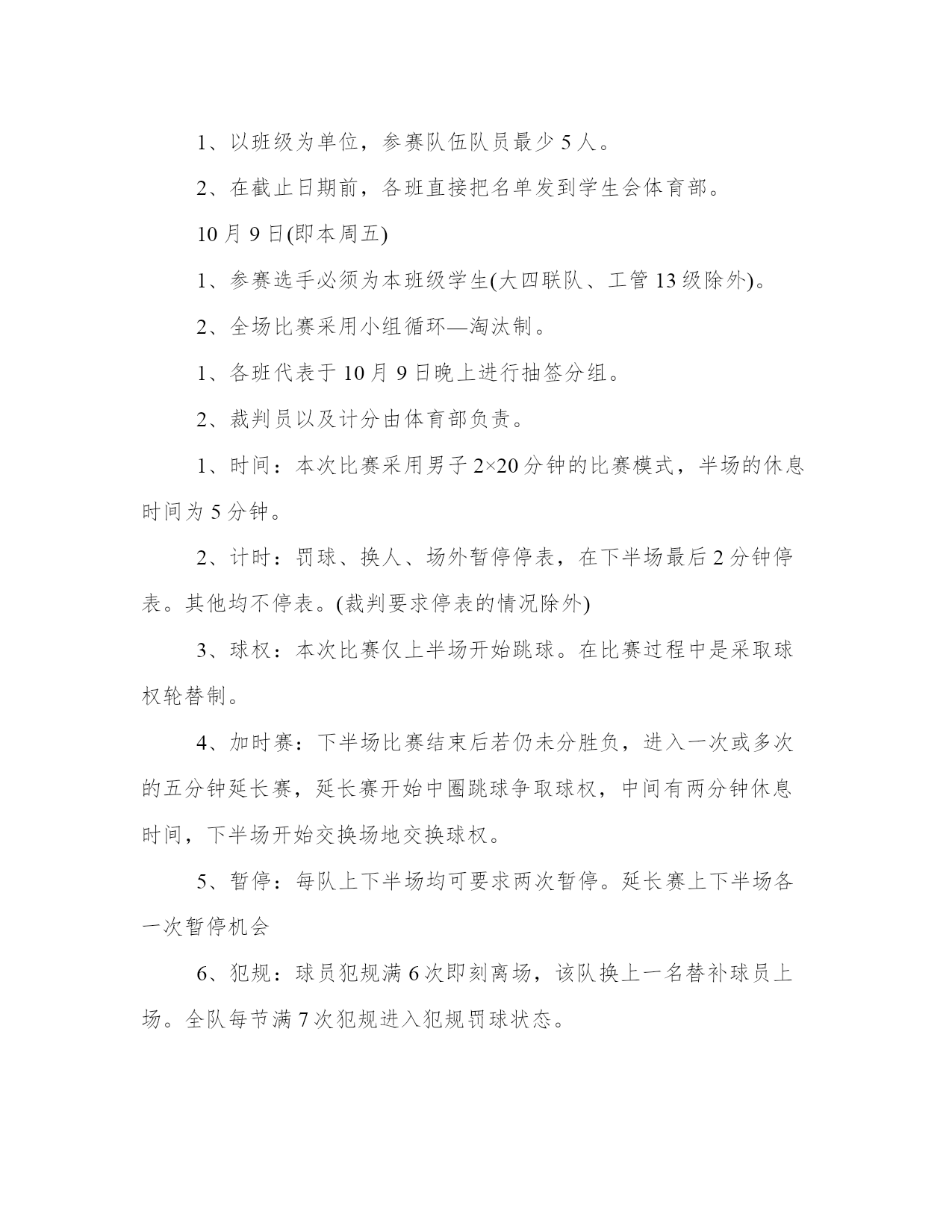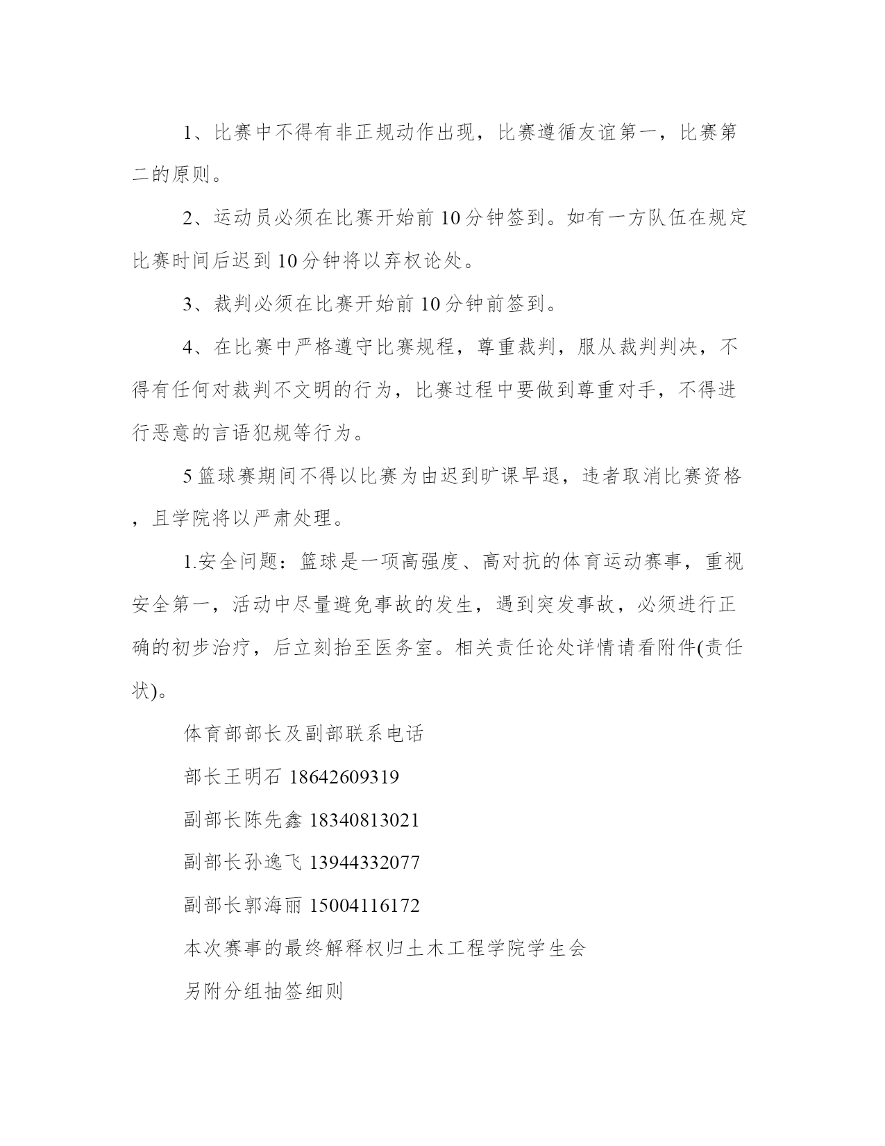 大学生三对三篮球比赛策划书(汇总8篇)无论是身处学校还是步入社会,大家都尝试过写作吧,借助写作也可以提高我们的语言组织能力。大家想知道怎么样才能写一篇比较优质的范文吗?下面是小编帮大家整理的优质范文,仅供参考,大家一起来看看吧。大学生三对三篮球比赛策划书篇一为了丰富同学们课余生活,进一步推动体育活动开展,带动体育活动风气,增强社团凝聚力,也给同学们展现自我的舞台,我xx学院团委定于9月下旬开展院新生篮球联赛。本次活动是我xx学院传统的大型赛事,也是我xx健儿的优势项目。旨在增强各个团队的凝聚力,展示出新时代大学生的蓬勃朝气和竞技热情。在学习之余锻炼身体和意志,注意各种才能的挖掘,培养,展示,同时增加同学之间的交流,促进友谊升华,为美好的大学生活留下灿烂的一笔财富。弘扬奥运精神,增加团队凝聚力,活跃在赛场上,今天的球员,明日的新星。在这个充满活力与光明的时代,有挑战才有财富。我们有理由相信,此次篮球赛将会非常成功,而我们xx学院的篮球健儿们会一如既往,勇往之前,发扬拼搏精神,去卫冕那荣耀的奖杯。今年xx学院又迎来一批新生力量,为了让新成员能尽快融入集体,也为了促进加强班级的沟通交流,我们院团委青年志愿者协会精心策划了班际篮球赛。我们相信,通过我们的努力,本次活动一定能够达到预期的目的。丰富同学们的课外娱乐生活,提高我们的综合素质,培养积极向上的进取精神,致力于打造成一个真正属于信息所有热爱篮球,钟情篮球的学生的节日,致力于打造一个互相交流,互相学习的平台。我们将本着“友谊第一,比赛第二”的原则,以促进部门间成员以及新老成员间的交流和沟通为根本出发点,让本次活动顺利进行。活动时间:20xx年xx月下旬。活动地点:学院篮球场。活动参与对象:xx届新生。活动主题:20xx迎生杯班际篮球赛。活动具体形式:(1)以xx学院各班为单位,进行班际篮球赛。(2)采用循环赛机制进行比赛。(3)具体的比赛配对方式抽签决定。(4)女生以班级的为单位自愿报名参加,如果队伍不超过3个,则取消比赛奖励方法:男生取前3名,并评选精神文明奖,最有价值球员一名;女生只取前3第一名:锦旗,奖品第二名:锦旗第三名:锦旗精神文明最有价值球员(mvp):证书。比赛预算:裁判员,记分员饮用水(每场比赛两瓶)2xx0场=60瓶xx=60元。(男生)一,二,三名奖品:第一名150元奖品;第二名130元奖;第三名100元奖品。(女生)一,二,三名奖品:第一名100元奖品;第二名80元奖品;第三名50元奖品。复印赛程表,记分表,比赛规则:30元。大学生三对三篮球比赛策划书篇二在充满激情与活力的大学校园里,那一道道优美的弧度曲线,那矫健的身姿,那自信的`面孔,都是运动展现的风采。为了让同学们的课余活动更加丰富,我院决定进一步推动体育活动开展,带动体育活动的风气,增强各班级凝聚力,加强新老生之间的交流,也给同学们展示自我的舞台。土木工程学院决定举办20xx年篮球赛,旨在增强各班凝聚力,展示出新时代大学生的青春朝气和竞技热情。20xx年10月12日开赛,时间由体育部和各班共同商议。金石滩校区篮球场大连民族大学土木工程学院学生会1、以班级为单位,参赛队伍队员最少5人。2、在截止日期前,各班直接把名单发到学生会体育部。10月9日(即本周五)1、参赛选手必须为本班级学生(大四联队、工管13级除外)。2、全场比赛采用小组循环―淘汰制。1、各班代表于10月9日晚上进行抽签分组。2、裁判员以及计分由体育部负责。1、时间:本次比赛采用男子2×20分钟的比赛模式,半场的休息时间为5分钟。2、计时:罚球、换人、场外暂停停表,在下半场最后2分钟停表。其他均不停表。(裁判要求停表的情况除外)3、球权:本次比赛仅上半场开始跳球。在比赛过程中是采取球权轮替制。4、加时赛:下半场比赛结束后若仍未分胜负,进入一次或多次的五分钟延长赛,延长赛开始中圈跳球争取球权,中间有两分钟休息时间,下半场开始交换场地交换球权。5、暂停:每队上下半场均可要求两次暂停。延长赛上下半场各一次暂停机会6、犯规:球员犯规满6次即刻离场,该队换上一名替补球员上场。全队每节满7次犯规进入犯规罚球状态。1、比赛中不得有非正规动作出现,比赛遵循友谊第一,比赛第二的原则。2、运动员必须在比赛开始前10分钟签到。如有一方队伍在规定比赛时间后迟到10分钟将以弃权论处。3、裁判必须在比赛开始前10分钟前签到。4、在比赛中严格遵守比赛规程,尊重裁判,服从裁判判决,不得有任何对裁判不文明的行为,比赛过程中要做到尊重对手,不得进行恶意的言语犯规等行为。5篮球赛期间不得以比赛为由迟到旷课早退,违者取消比赛资格,且学院将以严肃处理。1.安全问题:篮球是一项高强度、高