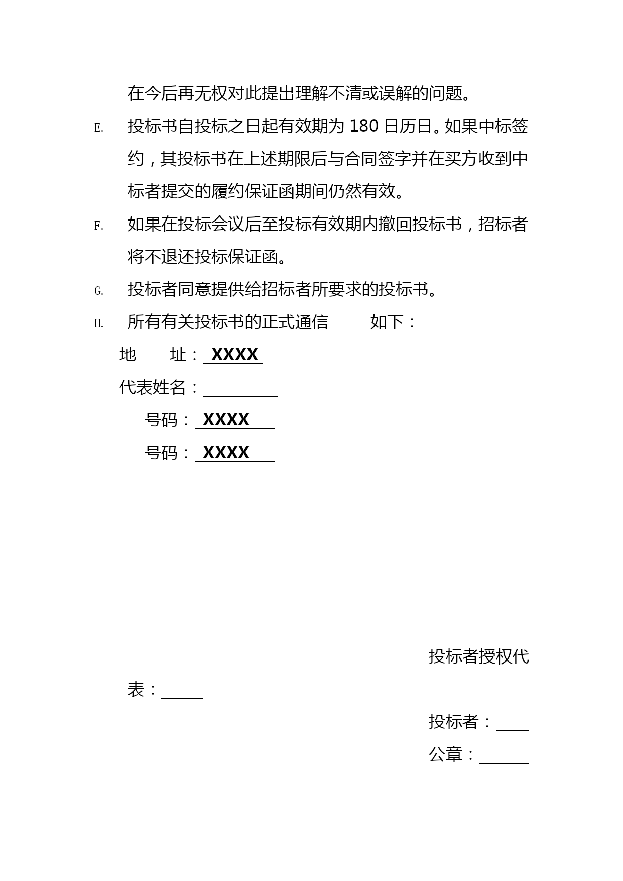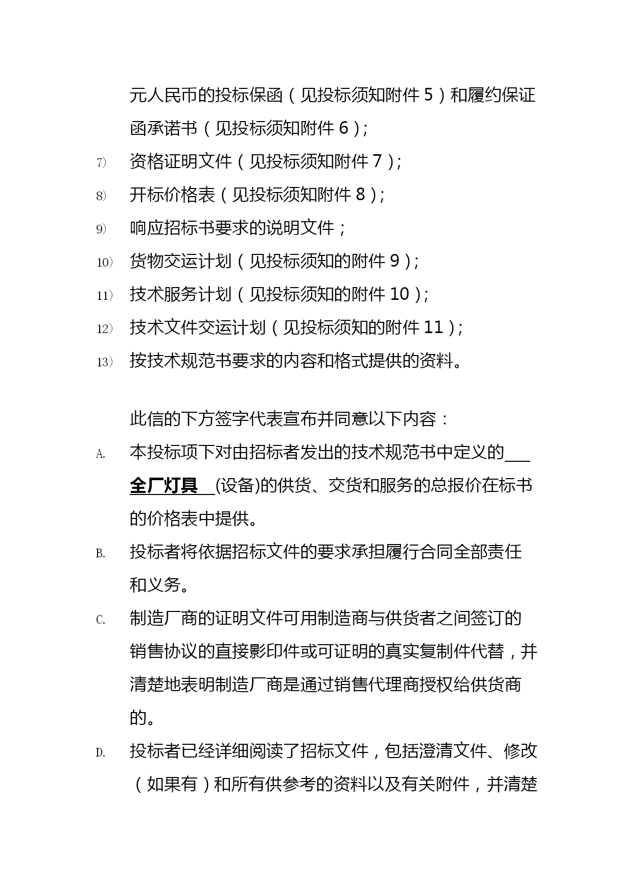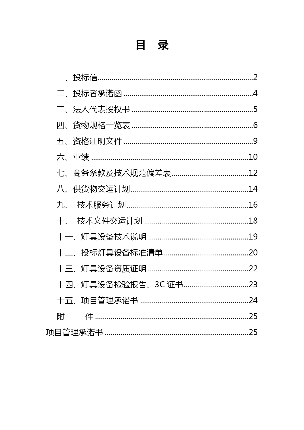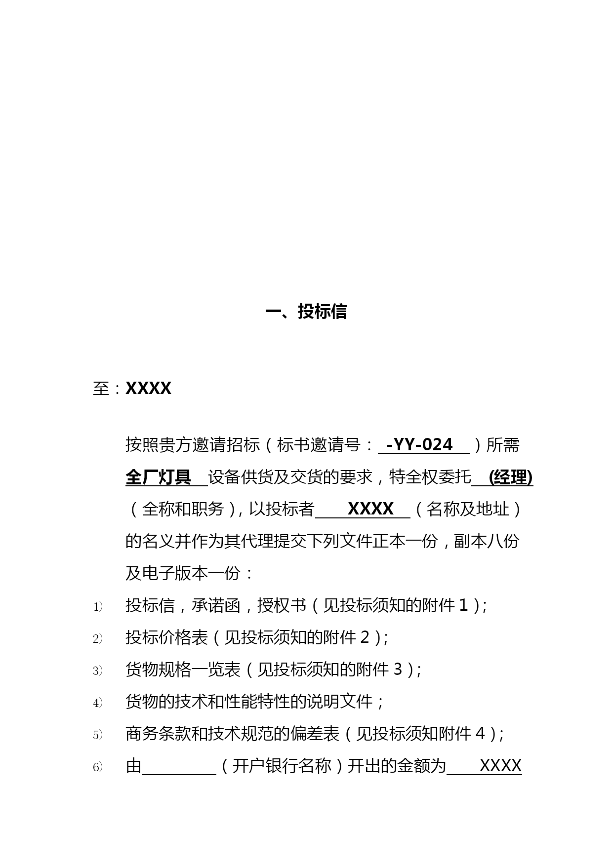 灯具购置投标书(完整版)资料(可以直接使用,可编辑优秀版资料,欢迎下载)目录TOC\o"1-4"\h\uHYPERLINK\l_Toc7482一、投标信PAGEREF_Toc74822HYPERLINK\l_Toc13600二、投标者承诺函PAGEREF_Toc136004HYPERLINK\l_Toc22380三、法人代表授权书PAGEREF_Toc223805HYPERLINK\l_Toc25599四、货物规格一览表PAGEREF_Toc255996HYPERLINK\l_Toc3986五、资格证明文件PAGEREF_Toc39869HYPERLINK\l_Toc21993六、业绩PAGEREF_Toc2199310HYPERLINK\l_Toc12513七、商务条款及技术规范偏差表PAGEREF_Toc1251312HYPERLINK\l_Toc14957八、供货物交运计划PAGEREF_Toc1495714HYPERLINK\l_Toc8475九、技术服务计划PAGEREF_Toc847516HYPERLINK\l_Toc11022十、技术文件交运计划PAGEREF_Toc1102218HYPERLINK\l_Toc15217十一、灯具设备技术说明PAGEREF_Toc1521719HYPERLINK\l_Toc1799十二、投标灯具设备标准清单PAGEREF_Toc179920HYPERLINK\l_Toc22457十三、灯具设备资质证明PAGEREF_Toc2245722HYPERLINK\l_Toc3638十四、灯具设备检验报告、3C证书PAGEREF_Toc363823HYPERLINK\l_Toc26673十五、项目管理承诺书PAGEREF_Toc2667324HYPERLINK\l_Toc15445附件PAGEREF_Toc1544525HYPERLINK\l_Toc19036项目管理承诺书PAGEREF_Toc1903625一、投标信至:XXXX按照贵方邀请招标(标书邀请号:-YY-024)所需全厂灯具设备供货及交货的要求,特全权委托(经理)(全称和职务),以投标者XXXX(名称及地址)的名义并作为其代理提交下列文件正本一份,副本八份及电子版本一份:投标信,承诺函,授权书(见投标须知的附件1);投标价格表(见投标须知的附件2);货物规格一览表(见投标须知的附件3);货物的技术和性能特性的说明文件;商务条款和技术规范的偏差表(见投标须知附件4);由(开户银行名称)开出的金额为XXXX元人民币的投标保函(见投标须知附件5)和履约保证函承诺书(见投标须知附件6);资格证明文件(见投标须知附件7);开标价格表(见投标须知附件8);响应招标书要求的说明文件;货物交运计划(见投标须知的附件9);技术服务计划(见投标须知的附件10);技术文件交运计划(见投标须知的附件11);按技术规范书要求的内容和格式提供的资料。此信的下方签字代表宣布并同意以下内容:本投标项下对由招标者发出的技术规范书中定义的全厂灯具(设备)的供货、交货和服务的总报价在标书的价格表中提供。投标者将依据招标文件的要求承担履行合同全部责任和义务。制造厂商的证明文件可用制造商与供货者之间签订的销售协议的直接影印件或可证明的真实复制件代替,并清楚地表明制造厂商是通过销售代理商授权给供货商的。投标者已经详细阅读了招标文件,包括澄清文件、修改(如果有)和所有供参考的资料以及有关附件,并清楚在今后再无权对此提出理解不清或误解的问题。投标书自投标之日起有效期为180日历日。如果中标签约,其投标书在上述期限后与合同签字并在买方收到中标者提交的履约保证函期间仍然有效。如果在投标会议后至投标有效期内撤回投标书,招标者将不退还投标保证函。投标者同意提供给招标者所要求的投标书。所有有关投标书的正式通信如下:地址:XXXX代表姓名:号码:XXXX号码:XXXX投标者授权代表:投标者:公章:二、投标者承诺函项目名称:XXXXXXXX日期:-5-9XXXX:我代表XXXX(投标单位名称),在此做如下承诺:完全理解和接受招标文件的一切规定和要求。商务投标报价为固定价。即在投标有效期和合同有效期内,该投标报价固定不变。若中标,我方将按照招标文件的具体规定与项目法人签
