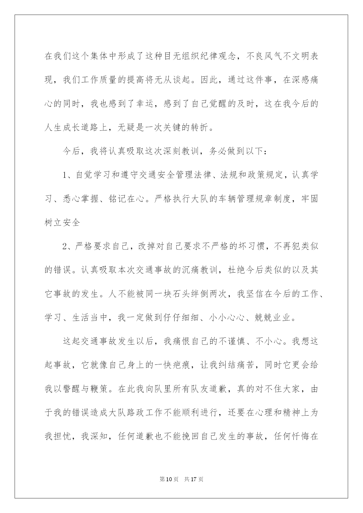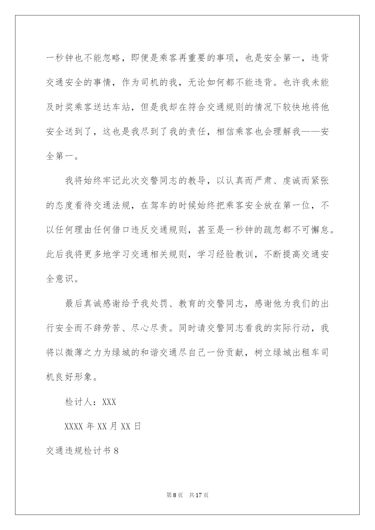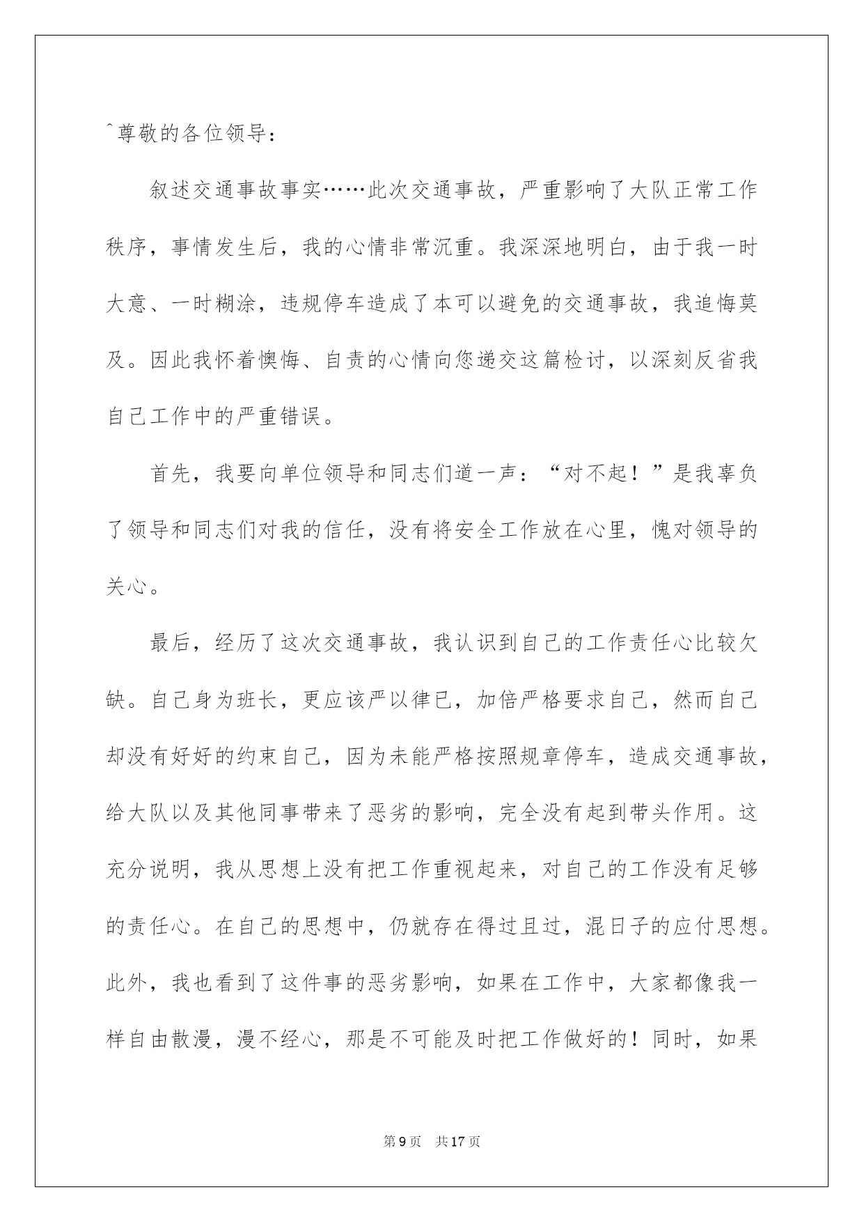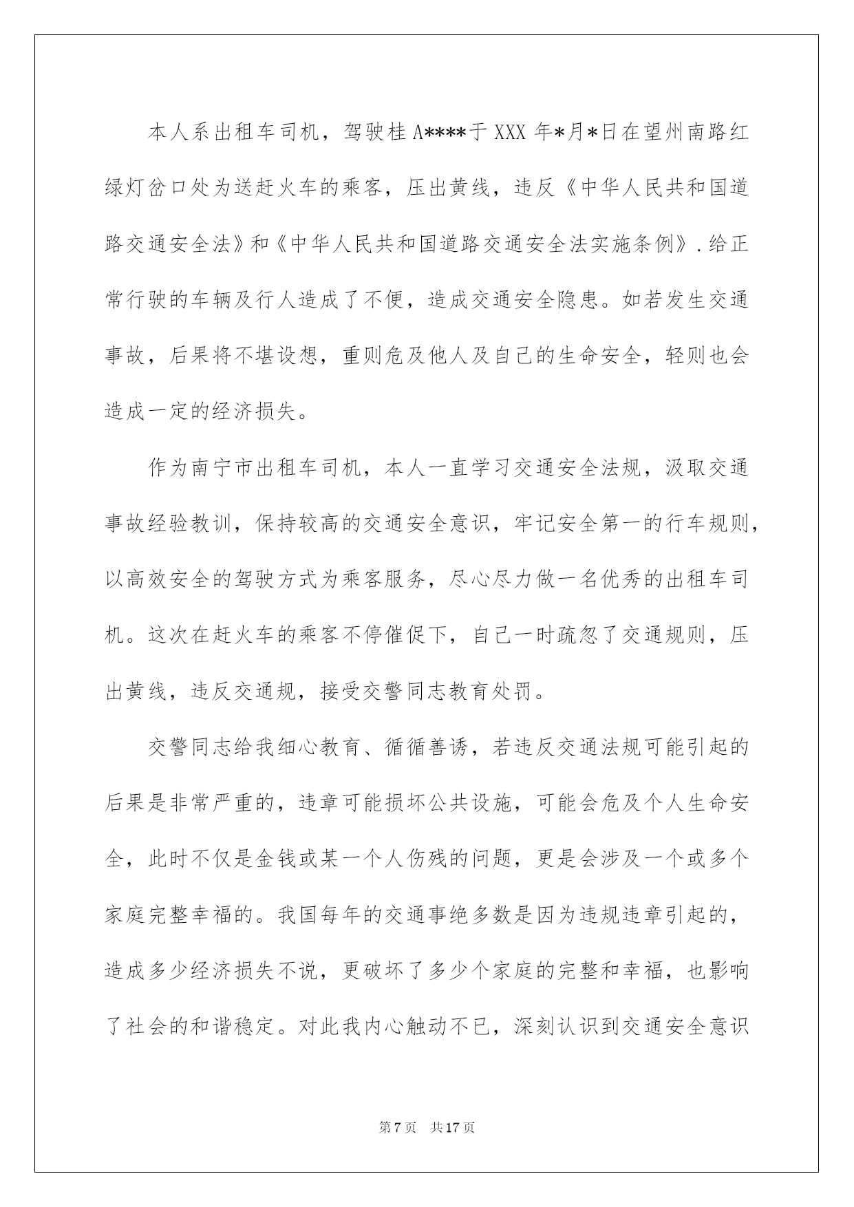 第PAGE\*Arabic\*MERGEFORMAT17页共NUMPAGES\*Arabic\*MERGEFORMAT17页第PAGE\*MERGEFORMAT17页共NUMPAGES\*MERGEFORMAT17页第PAGE\*MERGEFORMAT17页共NUMPAGES\*MERGEFORMAT17页第PAGE\*MERGEFORMAT17页共NUMPAGES\*MERGEFORMAT17页第PAGE\*MERGEFORMAT17页共NUMPAGES\*MERGEFORMAT17页第PAGE\*MERGEFORMAT17页共NUMPAGES\*MERGEFORMAT17页第PAGE\*MERGEFORMAT17页共NUMPAGES\*MERGEFORMAT17页第PAGE\*MERGEFORMAT17页共NUMPAGES\*MERGEFORMAT17页第PAGE\*MERGEFORMAT17页共NUMPAGES\*MERGEFORMAT17页第PAGE\*MERGEFORMAT17页共NUMPAGES\*MERGEFORMAT17页第PAGE\*MERGEFORMAT17页共NUMPAGES\*MERGEFORMAT17页2022交通违规检讨书交通违规检讨书在学习、工作或生活中出现了问题或过错后,需要写检讨书来好好地检讨,写检讨书是为了能够不断提醒自己。你还在对写检讨书感到一筹莫展吗?下面是我收集整理的交通违规检讨书,欢迎大家借鉴与参考,希望对大家有所帮助。交通违规检讨书1敬爱的交警同志:由于我刚刚获取驾驶执照不到半年时间,对于当地路况不是太熟悉,在近三个月的驾驶机动车时间里多次违反道路交通法规,给本市交通秩序带来一定的影响。我对于自己的这一系列交通违反行为,深深地向你表示抱歉,并且表示愿意接受交警部门的处罚。我通过此次检讨,深刻地剖析自己错误的各项原因,基本的检讨如下:第一,我在主观上并未对于交通法规引起十分强烈的遵守意识,才会在这种情况下随意上路,造成一些违规情况的发生。第二,是我的驾驶技术尚不成熟,比较是我刚刚获取驾驶执照不到半年时间,这属于客观上的不足。第三,由于有时候经过一天的工作,身体有些疲劳了,导致我疲劳驾驶,这也是我主观方面的一大过失。敬爱的交警同志,经过这次教训,我会深刻反省自己的错误,认真查看交通安全规则,交警同志对我的教育,我已经深深地印刻在我的脑海里了。最后,感谢交警同志对我的教诲。此致:抱歉!交通违规检讨书2尊敬的安委会领导同志们:首先,我公司对20xx年行为按照交规罚款规定处罚,一般违章行为的按照交规罚款规定一般进行处罚。最后,请安委会领导和同志看我公司的实际行动,从基层抓起,责任到每个人,经常性的组织相关司机学习交通法规,杜绝此类事情的发生。XX监理咨询有限公司20xx年1月7日交通违规检讨书3尊敬的贺警官:非常遗憾地向您递交这份检讨书,我的车辆川A593BQ在凤溪大道中段路上乱停、乱靠,违反了交通法规。我的车辆违章停车,严重地占用了机动车道路,给来往行人造成了不方便,给城市市容市貌抹黑,也让您为此劳累伤心。面对错误,我真的感到非常的伤心难过。对此,我表示愿意接受领导与群众们的批评教育。此时此刻,我深刻地意识到了我这种行为的恶劣性。我这样占用马路的行为是不道德,不文明,不提倡的。经过交警同志苦口婆心的批评教育后,我深刻认识到了这种行为的不道德和交通隐患危险性,极易造成他人或车辆的安全隐患,导致意想不到的、本该完全避免的事故或意外发生。以后我不光是从自己做起,杜绝随处乱停的坏毛病,还要劝导其他像我这种行为的同志们,大家共同遵守和维护好交通秩序。十分感谢交警同志对我的批评教育,充分体现了警民和谐,让我改变了以往对交警敬礼只会罚款扣分的印象,对于我违章停车的行为再次感到羞耻。此致敬礼检讨人:x年x月x日交通违规检讨书4尊敬的xx警官:非常遗憾地向您递交这份检讨书,我的车辆川A593BQ在凤溪大道中段路上乱停、乱靠,违反了交通法规。我的车辆违章停车,严重地占用了机动车道路,给来往行人造成了不方便,给城市市容市貌抹黑,也让您为此劳累伤心。面对错误,我真的感到非常的伤心难过。对此,我表示愿意接受领导与群众们的批评教育。此时此刻,我深刻地意识到了我这种行为的恶劣性。我这样占用马路的行为是不道德,不文明,不提倡的。经过交警同志苦口婆心的批评教育后,我深刻认识到了这种行为的不道德和交通隐患危险性,极易造成他人或车辆的安全隐患,导致意想不到的、本该完全避免的事故或意外发生。以后我不光是从自己做起,杜绝随处乱停的坏毛病,还要劝导其他像我这种行为的同志们,大家