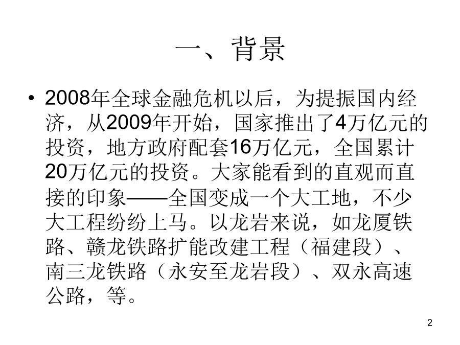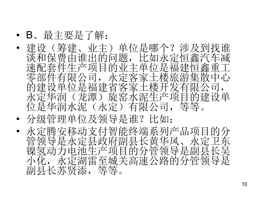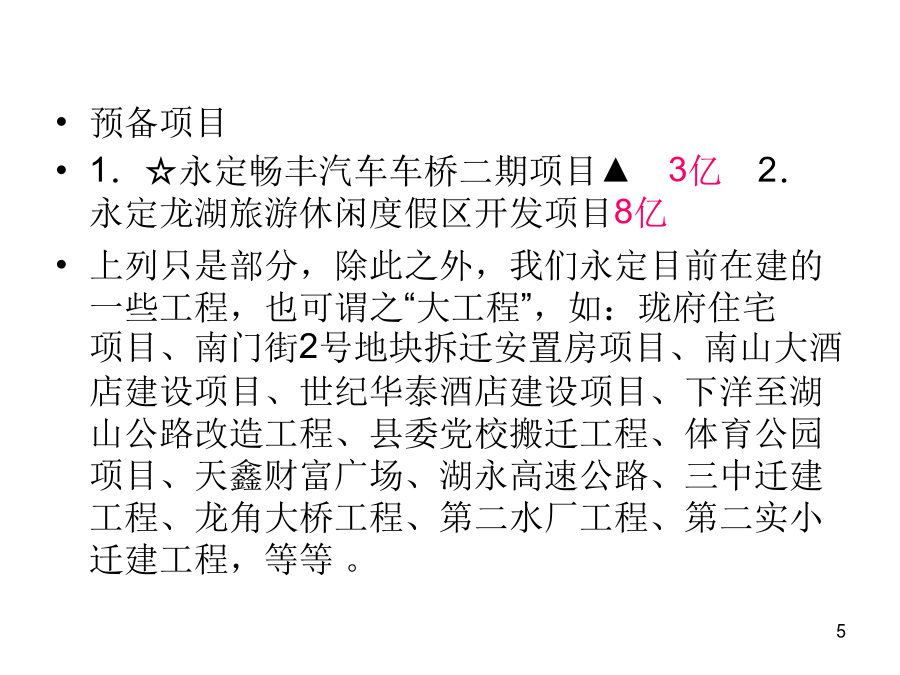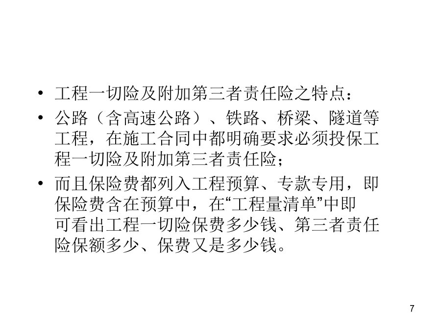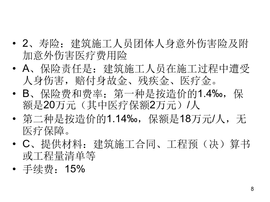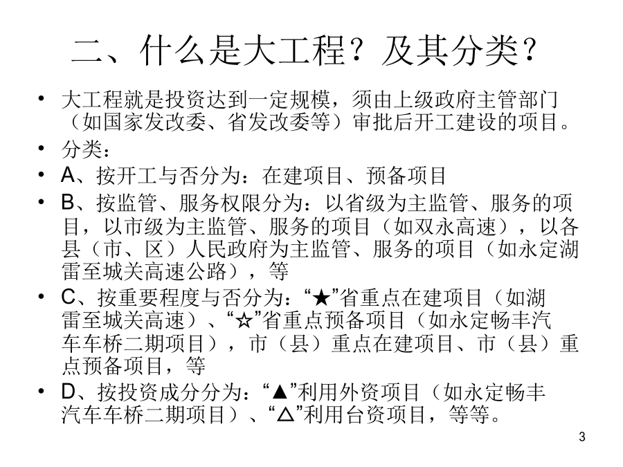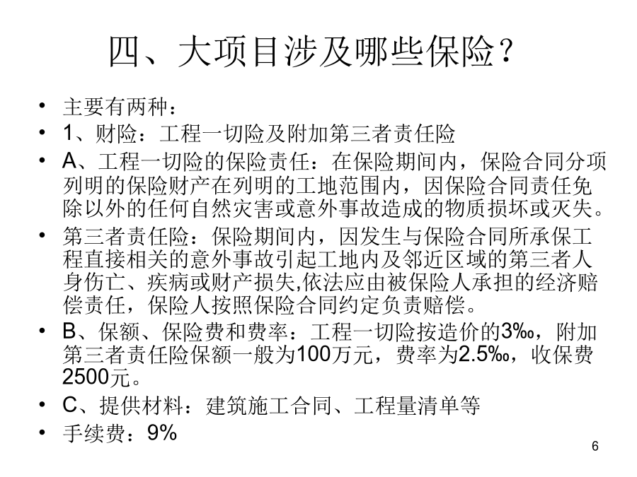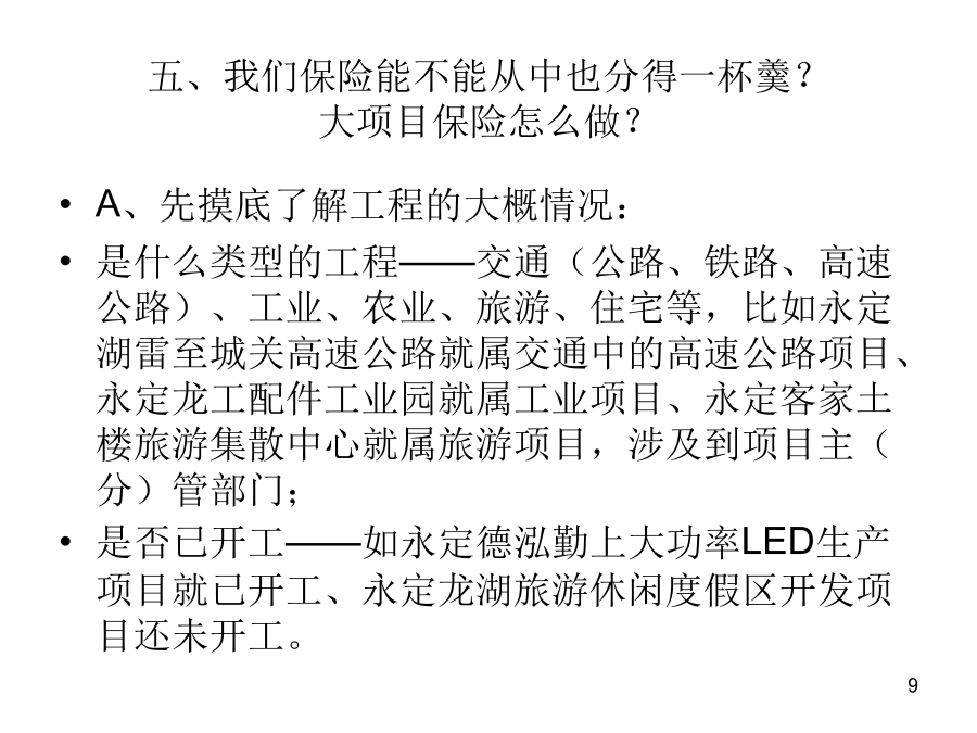 大工程项目保险的拓展一、背景二、什么是大工程?及其分类?三、永定的在建、预备大项目主要有哪些?预备项目1.☆永定畅丰汽车车桥二期项目▲3亿2.永定龙湖旅游休闲度假区开发项目8亿上列只是部分,除此之外,我们永定目前在建的一些工程,也可谓之“大工程”,如:珑府住宅项目、南门街2号地块拆迁安置房项目、南山大酒店建设项目、世纪华泰酒店建设项目、下洋至湖山公路改造工程、县委党校搬迁工程、体育公园项目、天鑫财富广场、湖永高速公路、三中迁建工程、龙角大桥工程、第二水厂工程、第二实小迁建工程,等等。四、大项目涉及哪些保险?工程一切险及附加第三者责任险之特点:公路(含高速公路)、铁路、桥梁、隧道等工程,在施工合同中都明确要求必须投保工程一切险及附加第三者责任险;而且保险费都列入工程预算、专款专用,即保险费含在预算中,在“工程量清单”中即可看出工程一切险保费多少钱、第三者责任险保额多少、保费又是多少钱。2、寿险:建筑施工人员团体人身意外伤害险及附加意外伤害医疗费用险A、保险责任是:建筑施工人员在施工过程中遭受人身伤害,赔付身故金、残疾金、医疗金。B、保险费和费率:第一种是按造价的1.4‰,保额是20万元(其中医疗保额2万元)/人第二种是按造价的1.14‰,保额是18万元/人,无医疗保障。C、提供材料:建筑施工合同、工程预(决)算书或工程量清单等手续费:15%五、我们保险能不能从中也分得一杯羹?大项目保险怎么做?B、最主要是了解:建设(筹建、业主)单位是哪个?涉及到找谁谈和保费由谁出的问题,比如永定恒鑫汽车减速配套件生产项目的业主单位是福建恒鑫重工零部件有限公司,永定客家土楼旅游集散中心的建设单位是福建省客家土楼开发有限公司,永定华润(龙潭)旋窑水泥生产项目的建设单位是华润水泥(永定)有限公司,等等。分级管理单位及领导是谁?比如:永定腾安移动支付智能终端系列产品项目的分管领导是永定县政府副县长黄华凤、永定卫东镍氢动力电池生产项目的分管领导是副县长吴小化,永定湖雷至城关高速公路的分管领导是副县长苏贤添,等等。C、是否涉及银行贷款和其它信息。若向银行贷款,银行从防范风险的角度,往往会要求该项目向某家保险公司投保相关保险,主动权在银行。投资规模或进度及工程进展情况等其它方面的更详细的信息,可在政府部门或业主单位的网站上查询,也可查阅相关部门编制的重点建设项目目录等材料。如:龙岩市发展和改革委员会与龙岩市重点项目开发建设领导小组办公室编制的《龙岩市2011年重点项目年度工作目标安排》就可看出项目的一些较为具体的信息,从中可看到“项目名称、建设内容及规模、建设年限、总投资、至某个时间段已累计完成投资多少、至某个时间段预计工作或工程进展情况、年度工作目标(一年中的每个月分别计划投资多少)、进度或工程进展情况、建设(筹建)单位、分级管理单位及领导、投资主体性质、项目建成达产后年新增效益”,等等。再如《2011年福建省重点建设在建项目(367个)》和《2011年福建省重点建设预备项目(159个)》。六、我们能为大项目保险做什么?怎么做?由谁来“三陪”?七、成功案例和精英大项目就相当于寿险中的“高端客户”,高端客户要采用高端的手法来攻关,伙伴们可以争取通过办理高端业务,来使自己的展业技能和保险业务水平得到提升,使自己站在保险业的高端!养老,为老而养,因老而敬养,养,是给生命一个完美的交代,一个洒脱的从容。购买福禄满堂、福禄金尊、福禄双喜,就是给生命一个完美的交代、一个洒脱的从容!谢谢各位!