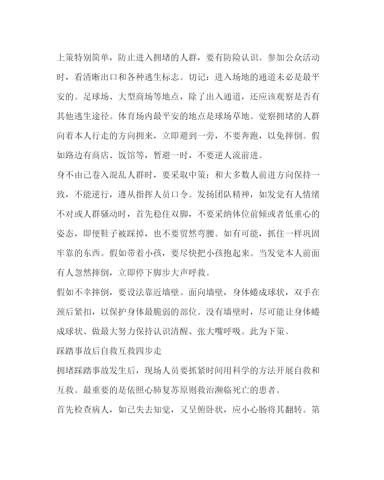 政教处范文之学生防止踩踏伤措施在校学生,面对踩踏事故时候应该做到以下10点:(1)举止文明,人多的时候不拥堵、不起哄、不制造紧张或恐慌气氛。(2)尽量防止到拥堵的人群中,不得已时,尽量走在人流的边缘。(3)觉察拥堵的人群向本人行走的方向来时,应立即避到一旁,不要慌乱,不要奔跑,防止摔倒。(4)顺着人流走,切不可逆着人流前进,否则,特别容易被人流推倒。(5)假设堕入拥堵的人流时,一定要先站稳,身体不要倾斜失去重心,即便鞋子被踩掉,也不要弯腰捡鞋子或系鞋带。有可能的话,可先尽快抓住巩固可靠的东西渐渐走动或停住,待人群过去后再迅速离开现场。(6)假设本人不幸被人群拥倒后,要设法靠近墙角,身体蜷成球状,双手在颈后紧扣以保护身体最脆弱的部位。(7)在人群中走动,遇到台阶或楼梯时,尽量抓住扶手,防止摔倒。(8)在拥堵的人群中,要时刻保持警觉,当发觉有人情绪不对,或人群开场骚动时,就要做好预备保护本人和别人。(9)在人群骚动时,脚下要留意些,千万不能被绊倒,防止本人成为拥堵踩踏事件的诱发要素。(10)当发觉本人前面有人忽然摔倒了,立即要停下脚步,同时大声呼救,告知后面的人不要向前靠近。三招两式防止踩踏伤公共场所发生人群拥堵踩踏事件特别危险,在球场、商场、狭窄的街道、影院等,发生拥堵事故后如何采取最正确的对策以增加生还的时机,对每个一般市民都是十分重要的。面临地震、火灾,各有逃生招数面临地震、火灾等突发灾难时,应依照详细情况选择迅速逃离或是防止卷入拥堵的人群。火灾最大的“杀手”是燃烧时产生的毒烟雾。研究说明,空气中一氧化碳含量为1%时,人呼吸数次后就会昏迷,一至两分钟便可死亡。因而,遇上火灾,必须迅速疏散逃生。而特别多火灾现场调查发觉,由于出口狭窄、逃生人群过于拥堵,特别多遇难者可能死于踩踏,并直截了当堵住出口。因而,假如发觉太多的人群涌向出口并发生踩踏时应离开人群,用湿毛巾将鼻子和嘴捂住、贴近地面爬行、滚到无人的墙边,可能增加生还的时机。地震时,最正确的选择不是随拥堵的人群挤向窄小的出口,而是迅速躲避。假如地震的时候恰巧在大型公共场所,最好的方法是躲在排椅下面。假如正在上课,能够躲在课桌下。防止偶发踩踏事件,有上中下三策对偶发要素导致的踩踏事件,有上、中、下三策。上策特别简单,防止进入拥堵的人群,要有防险认识。参加公众活动时,看清晰出口和各种逃生标志。切记:进入场地的通道未必是最平安的。足球场、大型商场等地点,除了出入通道,还应该观察是否有其他逃生途径。体育场内最平安的地点是球场草地。觉察拥堵的人群向着本人行走的方向拥来,立即避到一旁,不要奔跑,以免摔倒。假如路边有商店、饭馆等,暂避一时,不要逆人流前进。身不由己卷入混乱人群时,要采取中策:和大多数人前进方向保持一致,不能逆行,遵从指挥人员口令。发扬团队精神,如发觉有人情绪不对或人群骚动时,首先稳住双脚,不要采纳体位前倾或者低重心的姿态,即便鞋子被踩掉,也不要贸然弯腰。如有可能,抓住一样巩固牢靠的东西。假如带着小孩,要尽快把小孩抱起来。当发觉本人前面有人忽然摔倒,立即停下脚步大声呼救。假如不幸摔倒,要设法靠近墙壁。面向墙壁,身体蜷成球状,双手在颈后紧扣,以保护身体最脆弱的部位。没有墙壁时,尽可能让身体蜷成球状、做最大努力保持认识清醒、张大嘴呼吸。此为下策。踩踏事故后自救互救四步走拥堵踩踏事故发生后,现场人员要抓紧时间用科学的方法开展自救和互救。最重要的是依照心肺复苏原则救治濒临死亡的患者。首先检查病人,如已失去知觉,又呈俯卧状,应小心肠将其翻转。第二步:保持病人呼吸道畅通,使病人头后仰,防止因舌根后坠堵塞喉部。第三步:假设病人确已无呼吸,立即进展口对口人工呼吸。假如病人在恢复呼吸后出现呕吐,须防止呕吐物进入气管。第四步:抢救者一手放在病人额头上,使其维持头部后仰,另一手指尖轻摸位于气管或喉两侧的颈动脉血管,感受有无脉搏跳动,如有则说明心跳恢复,抢救成功,假如没有,说明心跳尚未恢复,需立即作胸外心脏按压术。每个人的生命都只有一次,面对着不测的灾祸,唯有做好充分的预备,才能获得最大的生存时机。