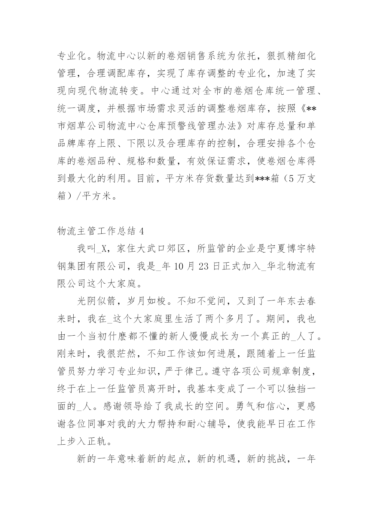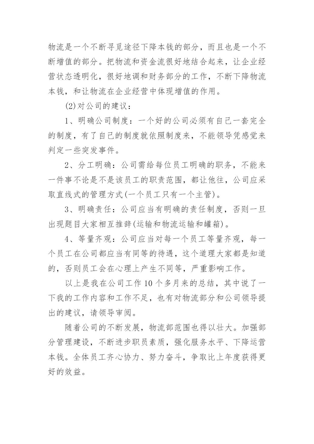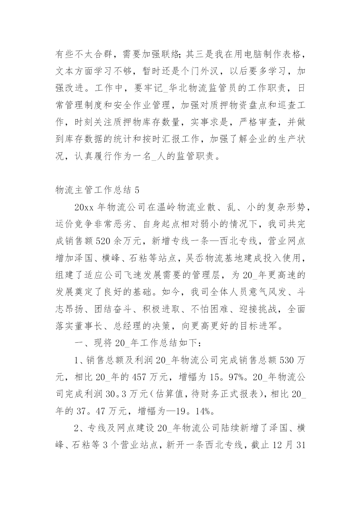 物流主管工作总结总结是指对某一阶段的工作、学习或思想中的经验或情况进行分析研究,做出带有规律性结论的书面材料,它是增长才干的一种好办法,为此我们要做好回顾,写好总结。你所见过的总结应该是什么样的?下面是小编帮大家整理的物流主管工作总结,欢迎大家借鉴与参考,希望对大家有所帮助。物流主管工作总结1时光匆匆,转眼间,我来公司已有一年了,回首过往的一年里,经过又接近一年的物流部分工作,公司的物流工作已进进了稳步发展阶段,同时自己在物流方面的能力也得到了锻炼与进步。一、主要工作内容:负责公司海关系统的操纵,公司办公网络的维护、公司后台服务器的维护,协助软件公司对当前系统改造部分工作宗旨:团结合作、积极配合、支持前台、热忱工作。物流部工作重要性:我部分的工作任重道远,承当着与公司本钱密切相干的几大类业务,物流、仓储,已成为公司本钱管理的重要一部分,办公网络的重要性:提到办公网络对企业来说非常重要,我们经常提到的办公无纸化,办公自动化,办公网络化,都是这个意思,办公网络终究的目的就是为了让企业享受轻松,便捷的办公数据打印任务,并能够以最小的人力本钱,实现工作效力的化。配合、支持:积极全力支持前台的各项工作,在过往工作中,保管公司物质进出库和仓储用度的计算,负责进出库物质数目和质量的验收,确保各库存物质的库存价值妥善管理公司仓库库存物质,做好物质出进库登记。二、工作上的不足:(1)物流部工作1、在库存控制上存在一些题目,将重点解决这些题目2、与运输、营业部分的沟通不够,以致于出现很多意想不到的题目3、未能够及时的处理客户要求。(2)公司系统维护1、由于工作缘由,对同事提出的题目不能及时有效的处理2、对领导的要求领会不到位。三、建议(1)对物流部的建议1、做好货物的出进库、产成品出进库和各种物质的在库整理。这样可以很好地实行实时控制,为各部分提供正确的库存信息,保证各部分工作的顺利进行。2、了解公司其他部分的工作流程,为很好地配合其他部分工作奠定基础。3、调和财务部工作,把物流和资金流很好地结合起来。物流是一个不断寻觅途径下降本钱的部分,而且也是一个不断增值的部分。把物流和资金流很好地结合起来,让企业经营状态透明化,很好地调和财务部分的工作,不断下降物流本钱,和让物流在企业经营中体现增值的作用。(2)对公司的建议:1、明确公司制度:一个好的公司必须有自己一套完全的制度,有了自己的制度就依照制度来,不能领导凭感觉来判定一些突发事件。2、分工明确:公司需给每位员工明确的职务,不能来一件事不论是不是该员工的职责范围,都让他往,公司应采取直线式的管理方式(一个员工只有一个主管)。3、明确责任:公司应当有明确的责任制度,否则一旦出现题目大家相互推辞(运输和物流运输和罐箱)。4、等量齐观:公司应当对每一个员工等量齐观,每一个员工在公司都应当有同等的待遇,这个道理大家都是知道的,否则员工会在心理上产生不同等,严重影响工作。以上是我在公司工作10个多月来的总结,其中说了一下我的工作内容和工作不足,也有对物流部分和公司领导提出的建议,请领导审阅。随着公司的不断发展,物流部范围也得以壮大。加强部分管理建设,不断进步职员素质,强化服务水平、下降运营本钱。全体员工齐心协力、努力奋斗,争取比上年度获得更好的效益。物流主管工作总结2时间飞逝,已入职XXX有限公司两年了。在这两年里在领导的指导和关心下,收获了很多。从稚嫩走向成熟,从迷茫走向自信,从凌乱走向稳定。一、工作内容:1.业绩:物流经理的指导下库车发运量大,居同行首位。同时学习了硫磺和油品的发运流程。2.绩效:物流部绩效上半年平均分为90。3.流程与制度:完全熟悉了解公司物流流程与制度,并认真遵守和实践。4.个人成长:在领导的指导和对同行的学习和模仿下,学会了良好的沟通技巧和积累了丰富的实践经验。在实践过程中学会了认真负责的态度和积极的寻找困难的方法。二、工作中的不足:1.有时遇到困难过于急躁,不能正确的处理。2.熟悉的运输方式单一,不能适应工作运输方式。3.有时情绪化严重,不能客观的分析问题。三、以后的工作计划:1.完成发运计划。2.认真控制库存损耗。3.发挥年轻的优势,搞好人际关系,降低物流成本。以上是我工作总结的主要内容以及在物流工作岗位上的工作汇报。物流主管工作总结3一、思想上打破常规,增强做好安全工作的紧迫感和责任感今年四月六日,中心聘请了市***直属二大队有多年车辆管理经验的警官对车辆安全进行了专项的安全培训,他以多年在交通主管部门的工作经验给全体员工深入浅出、生动形象并结合典型案例讲解了《中华人民共和国交通安全法实施条例》,通过这次培训全体员工尤其是驾驶员同志深刻的认识到安全行车的重要性,纷纷表示在行车过程中严守交通法律法规,时刻牢记安全行车“五不准”,保证全年行车安全无事故。二、在日常的工作中,中