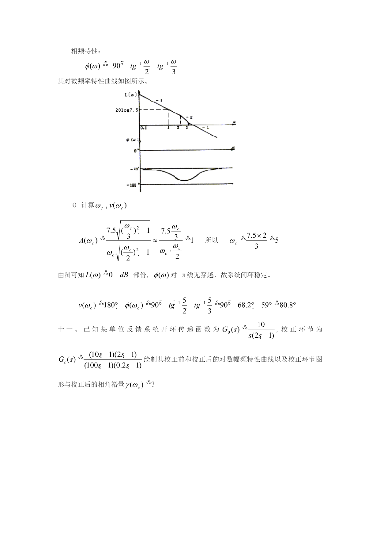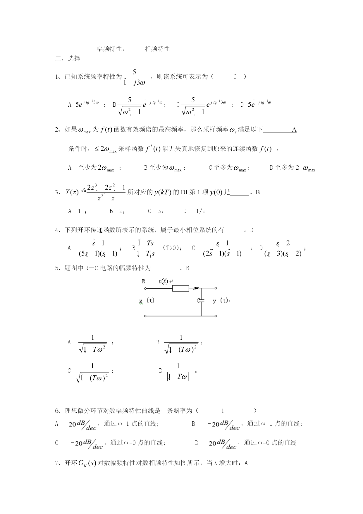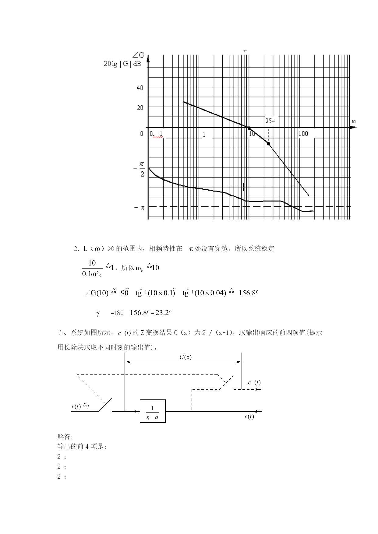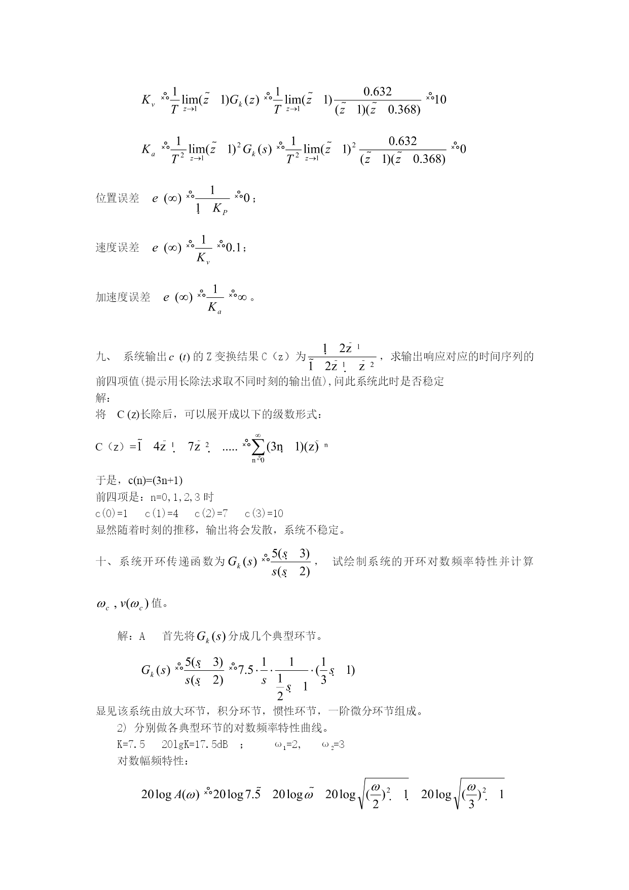 机电控制工程基础练习2一、填空1、频率响应是响应。正弦输入信号的稳态2、控制系统的时间响应,可以划分为瞬态和稳态两个过程。瞬态过程是指系统从到接近最终状态的响应过程;稳态过程是指时间t趋于时系统的输出状态。初始状态无穷3、所对应的的前三项是,依次是,,。1,2,34、s平面与z平面的对应关系是:平面的左半平面对应于平面上单位圆以内,平面的虚轴对应于平面单位圆,平面的右半平面,对应于平面单位圆以外。5、若系统输入为,其稳态输出相应为,则该系统的频率特性可表示为。6、2型系统的对数幅频特性低频渐近线斜率为。–40dB/dec7、惯性环节的传递函数为。8、当输入信号的角频率ω在某一范围内改变时所得到的一系列频率的响应称为这个系统的频率特性。9、对于一阶系统,当ω由0→∞时,矢量D(jω)逆时针方向旋转,则系统是稳定的。否则系统不稳定。10、如果在系统中只有离散信号而没有连续信号,则称此系统为系统,其输入、输出关系常用差分方程来描述。离散11、当采样频率满足时,则采样函数到原来的连续函数。能无失真地恢复12、离散信号的数学表达式为。13、时间响应由响应和响应两部分组成。瞬态、稳态14、为系统的,它描述系统对不同频率输入信号的稳态响应幅值衰减(或放大)的特性。为系统的,它描述系统对不同频率输入信号的稳态响应,相位迟后或超前的特性。幅频特性,相频特性二、选择1、已知系统频率特性为,则该系统可表示为(C)A;B;C;D2、如果为函数有效频谱的最高频率,那么采样频率满足以下A条件时,采样函数能无失真地恢复到原来的连续函数。A至少为;B至少为;C至多为;D至多为23、所对应的的DI第1项是。BA1;B2;C3;D1/24、下列开环传递函数所表示的系统,属于最小相位系统的有。DA;B(T>0);C;D;5、题图中R-C电路的幅频特性为。BA;B;C;D。6、理想微分环节对数幅频特性曲线是一条斜率为(1)A,通过ω=1点的直线;B-,通过ω=1点的直线;C-,通过ω=0点的直线;D,通过ω=0点的直线7、开环对数幅频特性对数相频特性如图所示,当K增大时:A图AL(ω)向上平移,不变;BL(ω)向上平移,向上平移;CL(ω)向下平移,不变;DL(ω)向下平移,向下平移。8系统如图所示,为一个装置,实现起来比较简单(B)A串联校正;B并联校正;C混合校正;D正反馈校正。9、脉冲传递函数。CA输出脉冲序列与输入脉冲序列之比;B系统输出的变换与输入变换之比;C在初条件为零时,系统输出的变换与输入的变换之比;D在初条件为零时,系统输入的变换与输出的变换之比。10、变换的数学表达式为。AA;B;C;D。11、已知系统频率特性为,则该系统可表示为(2)A;B;C;D12、已知系统频率特性为,当输入为时,系统的稳态输出为(D)A;B;C;D13、的变换为(B)A;B;C;D14、的变换为(C)A;B;C;D15、根据下列几个系统的特征方程,可以判断肯定不稳定的系统为(B)A;B;C;其中均为不等于零的正数。16、下列开环传递函数所表示的系统,属于最小相位系统的是(C)。A;B(T>0);C;D17、的变换为(B)A;B;C;D三、什么是长除法?解答:长除法就是幂级数展开法:把按展成幂级数,那么其系数组成的序列即为所求。这种方法有时给不出一个闭式表达式。四、已知系统的开环传递函数为:试:1.绘出对数渐近幅频特性曲线以及相频特性曲线2.确定系统稳定裕度解答:该系统是由积分、放大和两个惯性环节串联构成的K=1020lgK=20分贝低频为积分放大环节,在,K=20分贝处作-20dB/10倍频线在处作-40dB/10倍频线,在处作–60dB/10倍频线2.L()>0的范围内,相频特性在处没有穿越,所以系统稳定,所以=180=五、系统如图所示,的Z变换结果C(z)为2/(z-1),求输出响应的前四项值(提示用长除法求取不同时刻的输出值)。解答:输出的前4项是:2;2;2;2六、设系统的传递函数,求输入信号频率为,振幅为时,系统的稳态输出。解:由,可以看出是由放大环节与惯性环节串联组成,放大环节只影响输出值的幅值,而惯性环节对输出的幅值及相位都有影响。1)输出与输入频率相同f=1Hz,所以ω=2πf=6.3()2)求输出与输入相位差惯性环节相位落后为3)求输出幅值4)稳态输出七、已知最小相位系统开环对数频率特性曲线如图所示。试写出开环传递函数。解:1)ω<ω1的低频段斜率为[-20],故低频段