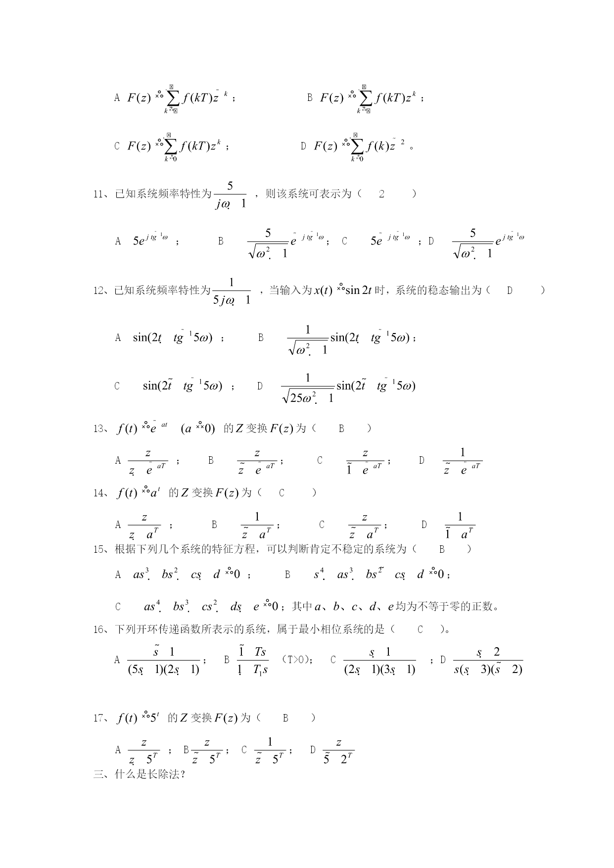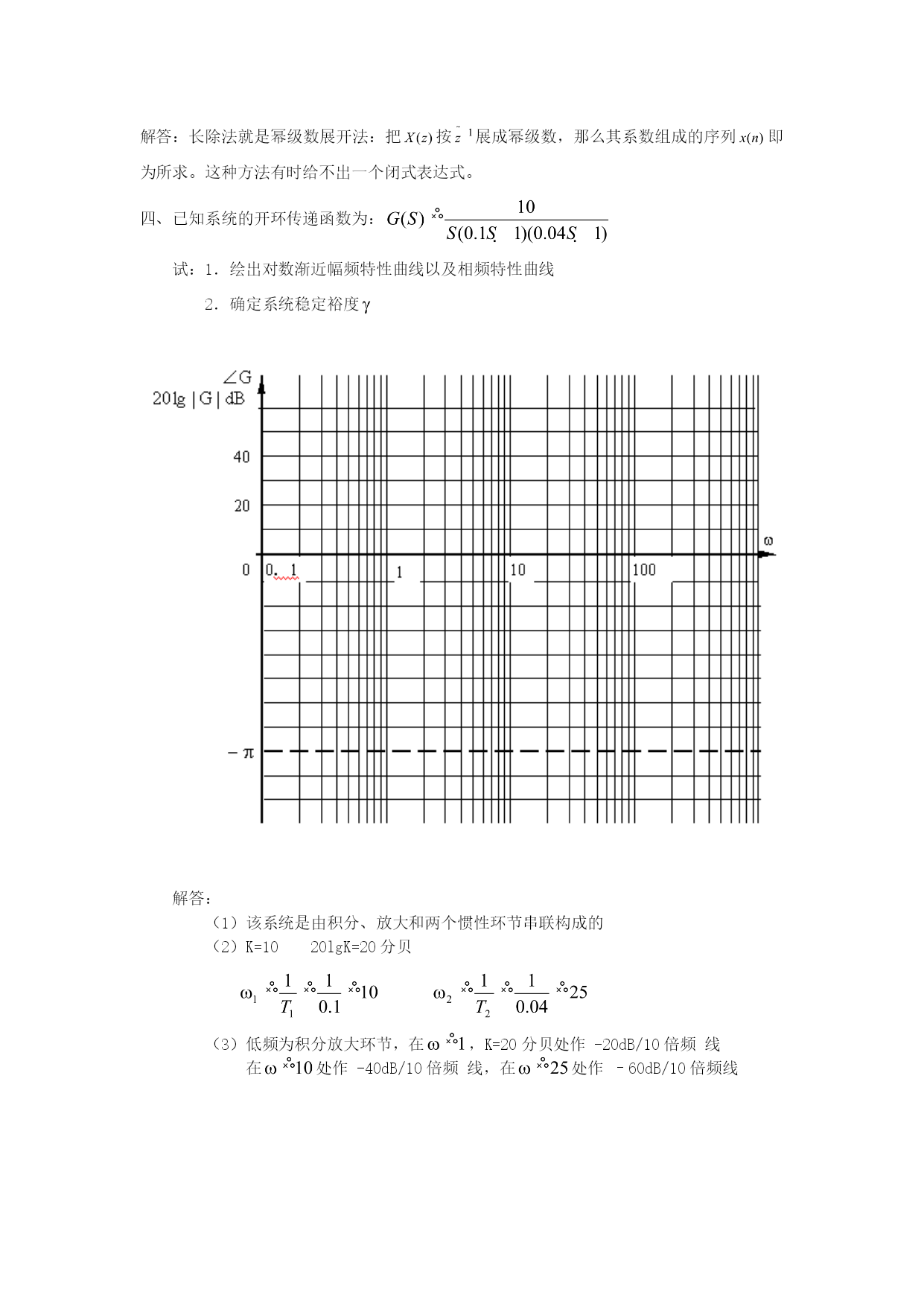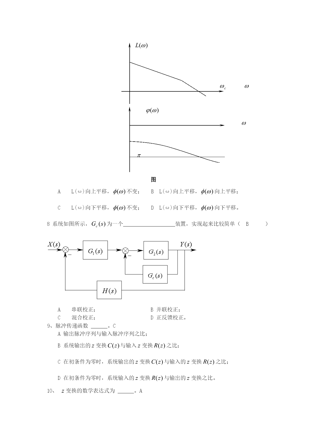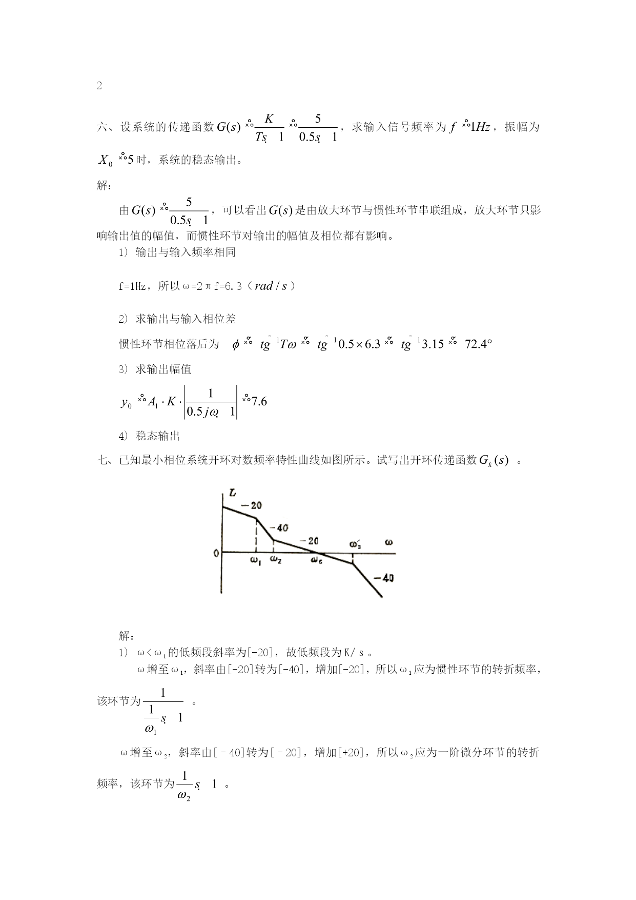 机电控制工程基础练习2一、填空1、频率响应是响应。正弦输入信号的稳态2、控制系统的时间响应,可以划分为瞬态和稳态两个过程。瞬态过程是指系统从到接近最终状态的响应过程;稳态过程是指时间t趋于时系统的输出状态。初始状态无穷3、所对应的的前三项是,依次是,,。1,2,34、s平面与z平面的对应关系是:平面的左半平面对应于平面上单位圆以内,平面的虚轴对应于平面单位圆,平面的右半平面,对应于平面单位圆以外。5、若系统输入为,其稳态输出相应为,则该系统的频率特性可表示为。6、2型系统的对数幅频特性低频渐近线斜率为。–40dB/dec7、惯性环节的传递函数为。8、当输入信号的角频率ω在某一范围内改变时所得到的一系列频率的响应称为这个系统的频率特性。9、对于一阶系统,当ω由0→∞时,矢量D(jω)逆时针方向旋转,则系统是稳定的。否则系统不稳定。10、如果在系统中只有离散信号而没有连续信号,则称此系统为系统,其输入、输出关系常用差分方程来描述。离散11、当采样频率满足时,则采样函数到原来的连续函数。能无失真地恢复12、离散信号的数学表达式为。13、时间响应由响应和响应两部分组成。瞬态、稳态14、为系统的,它描述系统对不同频率输入信号的稳态响应幅值衰减(或放大)的特性。为系统的,它描述系统对不同频率输入信号的稳态响应,相位迟后或超前的特性。幅频特性,相频特性二、选择1、已知系统频率特性为,则该系统可表示为(C)A;B;C;D2、如果为函数有效频谱的最高频率,那么采样频率满足以下A条件时,采样函数能无失真地恢复到原来的连续函数。A至少为;B至少为;C至多为;D至多为23、所对应的的DI第1项是。BA1;B2;C3;D1/24、下列开环传递函数所表示的系统,属于最小相位系统的有。DA;B(T>0);C;D;5、题图中R-C电路的幅频特性为。BA;B;C;D。6、理想微分环节对数幅频特性曲线是一条斜率为(1)A,通过ω=1点的直线;B-,通过ω=1点的直线;C-,通过ω=0点的直线;D,通过ω=0点的直线7、开环对数幅频特性对数相频特性如图所示,当K增大时:A图AL(ω)向上平移,不变;BL(ω)向上平移,向上平移;CL(ω)向下平移,不变;DL(ω)向下平移,向下平移。8系统如图所示,为一个装置,实现起来比较简单(B)A串联校正;B并联校正;C混合校正;D正反馈校正。9、脉冲传递函数。CA输出脉冲序列与输入脉冲序列之比;B系统输出的变换与输入变换之比;C在初条件为零时,系统输出的变换与输入的变换之比;D在初条件为零时,系统输入的变换与输出的变换之比。10、变换的数学表达式为。AA;B;C;D。11、已知系统频率特性为,则该系统可表示为(2)A;B;C;D12、已知系统频率特性为,当输入为时,系统的稳态输出为(D)A;B;C;D13、的变换为(B)A;B;C;D14、的变换为(C)A;B;C;D15、根据下列几个系统的特征方程,可以判断肯定不稳定的系统为(B)A;B;C;其中均为不等于零的正数。16、下列开环传递函数所表示的系统,属于最小相位系统的是(C)。A;B(T>0);C;D17、的变换为(B)A;B;C;D三、什么是长除法?解答:长除法就是幂级数展开法:把按展成幂级数,那么其系数组成的序列即为所求。这种方法有时给不出一个闭式表达式。四、已知系统的开环传递函数为:试:1.绘出对数渐近幅频特性曲线以及相频特性曲线2.确定系统稳定裕度解答:该系统是由积分、放大和两个惯性环节串联构成的K=1020lgK=20分贝低频为积分放大环节,在,K=20分贝处作-20dB/10倍频线在处作-40dB/10倍频线,在处作–60dB/10倍频线2.L()>0的范围内,相频特性在处没有穿越,所以系统稳定,所以=180=五、系统如图所示,的Z变换结果C(z)为2/(z-1),求输出响应的前四项值(提示用长除法求取不同时刻的输出值)。解答:输出的前4项是:2;2;2;2六、设系统的传递函数,求输入信号频率为,振幅为时,系统的稳态输出。解:由,可以看出是由放大环节与惯性环节串联组成,放大环节只影响输出值的幅值,而惯性环节对输出的幅值及相位都有影响。1)输出与输入频率相同f=1Hz,所以ω=2πf=6.3()2)求输出与输入相位差惯性环节相位落后为3)求输出幅值4)稳态输出七、已知最小相位系统开环对数频率特性曲线如图所示。试写出开环传递函数。解:1)ω<ω1的低频段斜率为[-20],故低频段