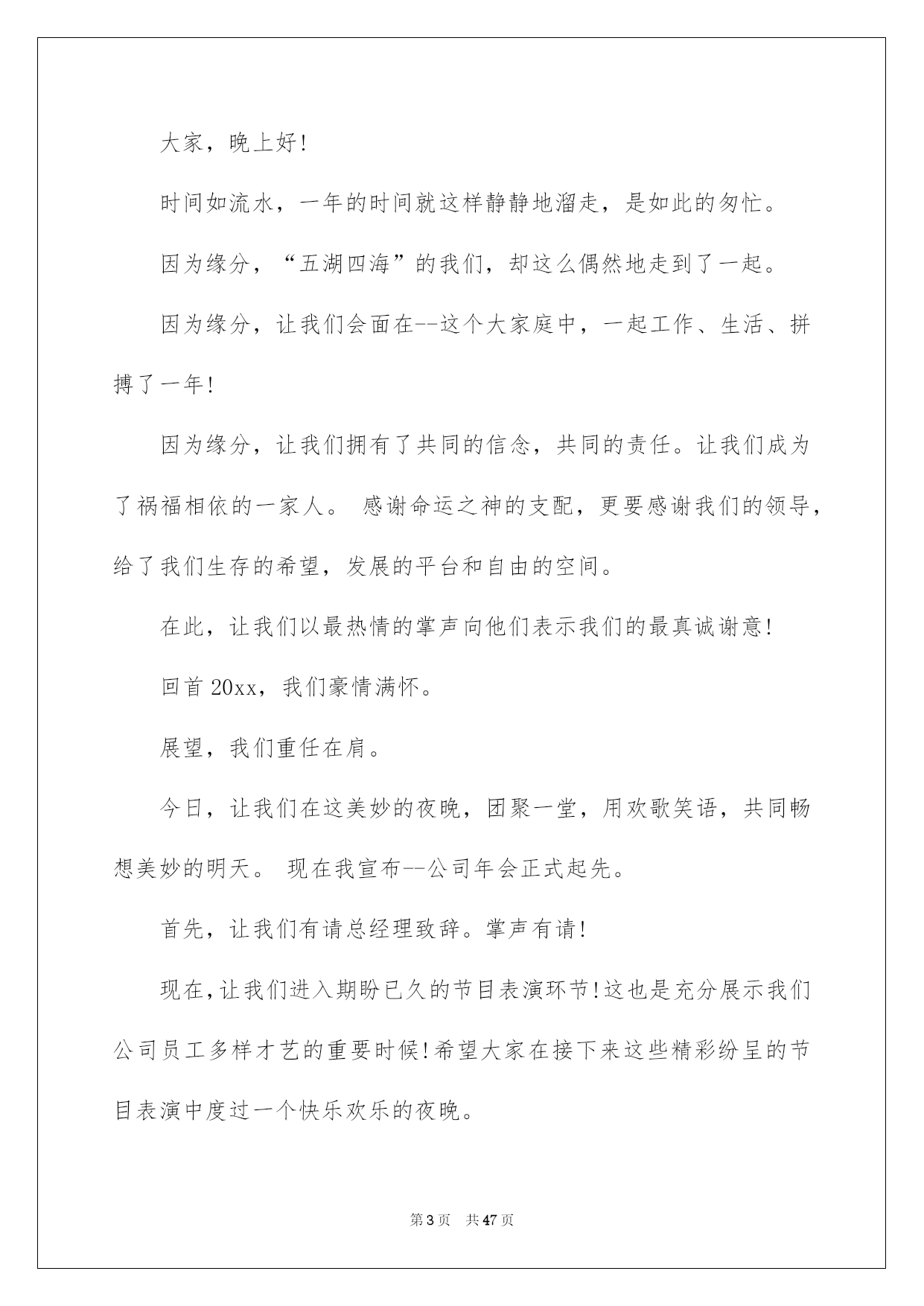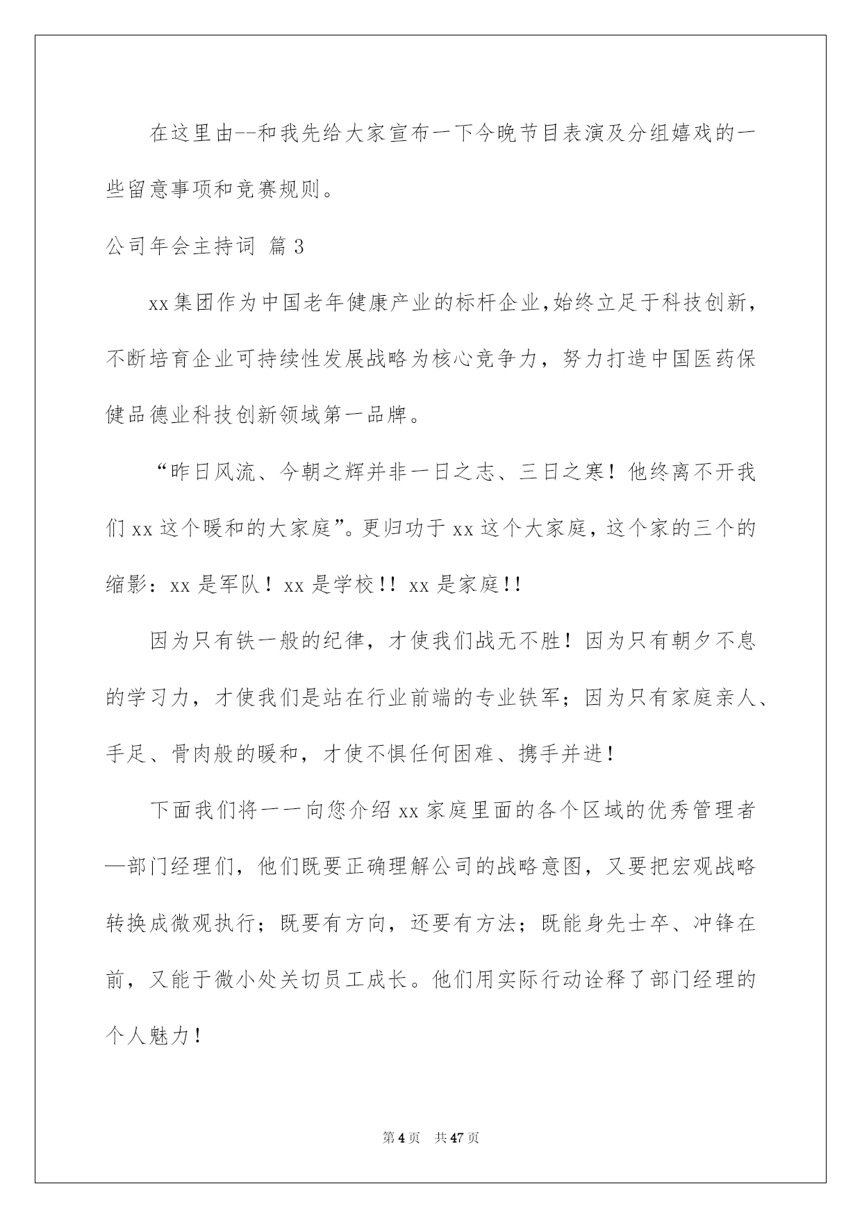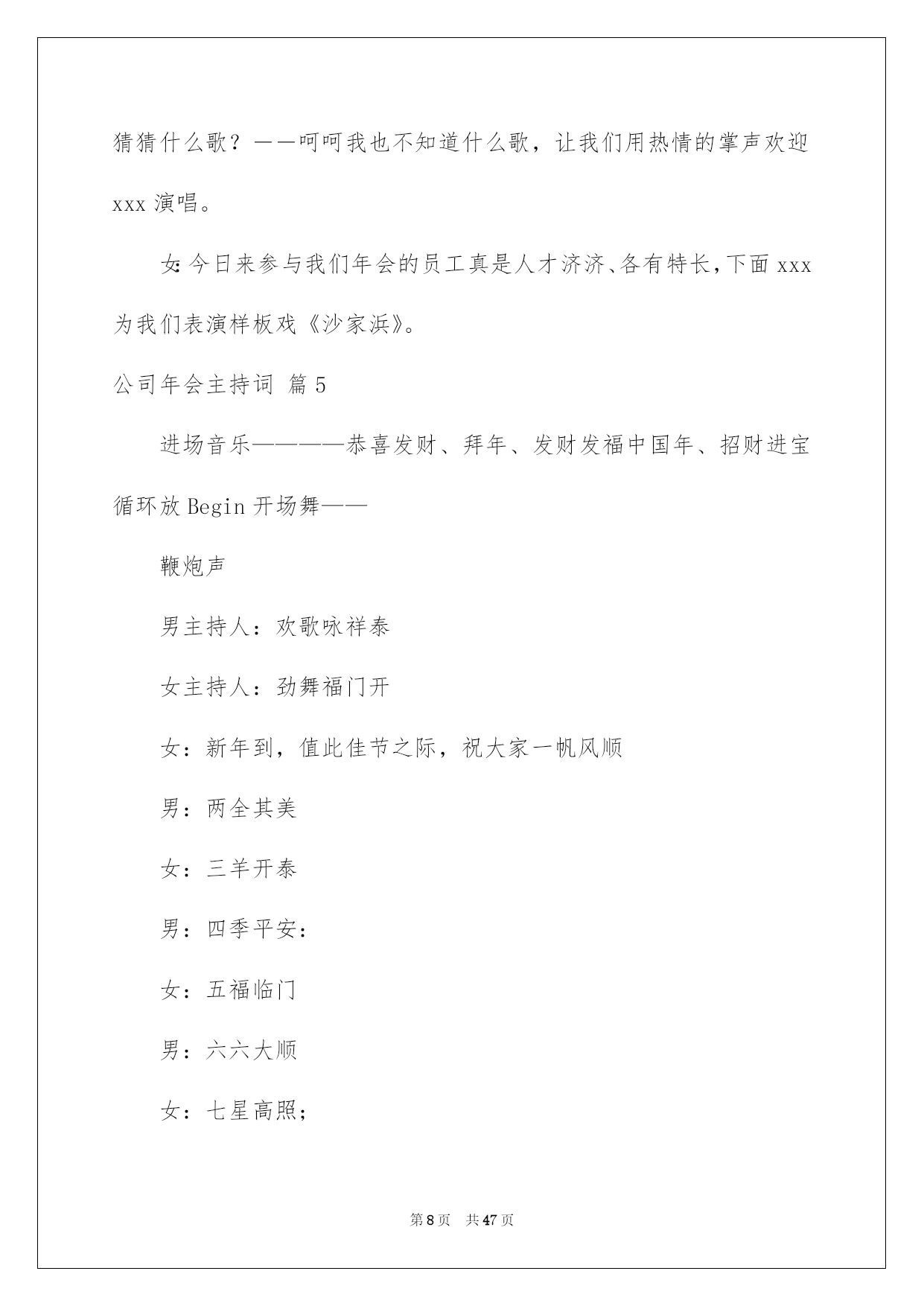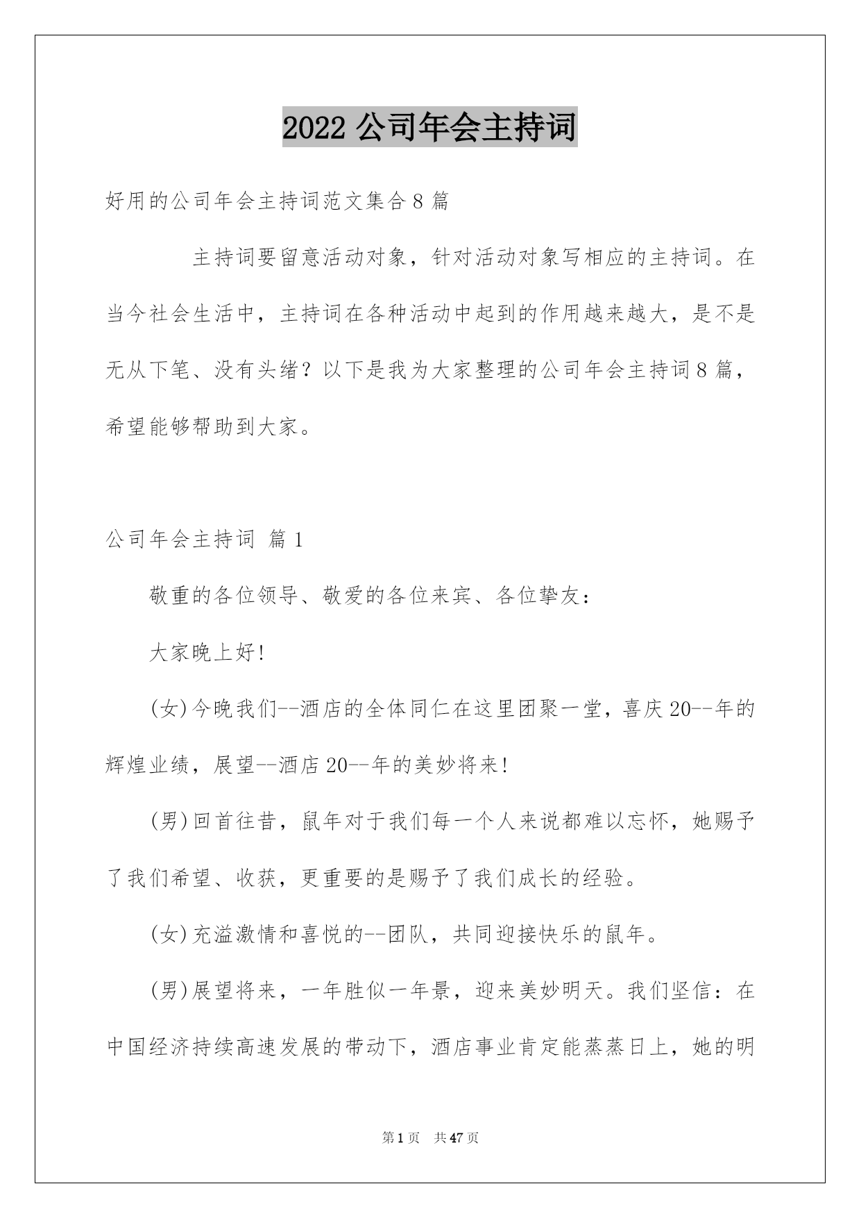 第PAGE\*Arabic\*MERGEFORMAT47页共NUMPAGES\*Arabic\*MERGEFORMAT47页第PAGE\*MERGEFORMAT47页共NUMPAGES\*MERGEFORMAT47页第PAGE\*MERGEFORMAT47页共NUMPAGES\*MERGEFORMAT47页第PAGE\*MERGEFORMAT47页共NUMPAGES\*MERGEFORMAT47页第PAGE\*MERGEFORMAT47页共NUMPAGES\*MERGEFORMAT47页第PAGE\*MERGEFORMAT47页共NUMPAGES\*MERGEFORMAT47页第PAGE\*MERGEFORMAT47页共NUMPAGES\*MERGEFORMAT47页第PAGE\*MERGEFORMAT47页共NUMPAGES\*MERGEFORMAT47页第PAGE\*MERGEFORMAT47页共NUMPAGES\*MERGEFORMAT47页第PAGE\*MERGEFORMAT47页共NUMPAGES\*MERGEFORMAT47页第PAGE\*MERGEFORMAT47页共NUMPAGES\*MERGEFORMAT47页2022公司年会主持词好用的公司年会主持词范文集合8篇主持词要留意活动对象,针对活动对象写相应的主持词。在当今社会生活中,主持词在各种活动中起到的作用越来越大,是不是无从下笔、没有头绪?以下是我为大家整理的公司年会主持词8篇,希望能够帮助到大家。公司年会主持词篇1敬重的各位领导、敬爱的各位来宾、各位挚友:大家晚上好!(女)今晚我们--酒店的全体同仁在这里团聚一堂,喜庆20--年的辉煌业绩,展望--酒店20--年的美妙将来!(男)回首往昔,鼠年对于我们每一个人来说都难以忘怀,她赐予了我们希望、收获,更重要的是赐予了我们成长的经验。(女)充溢激情和喜悦的--团队,共同迎接快乐的鼠年。(男)展望将来,一年胜似一年景,迎来美妙明天。我们坚信:在中国经济持续高速发展的带动下,酒店事业肯定能蒸蒸日上,她的明天将更加美妙。(男)我是主持人--(女)我是主持人--,(男)出席我们今日晚会的是--酒店的全体同仁。(女)随着激情的舞蹈表演,拉开了--酒店年终晚会的帷幕!(男)今晚,我们--的全部员工和各位嘉宾今晚,我们团聚一堂,新年辞旧岁,瑞鼠迎新春!(女)只想为明天的美妙,与您同欢、同乐、共醉。(男)下面我们宣布:20--年--联欢晚会,现在起先!首先有请我们尊敬的--为我们致辞!为大家带来新年的祝愿!(女)感谢--为我们带来的美妙祝福,在--的正确带领和指导下,我们--每年都会上一个新台阶,在新的一年里,我们必将再接再厉,再创辉煌和佳绩,大家说是不是?有没有信念?(男)祝福很美妙,祝愿令人沉醉,每一句都代表着心声与愿望,祝愿不断,祝词连连,接受了--的美妙祝福,下面请观赏--带来的节目表演。公司年会主持词篇2敬重的各位领导,各位嘉宾,各位同胞,各位--人:大家,晚上好!时间如流水,一年的时间就这样静静地溜走,是如此的匆忙。因为缘分,“五湖四海”的我们,却这么偶然地走到了一起。因为缘分,让我们会面在--这个大家庭中,一起工作、生活、拼搏了一年!因为缘分,让我们拥有了共同的信念,共同的责任。让我们成为了祸福相依的一家人。感谢命运之神的支配,更要感谢我们的领导,给了我们生存的希望,发展的平台和自由的空间。在此,让我们以最热情的掌声向他们表示我们的最真诚谢意!回首20xx,我们豪情满怀。展望,我们重任在肩。今日,让我们在这美妙的夜晚,团聚一堂,用欢歌笑语,共同畅想美妙的明天。现在我宣布--公司年会正式起先。首先,让我们有请总经理致辞。掌声有请!现在,让我们进入期盼已久的节目表演环节!这也是充分展示我们公司员工多样才艺的重要时候!希望大家在接下来这些精彩纷呈的节目表演中度过一个快乐欢乐的夜晚。在这里由--和我先给大家宣布一下今晚节目表演及分组嬉戏的一些留意事项和竞赛规则。公司年会主持词篇3xx集团作为中国老年健康产业的标杆企业,始终立足于科技创新,不断培育企业可持续性发展战略为核心竞争力,努力打造中国医药保健品德业科技创新领域第一品牌。“昨日风流、今朝之辉并非一日之志、三日之寒!他终离不开我们xx这个暖和的大家庭”。更归功于xx这个大家庭,这个家的三个的缩影:xx是军队!xx是学校!!xx是家庭!!因为只有铁一般的纪律,才使我们战无不胜!因为只有朝夕不息的学习力,才使我们是站在行业前端的专业铁军;因为只有家庭亲人、手足、骨肉般的暖和,才使不惧任何困难、携手并进!下面我们将一
