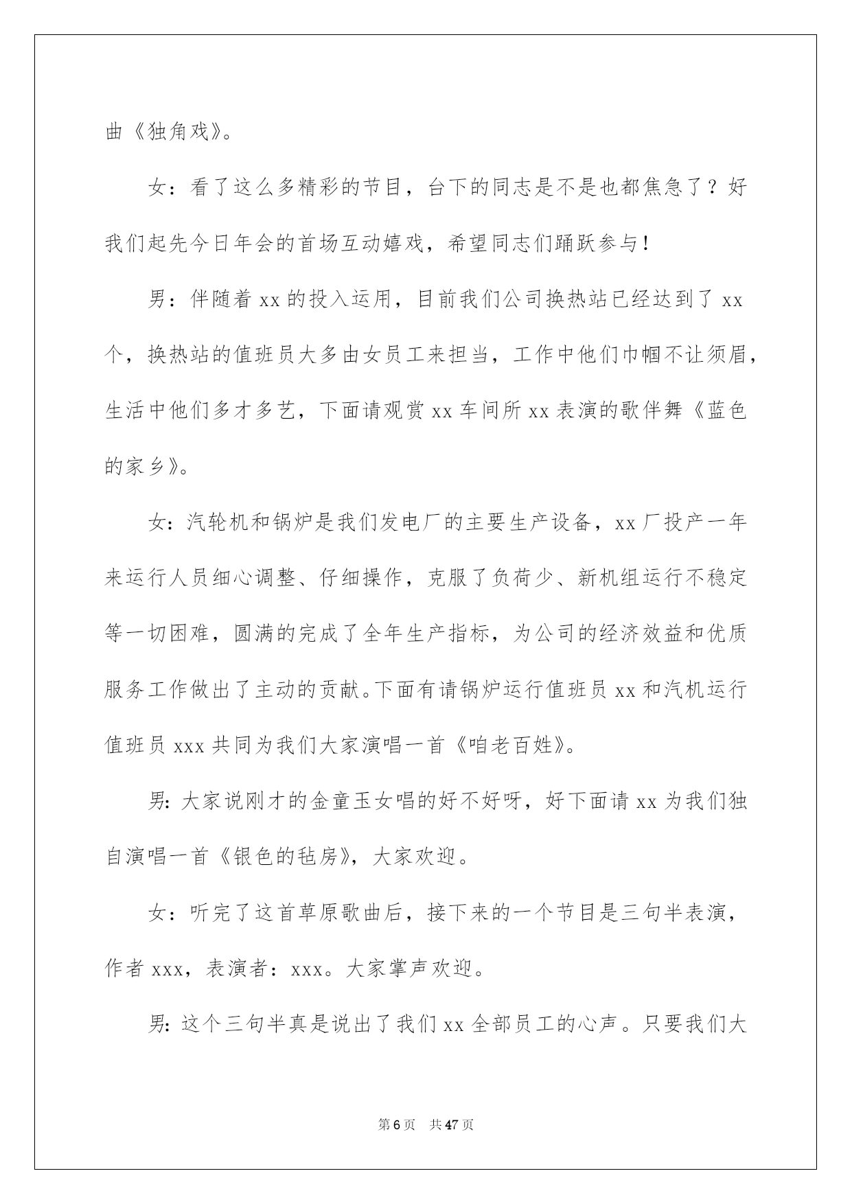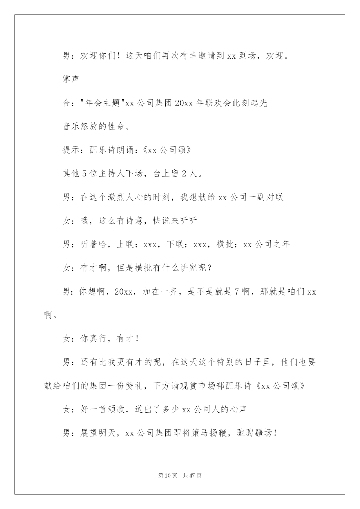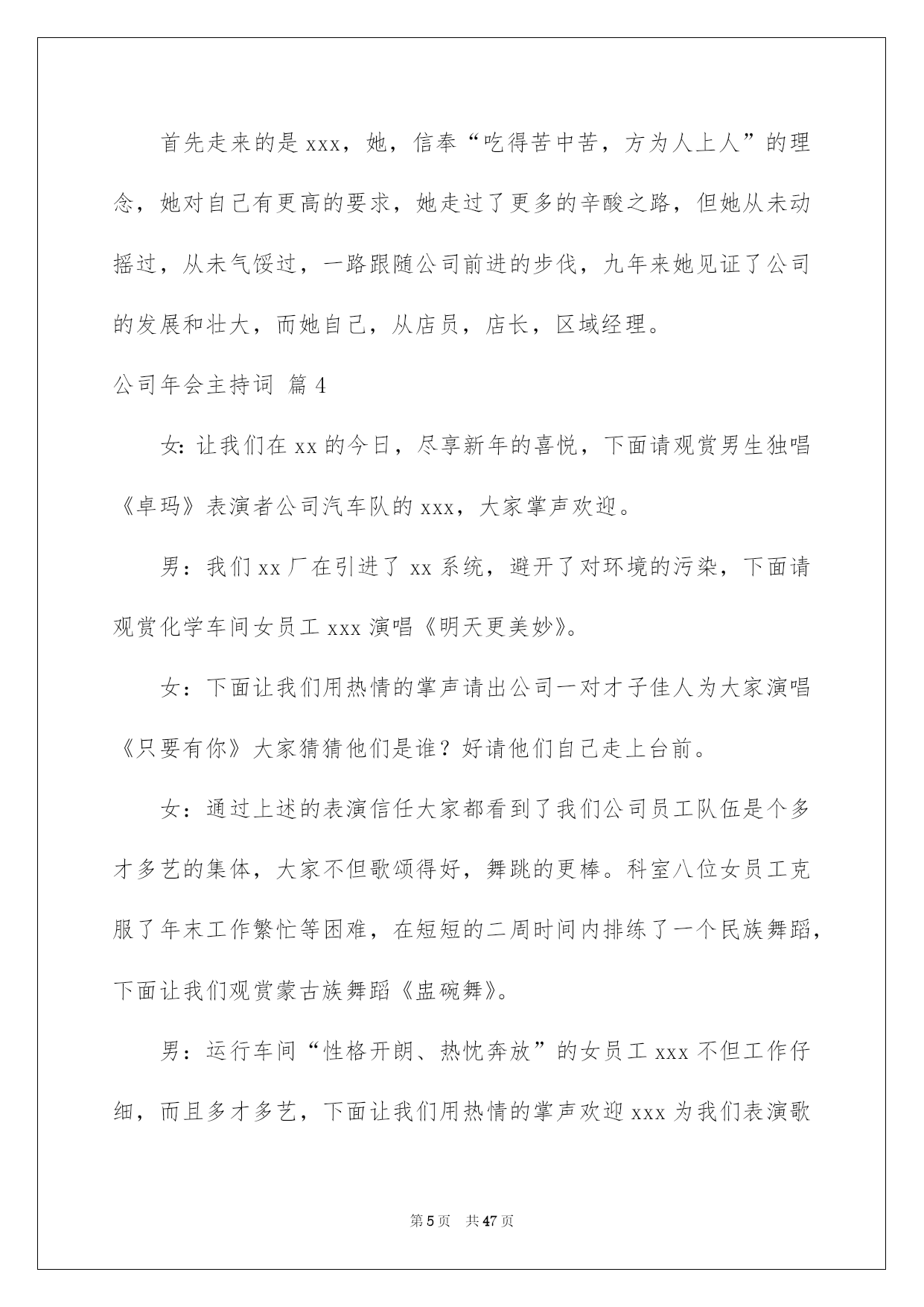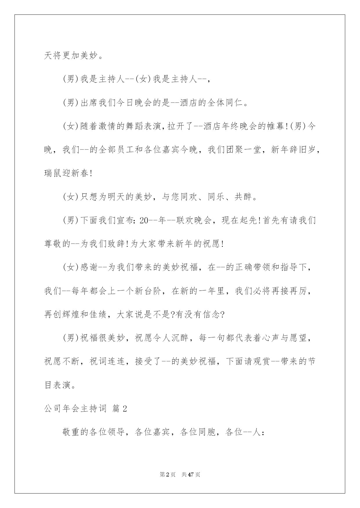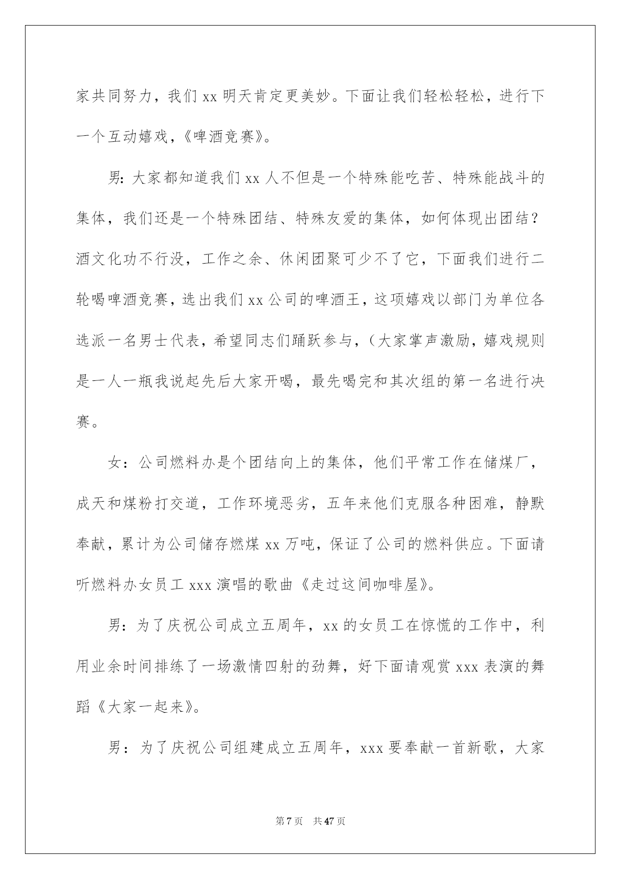 第PAGE\*Arabic\*MERGEFORMAT47页共NUMPAGES\*Arabic\*MERGEFORMAT47页第PAGE\*MERGEFORMAT47页共NUMPAGES\*MERGEFORMAT47页第PAGE\*MERGEFORMAT47页共NUMPAGES\*MERGEFORMAT47页第PAGE\*MERGEFORMAT47页共NUMPAGES\*MERGEFORMAT47页第PAGE\*MERGEFORMAT47页共NUMPAGES\*MERGEFORMAT47页第PAGE\*MERGEFORMAT47页共NUMPAGES\*MERGEFORMAT47页第PAGE\*MERGEFORMAT47页共NUMPAGES\*MERGEFORMAT47页第PAGE\*MERGEFORMAT47页共NUMPAGES\*MERGEFORMAT47页第PAGE\*MERGEFORMAT47页共NUMPAGES\*MERGEFORMAT47页第PAGE\*MERGEFORMAT47页共NUMPAGES\*MERGEFORMAT47页第PAGE\*MERGEFORMAT47页共NUMPAGES\*MERGEFORMAT47页2022公司年会主持词好用的公司年会主持词范文集合8篇主持词要留意活动对象,针对活动对象写相应的主持词。在当今社会生活中,主持词在各种活动中起到的作用越来越大,是不是无从下笔、没有头绪?以下是我为大家整理的公司年会主持词8篇,希望能够帮助到大家。公司年会主持词篇1敬重的各位领导、敬爱的各位来宾、各位挚友:大家晚上好!(女)今晚我们--酒店的全体同仁在这里团聚一堂,喜庆20--年的辉煌业绩,展望--酒店20--年的美妙将来!(男)回首往昔,鼠年对于我们每一个人来说都难以忘怀,她赐予了我们希望、收获,更重要的是赐予了我们成长的经验。(女)充溢激情和喜悦的--团队,共同迎接快乐的鼠年。(男)展望将来,一年胜似一年景,迎来美妙明天。我们坚信:在中国经济持续高速发展的带动下,酒店事业肯定能蒸蒸日上,她的明天将更加美妙。(男)我是主持人--(女)我是主持人--,(男)出席我们今日晚会的是--酒店的全体同仁。(女)随着激情的舞蹈表演,拉开了--酒店年终晚会的帷幕!(男)今晚,我们--的全部员工和各位嘉宾今晚,我们团聚一堂,新年辞旧岁,瑞鼠迎新春!(女)只想为明天的美妙,与您同欢、同乐、共醉。(男)下面我们宣布:20--年--联欢晚会,现在起先!首先有请我们尊敬的--为我们致辞!为大家带来新年的祝愿!(女)感谢--为我们带来的美妙祝福,在--的正确带领和指导下,我们--每年都会上一个新台阶,在新的一年里,我们必将再接再厉,再创辉煌和佳绩,大家说是不是?有没有信念?(男)祝福很美妙,祝愿令人沉醉,每一句都代表着心声与愿望,祝愿不断,祝词连连,接受了--的美妙祝福,下面请观赏--带来的节目表演。公司年会主持词篇2敬重的各位领导,各位嘉宾,各位同胞,各位--人:大家,晚上好!时间如流水,一年的时间就这样静静地溜走,是如此的匆忙。因为缘分,“五湖四海”的我们,却这么偶然地走到了一起。因为缘分,让我们会面在--这个大家庭中,一起工作、生活、拼搏了一年!因为缘分,让我们拥有了共同的信念,共同的责任。让我们成为了祸福相依的一家人。感谢命运之神的支配,更要感谢我们的领导,给了我们生存的希望,发展的平台和自由的空间。在此,让我们以最热情的掌声向他们表示我们的最真诚谢意!回首20xx,我们豪情满怀。展望,我们重任在肩。今日,让我们在这美妙的夜晚,团聚一堂,用欢歌笑语,共同畅想美妙的明天。现在我宣布--公司年会正式起先。首先,让我们有请总经理致辞。掌声有请!现在,让我们进入期盼已久的节目表演环节!这也是充分展示我们公司员工多样才艺的重要时候!希望大家在接下来这些精彩纷呈的节目表演中度过一个快乐欢乐的夜晚。在这里由--和我先给大家宣布一下今晚节目表演及分组嬉戏的一些留意事项和竞赛规则。公司年会主持词篇3xx集团作为中国老年健康产业的标杆企业,始终立足于科技创新,不断培育企业可持续性发展战略为核心竞争力,努力打造中国医药保健品德业科技创新领域第一品牌。“昨日风流、今朝之辉并非一日之志、三日之寒!他终离不开我们xx这个暖和的大家庭”。更归功于xx这个大家庭,这个家的三个的缩影:xx是军队!xx是学校!!xx是家庭!!因为只有铁一般的纪律,才使我们战无不胜!因为只有朝夕不息的学习力,才使我们是站在行业前端的专业铁军;因为只有家庭亲人、手足、骨肉般的暖和,才使不惧任何困难、携手并进!下面我们将一