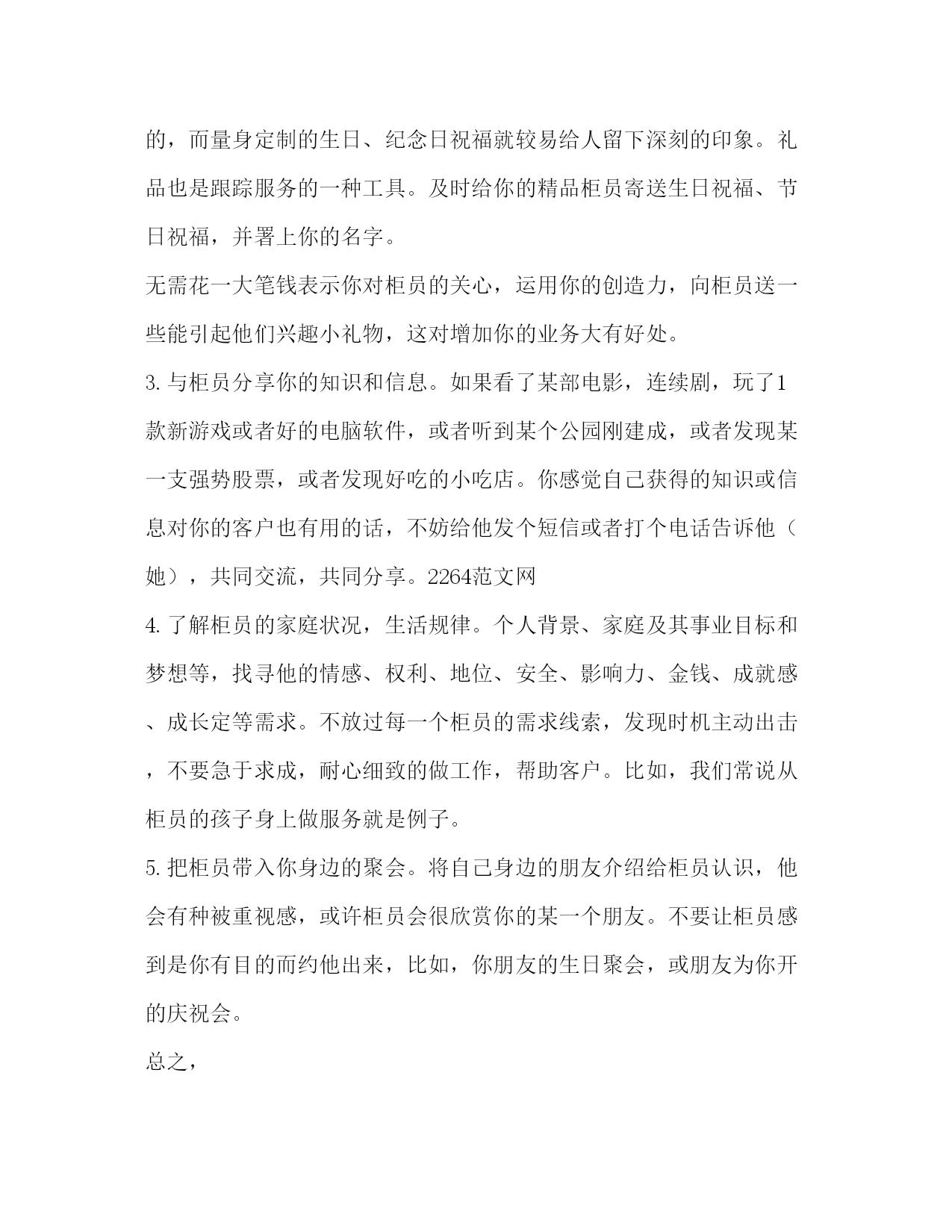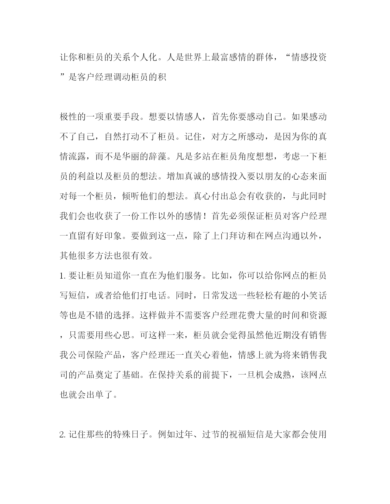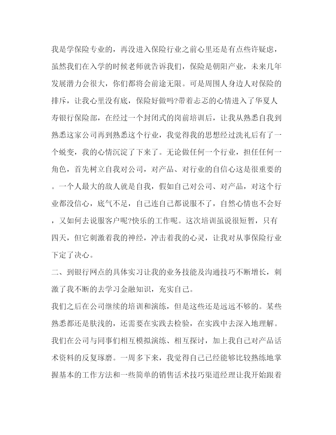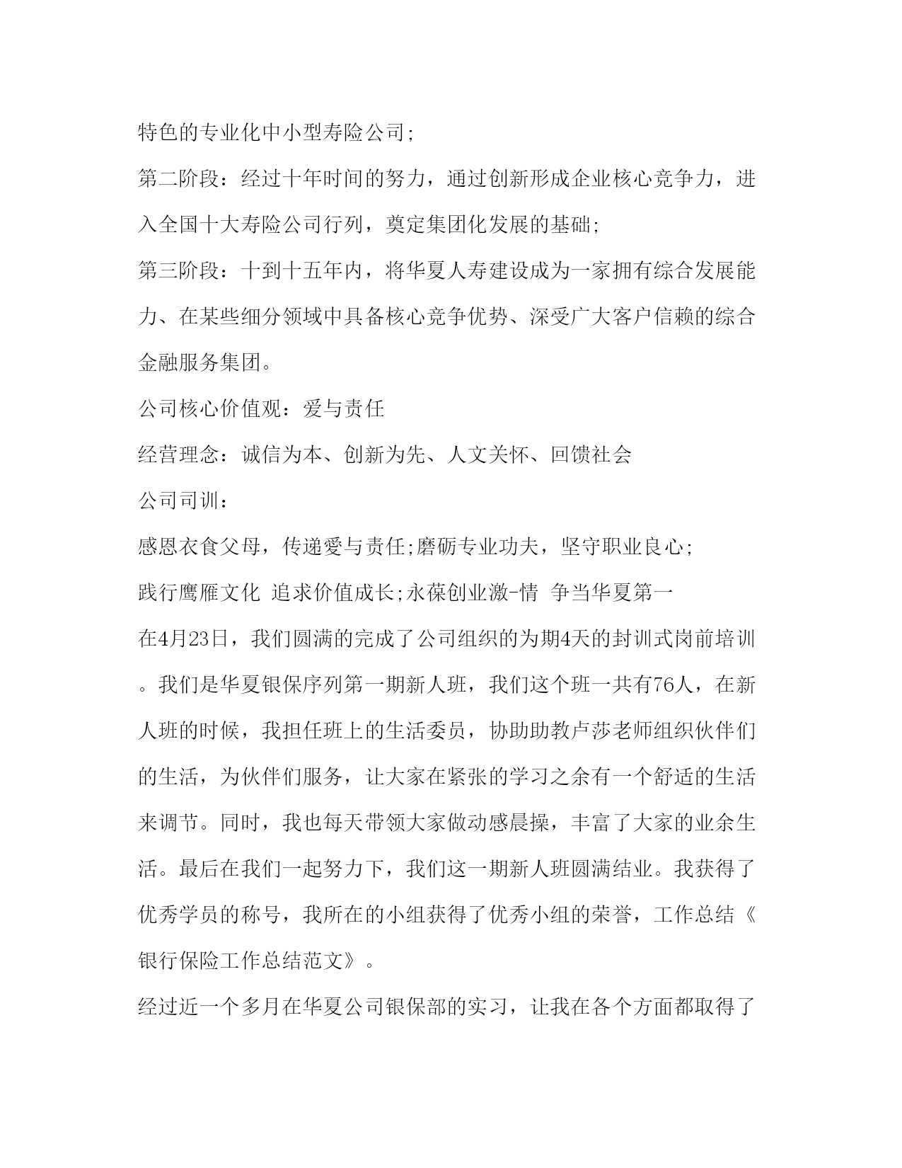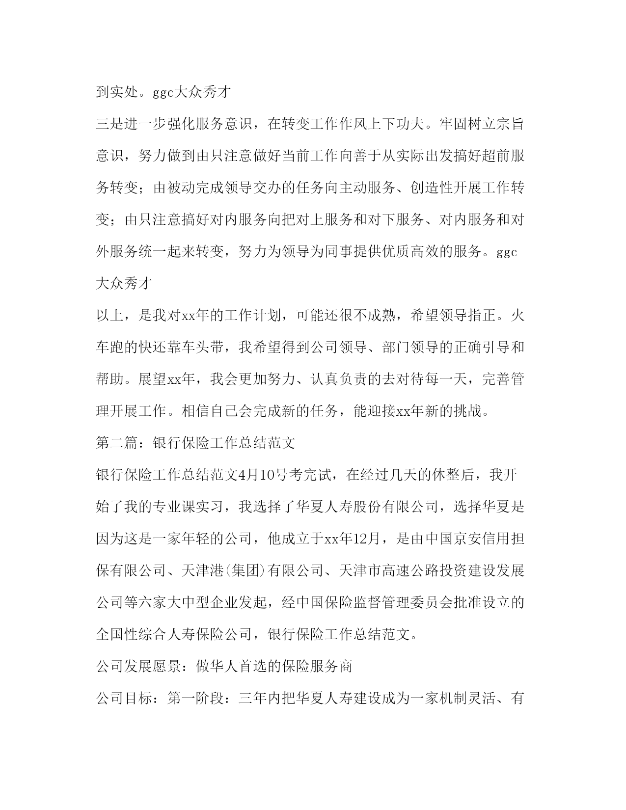 PAGE此资料由网络收集而来,如有侵权请告知上传者立即删除。资料共分享,我们负责传递知识。银行保险年终总结第1篇第2篇第3篇第4篇第5篇更多顶部目录第一篇:银行保险年终总结第二篇:银行保险工作总结范文第三篇:银行保险工作总结第四篇:如何通过服务提升业绩-银行保险工作总结第五篇:银行保险部实习工作总结更多相关范文正文第一篇:银行保险年终总结很快xx年就要结束了,我也在银行保险部工作了1年,银保部的工作在周总的领导下,在各位同事的帮助和鼓励下,边学习,边工作,逐渐在部门的工作中逐步转入正轨,现就接手后的工作总结如下:一是短期内迅速熟悉新岗位的工作方式、工作流程。进入本部门后,在周总的领导下,在公司各位同事的帮助下,快速适应新的工作环境,在新岗位,转变工作思路,强化服务意识,树立新的工作作风,认真完成了各项工作任务。二是在提高业务上下功夫,增强工作的指导性。实践中认识到,缺乏业务知识,超前意识,工作被动应付,是影响工作上质量、求实效的一个重要因素。业精于勤荒于嬉,克服懒惰思想,锐意进取,就必须发挥工作的主动性、能动性,力争在某些情况的把握上能够合理适度,做事有分寸,力求让上级放心让下级满意。在主动服务上跟上领导决策的节拍,做到与时俱进。ggc大众秀才三是在工作中边学习,边总结。在工作中不断完善自己,改正不良的工作习惯,将自己的职业生涯和公司的发展紧密联系在一起,遇到挫折不气馁,吃一堑,长一智,不断改正缺点完善自我,与时俱进。以上是对xx年工作的简单总结,眼间又要进入xx年了,新的一年对我们来说是一个充满挑战、机遇、希望与压力开始的一年,也是我非常重要的一年。我尚有不足之处,需要继续加强学习,给自己充电,努力的去充实完善自己,以便使自己在新的一年里有更大的进步和成绩。一是进一步强化学习意识,在提高素质能力上下功夫。把学习作为武装和提高自己的首要任务,牢固树立与时俱进的学习理念,养成勤于学习、勤于思考的良好习惯。把参加集体组织的学习与个人自学结合起来,一方面积极参加集中组织的学习活动,另一方面根形势发展和工作需要,本着缺什么补什么的原则,搞好个人自学,不断吸纳新知识、掌握新技能、增强新本领。ggc大众秀才二是进一步强化职责意识、团队意识。进一步树立正确的人生观和价值观,增强事业心和责任感,认真做好职责范围内和领导交办的工作任务,埋头苦干奋发进取追求卓越,积极主动地把工作做到点上、落到实处。ggc大众秀才三是进一步强化服务意识,在转变工作作风上下功夫。牢固树立宗旨意识,努力做到由只注意做好当前工作向善于从实际出发搞好超前服务转变;由被动完成领导交办的任务向主动服务、创造性开展工作转变;由只注意搞好对内服务向把对上服务和对下服务、对内服务和对外服务统一起来转变,努力为领导为同事提供优质高效的服务。ggc大众秀才以上,是我对xx年的工作计划,可能还很不成熟,希望领导指正。火车跑的快还靠车头带,我希望得到公司领导、部门领导的正确引导和帮助。展望xx年,我会更加努力、认真负责的去对待每一天,完善管理开展工作。相信自己会完成新的任务,能迎接xx年新的挑战。第二篇:银行保险工作总结范文银行保险工作总结范文4月10号考完试,在经过几天的休整后,我开始了我的专业课实习,我选择了华夏人寿股份有限公司,选择华夏是因为这是一家年轻的公司,他成立于xx年12月,是由中国京安信用担保有限公司、天津港(集团)有限公司、天津市高速公路投资建设发展公司等六家大中型企业发起,经中国保险监督管理委员会批准设立的全国性综合人寿保险公司,银行保险工作总结范文。公司发展愿景:做华人首选的保险服务商公司目标:第一阶段:三年内把华夏人寿建设成为一家机制灵活、有特色的专业化中小型寿险公司;第二阶段:经过十年时间的努力,通过创新形成企业核心竞争力,进入全国十大寿险公司行列,奠定集团化发展的基础;第三阶段:十到十五年内,将华夏人寿建设成为一家拥有综合发展能力、在某些细分领域中具备核心竞争优势、深受广大客户信赖的综合金融服务集团。公司核心价值观:爱与责任经营理念:诚信为本、创新为先、人文关怀、回馈社会公司司训:感恩衣食父母,传递愛与责任;磨砺专业功夫,坚守职业良心;践行鹰雁文化追求价值成长;永葆创业激-情争当华夏第一在4月23日,我们圆满的完成了公司组织的为期4天的封训式岗前培训。我们是华夏银保序列第一期新人班,我们这个班一共有76人,在新人班的时候,我担任班上的生活委员,协助助教卢莎老师组织伙伴们的生活,为伙伴们服务,让大家在紧张的学习之余有一个舒适的生活来调节。同时,我也每天带领大家做动感晨操,丰富了大家的业余生活。最后在我们一起努力下,我们这一期新人班圆满结业。我获得了优秀学员的称号,我所在的小组获得了优秀小组的荣誉,工