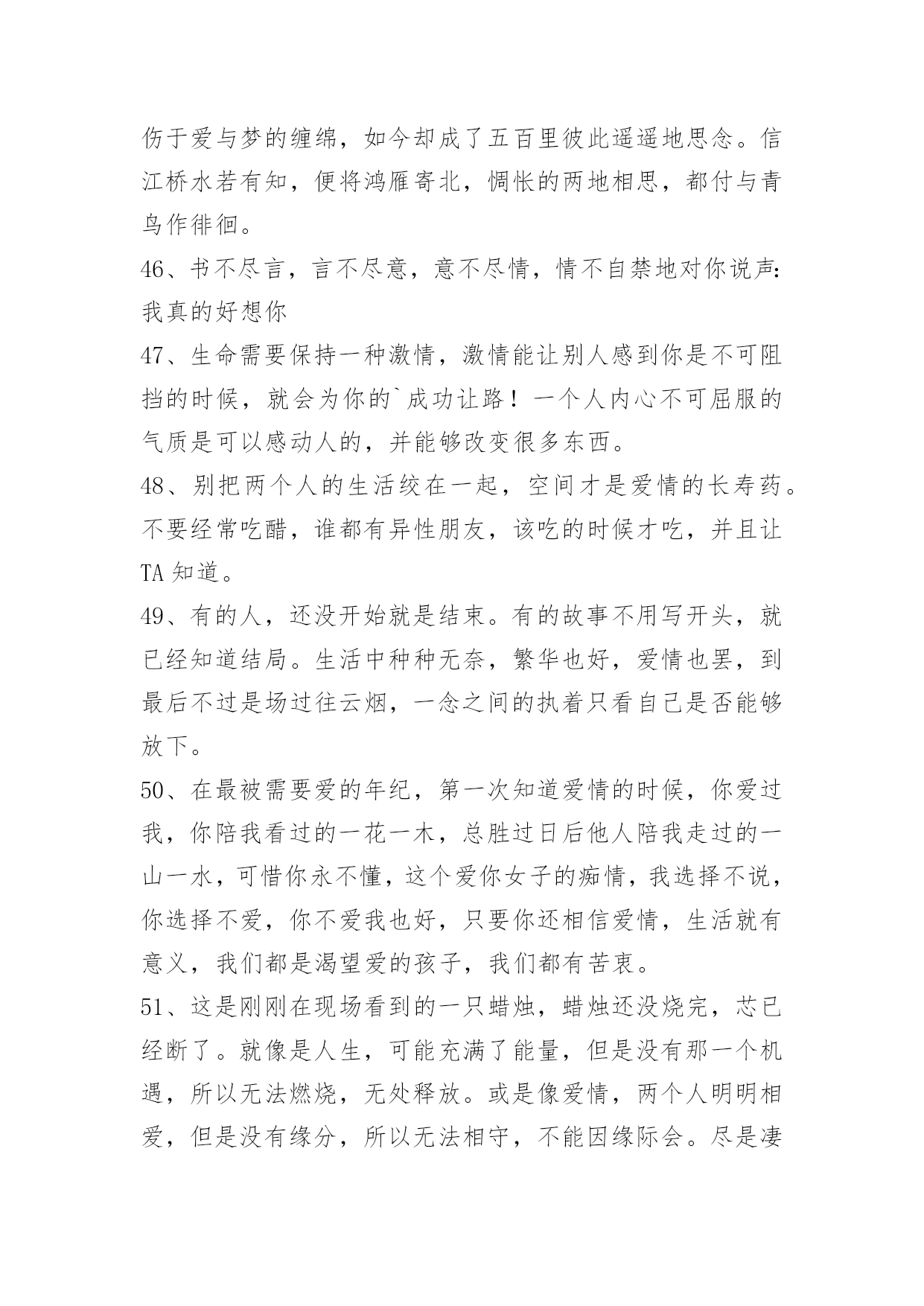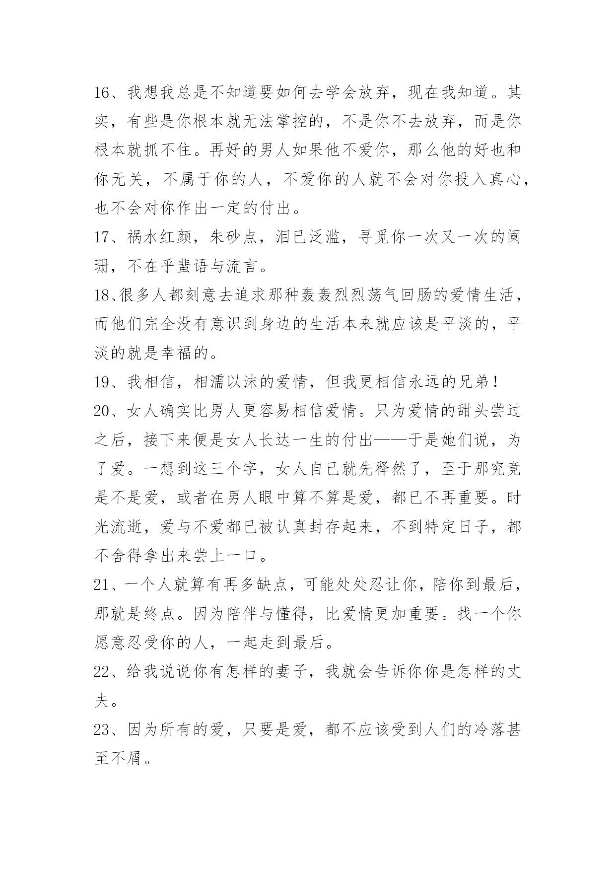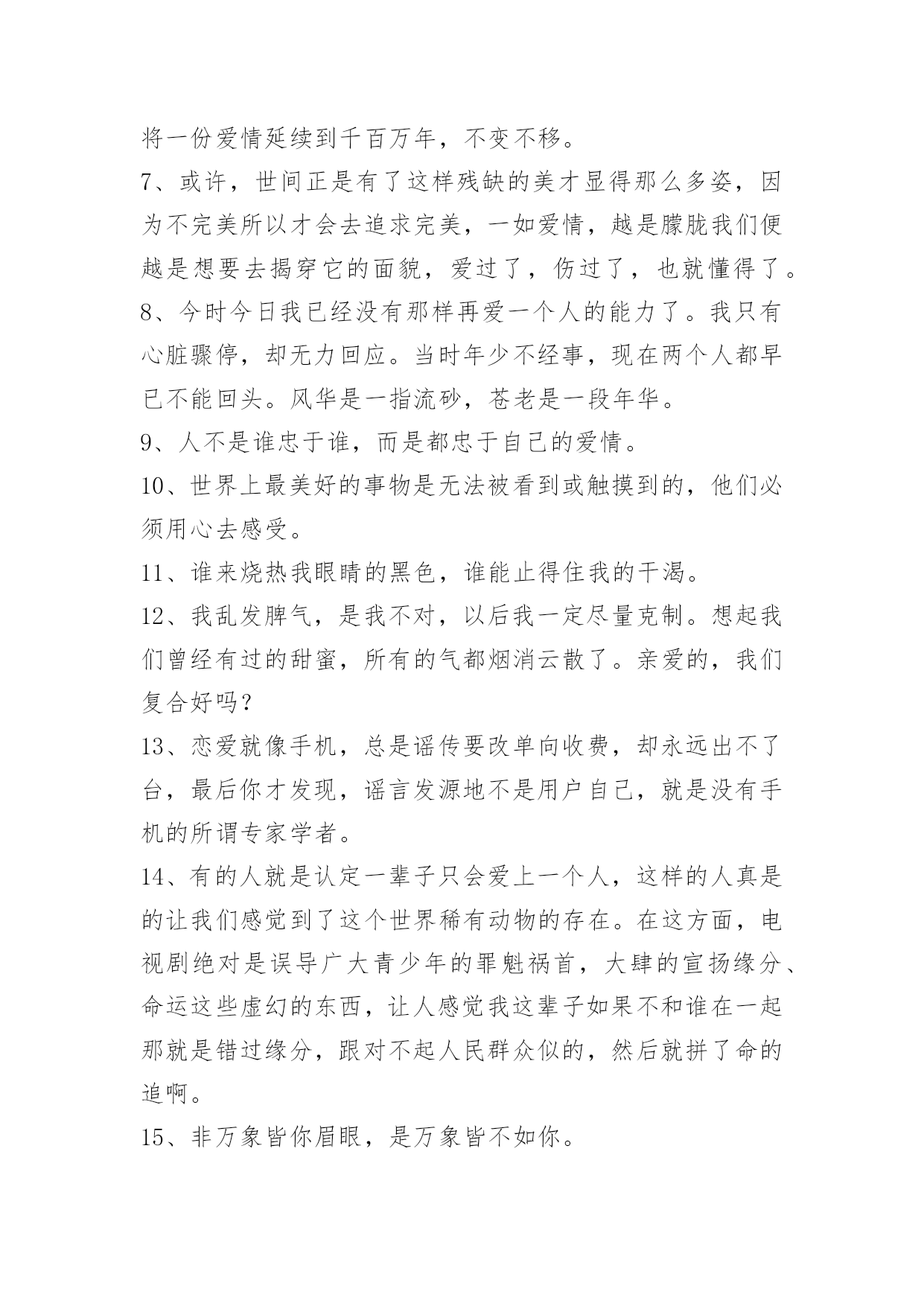 流行爱情句子59条2022年通用流行爱情句子汇总59条你打破我固定的生活,却随便离开了。下面是小编精心准备的流行爱情句子59条,欢迎阅读,希望能够对大家有所帮助。1、有些感情超越了友情,但止步于爱情。2、在遇到你之后,我真正体会到了什么是牵挂,什么是痴痴恋恋,什么是同节奏的心跳。爱,是一场雨,也时常湿了我干净的衣衫。喜欢雨里飘渺温馨的感觉,哪怕会湿了我干净的衣衫。3、亲爱的,就算全世界的人都不爱我,我也可以爱我自己。4、爱一个人就是大恸之后终于心头一片空白。不再爱也不再恨,不再恼怒也不再悲哀。心中渐渐滋生出怜悯,怜悯曾经沉溺的你更怜悯你爱过的那人,怜悯那份庸常,还有那份虚弱。5、一个人的生命里,擦肩而过的人有千千万万,有几个是知音?有几个是深爱自己的人?爱情再坚固,也无法承受忙碌的侵蚀,你忙得天荒地乱,你忙得忘记关心,你忙得身心疲惫,你忙得无所适从,但是爱情不能等你有空才珍惜。6、人活一世,无论爱的多么铭心刻骨,到头来也不过是对情感时光的一种交付。缘来相遇,缘尽分离。就算可以执手到老,也终究难逃轮回定数。因为我们毕竟不是神话,可以将一份爱情延续到千百万年,不变不移。7、或许,世间正是有了这样残缺的美才显得那么多姿,因为不完美所以才会去追求完美,一如爱情,越是朦胧我们便越是想要去揭穿它的面貌,爱过了,伤过了,也就懂得了。8、今时今日我已经没有那样再爱一个人的能力了。我只有心脏骤停,却无力回应。当时年少不经事,现在两个人都早已不能回头。风华是一指流砂,苍老是一段年华。9、人不是谁忠于谁,而是都忠于自己的爱情。10、世界上最美好的事物是无法被看到或触摸到的,他们必须用心去感受。11、谁来烧热我眼睛的黑色,谁能止得住我的干渴。12、我乱发脾气,是我不对,以后我一定尽量克制。想起我们曾经有过的甜蜜,所有的气都烟消云散了。亲爱的,我们复合好吗?13、恋爱就像手机,总是谣传要改单向收费,却永远出不了台,最后你才发现,谣言发源地不是用户自己,就是没有手机的所谓专家学者。14、有的人就是认定一辈子只会爱上一个人,这样的人真是的让我们感觉到了这个世界稀有动物的存在。在这方面,电视剧绝对是误导广大青少年的罪魁祸首,大肆的宣扬缘分、命运这些虚幻的东西,让人感觉我这辈子如果不和谁在一起那就是错过缘分,跟对不起人民群众似的,然后就拼了命的追啊。15、非万象皆你眉眼,是万象皆不如你。16、我想我总是不知道要如何去学会放弃,现在我知道。其实,有些是你根本就无法掌控的,不是你不去放弃,而是你根本就抓不住。再好的男人如果他不爱你,那么他的好也和你无关,不属于你的人,不爱你的人就不会对你投入真心,也不会对你作出一定的付出。17、祸水红颜,朱砂点,泪已泛滥,寻觅你一次又一次的阑珊,不在乎蜚语与流言。18、很多人都刻意去追求那种轰轰烈烈荡气回肠的爱情生活,而他们完全没有意识到身边的生活本来就应该是平淡的,平淡的就是幸福的。19、我相信,相濡以沫的爱情,但我更相信永远的兄弟!20、女人确实比男人更容易相信爱情。只为爱情的甜头尝过之后,接下来便是女人长达一生的付出——于是她们说,为了爱。一想到这三个字,女人自己就先释然了,至于那究竟是不是爱,或者在男人眼中算不算是爱,都已不再重要。时光流逝,爱与不爱都已被认真封存起来,不到特定日子,都不舍得拿出来尝上一口。21、一个人就算有再多缺点,可能处处忍让你,陪你到最后,那就是终点。因为陪伴与懂得,比爱情更加重要。找一个你愿意忍受你的人,一起走到最后。22、给我说说你有怎样的妻子,我就会告诉你你是怎样的丈夫。23、因为所有的爱,只要是爱,都不应该受到人们的冷落甚至不屑。24、有一把伞撑了很久,雨停了也不肯收;有一束花闻了许久,枯萎了也不肯丢;有一种祝福希望能到永久,即使青丝变白发也能在心底深深保留!25、那颗漂泊于红尘的凡心,何时才可以脱离尘世的牵绊,遁入已向往的禅心,心不动,则不痛,沉寂一生。26、日子就该踏踏实实的过,人生要学会静静地走。27、柔情温暖了我孤寂的心扉,真爱打动了我沉睡已久的情感,我会用我所有的爱去呵护你一世,用所有的情去陪伴你一生,请相信我们的爱会天荒地老…28、四载光阴,俱以往,此去人生漫漫。寸寸青丝,细看来,尽皆少年心事。苍山夜远,晚风凄凄,吹尽别离苦。聚散无常,世间遍地歧路。十年韶华,皆远逝,回首碧浪涛涛。片片黄芽,放眼望,全然青年壮志。海阔鳞泳,红云悠悠,看淡成败荣辱。风雨无常,世间还多艳阳天。29、我怀念,是你的味道。30、爱情是一份纯美的感情,有心的人,再远也会记挂对方;无心的人,近在咫尺却远在天涯。31、我对他再没有感觉,我不再爱他了。为什么会这样?原来我们的爱情败给了岁月。首先是爱情使你忘记时间,然后是时间使你忘记爱情。32、谁在城外等,午夜里太认真,追不上背影的心跳声。33、幸福这种东西,是
